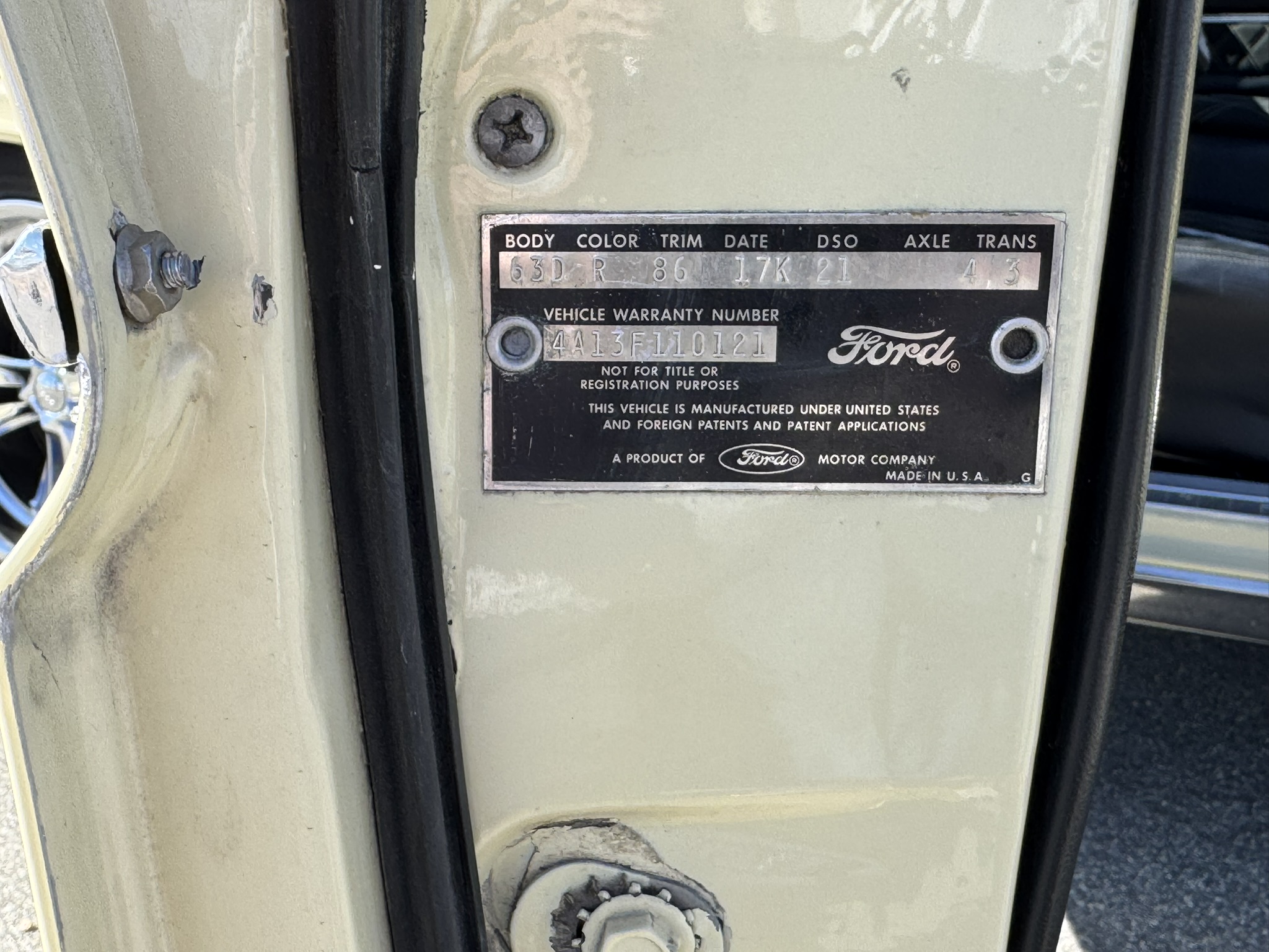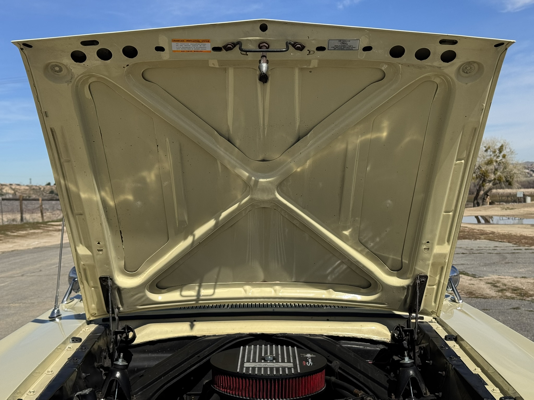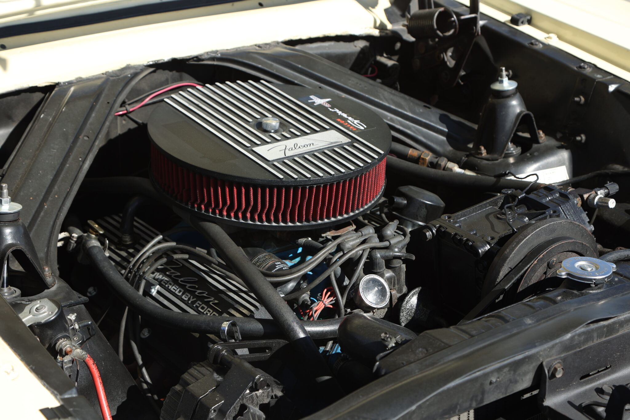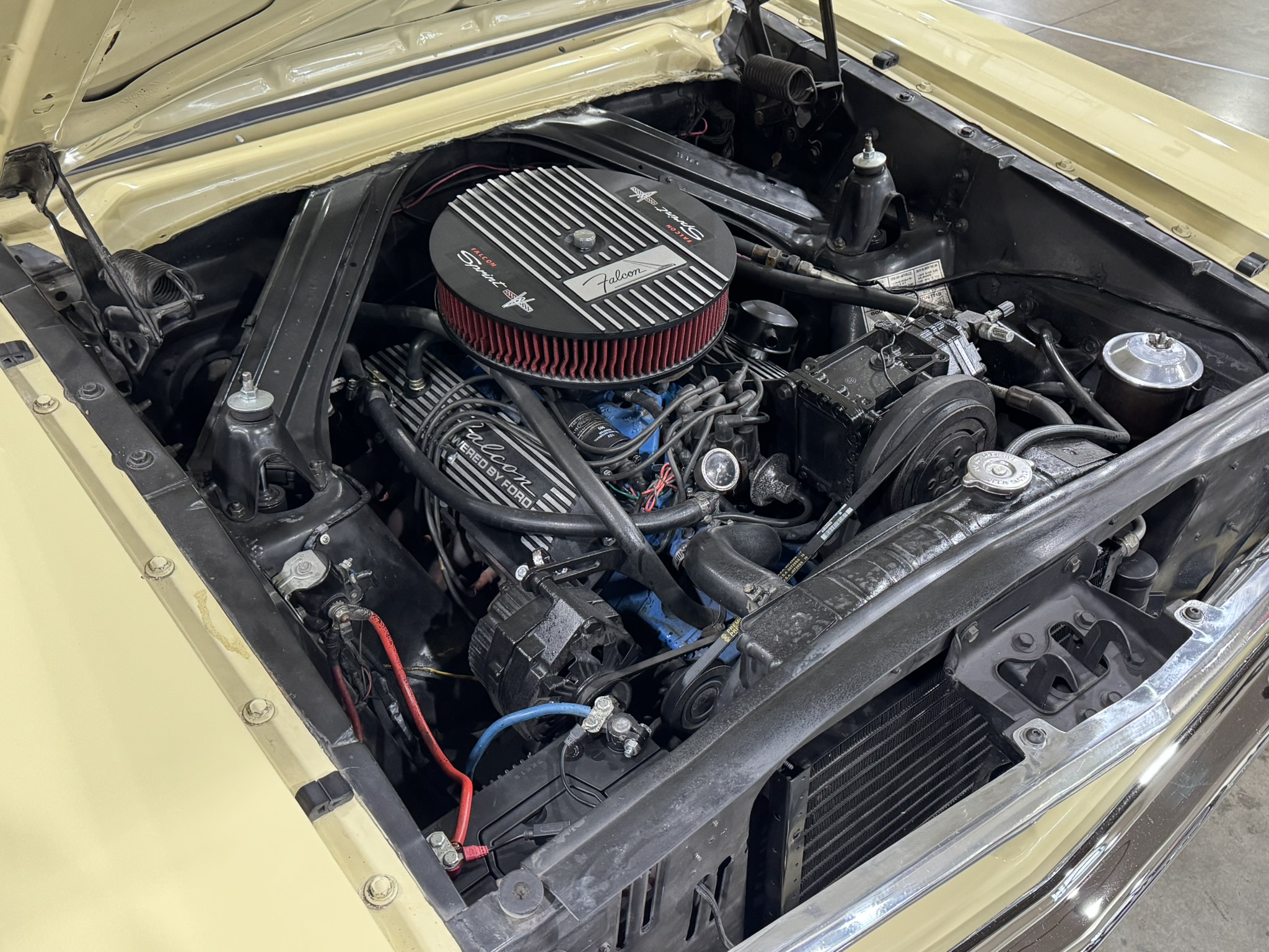 Drivetrain & Chassis: The original 260ci V8 small-block is paired with a Ford-O-Matic 2-speed automatic transmission, running through an 8 inch axle with 3.25:1 gears and open differential. Streetside Classics reported in their listing that the engine had been rebuilt 2,000 miles ago at the time, which would now total about 5,600 miles. Recent mechanical work includes new oil pan gasket, oil change, new rear main seal, and new battery. New valve covers and air cleaner were installed, with the removed versions included with the car if they are preferred. The engine starts easily, idles smoothly, and cruises effortlessly.