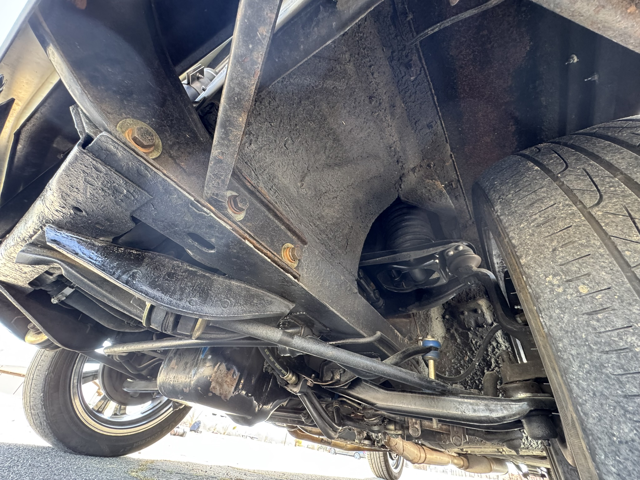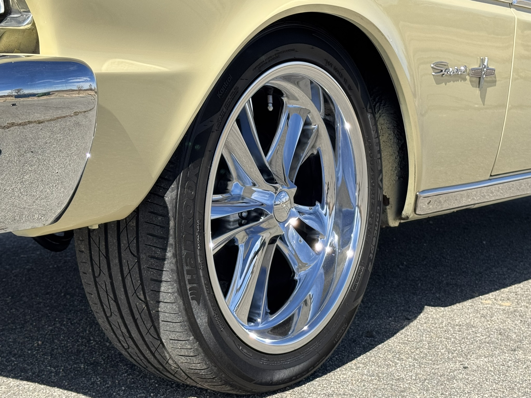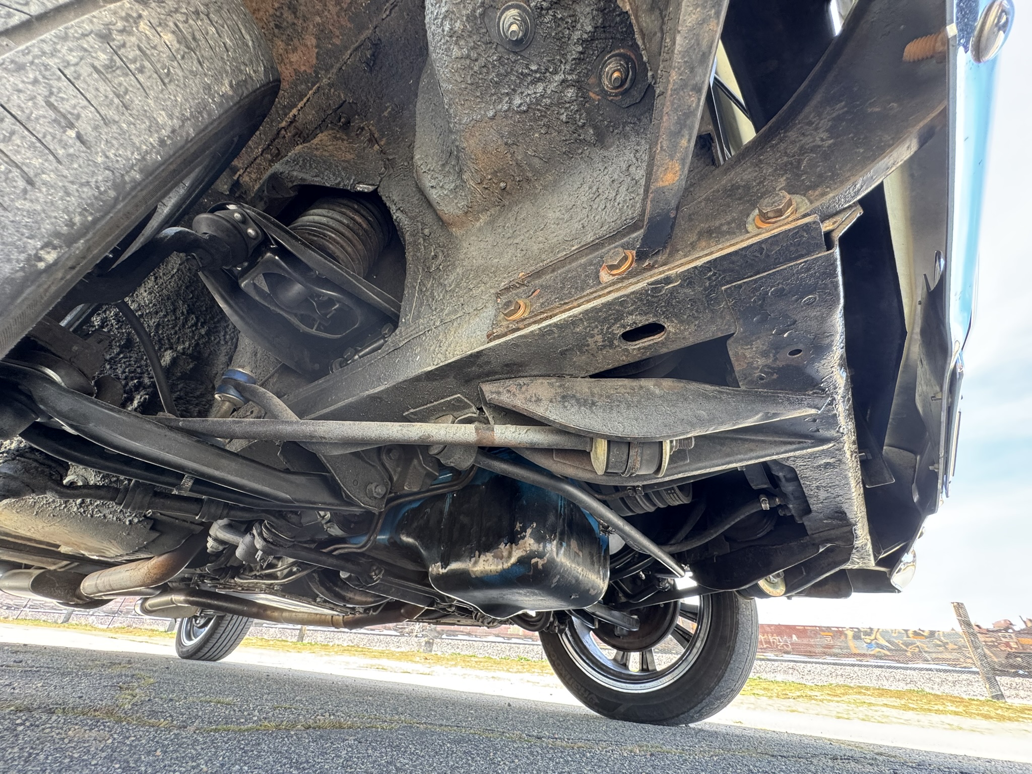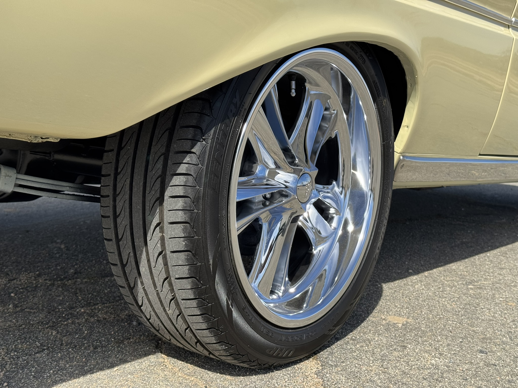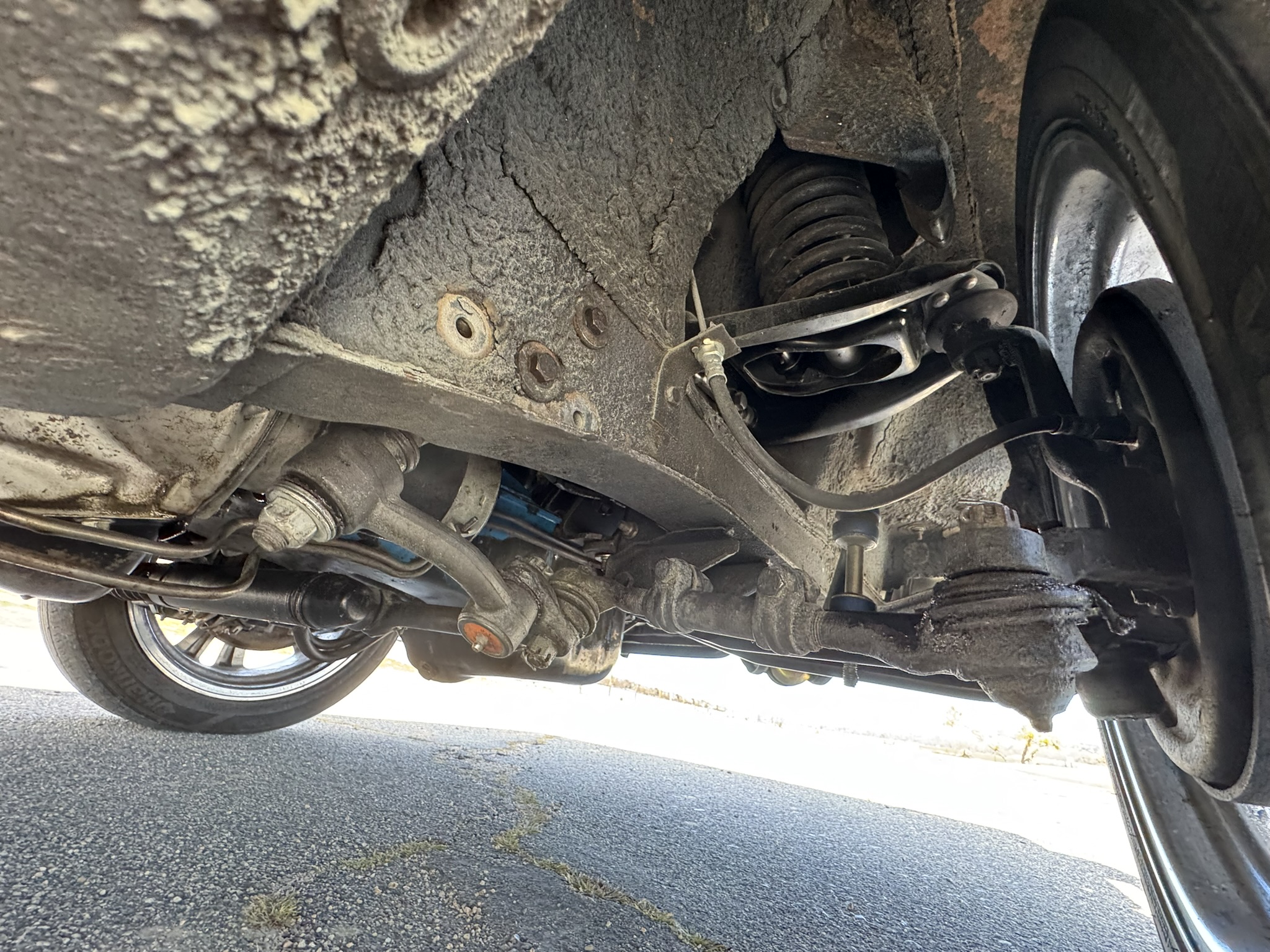 The entire front suspension was rebuilt with new upper and lower control arms, new spring perches, new strut rod bushings, and new idler arm. Factory power steering is in place with a new pump that was just installed to solve a fluid leak. New rear brake wheel cylinders were installed and pads adjusted. The car rides on 17-inch Foose wheels with Hankook 205/50R17 tires.