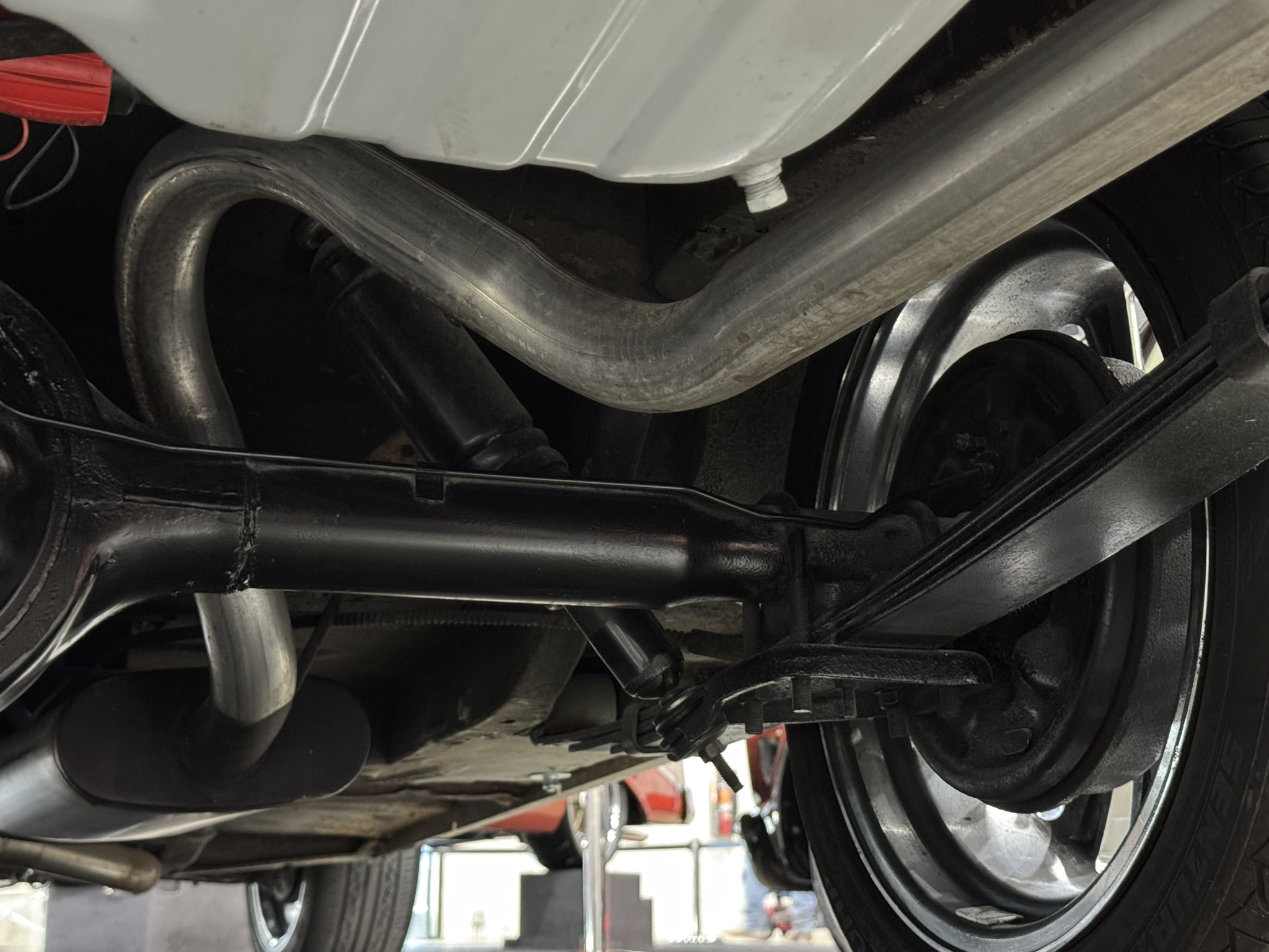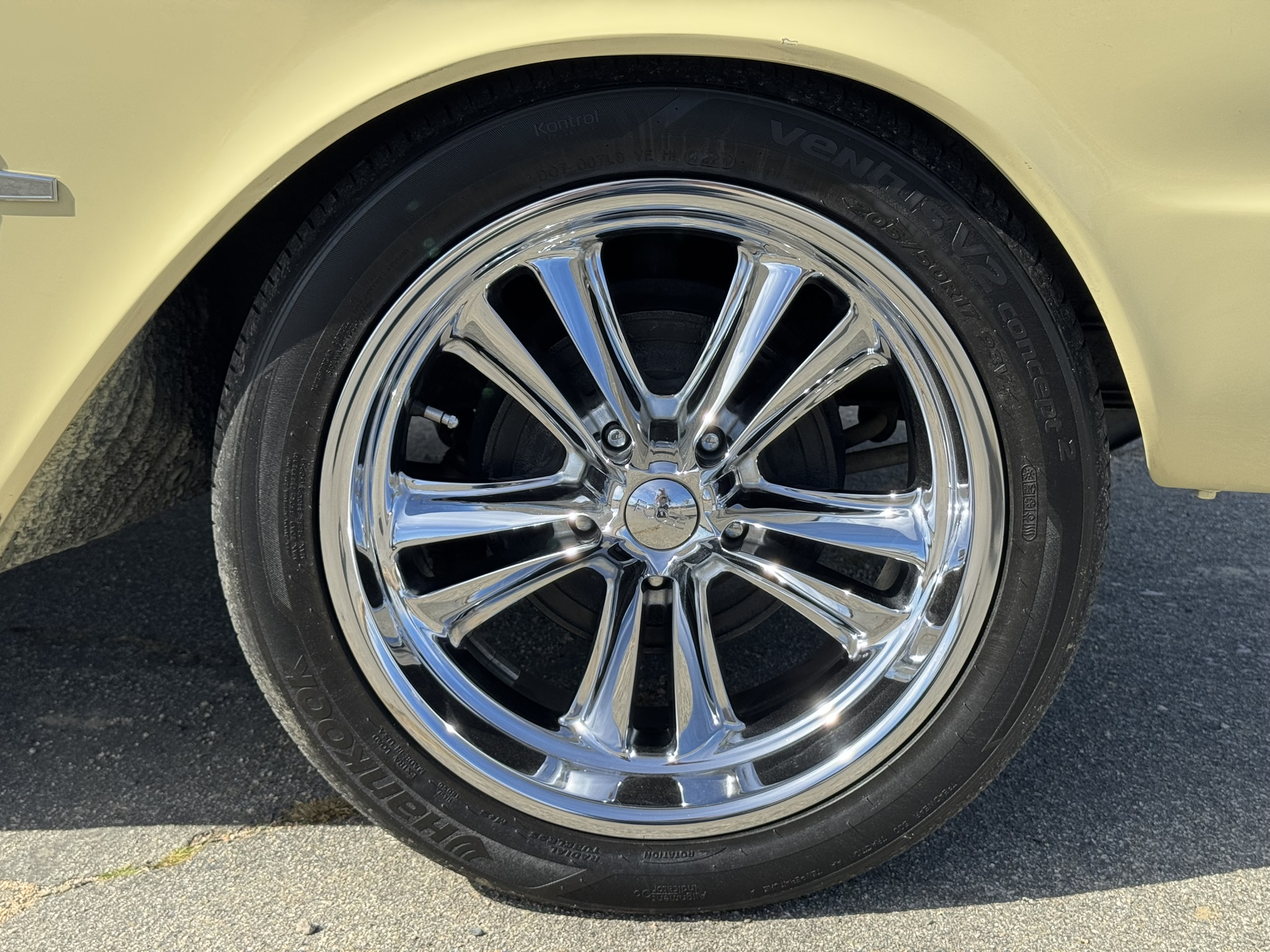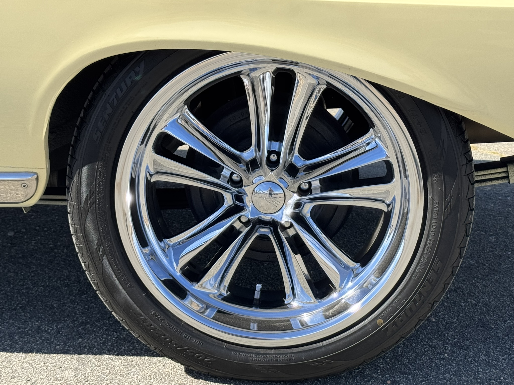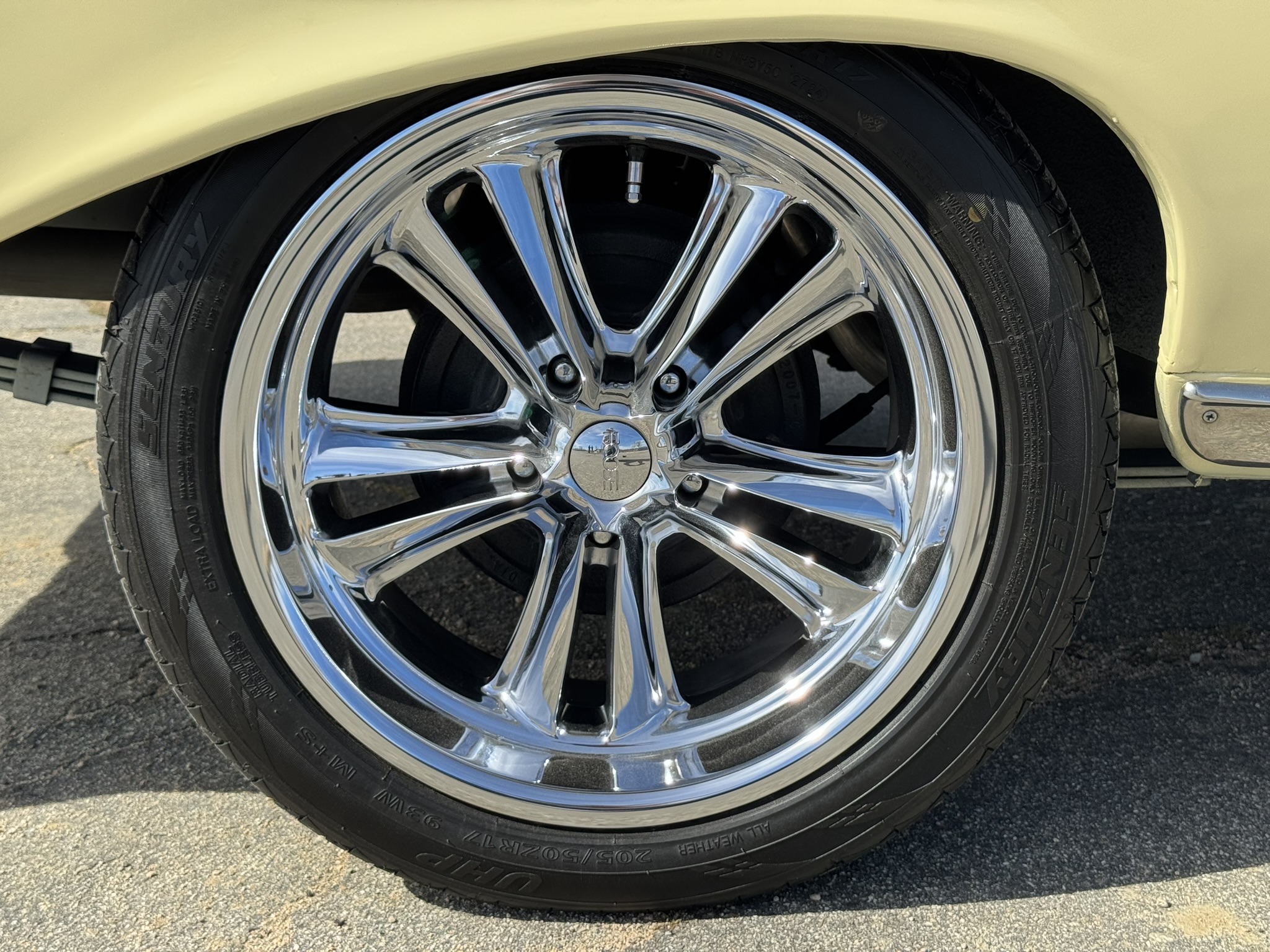 The entire front suspension was rebuilt with new upper and lower control arms, new spring perches, new strut rod bushings, and new idler arm. Factory power steering is in place with a new pump that was just installed to solve a fluid leak. New rear brake wheel cylinders were installed and pads adjusted. The car rides on 17-inch Foose wheels with Hankook 205/50R17 tires.