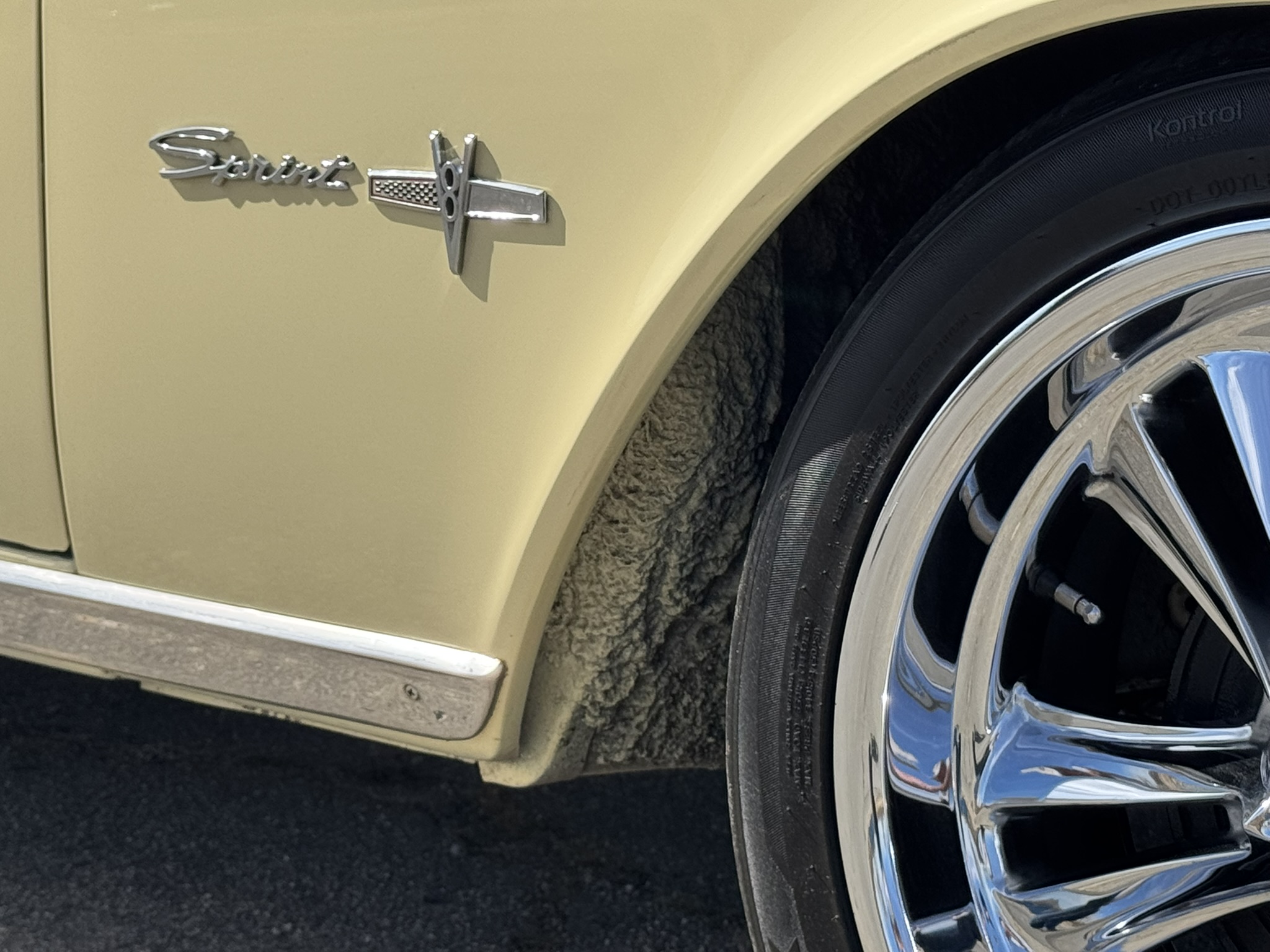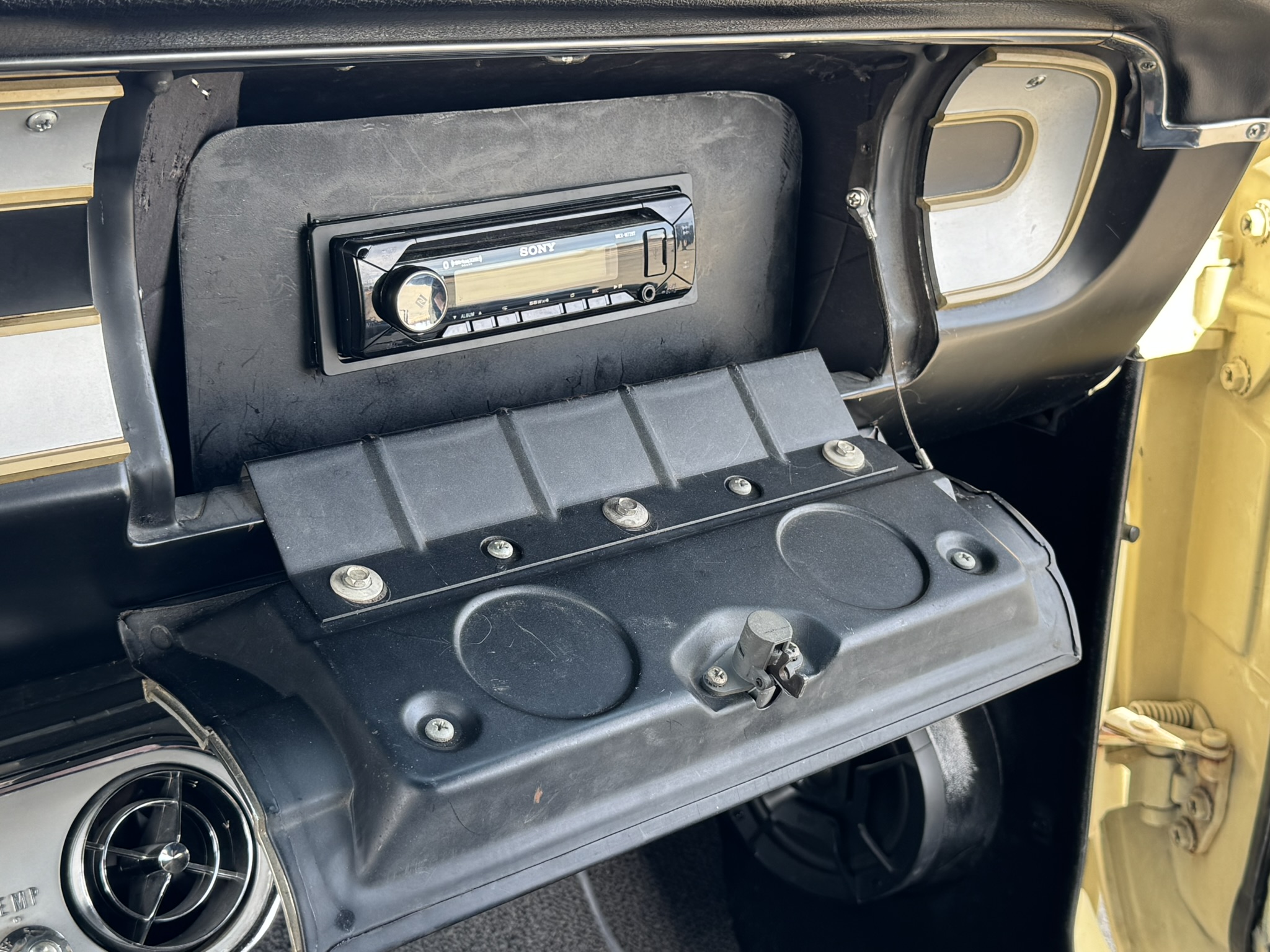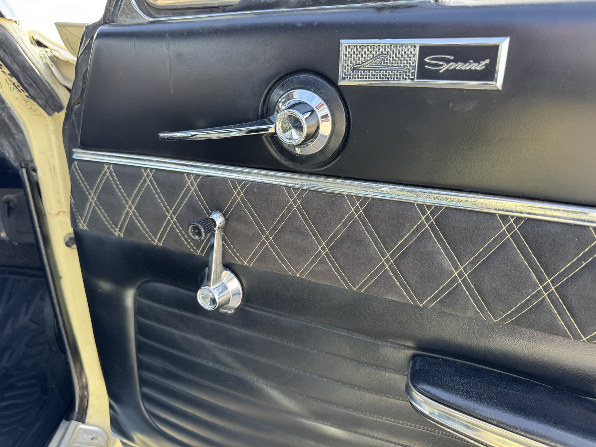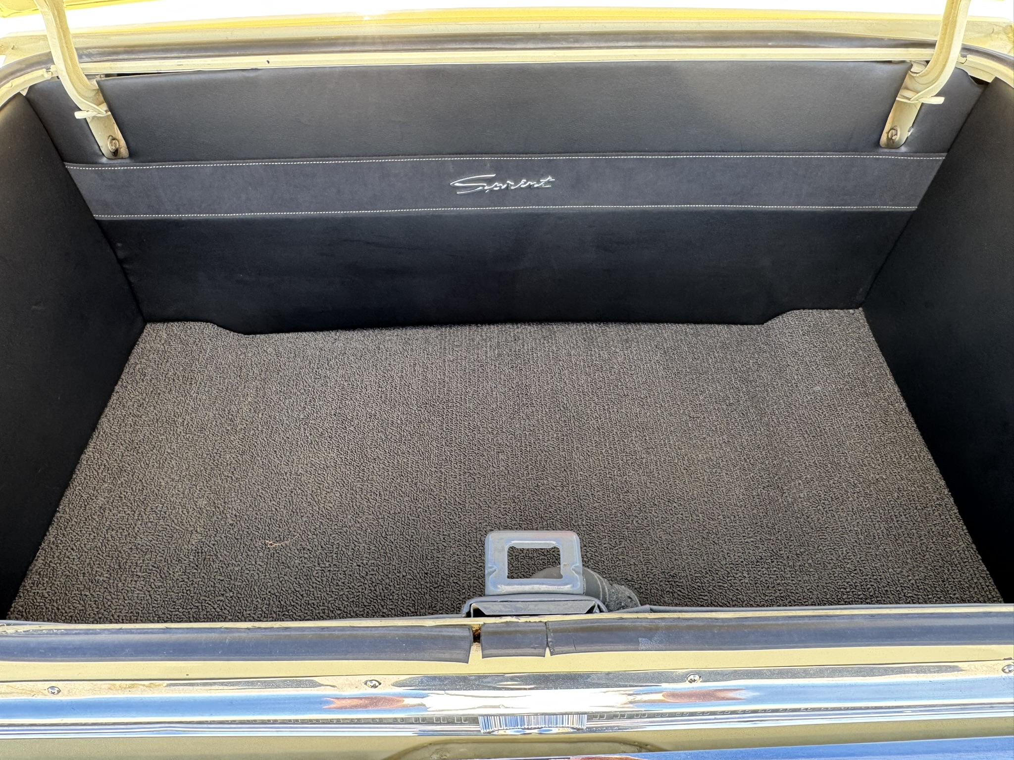Interior & Floors: Custom seat inserts were designed to bring the exterior Phoenician Yellow inside through yellow stitching, complementing the original bucket seats. The door panels and rear seat panels were customized with the same yellow stitching. A custom trunk panel and carpet were installed with Sprint script insignia. The current center console is an aftermarket unit with matching yellow stitched lid and two cup holders. The original center console is included. The package tray has been recovered in suede. New carpet was installed throughout. There is a Sony stereo head unit mounted in the glove box, which powers the Polk Audio speakers in the kick panels. The original AM radio is retained in the dash, but not hooked up. The factory air conditioning system was serviced and repaired with a new condenser and compressor being installed. The owner reports “it will blow you out of the car". The floors are in excellent condition with only some crust on the underside as pictured.