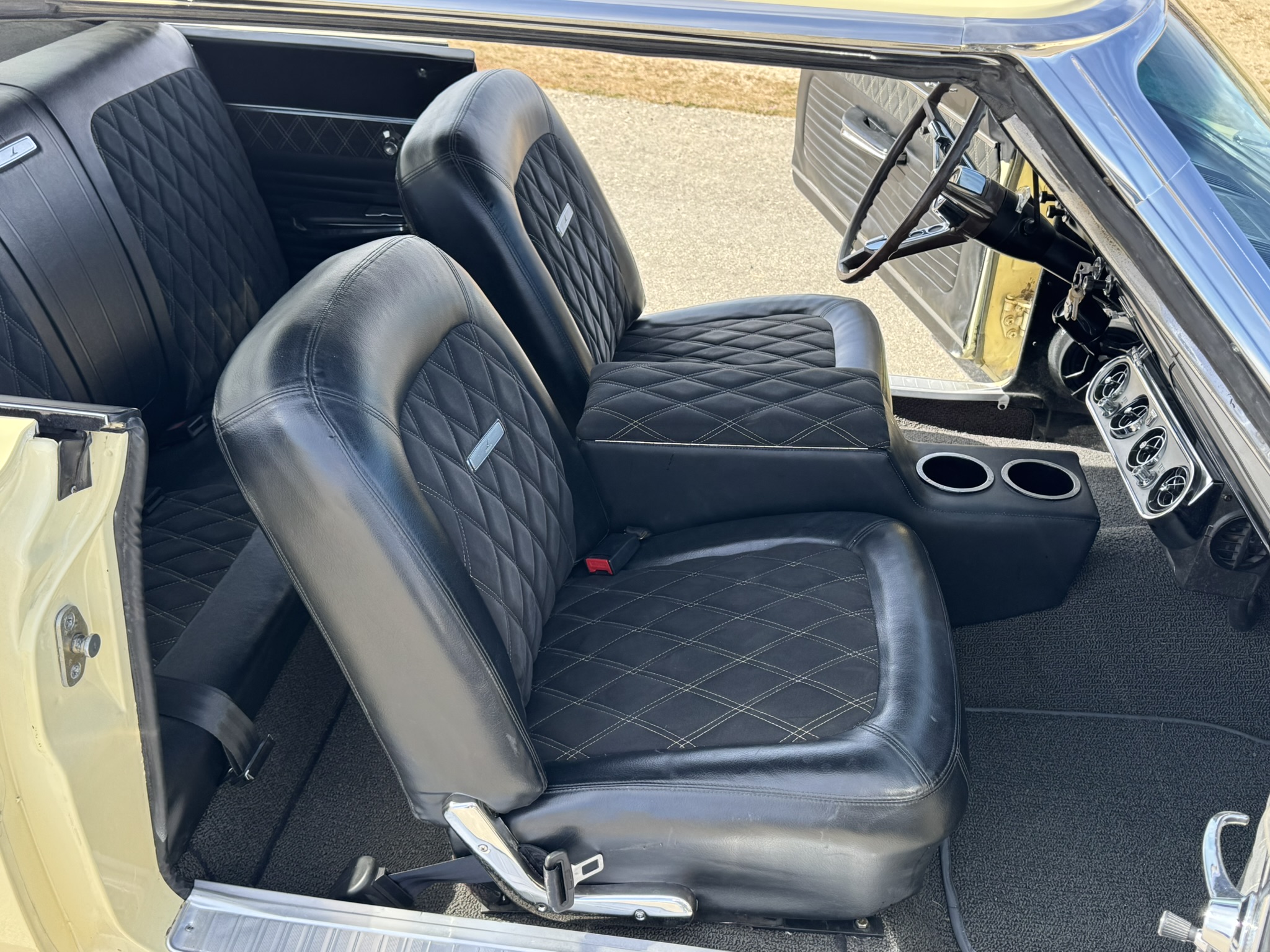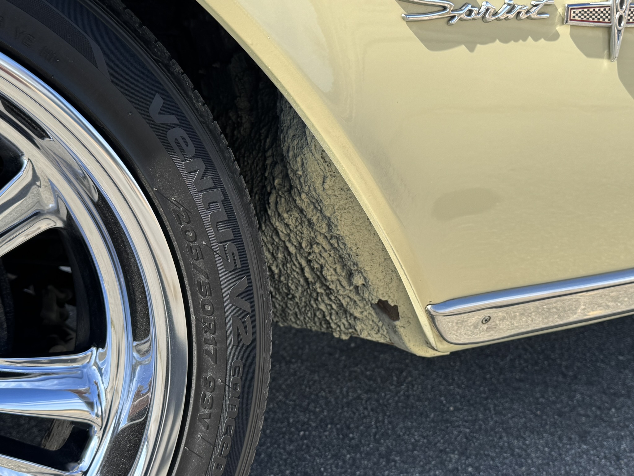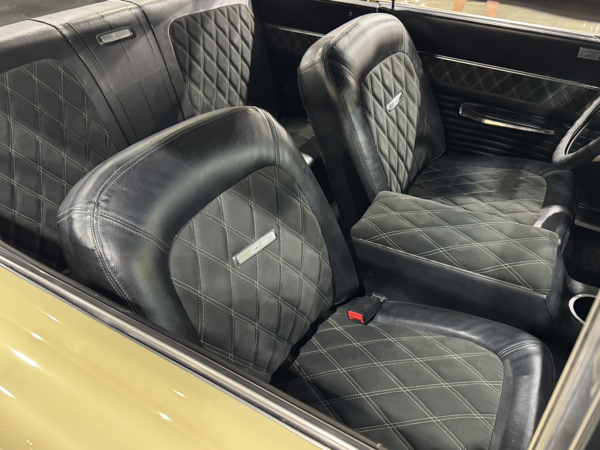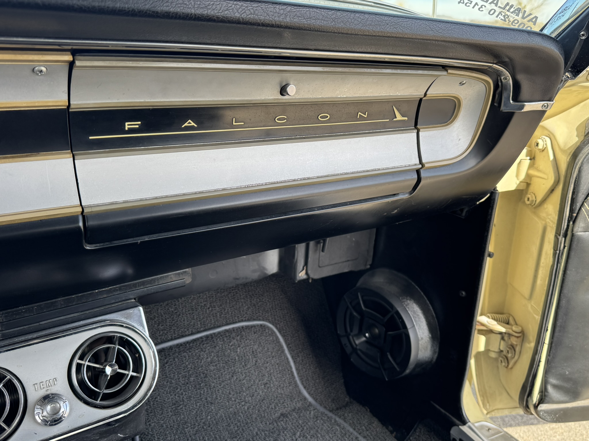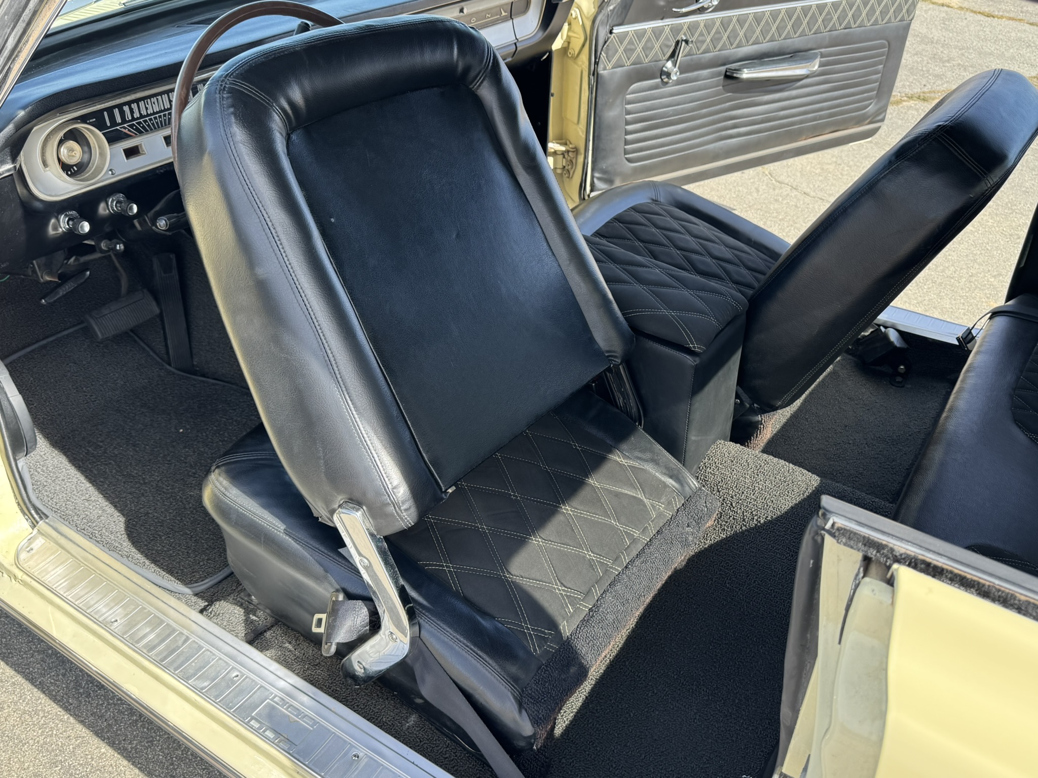 Interior & Floors: Custom seat inserts were designed to bring the exterior Phoenician Yellow inside through yellow stitching, complementing the original bucket seats. The door panels and rear seat panels were customized with the same yellow stitching. A custom trunk panel and carpet were installed with Sprint script insignia. The current center console is an aftermarket unit with matching yellow stitched lid and two cup holders. The original center console is included. The package tray has been recovered in suede. New carpet was installed throughout. There is a Sony stereo head unit mounted in the glove box, which powers the Polk Audio speakers in the kick panels. The original AM radio is retained in the dash, but not hooked up. The factory air conditioning system was serviced and repaired with a new condenser and compressor being installed. The owner reports “it will blow you out of the car". The floors are in excellent condition with only some crust on the underside as pictured.