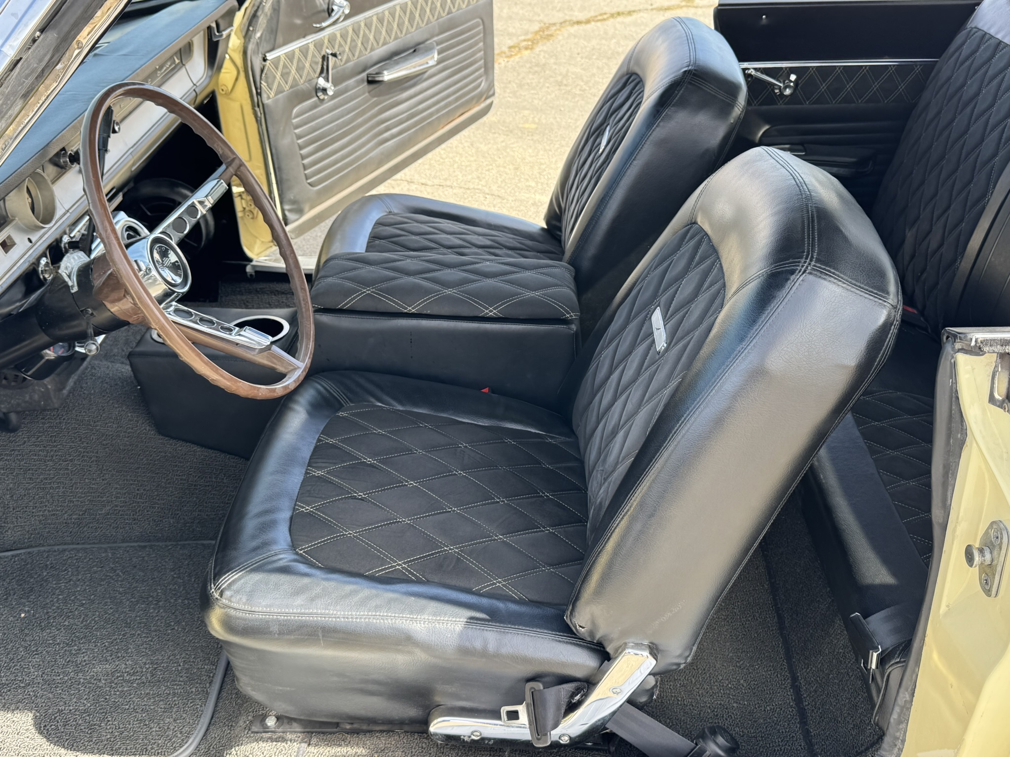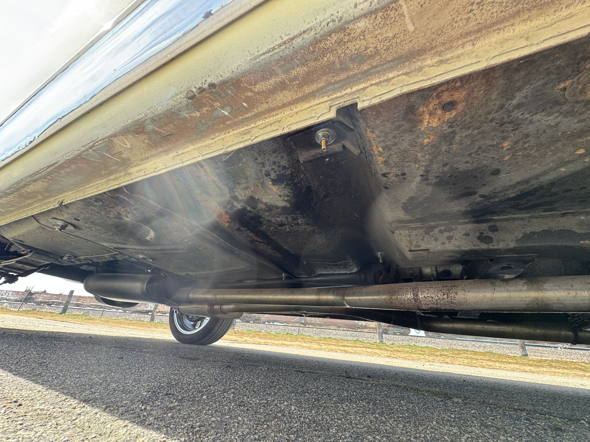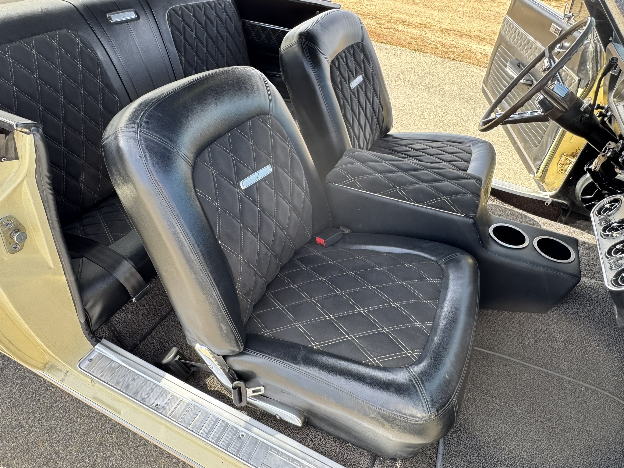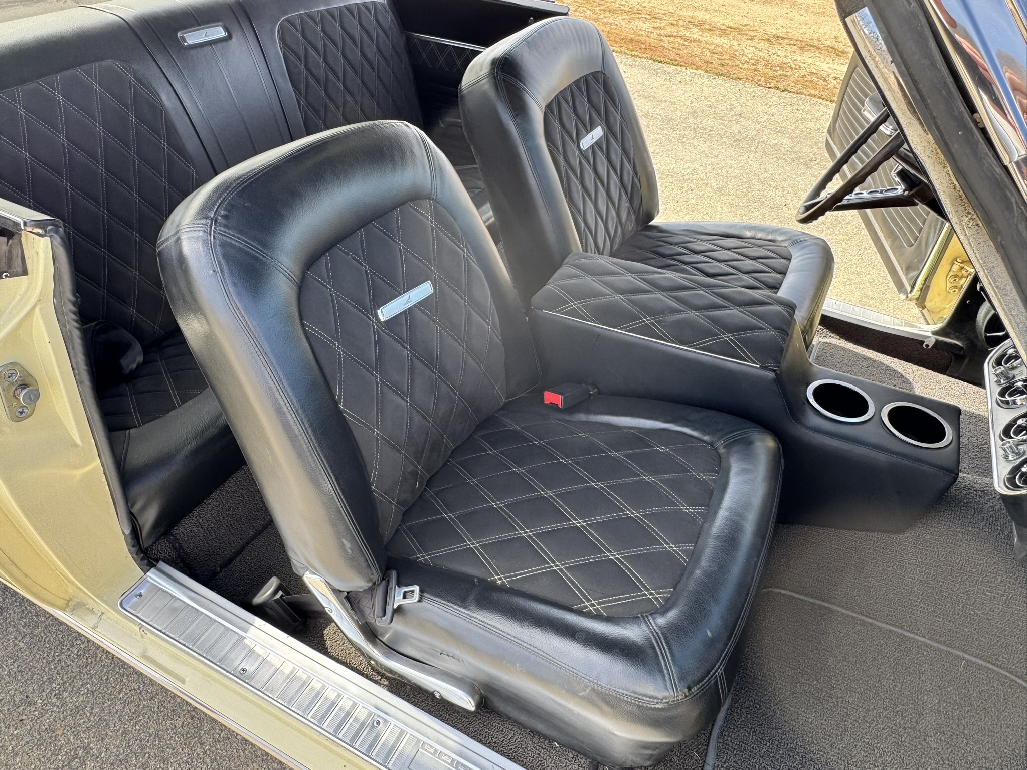 Interior & Floors: Custom seat inserts were designed to bring the exterior Phoenician Yellow inside through yellow stitching, complementing the original bucket seats. The door panels and rear seat panels were customized with the same yellow stitching. A custom trunk panel and carpet were installed with Sprint script insignia. The current center console is an aftermarket unit with matching yellow stitched lid and two cup holders. The original center console is included. The package tray has been recovered in suede. New carpet was installed throughout. There is a Sony stereo head unit mounted in the glove box, which powers the Polk Audio speakers in the kick panels. The original AM radio is retained in the dash, but not hooked up. The factory air conditioning system was serviced and repaired with a new condenser and compressor being installed. The owner reports “it will blow you out of the car". The floors are in excellent condition with only some crust on the underside as pictured.