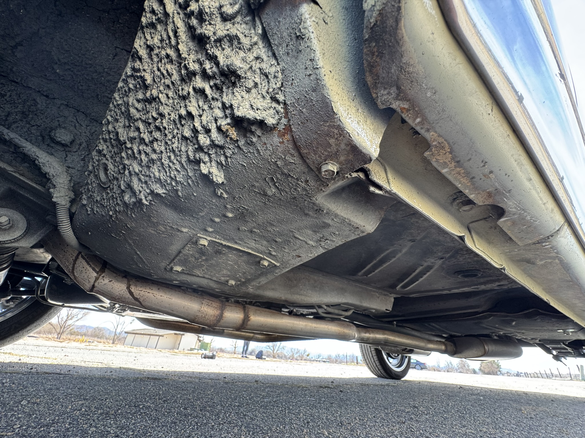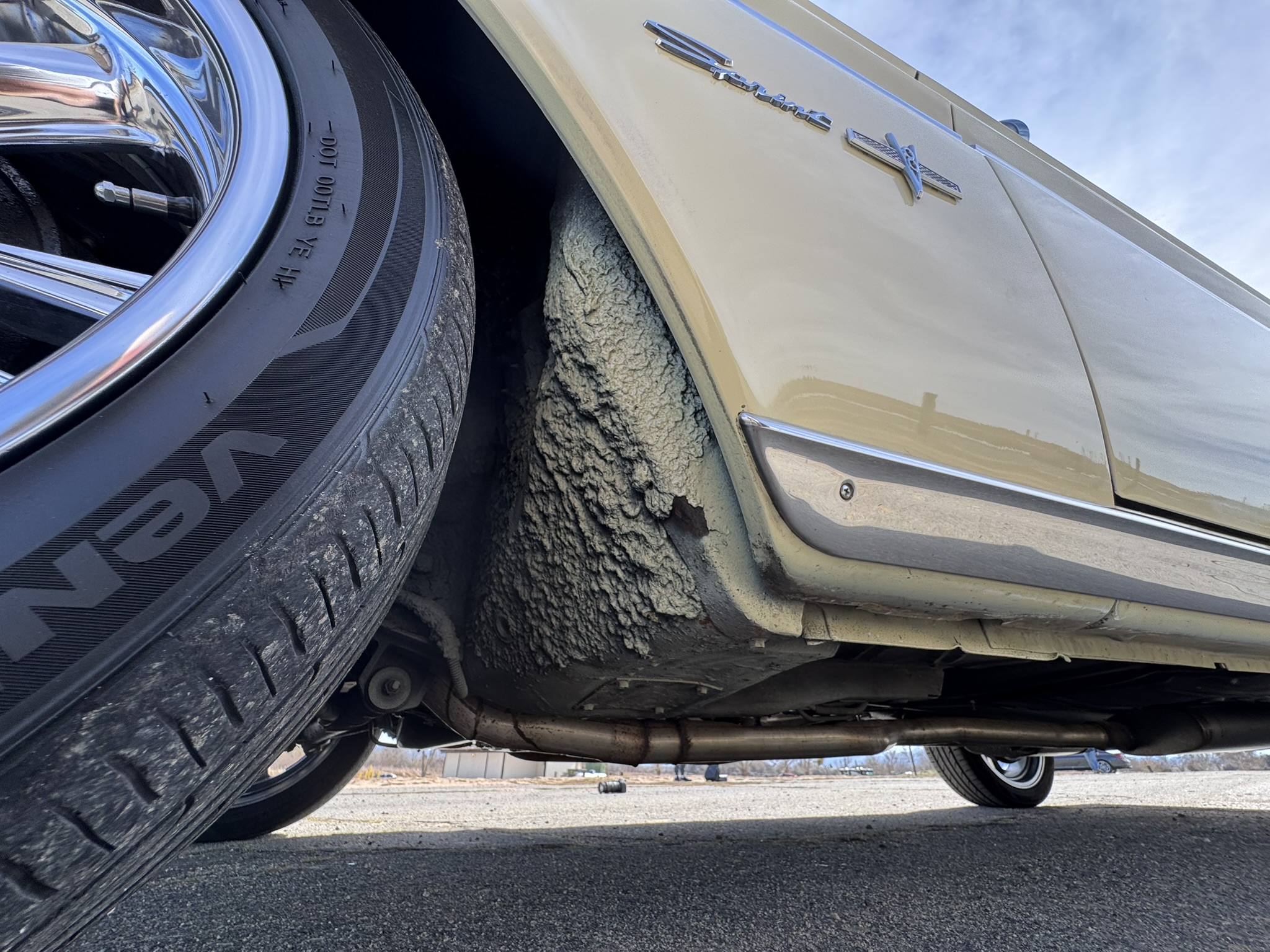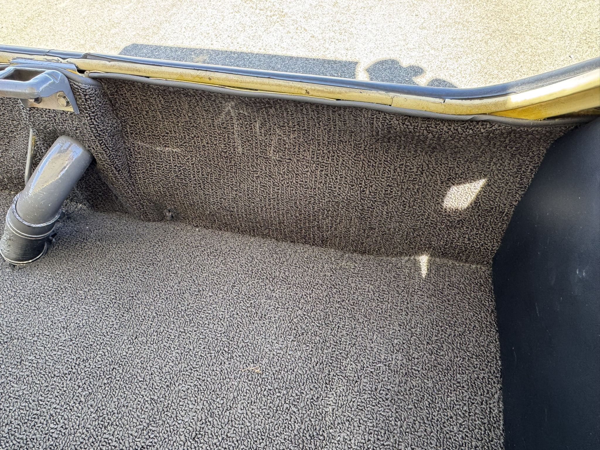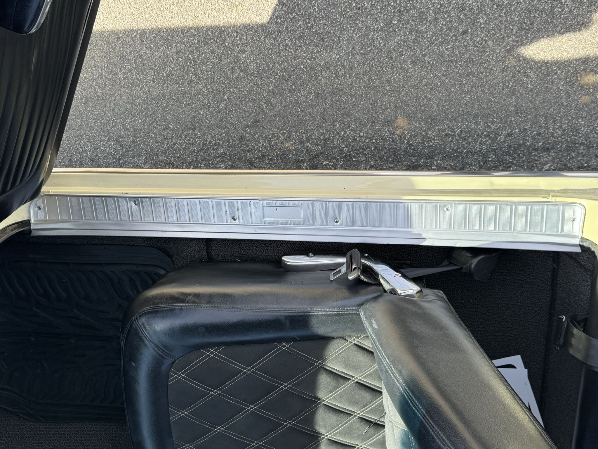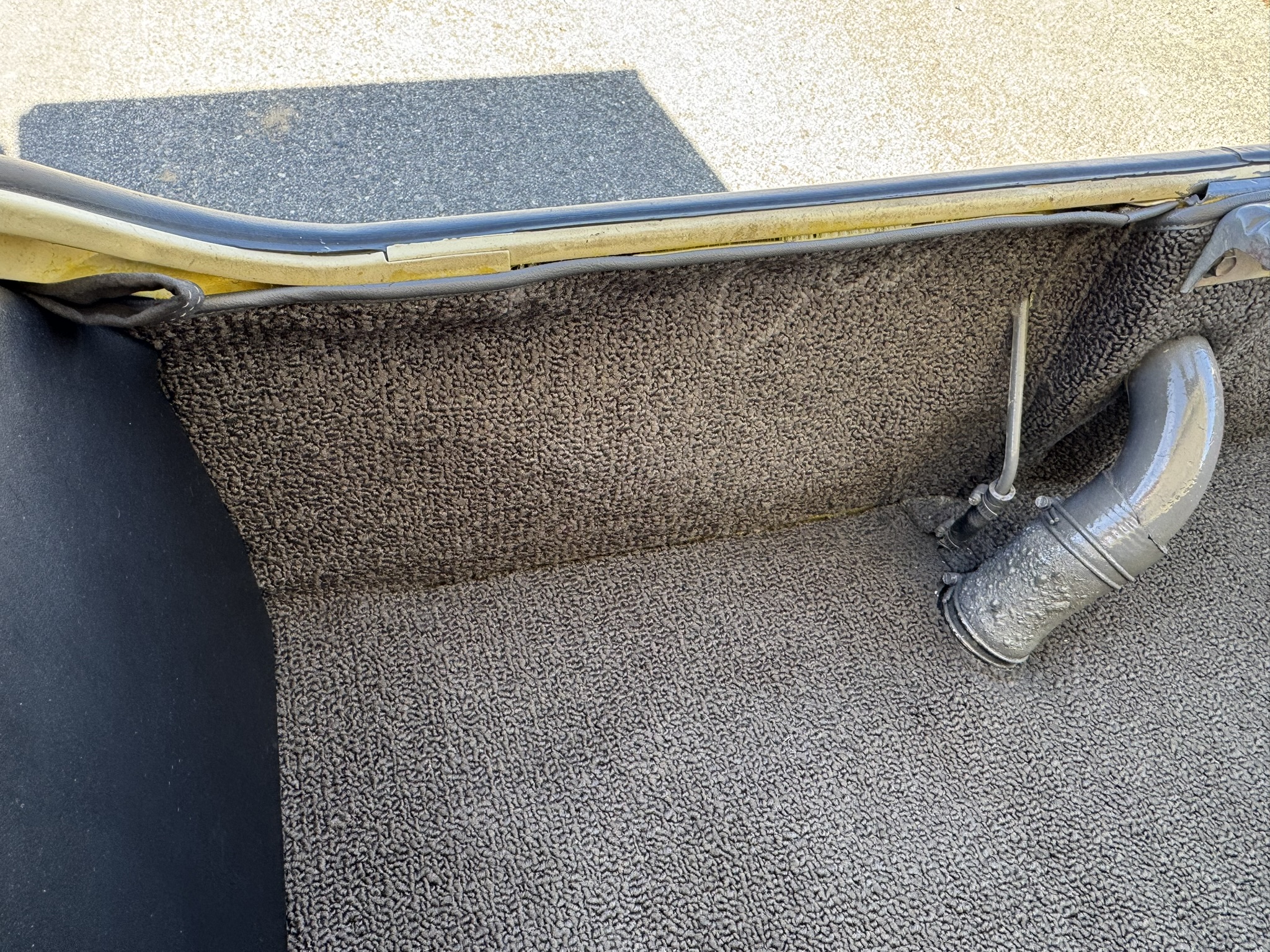 Interior & Floors: Custom seat inserts were designed to bring the exterior Phoenician Yellow inside through yellow stitching, complementing the original bucket seats. The door panels and rear seat panels were customized with the same yellow stitching. A custom trunk panel and carpet were installed with Sprint script insignia. The current center console is an aftermarket unit with matching yellow stitched lid and two cup holders. The original center console is included. The package tray has been recovered in suede. New carpet was installed throughout. There is a Sony stereo head unit mounted in the glove box, which powers the Polk Audio speakers in the kick panels. The original AM radio is retained in the dash, but not hooked up. The factory air conditioning system was serviced and repaired with a new condenser and compressor being installed. The owner reports “it will blow you out of the car". The floors are in excellent condition with only some crust on the underside as pictured.