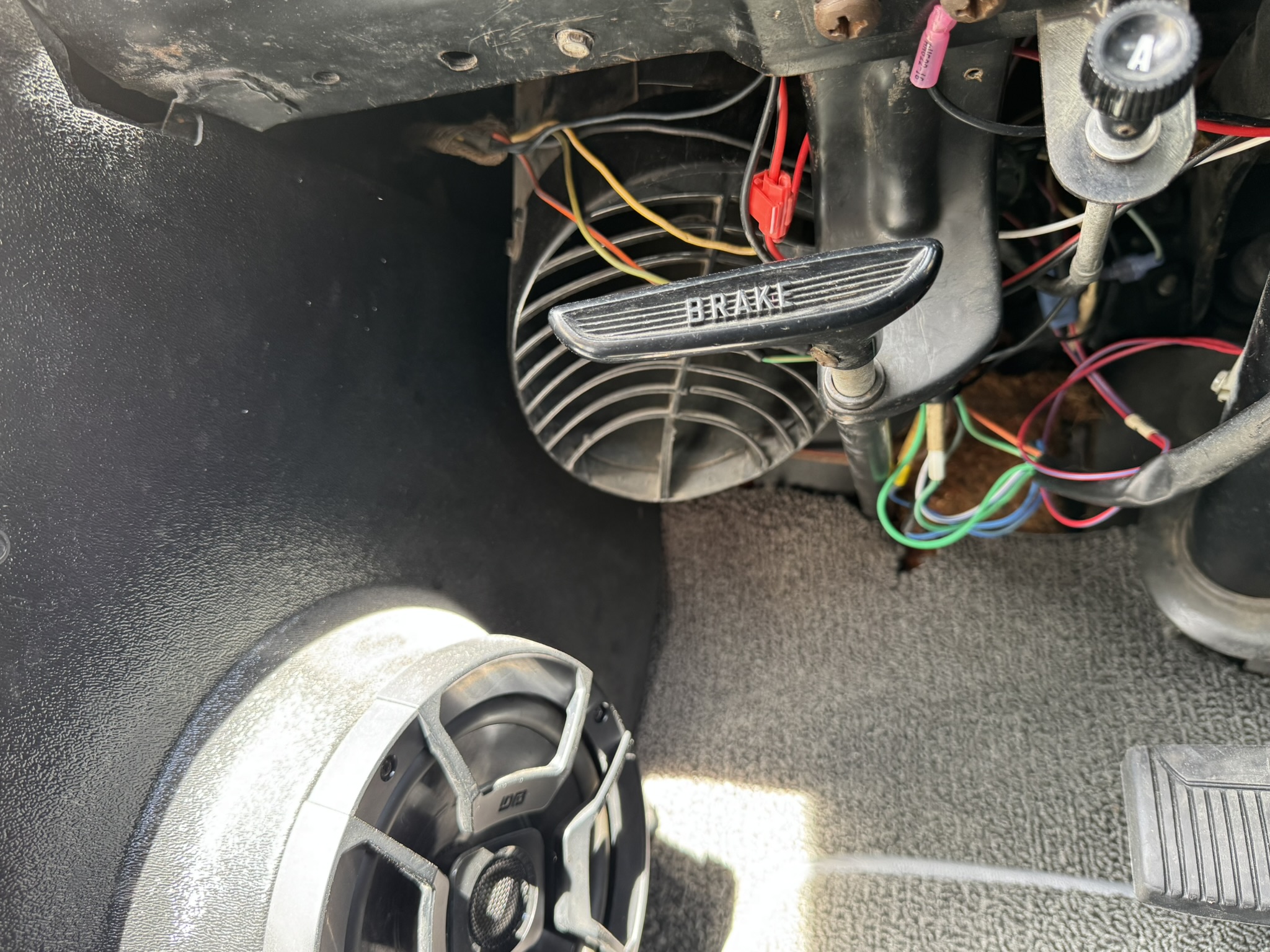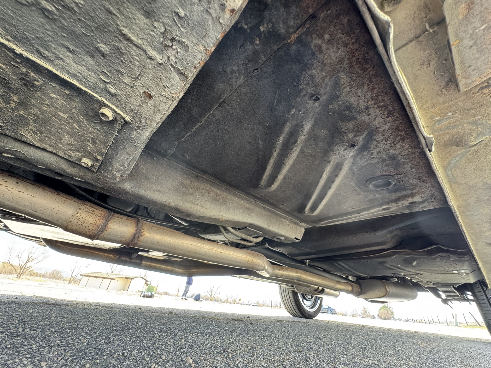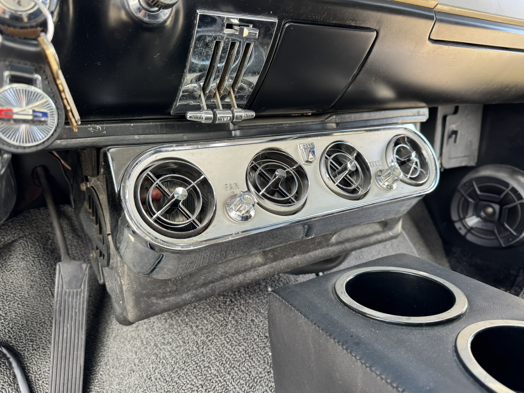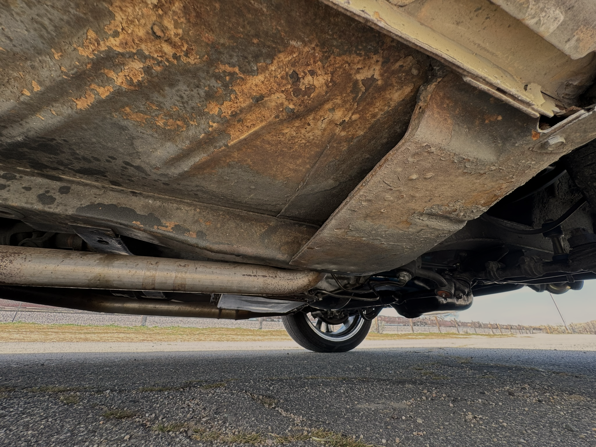 Interior & Floors: Custom seat inserts were designed to bring the exterior Phoenician Yellow inside through yellow stitching, complementing the original bucket seats. The door panels and rear seat panels were customized with the same yellow stitching. A custom trunk panel and carpet were installed with Sprint script insignia. The current center console is an aftermarket unit with matching yellow stitched lid and two cup holders. The original center console is included. The package tray has been recovered in suede. New carpet was installed throughout. There is a Sony stereo head unit mounted in the glove box, which powers the Polk Audio speakers in the kick panels. The original AM radio is retained in the dash, but not hooked up. The factory air conditioning system was serviced and repaired with a new condenser and compressor being installed. The owner reports “it will blow you out of the car". The floors are in excellent condition with only some crust on the underside as pictured.