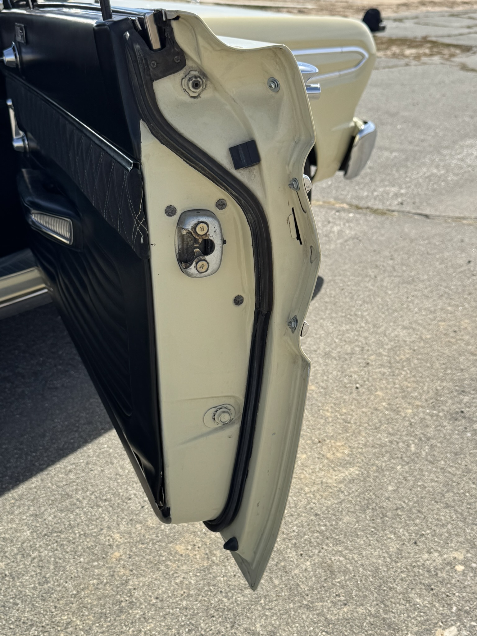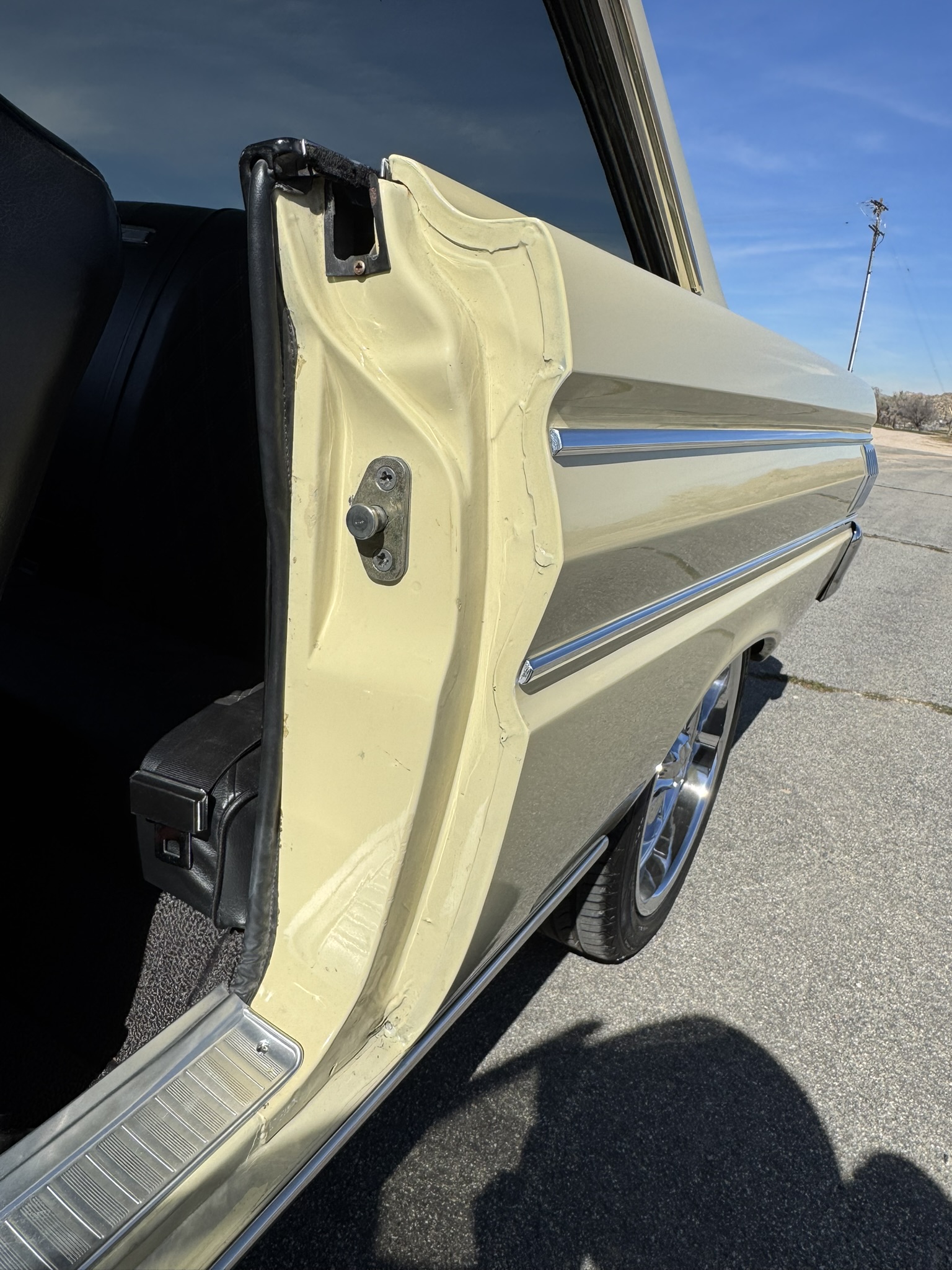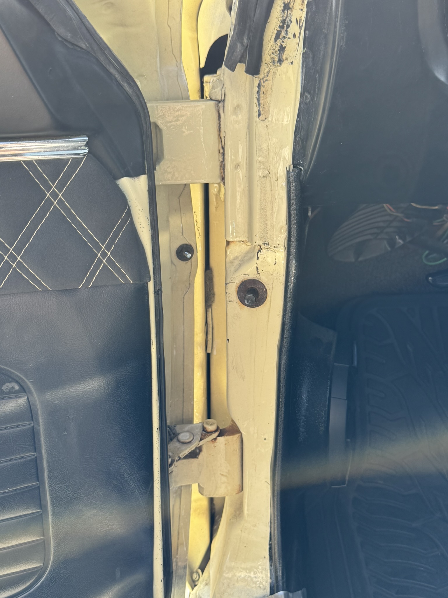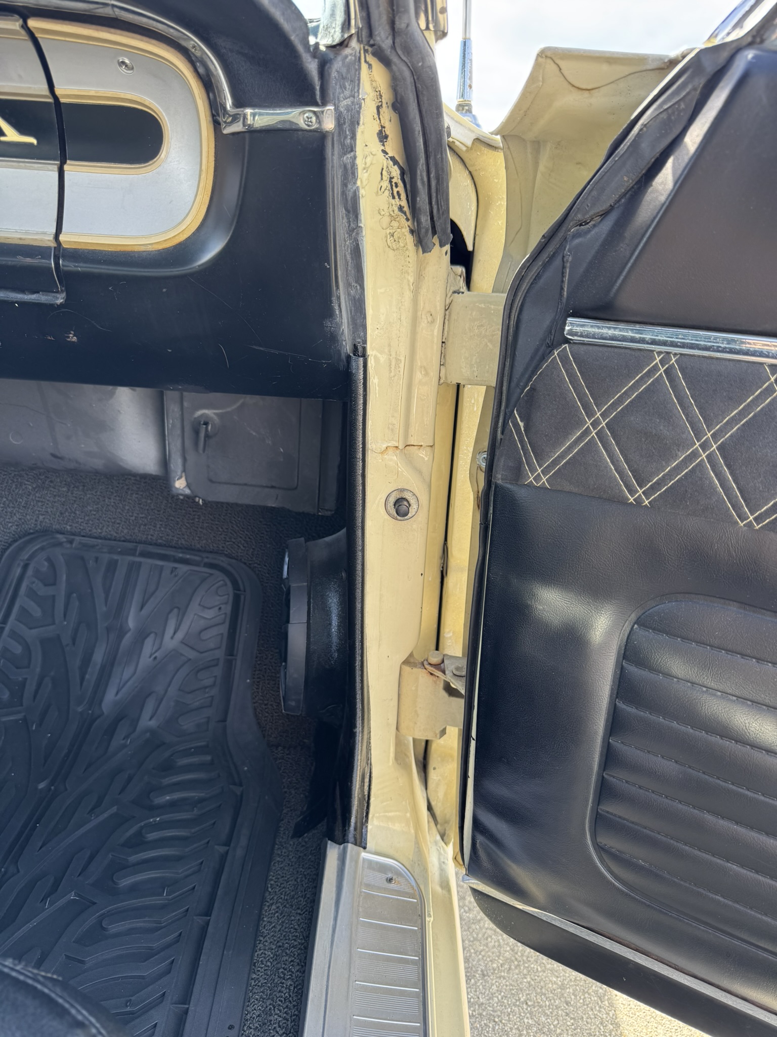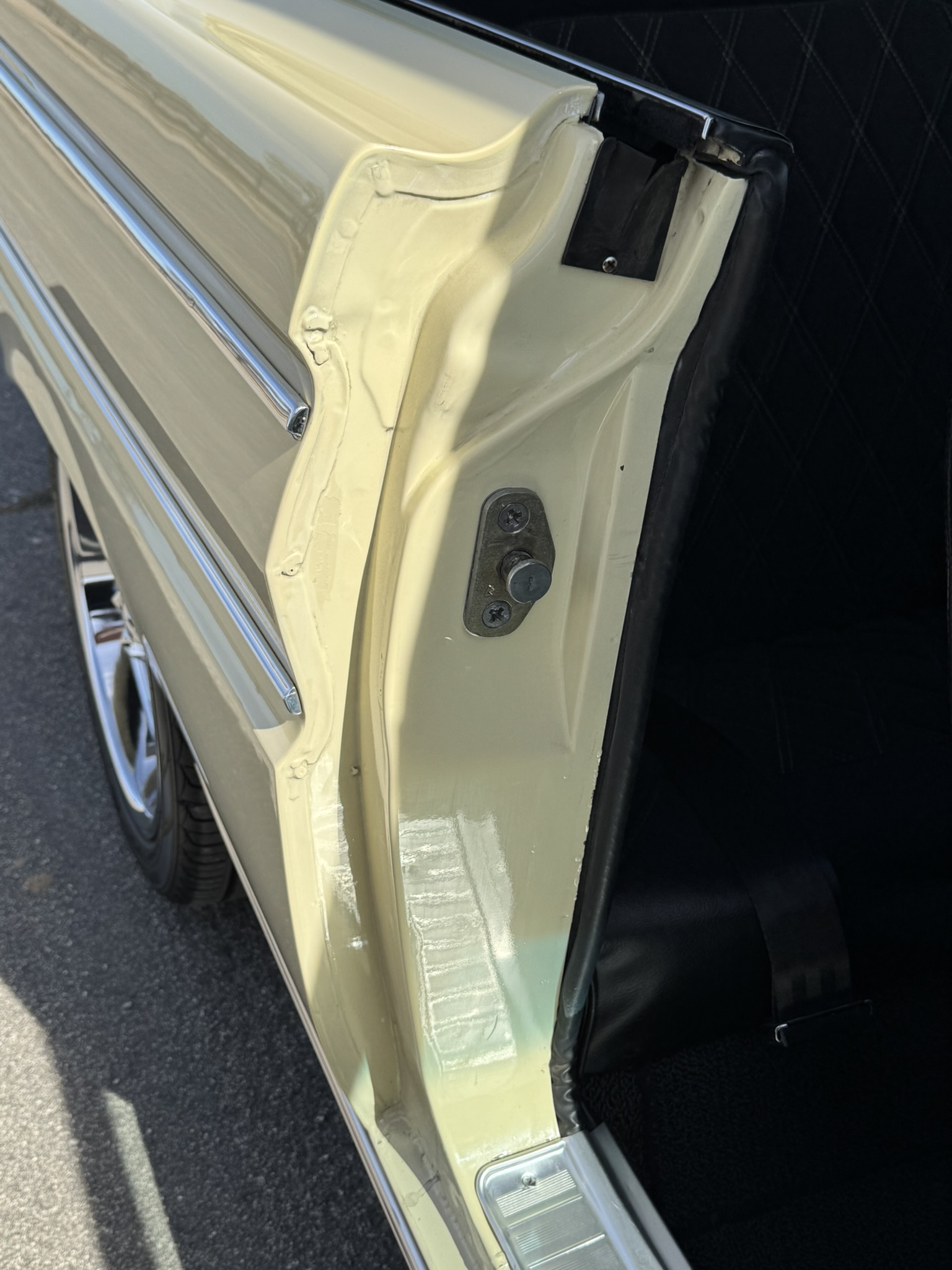 Door panels do not sit completely flush on the bottom edge. There is a small hole in the driver seat upholstery on the bottom side. There is some overspray from the re-paint as pictured.