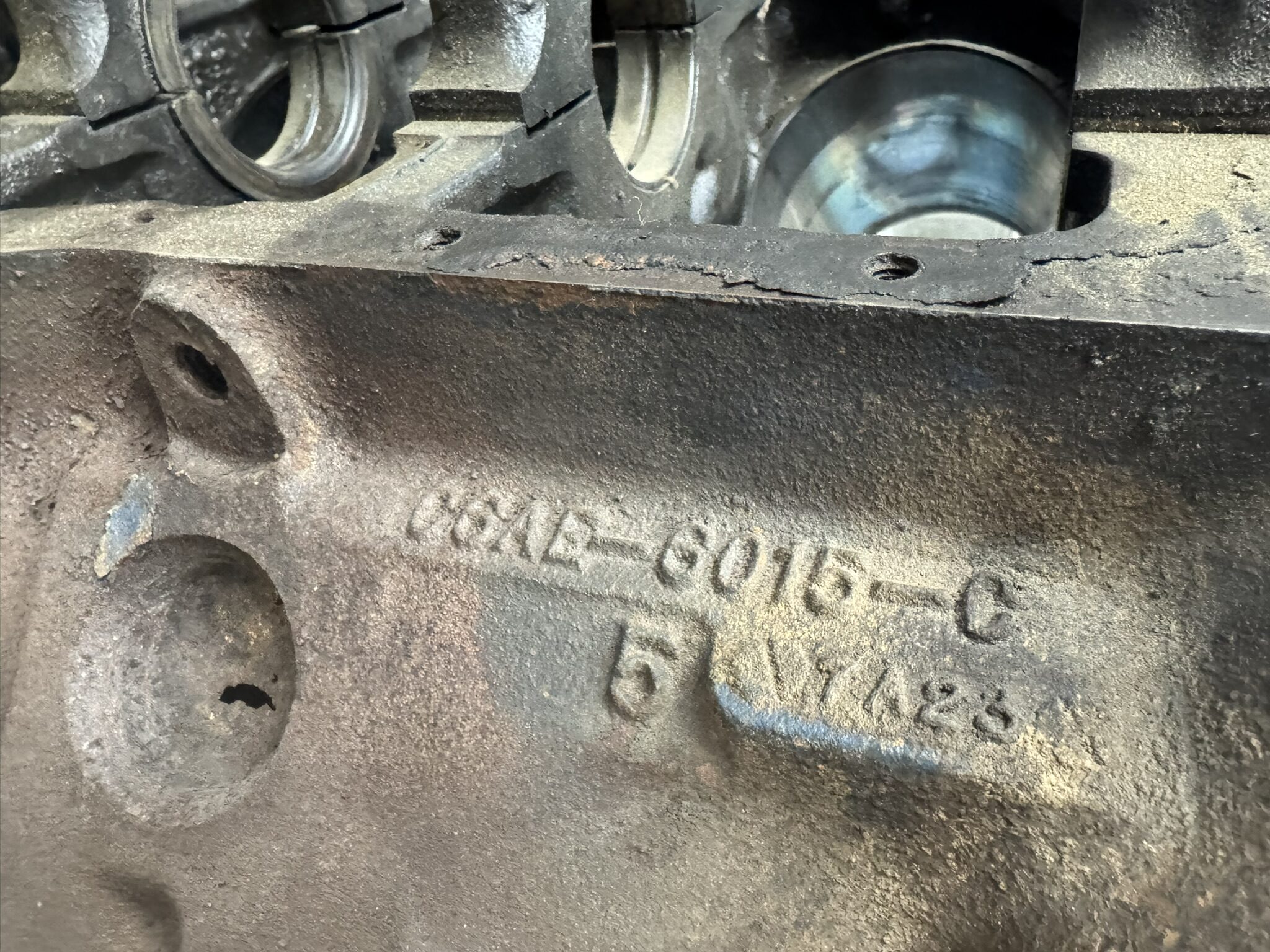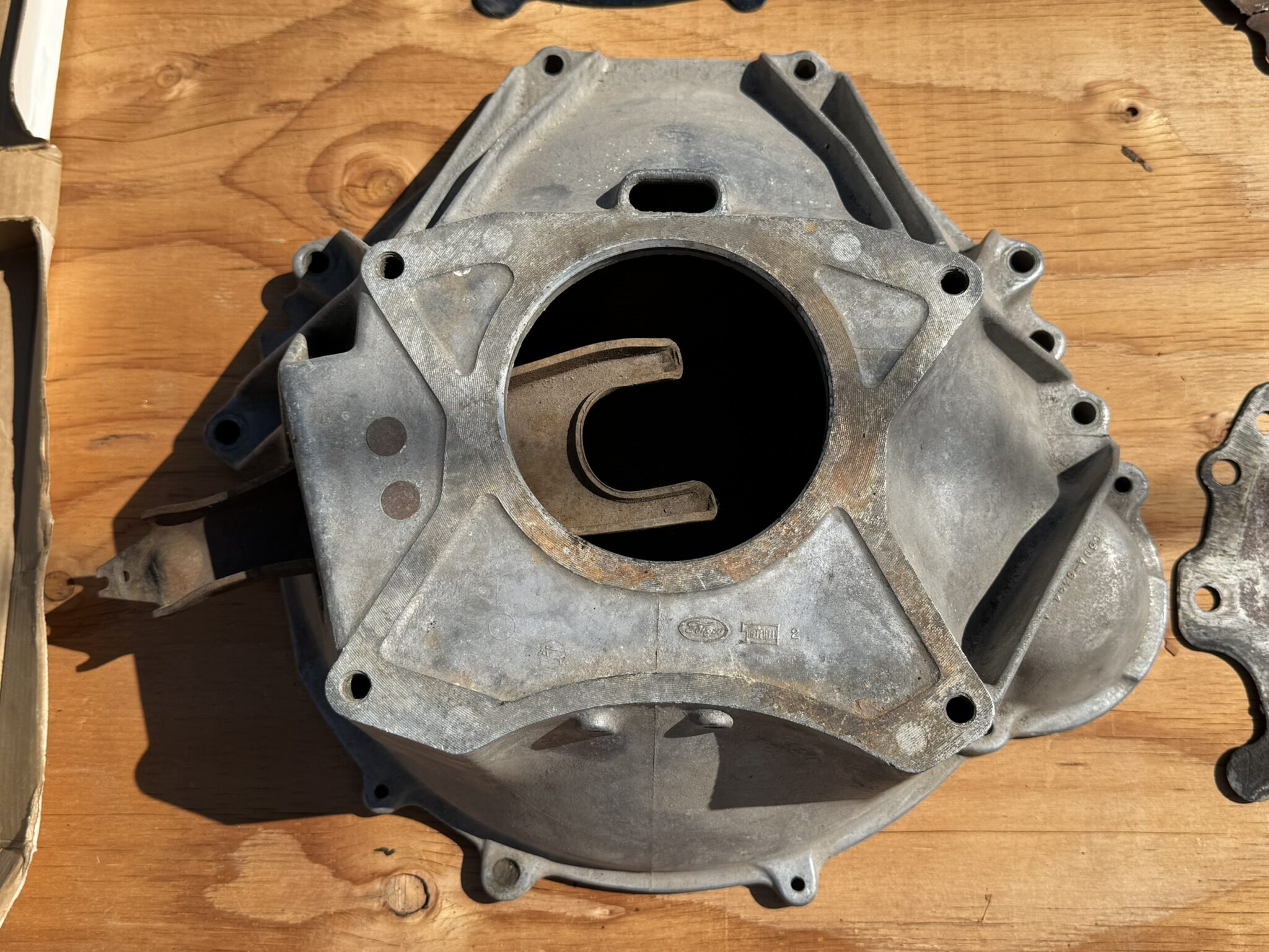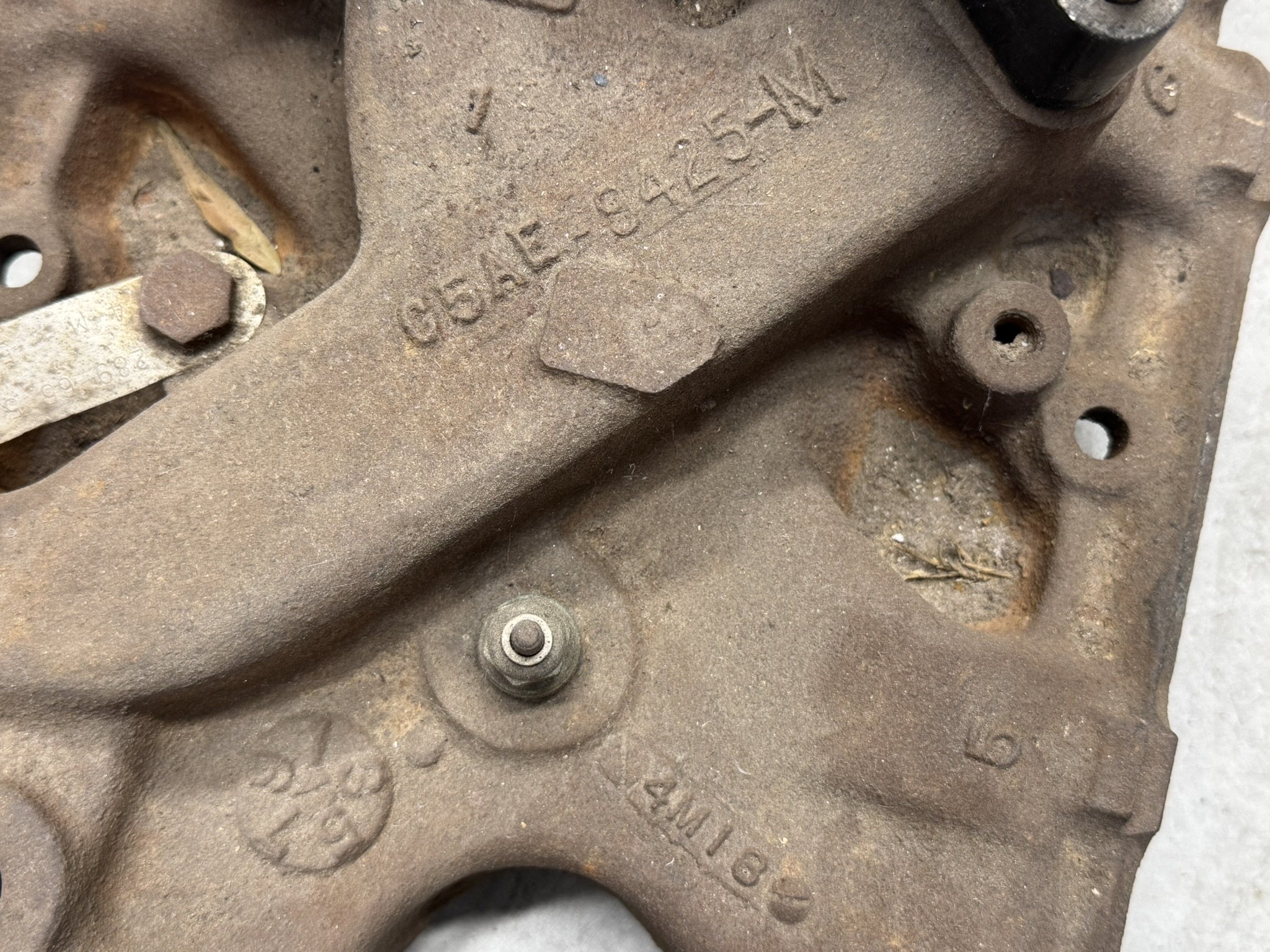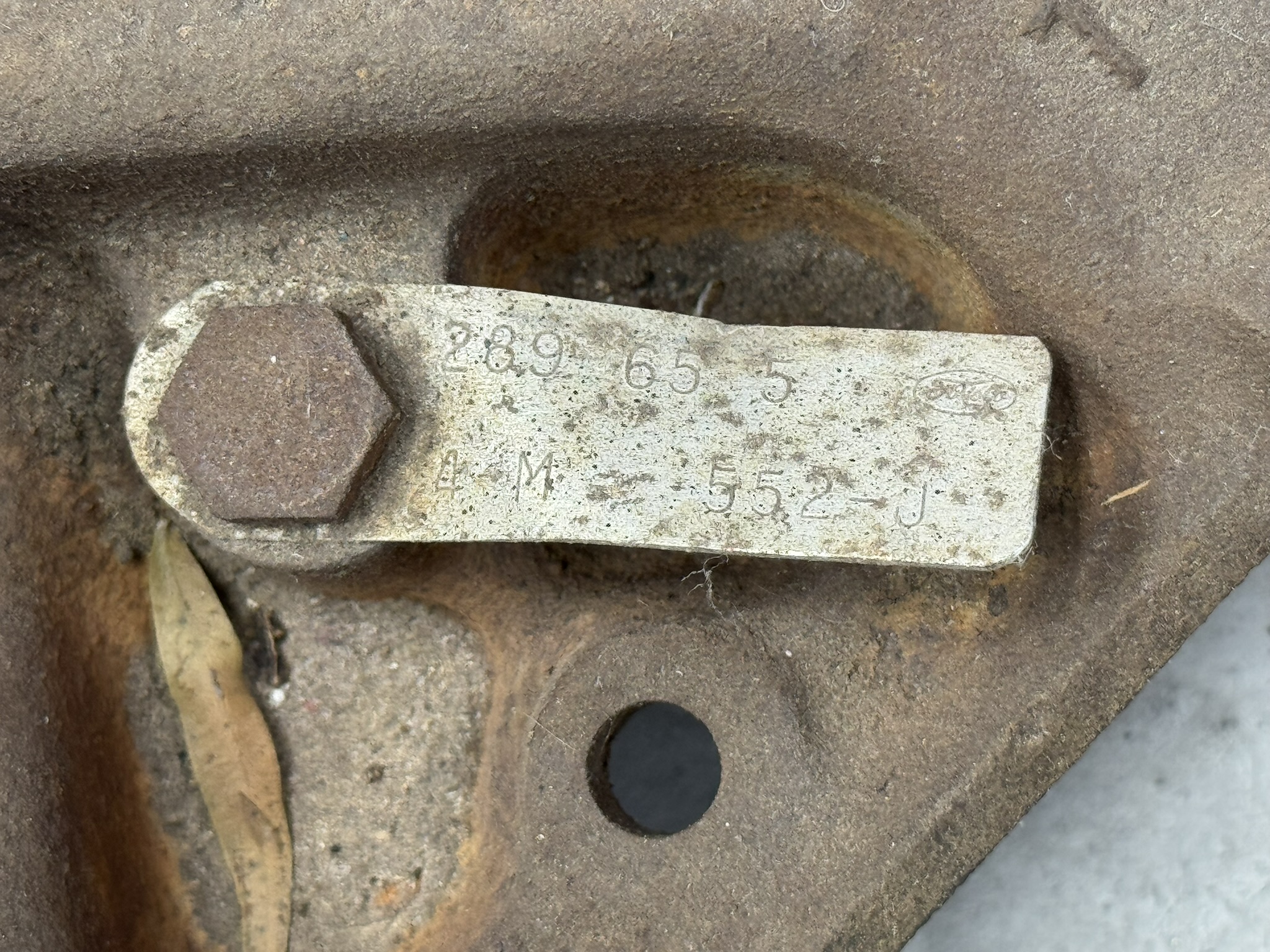 This A-Code Mustang came from the factory with a 4-barrel 289 V8, which is no longer with the car, making it a rolling chassis. Engine parts included are a 1965 date-coded block, 1965 289 heads, and a 1965 four-barrel intake with four-hole spacer. A crankshaft is also included along with other engine parts: timing chain cover, water pump, distributors, oil pan, valve covers, air cleaner, fan, and exhaust manifolds. The T-10 transmission is correct for this vintage of Mustang, though it's unknown whether it's original as the metal tag with date code is missing. An aluminum bellhousing, new 10-inch clutch kit, and motor plate are included. The 8-inch axle appears original with 3.00:1 gears and open differential. A driveshaft is included. The front suspension was updated with new components 10 years ago and should be inspected. The rear suspension appears factory correct and there is a rear sway bar included.