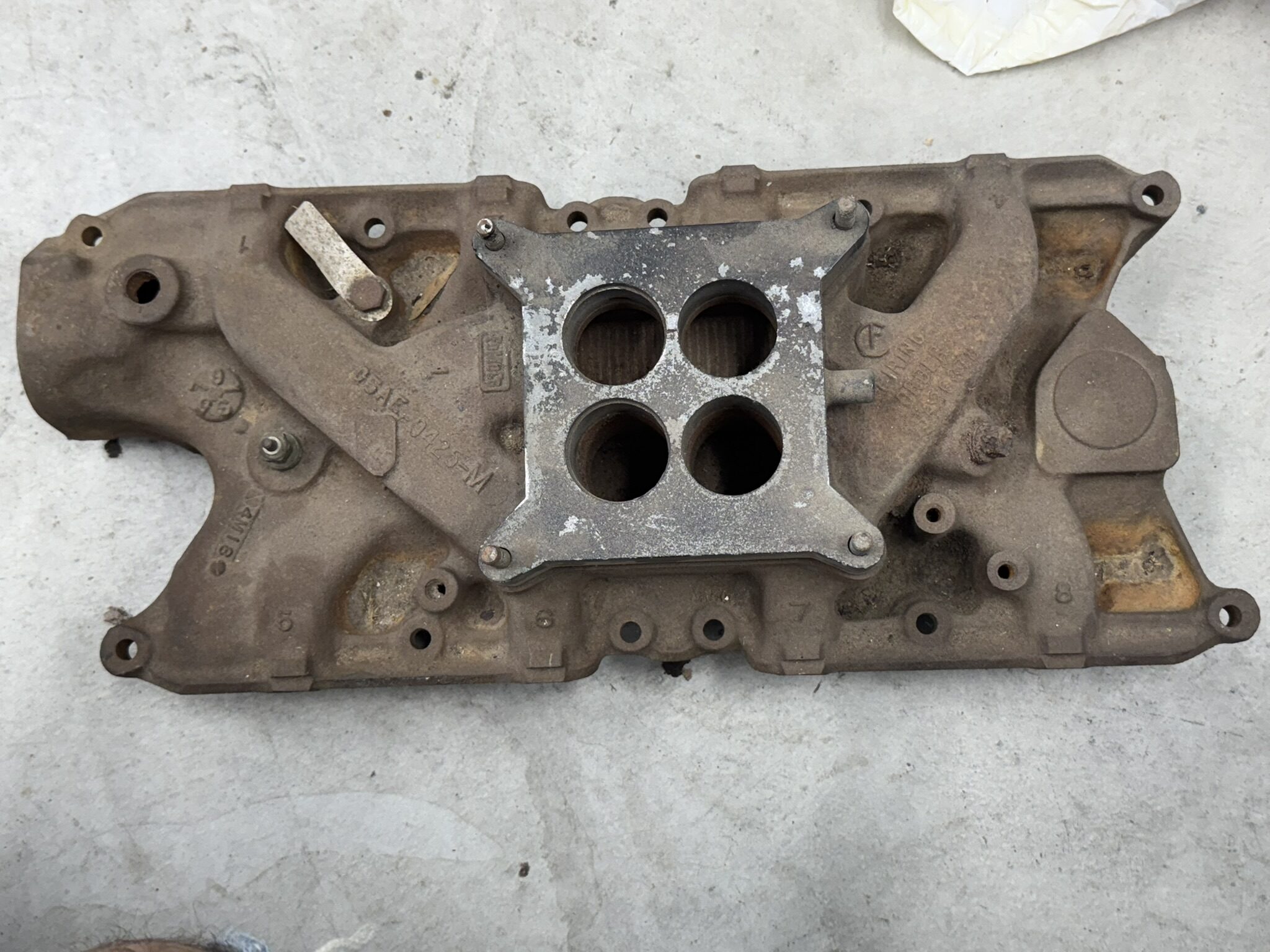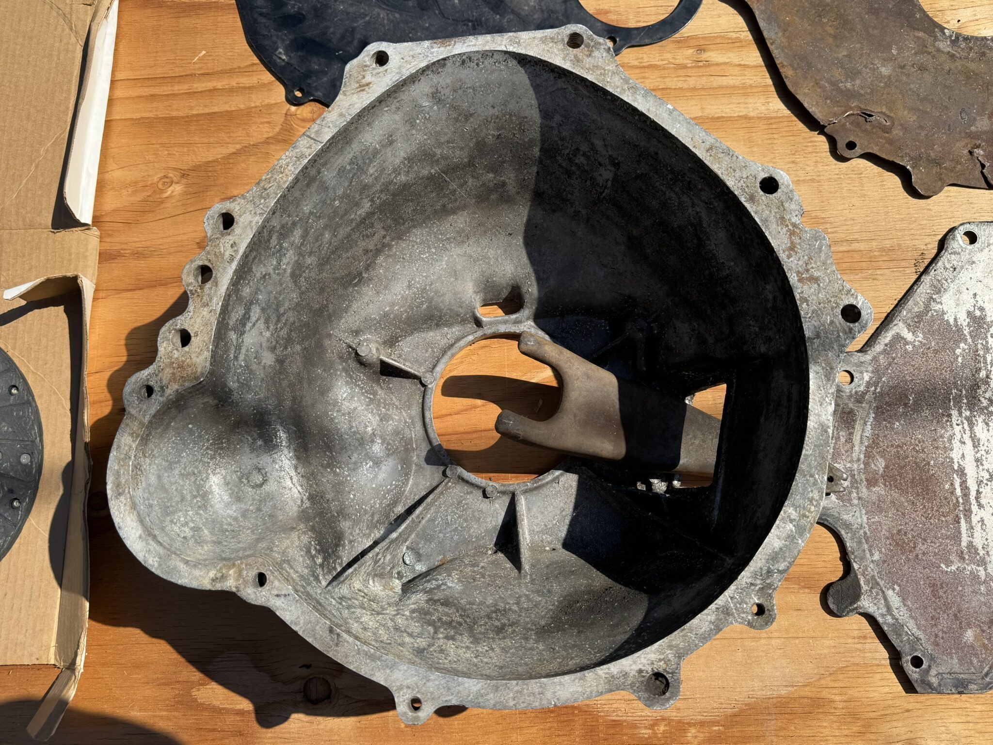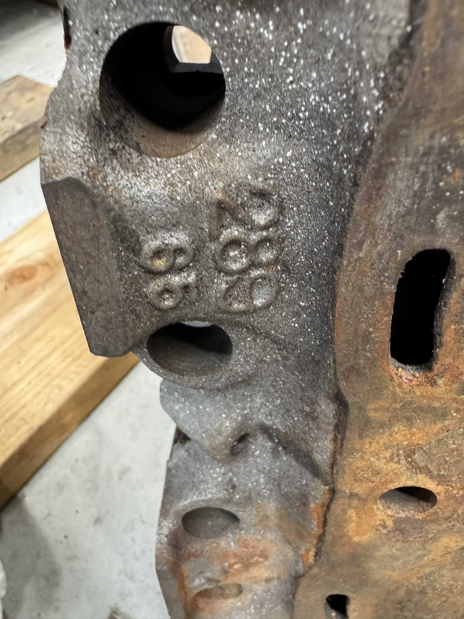 This A-Code Mustang came from the factory with a 4-barrel 289 V8, which is no longer with the car, making it a rolling chassis. Engine parts included are a 1965 date-coded block, 1965 289 heads, and a 1965 four-barrel intake with four-hole spacer. A crankshaft is also included along with other engine parts: timing chain cover, water pump, distributors, oil pan, valve covers, air cleaner, fan, and exhaust manifolds. The T-10 transmission is correct for this vintage of Mustang, though it's unknown whether it's original as the metal tag with date code is missing. An aluminum bellhousing, new 10-inch clutch kit, and motor plate are included. The 8-inch axle appears original with 3.00:1 gears and open differential. A driveshaft is included. The front suspension was updated with new components 10 years ago and should be inspected. The rear suspension appears factory correct and there is a rear sway bar included.