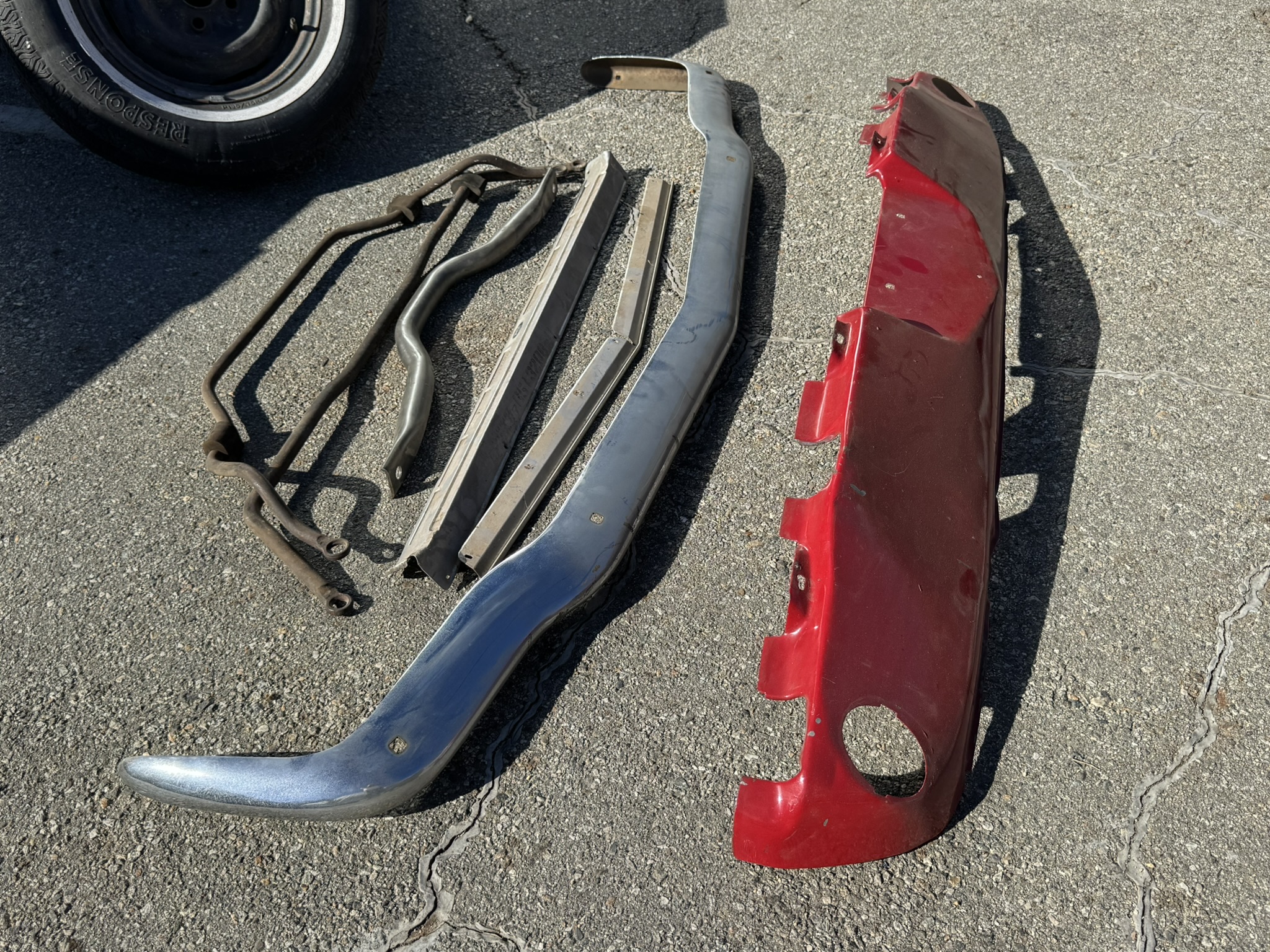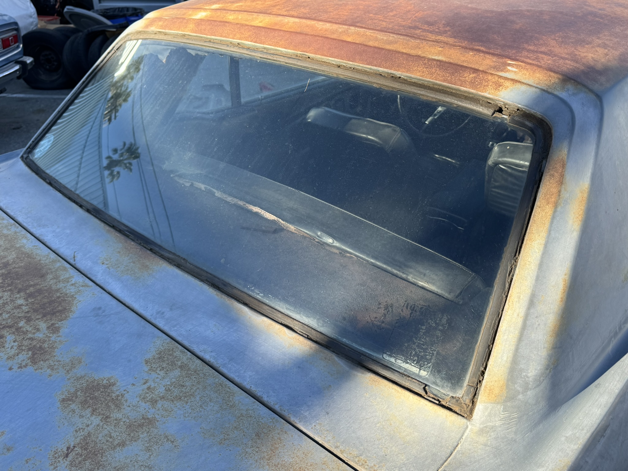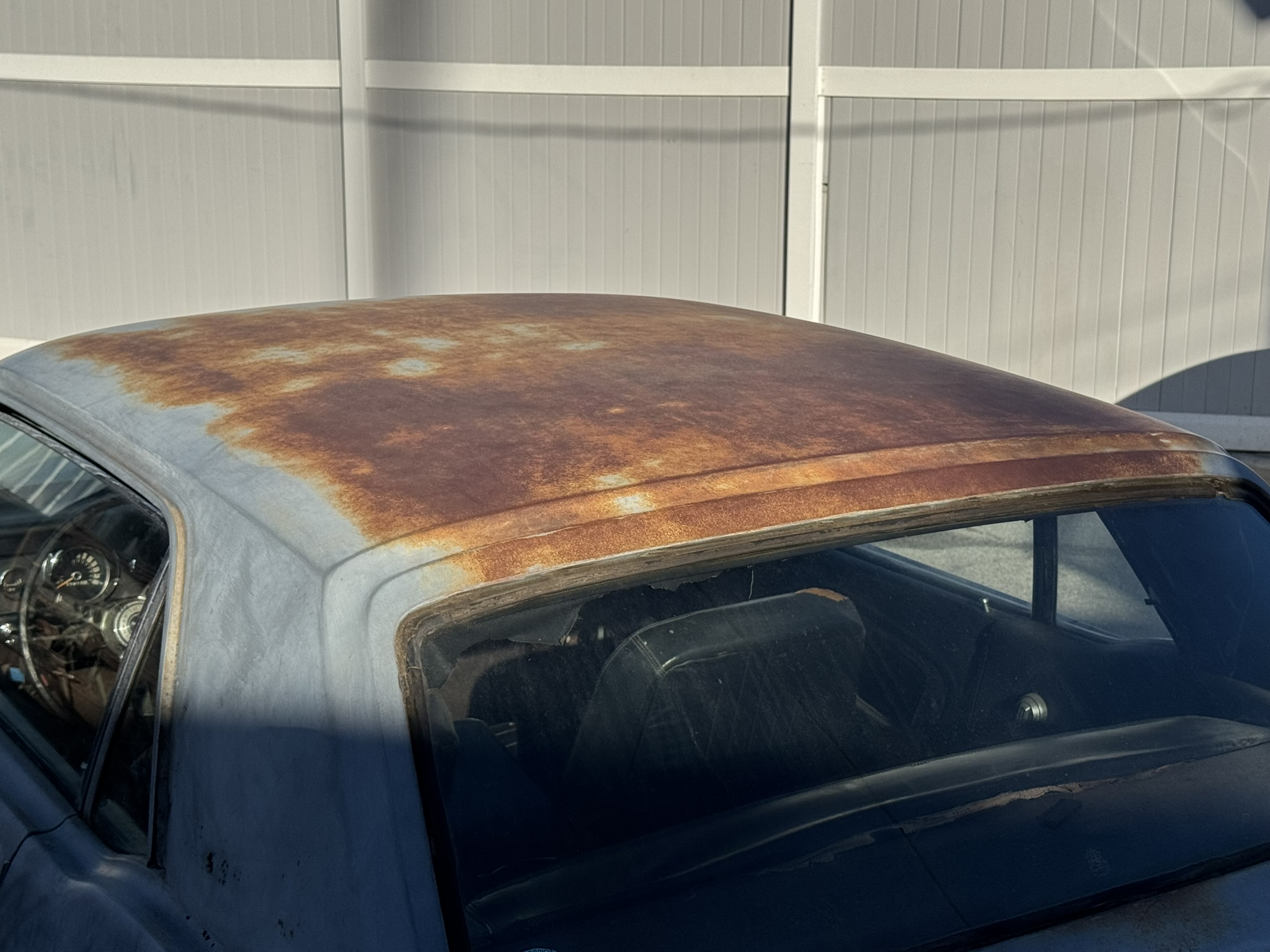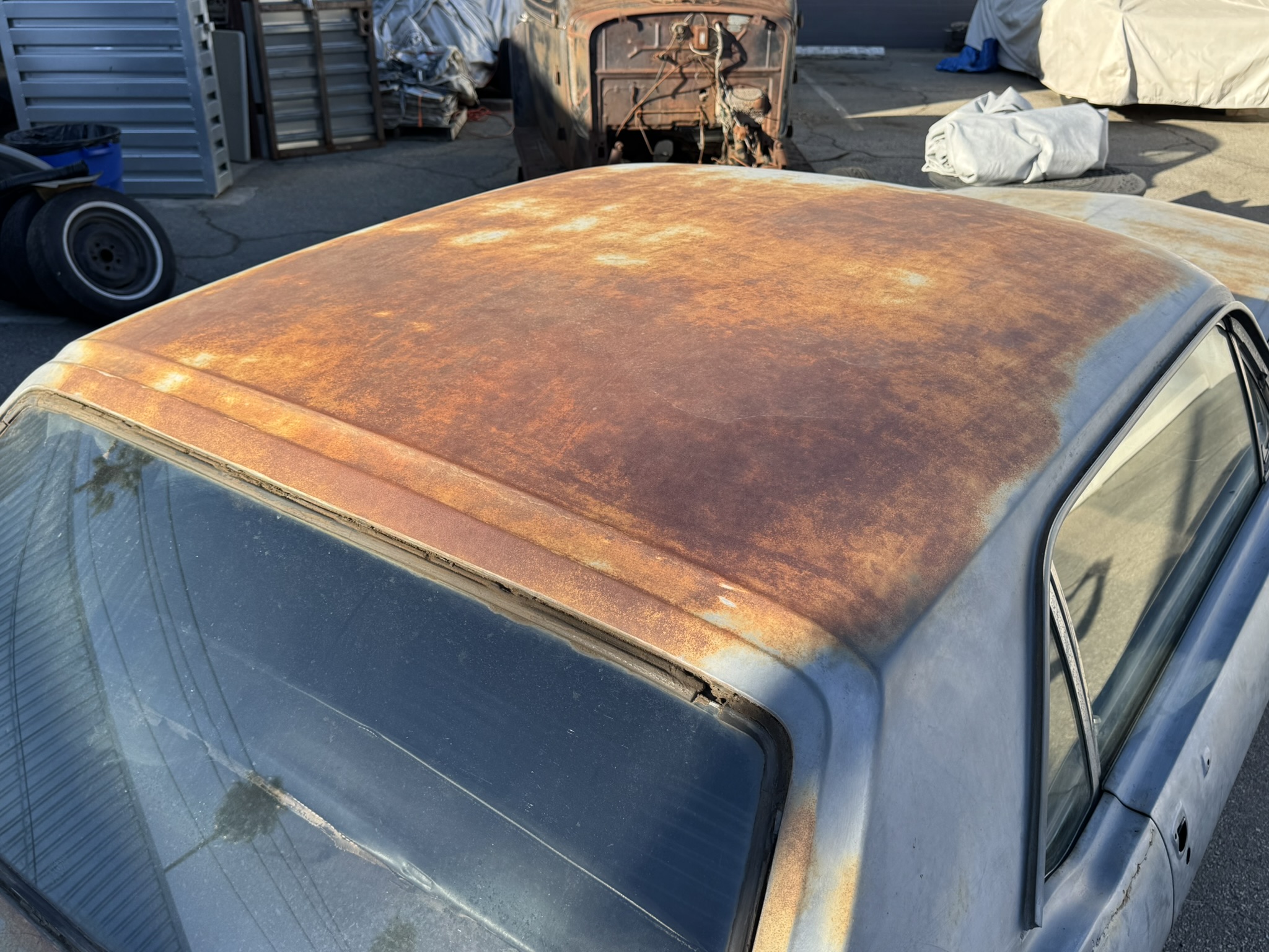 The front end requires reassembly, including fenders, hood, headlight buckets, headlights, turn signals, grille, and related components. The driver door needs a small patch on the rust spot. The driver's side roof panel requires sheetmetal patching or filling. The replacement passenger side quarter panel needs finishing prior to paint. New exterior door handles, door locks, and trunk lock need to be installed. The rear bumper is in poor condition and should be replaced. New tail light bezels and lenses are included, plus a host of other new and used emblems and trim items. The windshield is cracked, but the rest of the original glass is in good condition.