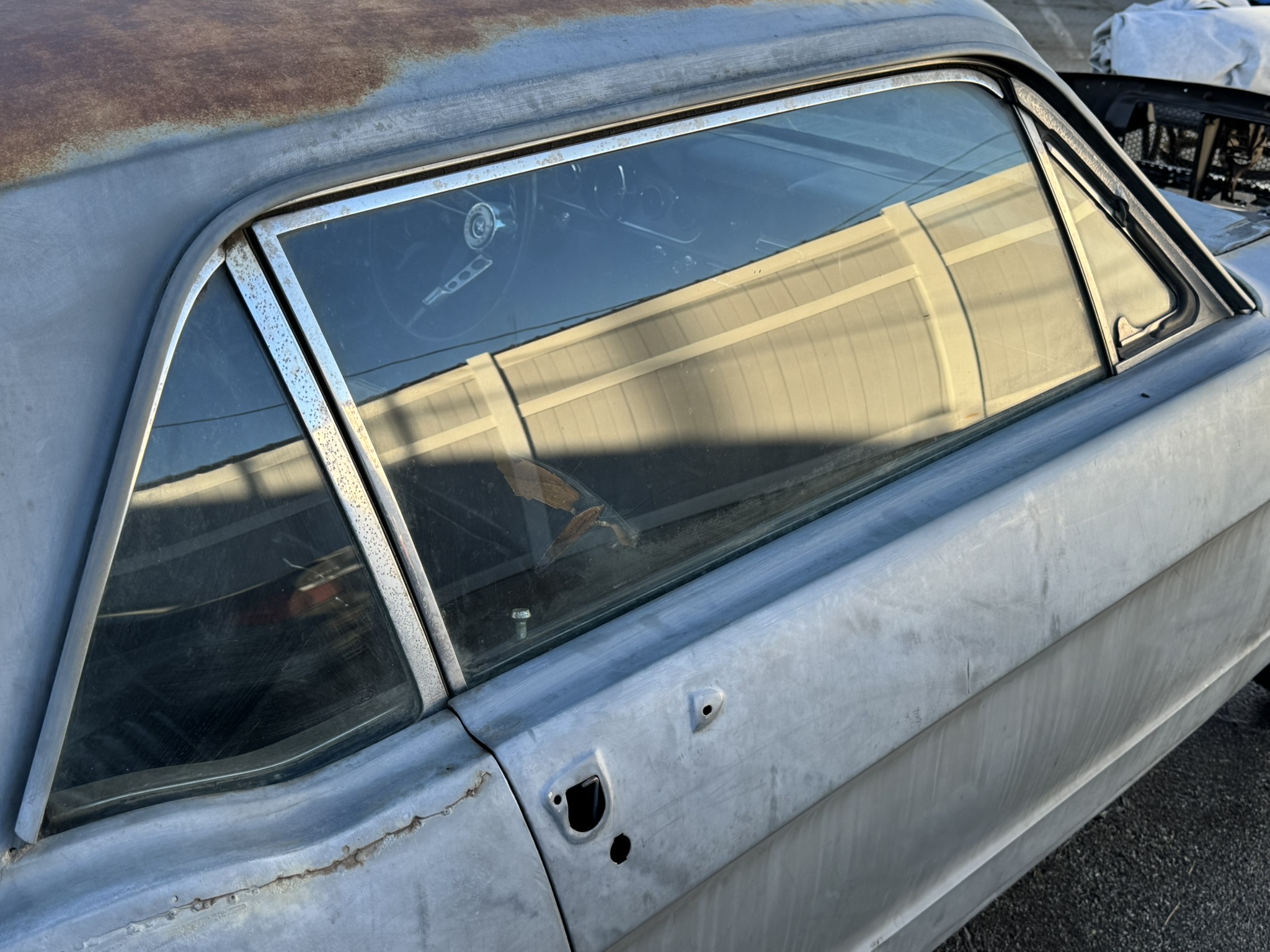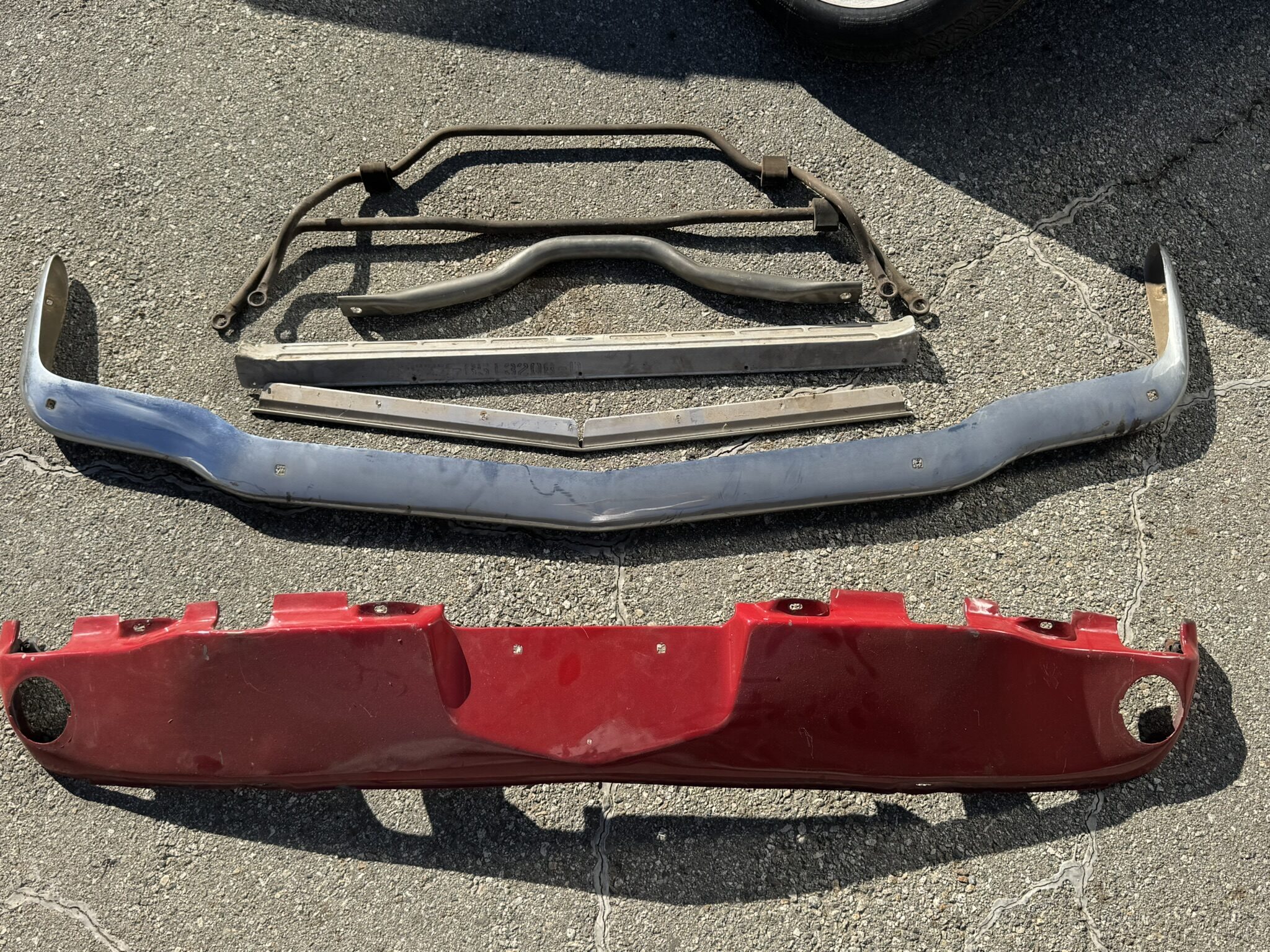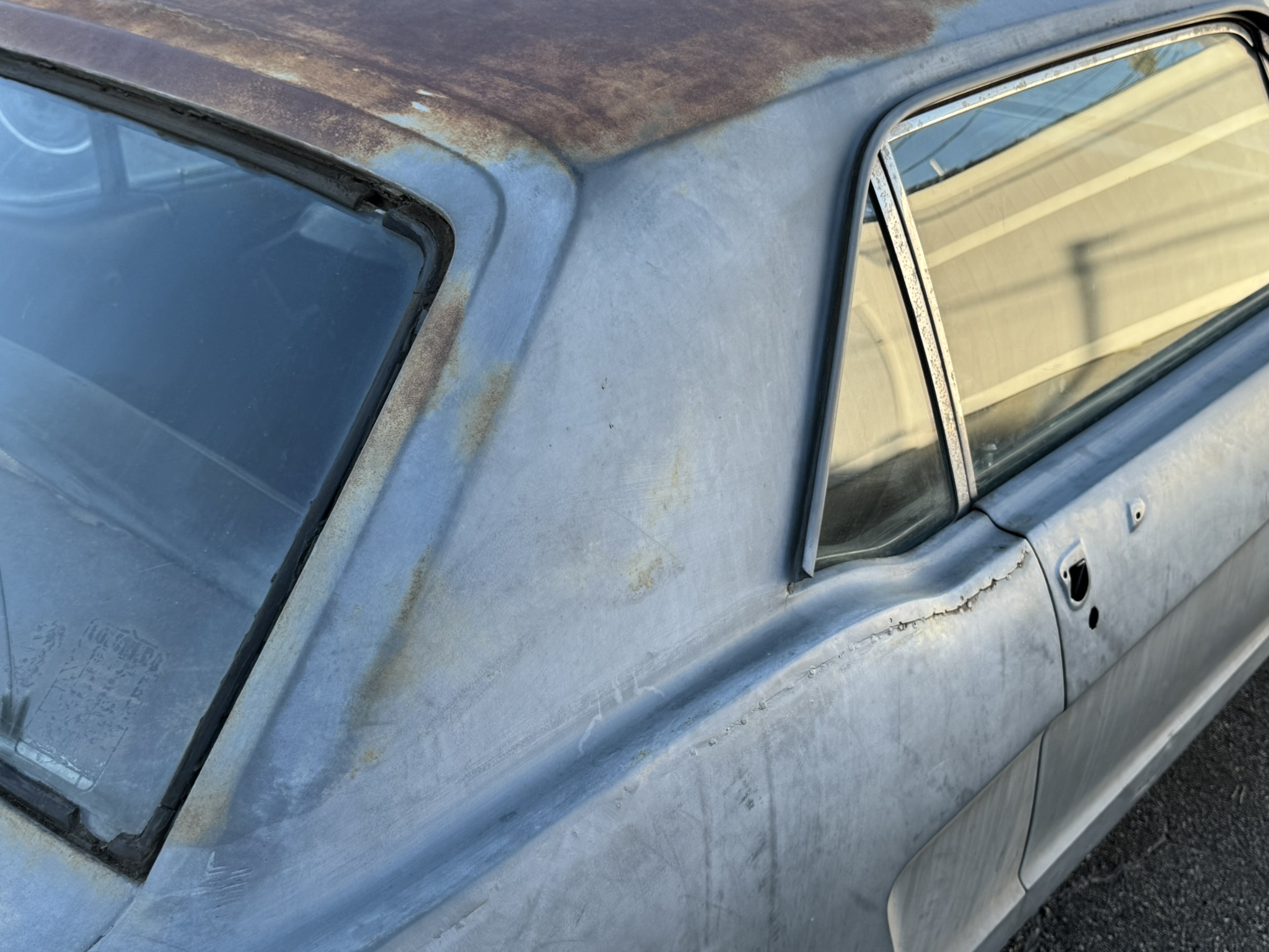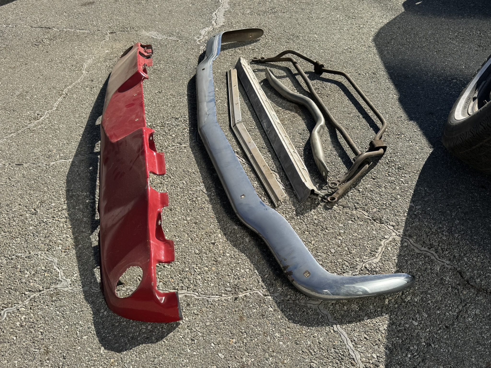 The front end requires reassembly, including fenders, hood, headlight buckets, headlights, turn signals, grille, and related components. The driver door needs a small patch on the rust spot. The driver's side roof panel requires sheetmetal patching or filling. The replacement passenger side quarter panel needs finishing prior to paint. New exterior door handles, door locks, and trunk lock need to be installed. The rear bumper is in poor condition and should be replaced. New tail light bezels and lenses are included, plus a host of other new and used emblems and trim items. The windshield is cracked, but the rest of the original glass is in good condition.