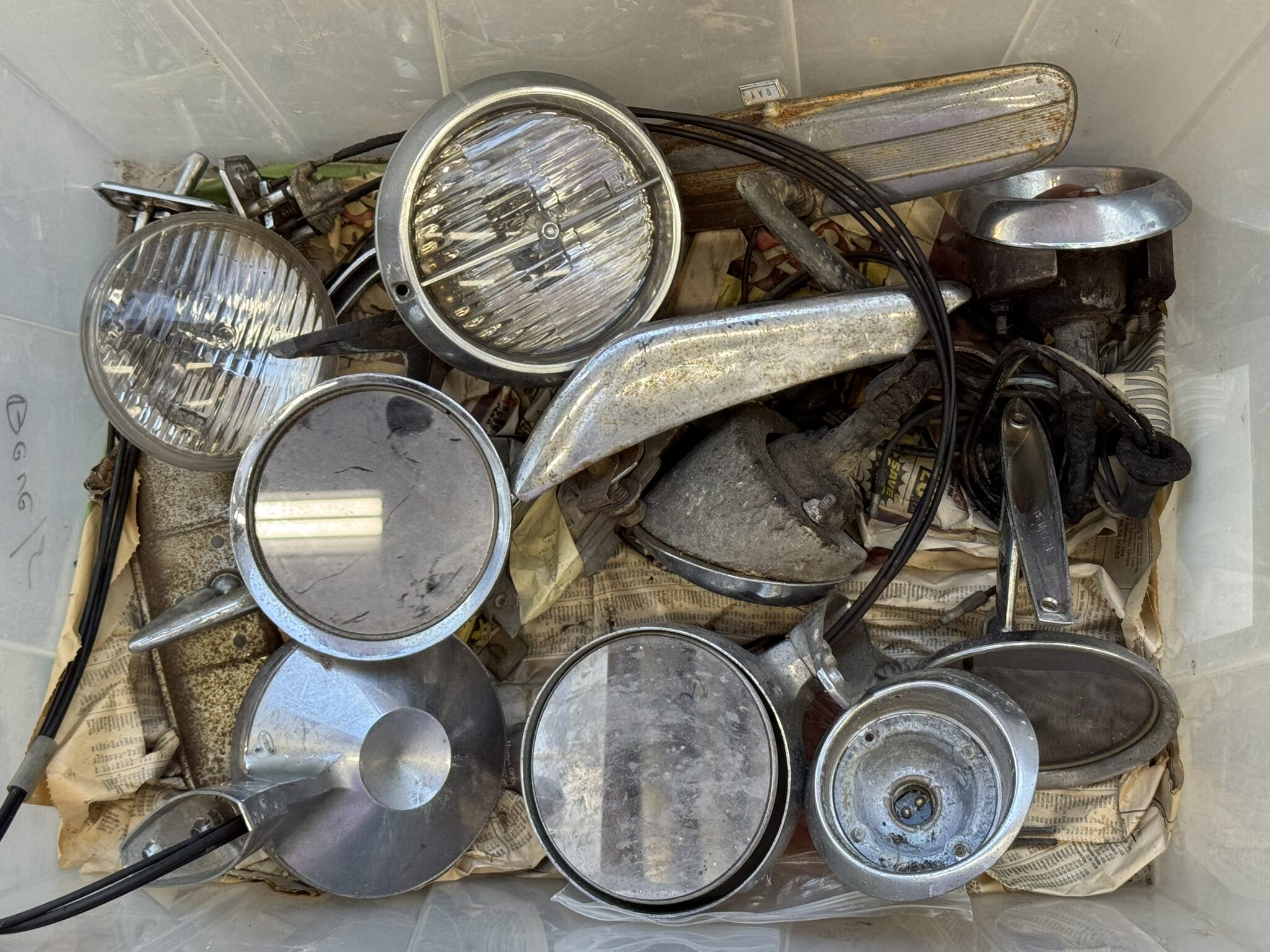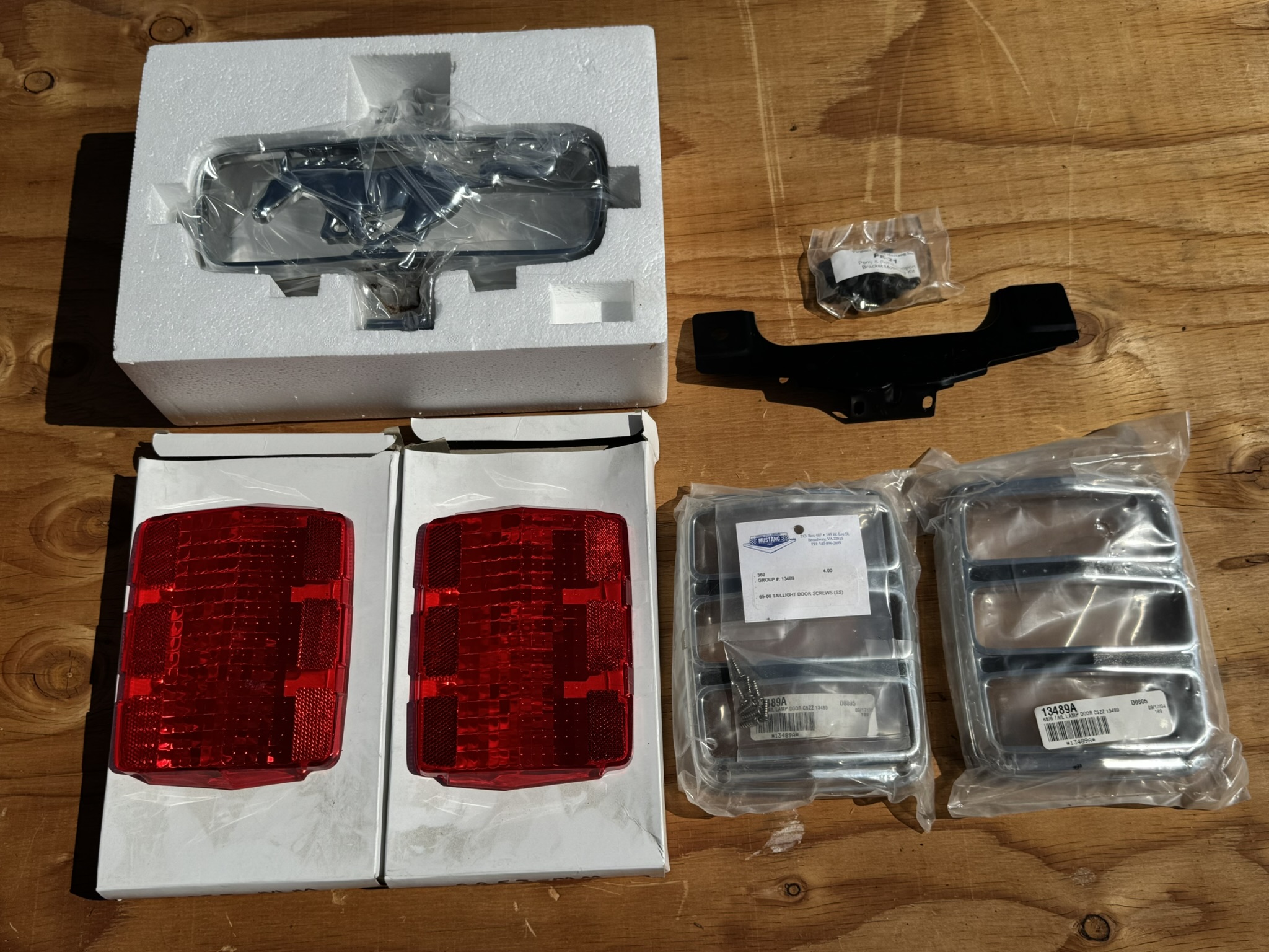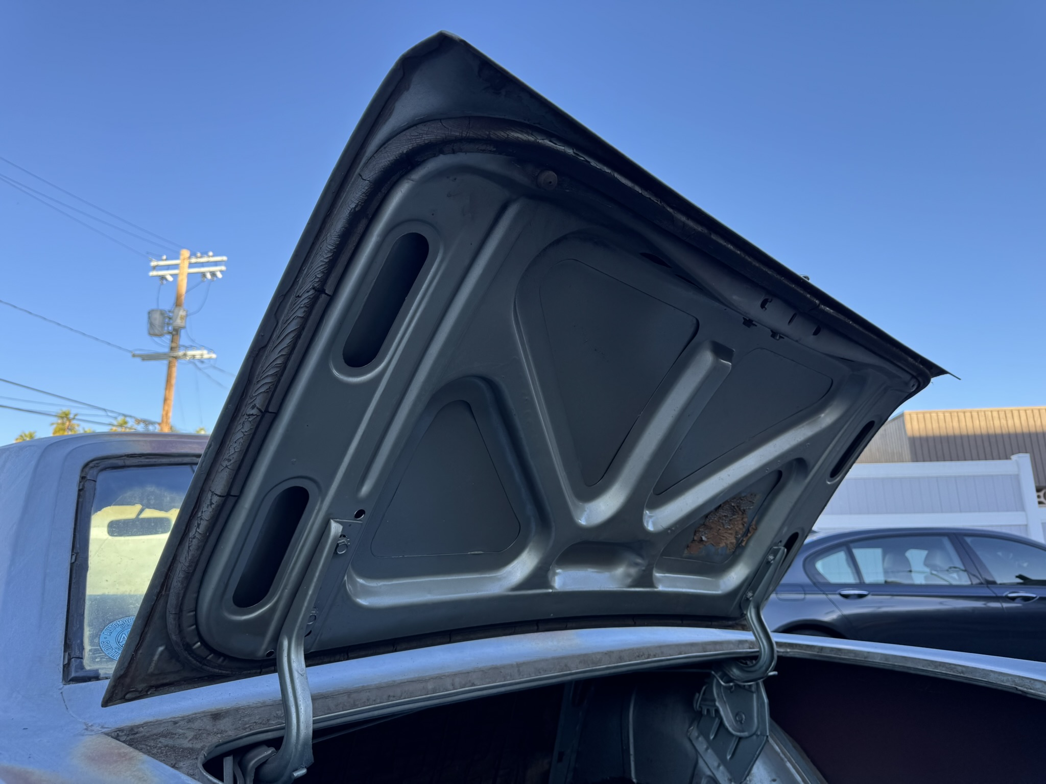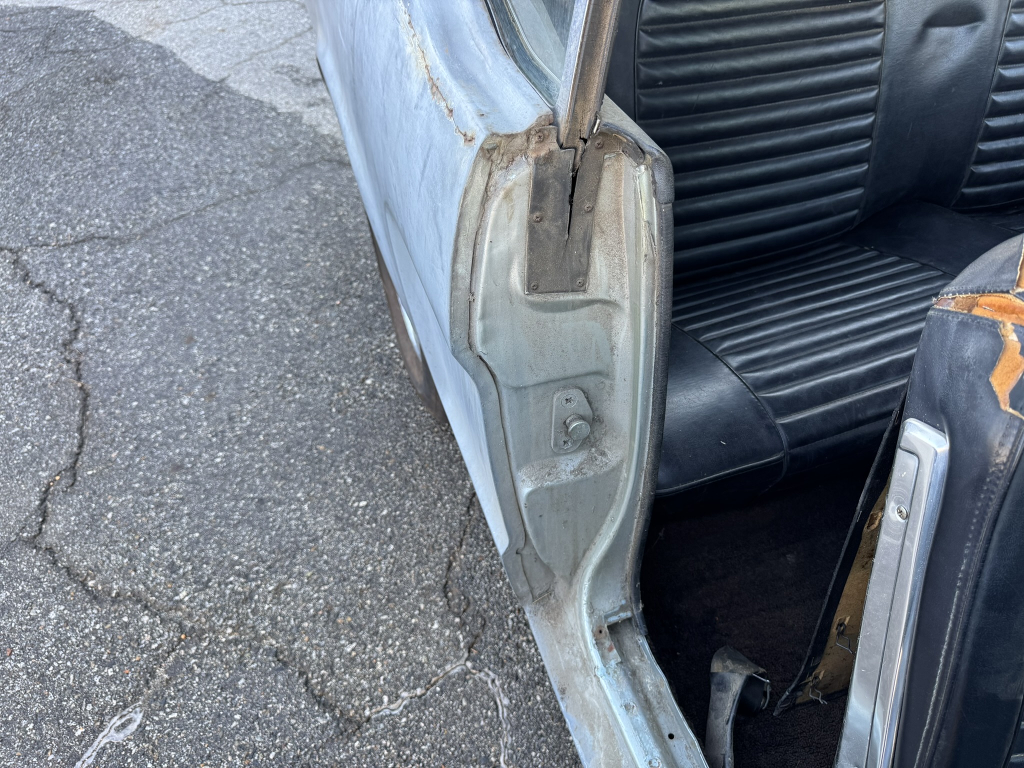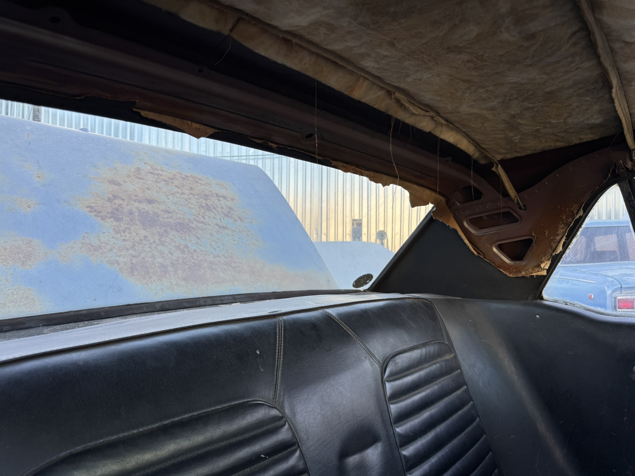 The front end requires reassembly, including fenders, hood, headlight buckets, headlights, turn signals, grille, and related components. The driver door needs a small patch on the rust spot. The driver's side roof panel requires sheetmetal patching or filling. The replacement passenger side quarter panel needs finishing prior to paint. New exterior door handles, door locks, and trunk lock need to be installed. The rear bumper is in poor condition and should be replaced. New tail light bezels and lenses are included, plus a host of other new and used emblems and trim items. The windshield is cracked, but the rest of the original glass is in good condition.
