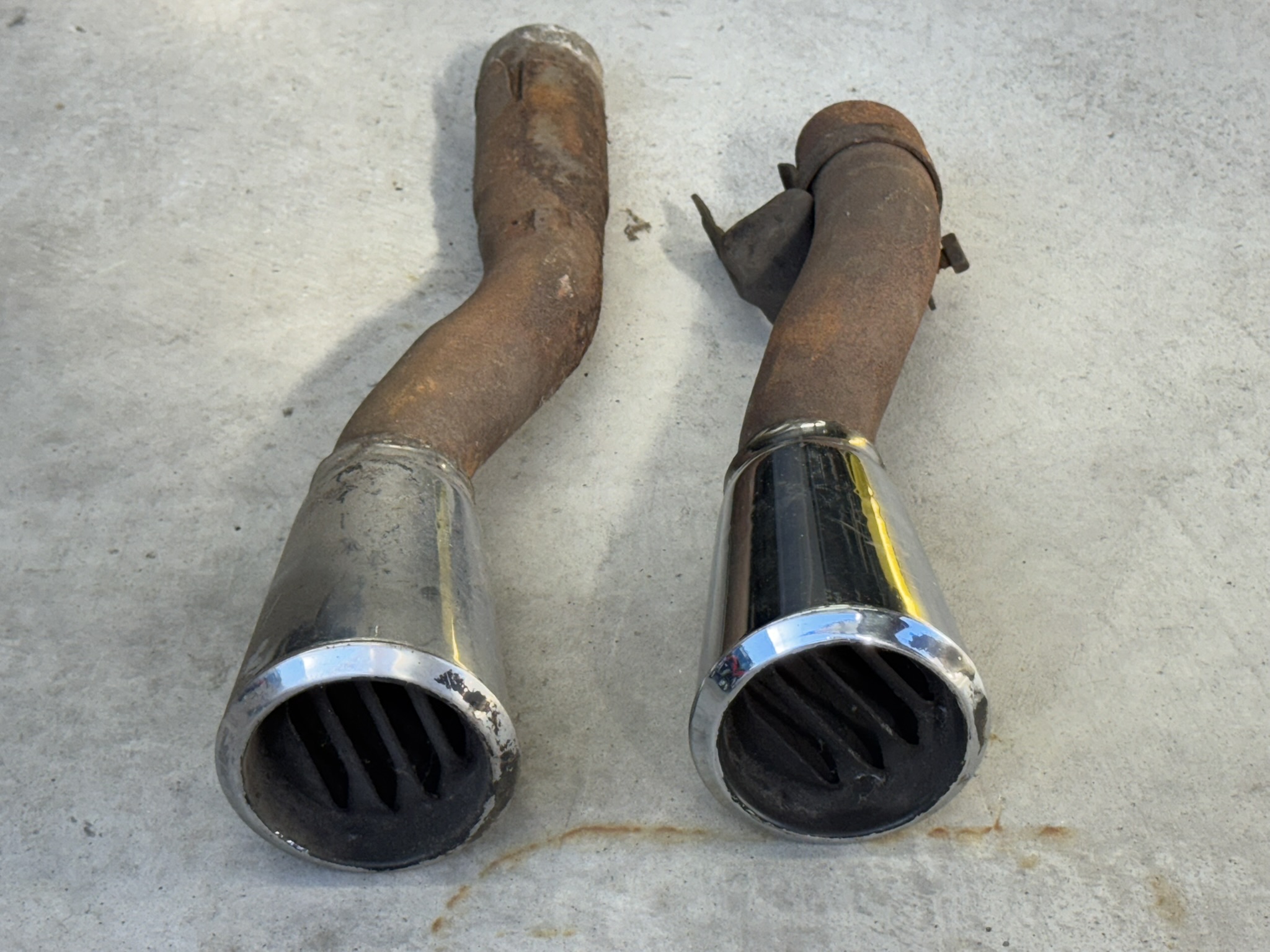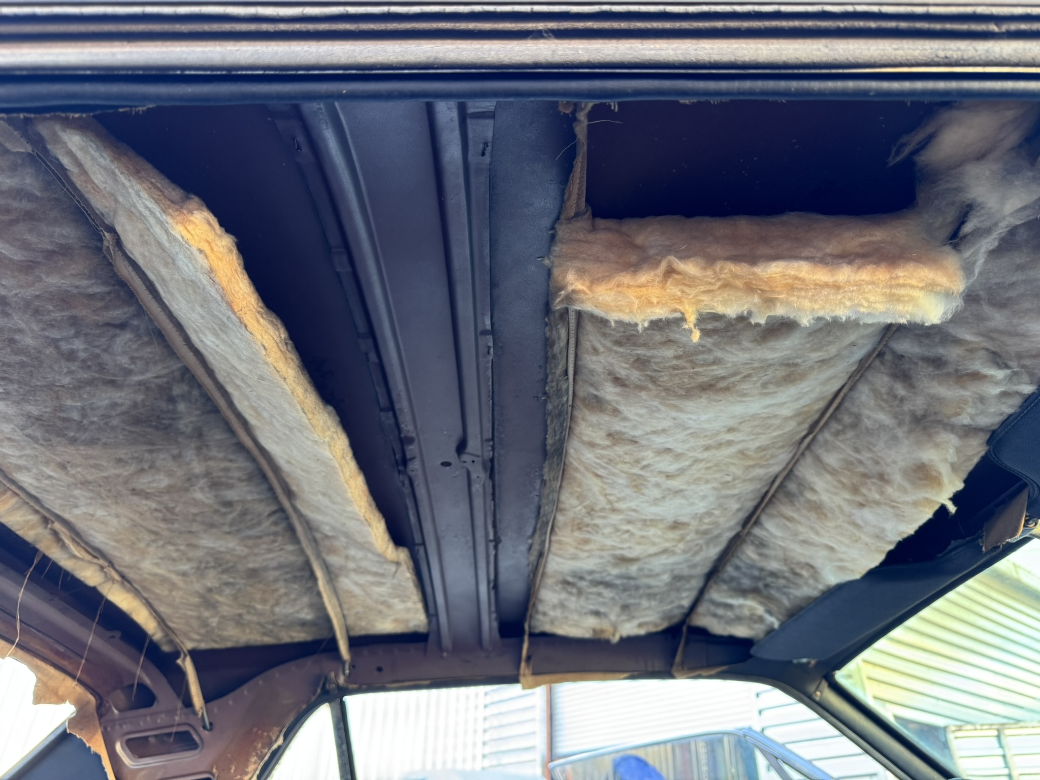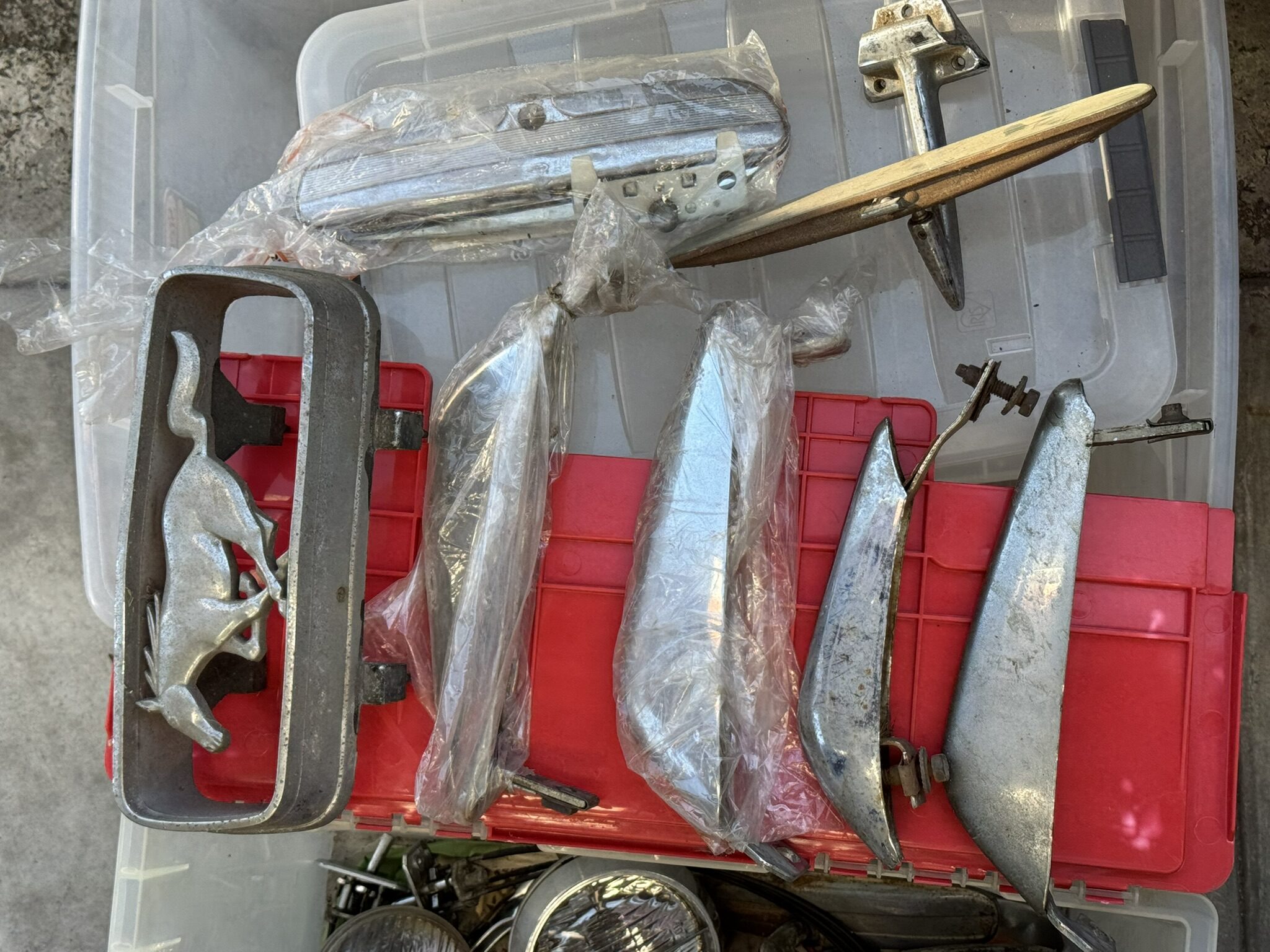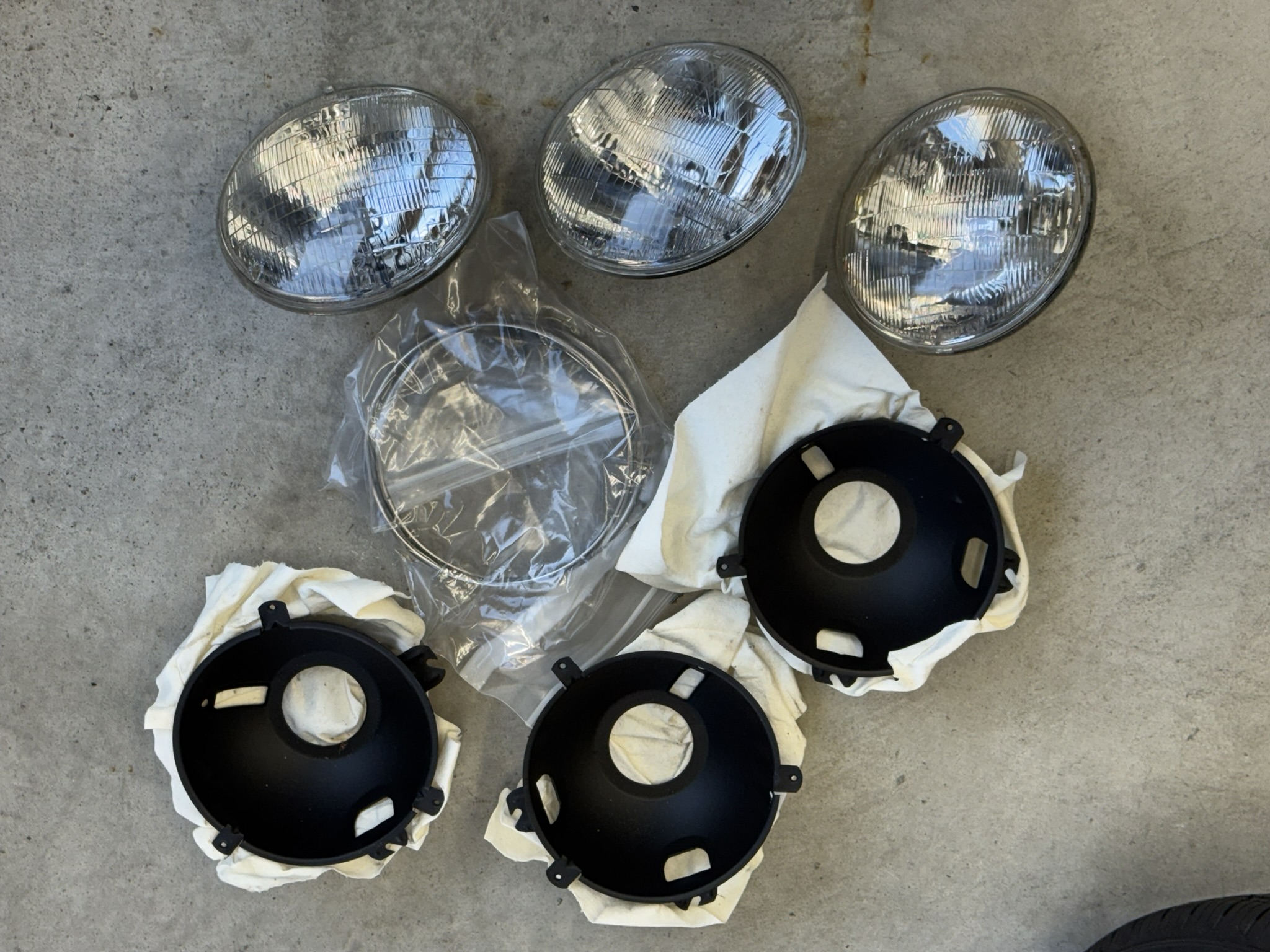 The front end requires reassembly, including fenders, hood, headlight buckets, headlights, turn signals, grille, and related components. The driver door needs a small patch on the rust spot. The driver's side roof panel requires sheetmetal patching or filling. The replacement passenger side quarter panel needs finishing prior to paint. New exterior door handles, door locks, and trunk lock need to be installed. The rear bumper is in poor condition and should be replaced. New tail light bezels and lenses are included, plus a host of other new and used emblems and trim items. The windshield is cracked, but the rest of the original glass is in good condition.