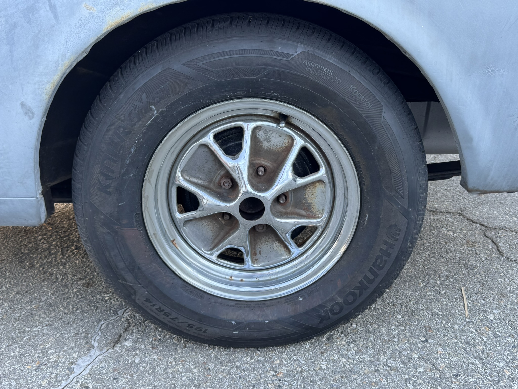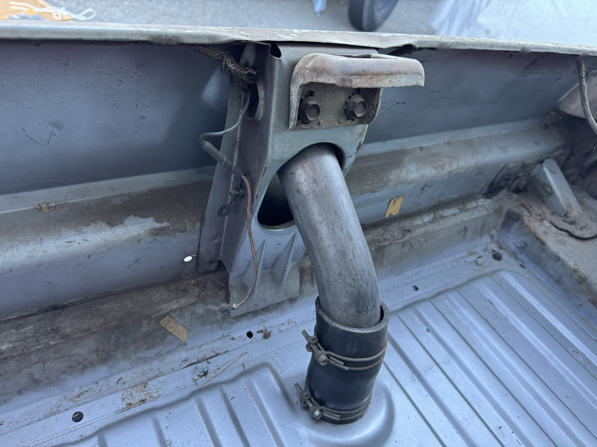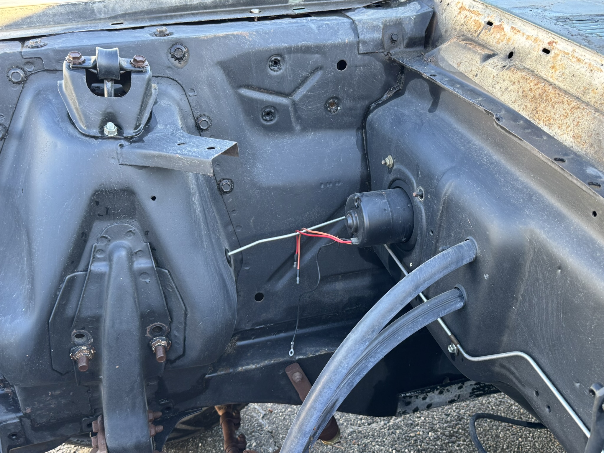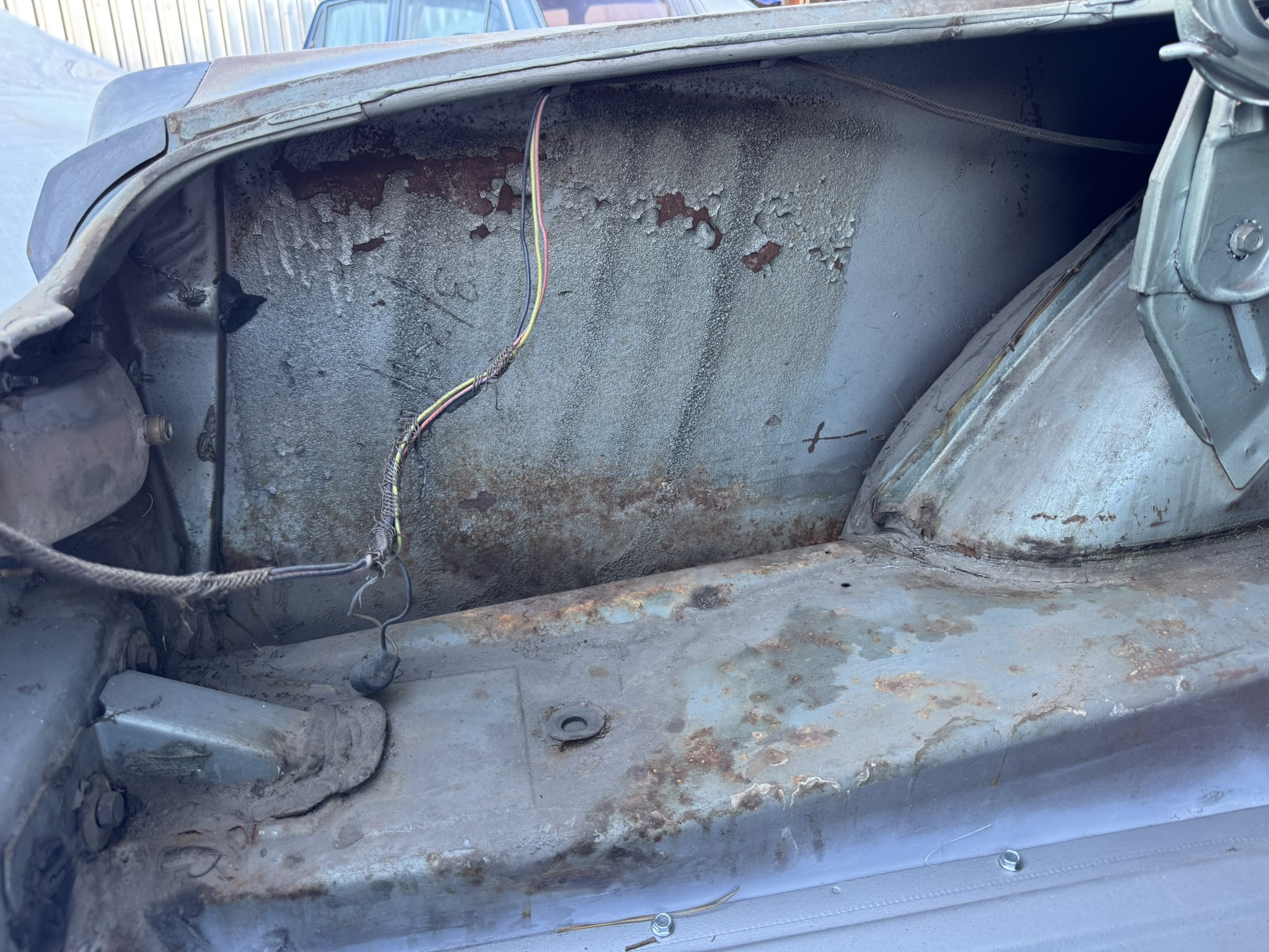 The interior is ready for restoration: recover the seats, replace the carpet, add door panels, install headliner, and secure or replace the dash pad. The steering column is wired for a Rally-Pac, making that a worthwhile addition. The steering wheel is cracked and should be replaced. A new heater core has been installed and the blower motor will need to be installed. The passenger side front floor needs patching on the front edge where it rusted through. No other floor areas require rust repair, only surface rust cleanup.