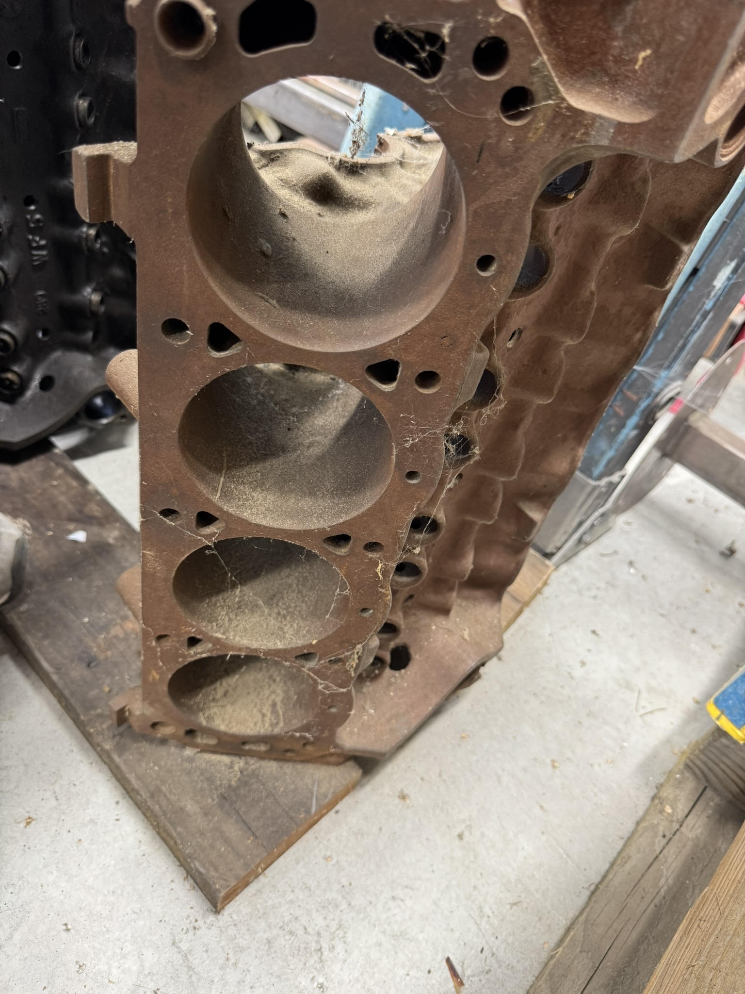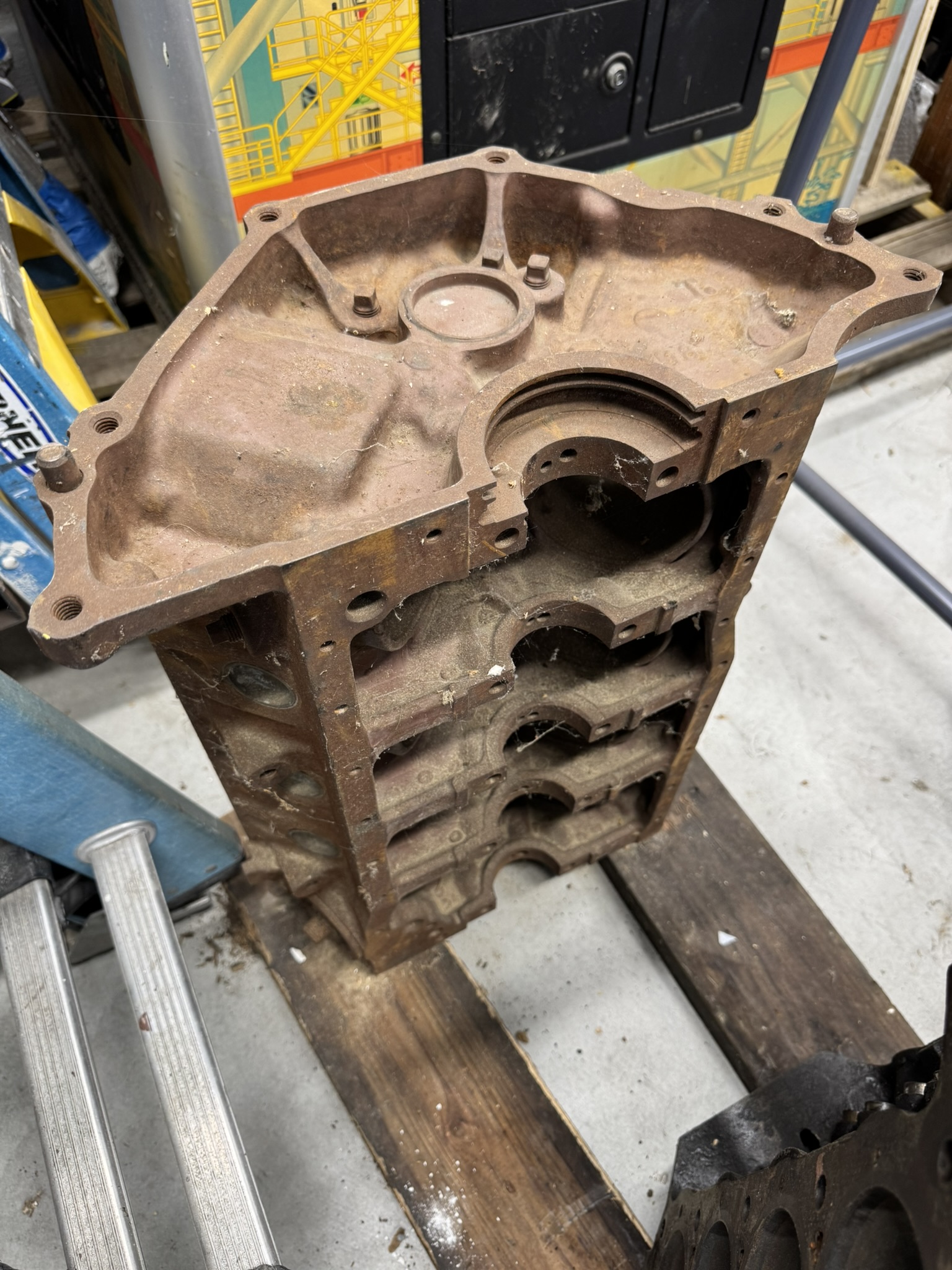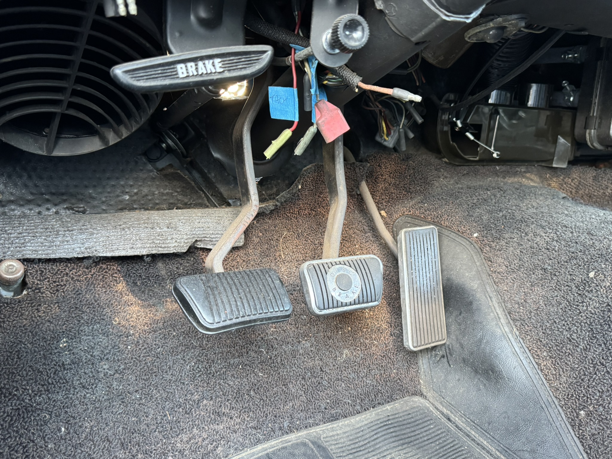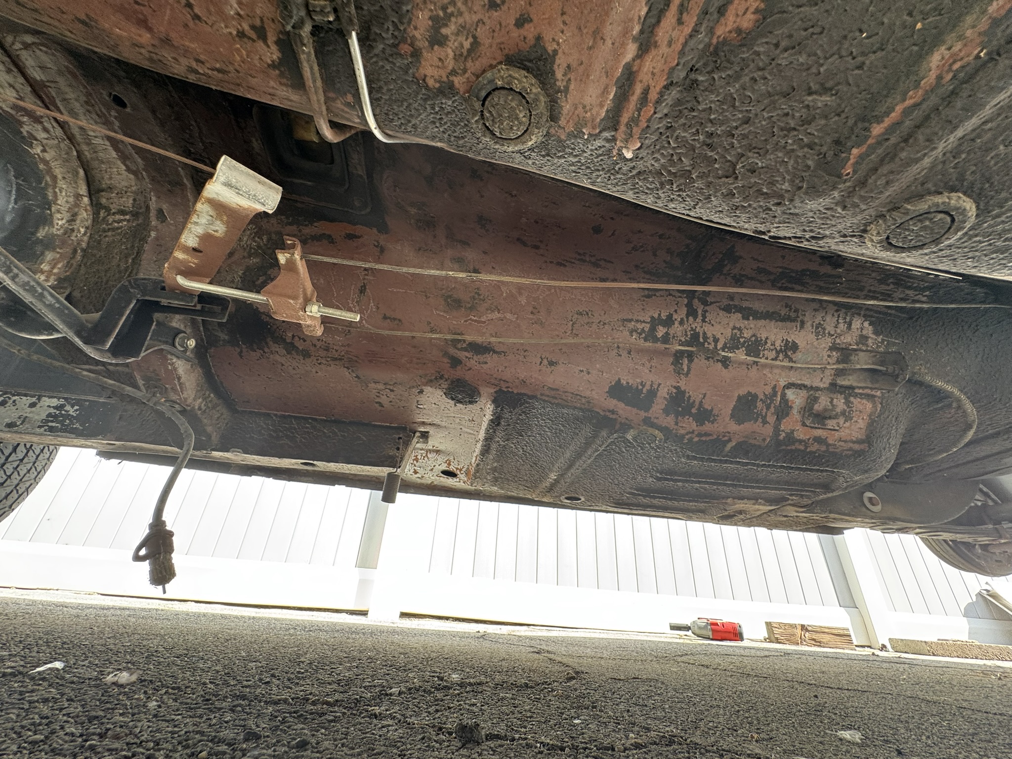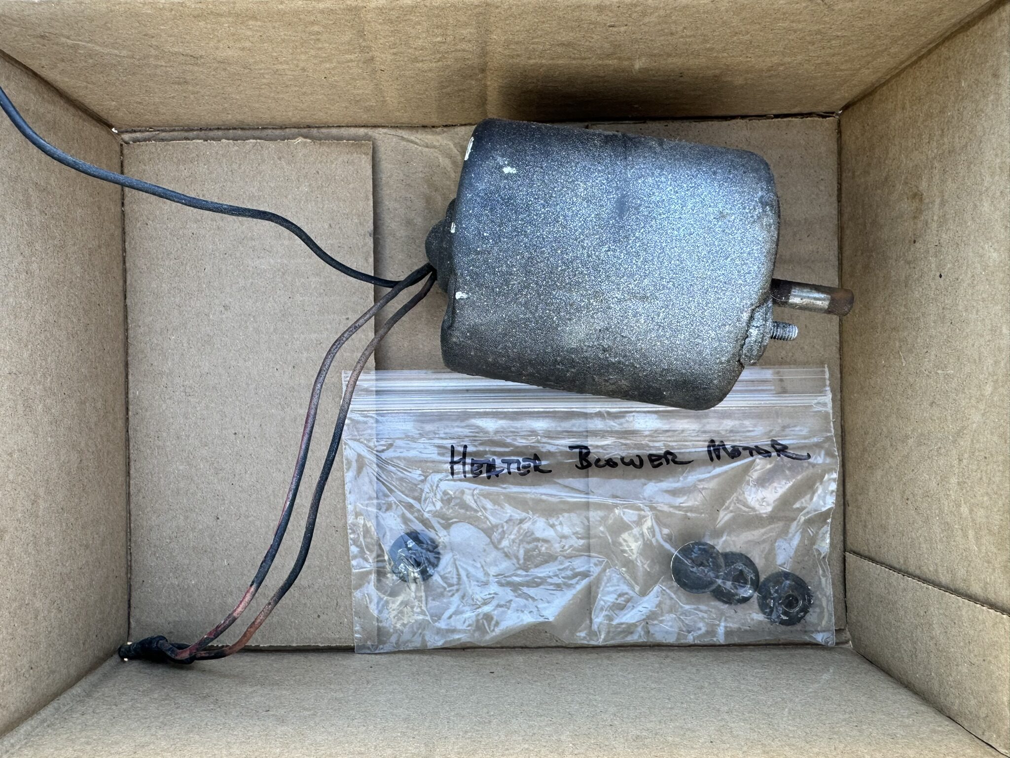 The interior is ready for restoration: recover the seats, replace the carpet, add door panels, install headliner, and secure or replace the dash pad. The steering column is wired for a Rally-Pac, making that a worthwhile addition. The steering wheel is cracked and should be replaced. A new heater core has been installed and the blower motor will need to be installed. The passenger side front floor needs patching on the front edge where it rusted through. No other floor areas require rust repair, only surface rust cleanup.
