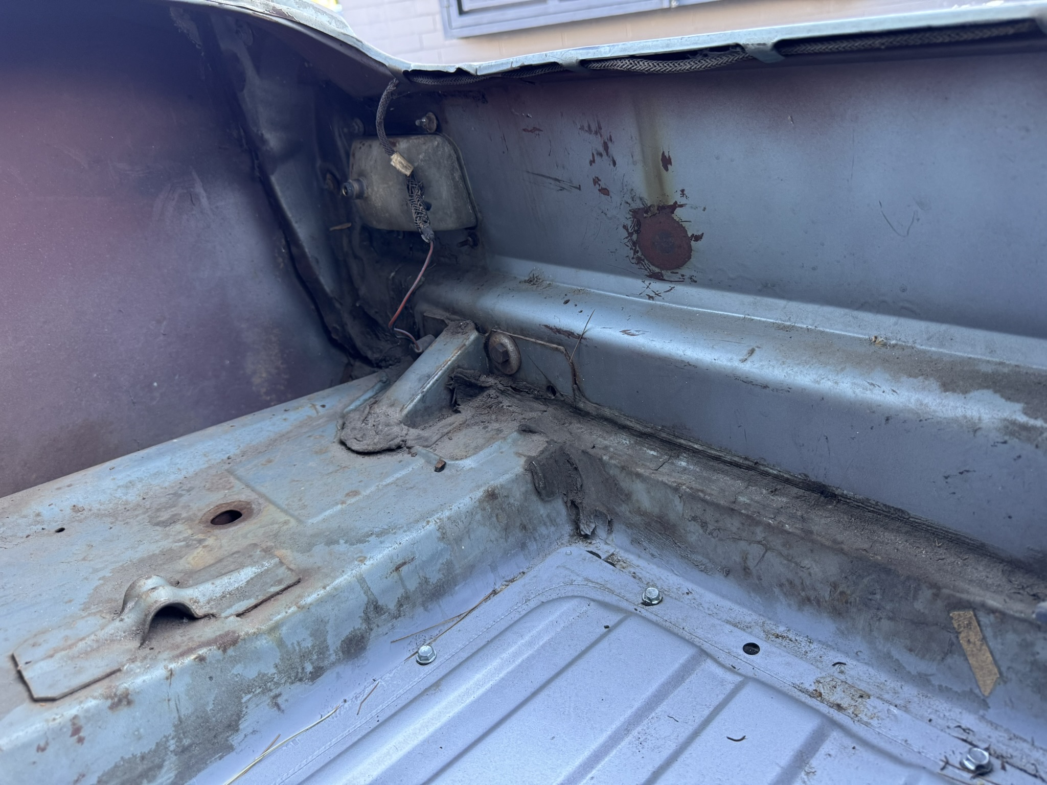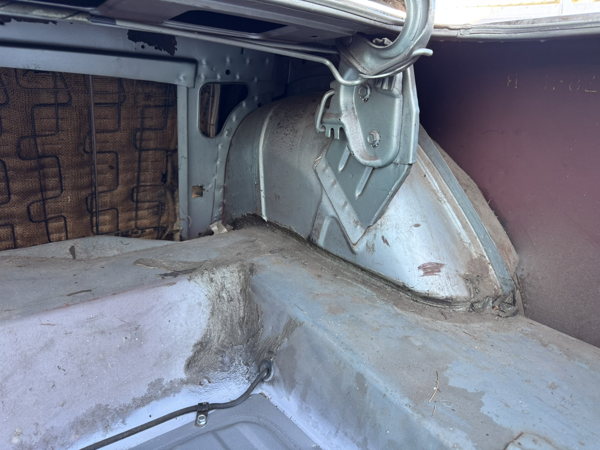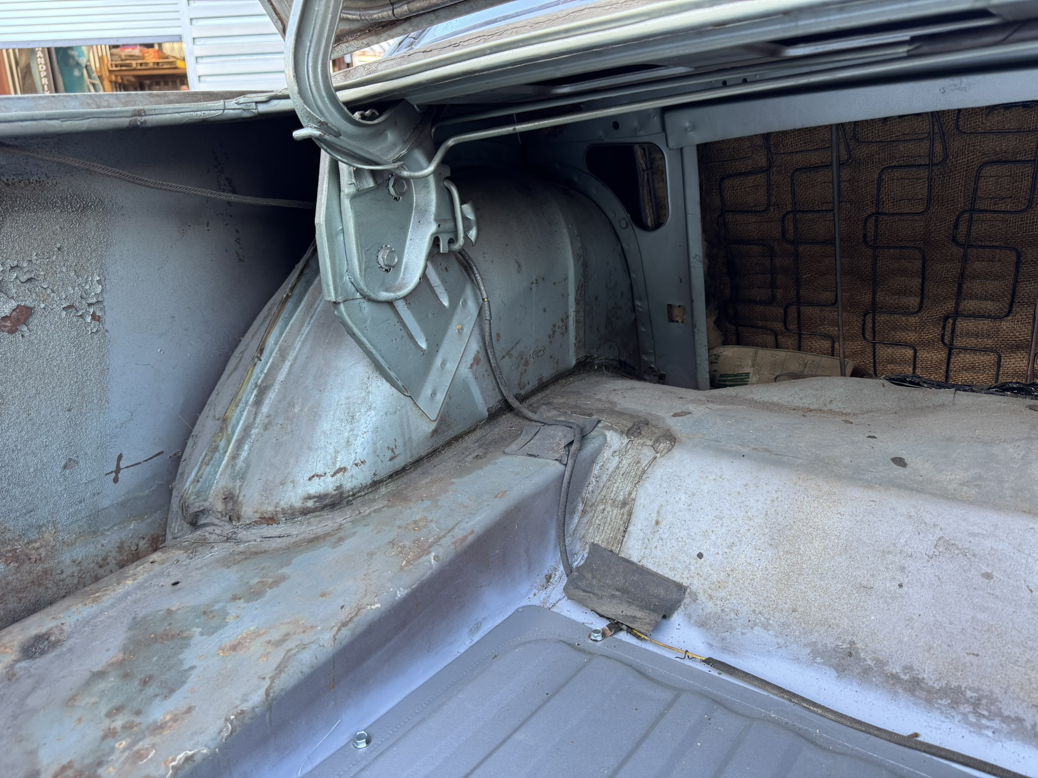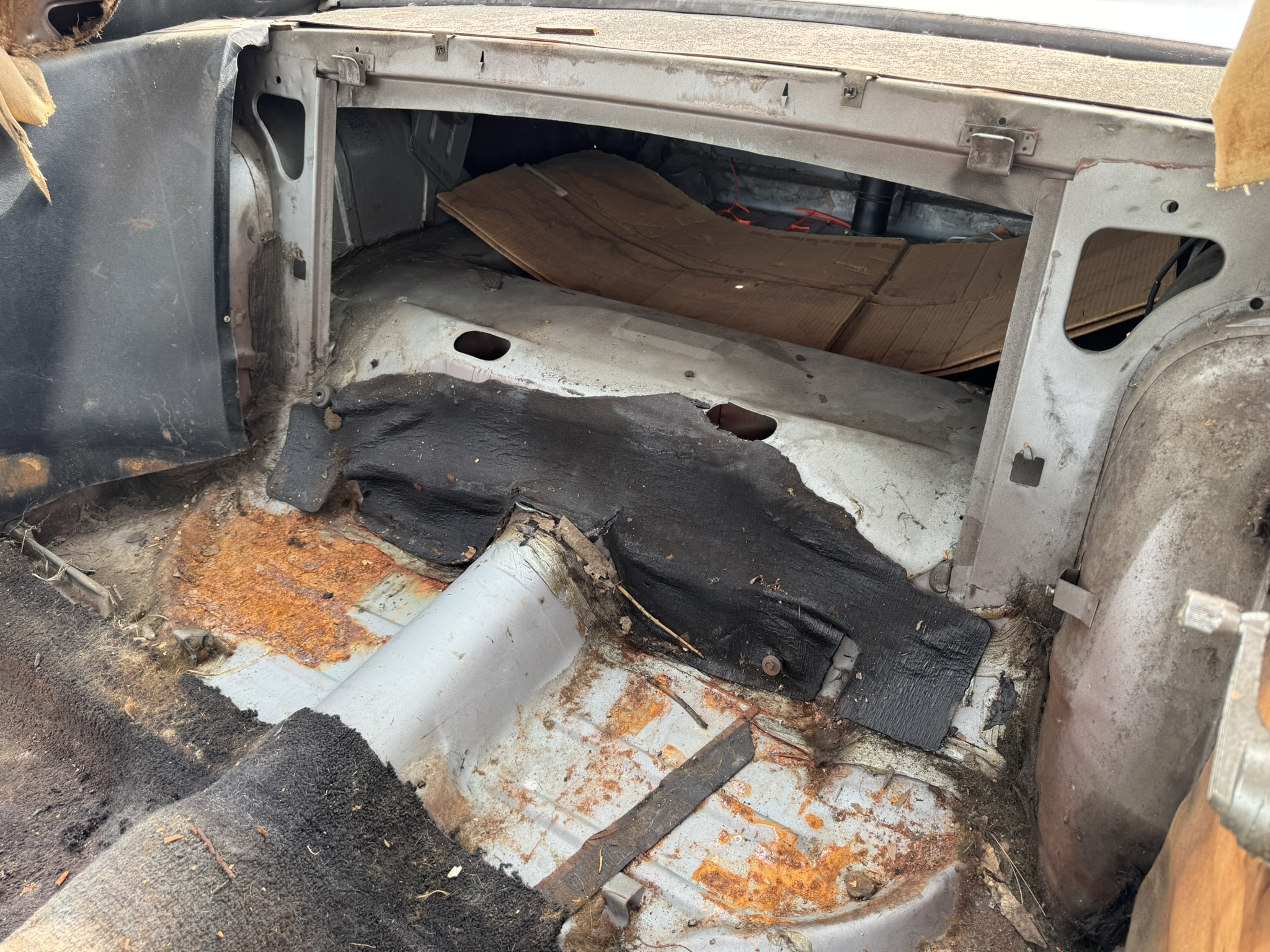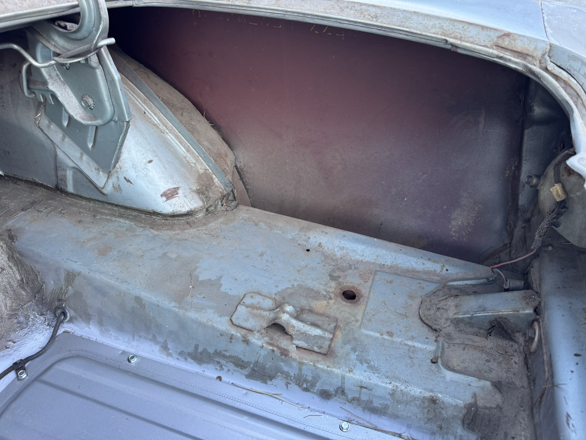 The floors are in great original condition with factory paint still visible. There is some rust underneath the heater core area in the front corner, likely from a leak. Surface rust is present on the rear floor under the seat but shows no rot. The trunk is in excellent condition with a new gas tank installed and no signs of rust.