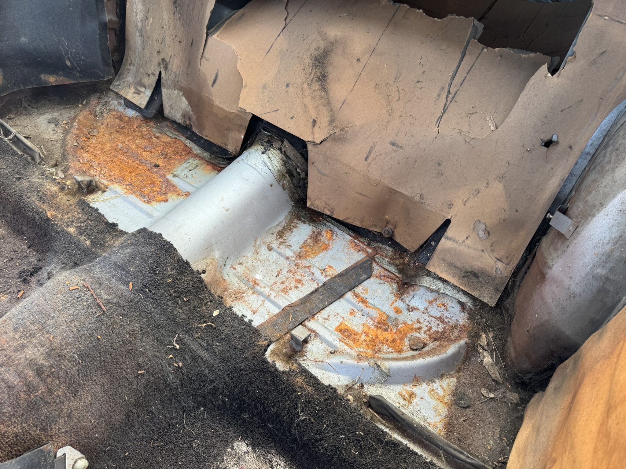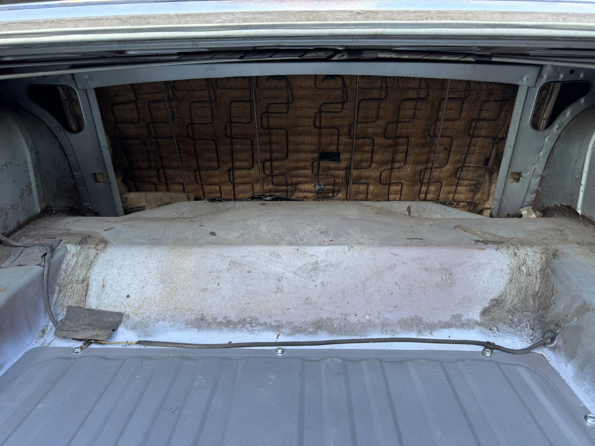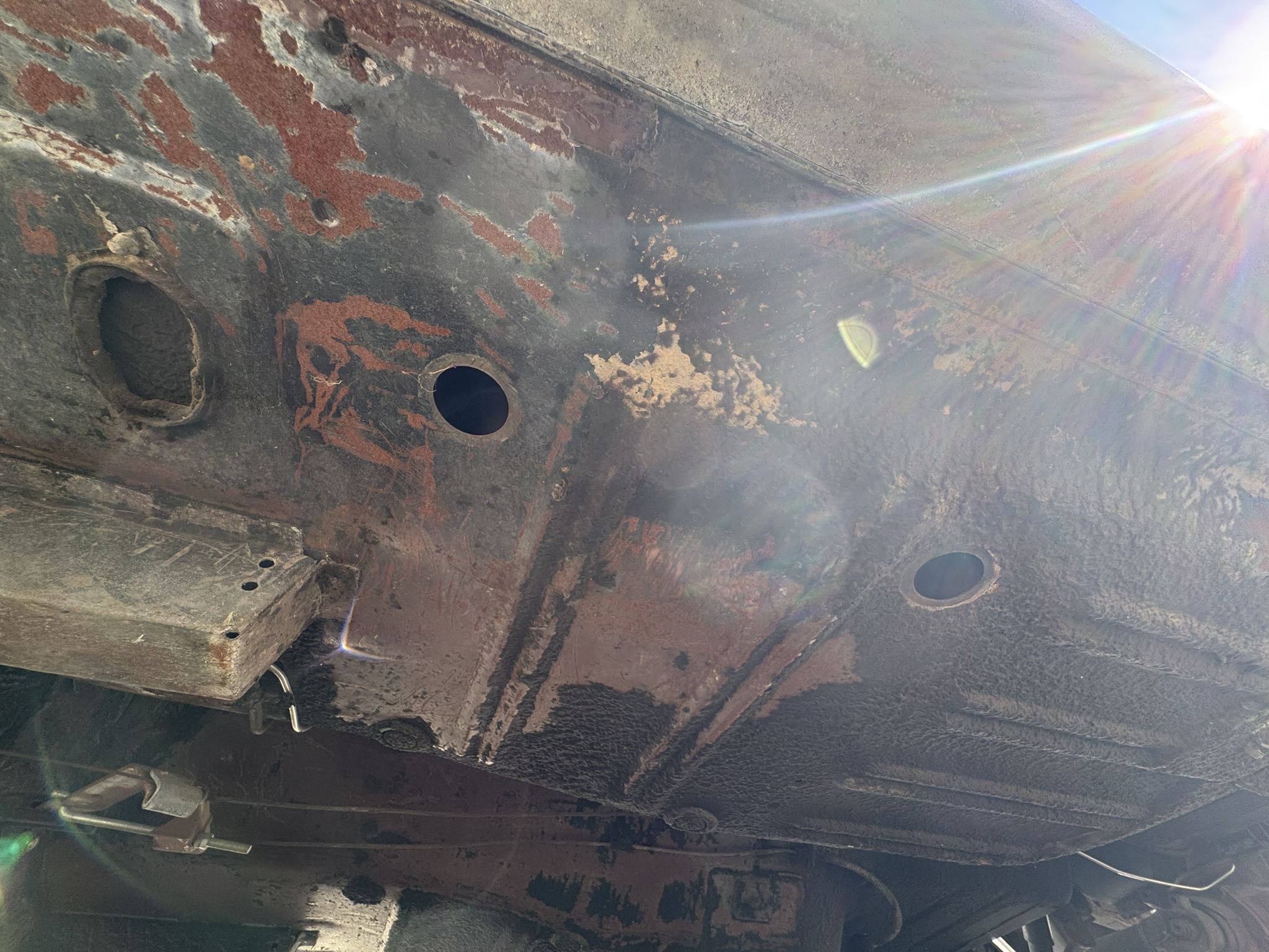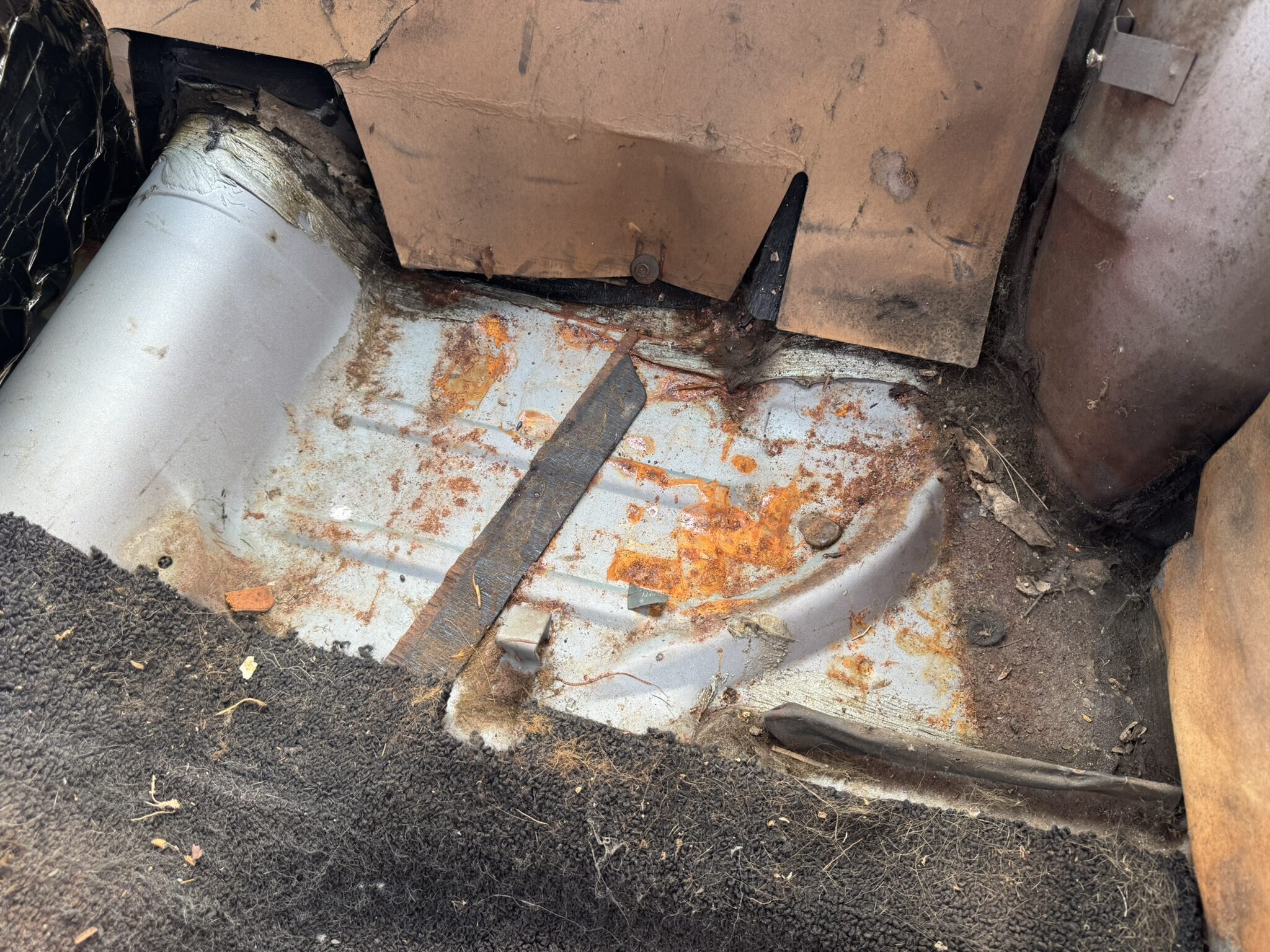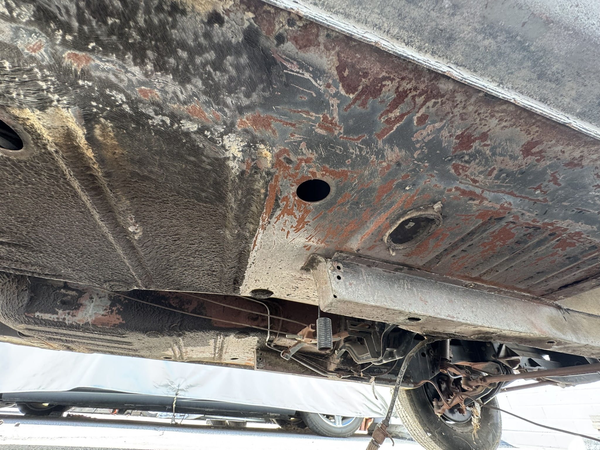 The floors are in great original condition with factory paint still visible. There is some rust underneath the heater core area in the front corner, likely from a leak. Surface rust is present on the rear floor under the seat but shows no rot. The trunk is in excellent condition with a new gas tank installed and no signs of rust.