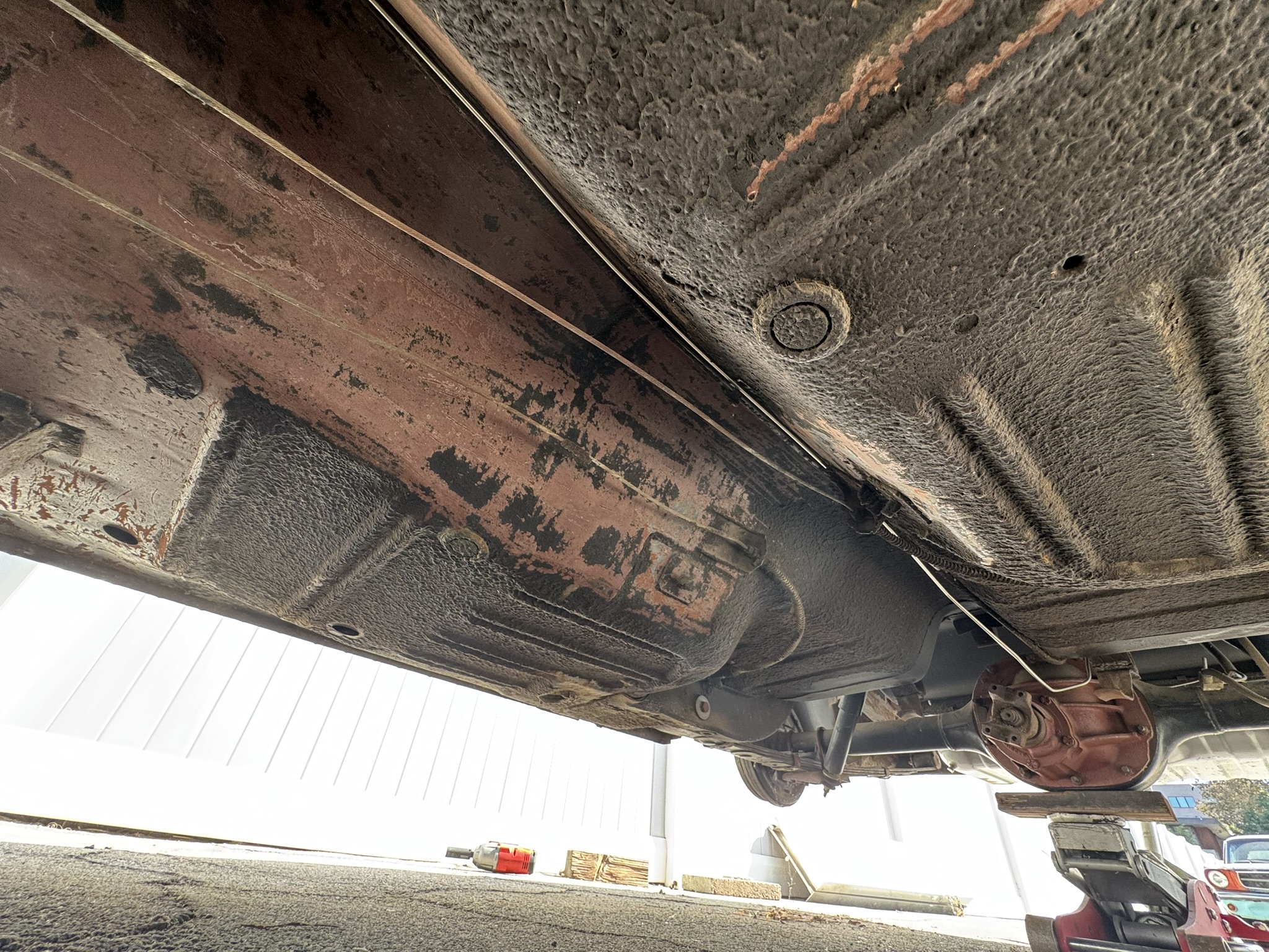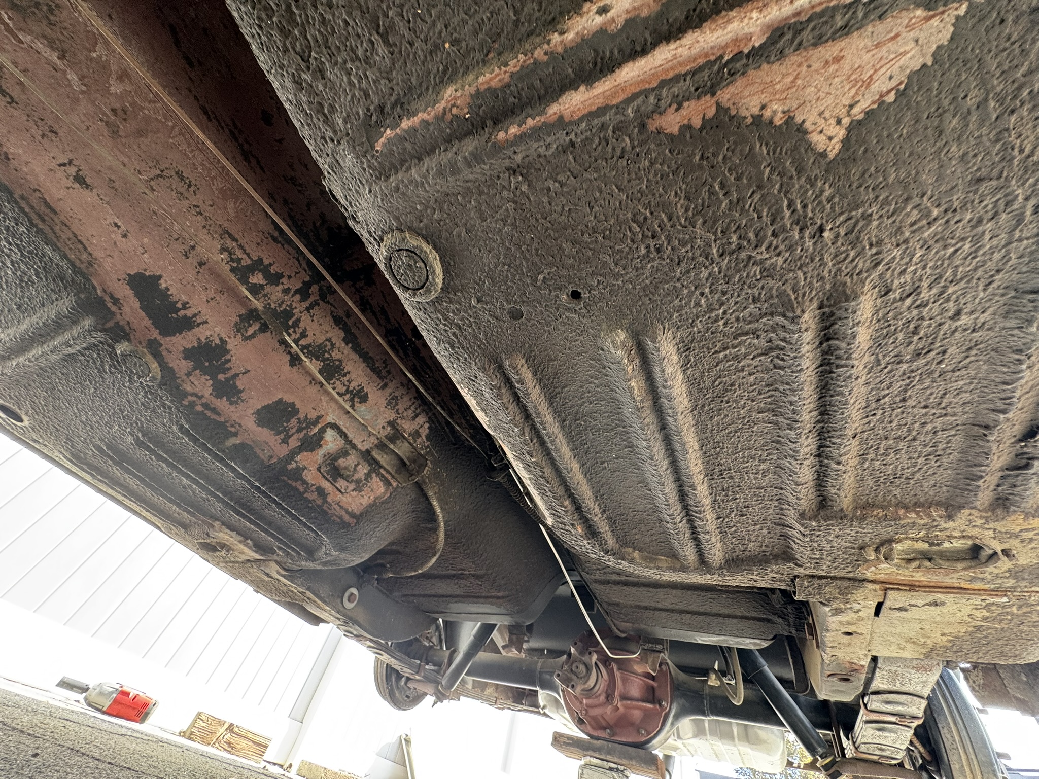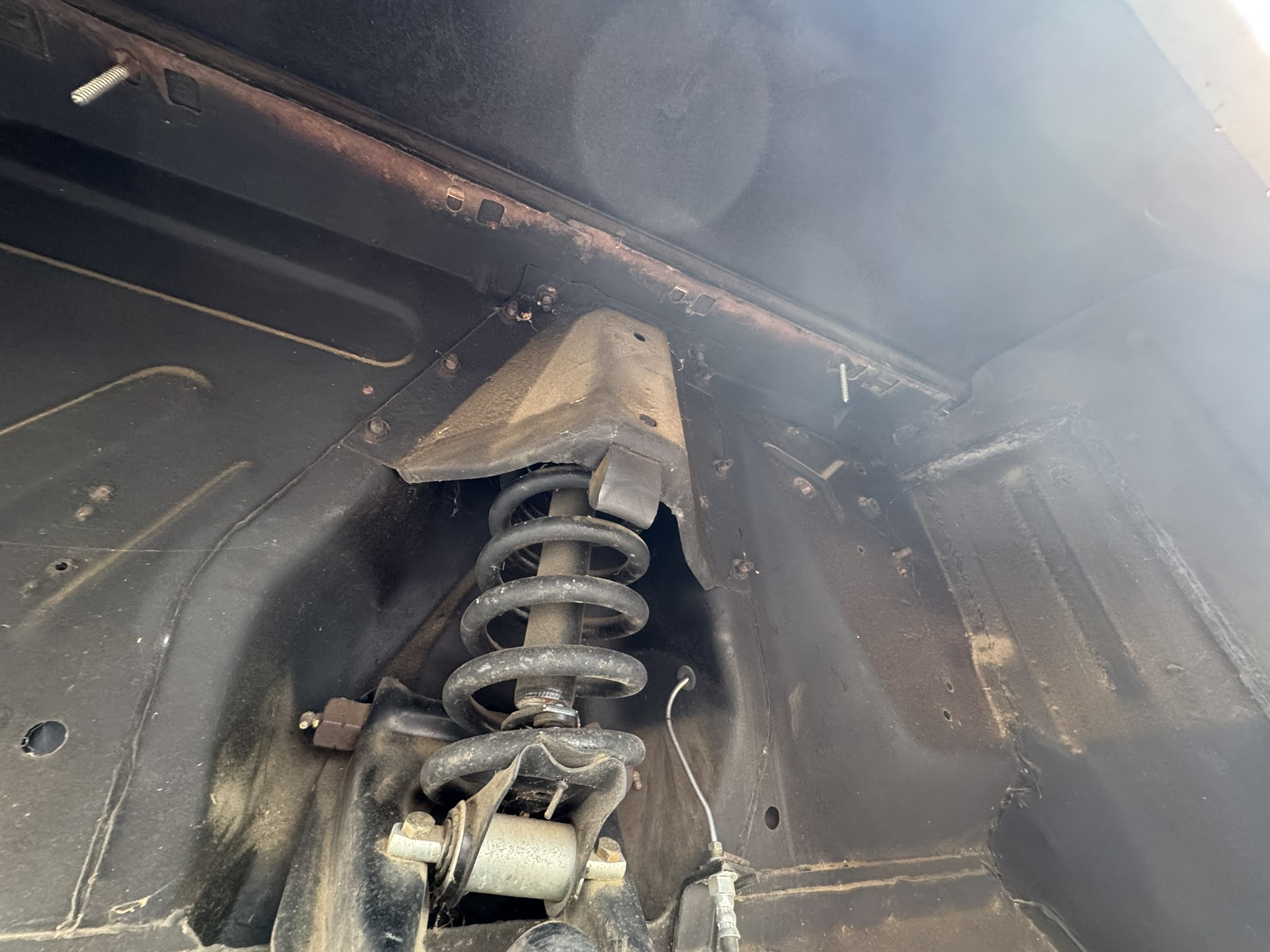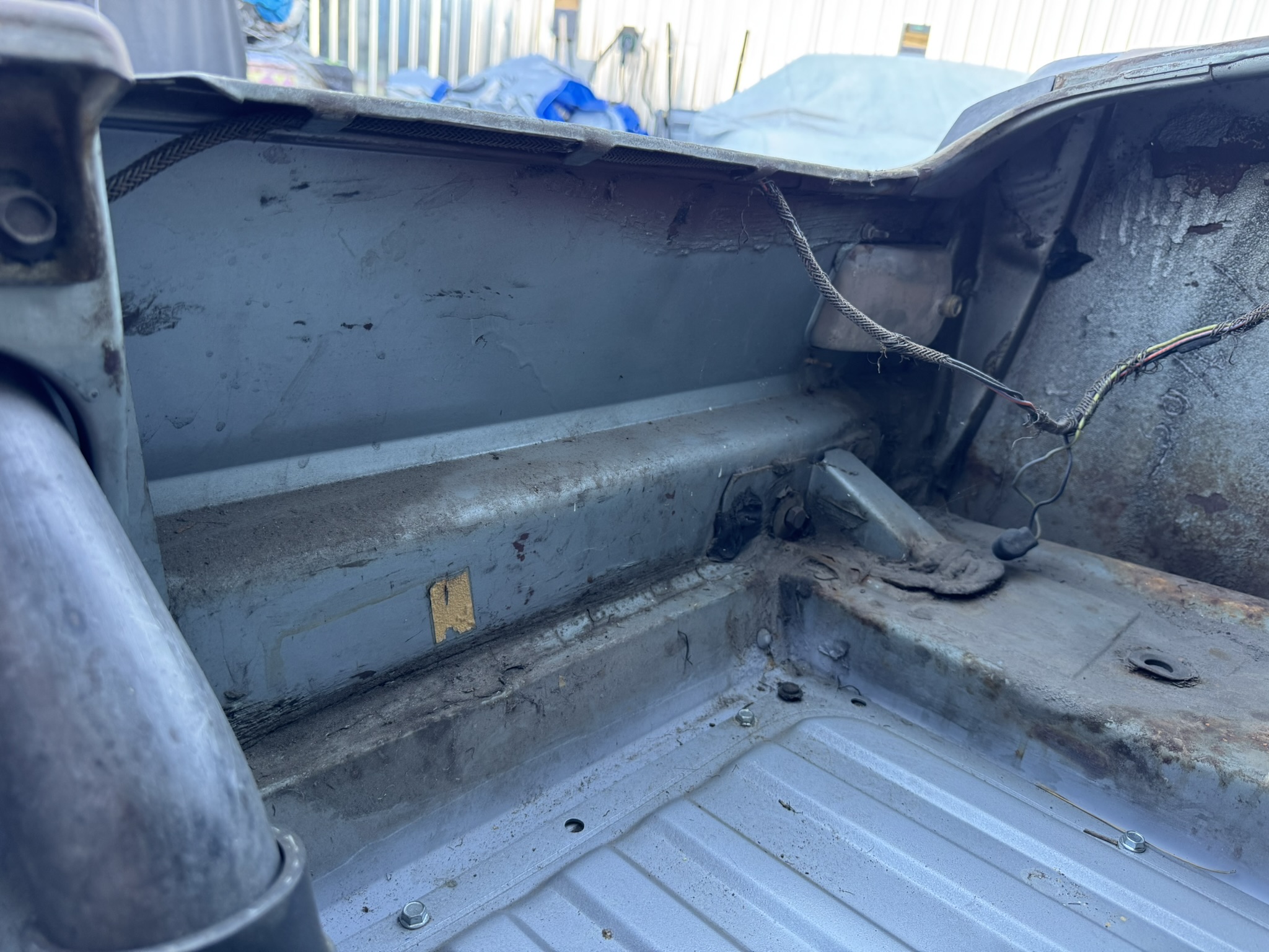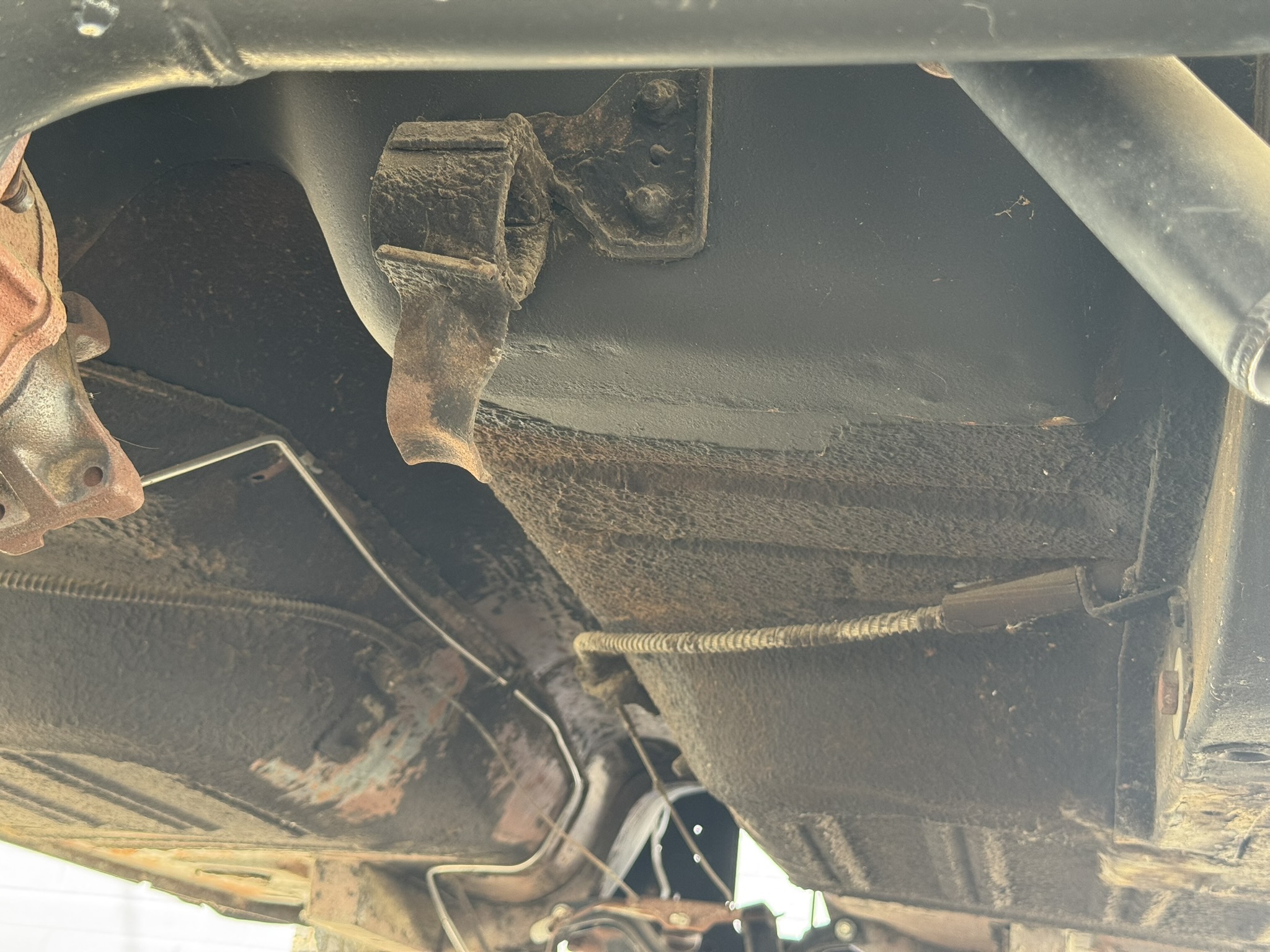 The floors are in great original condition with factory paint still visible. There is some rust underneath the heater core area in the front corner, likely from a leak. Surface rust is present on the rear floor under the seat but shows no rot. The trunk is in excellent condition with a new gas tank installed and no signs of rust.