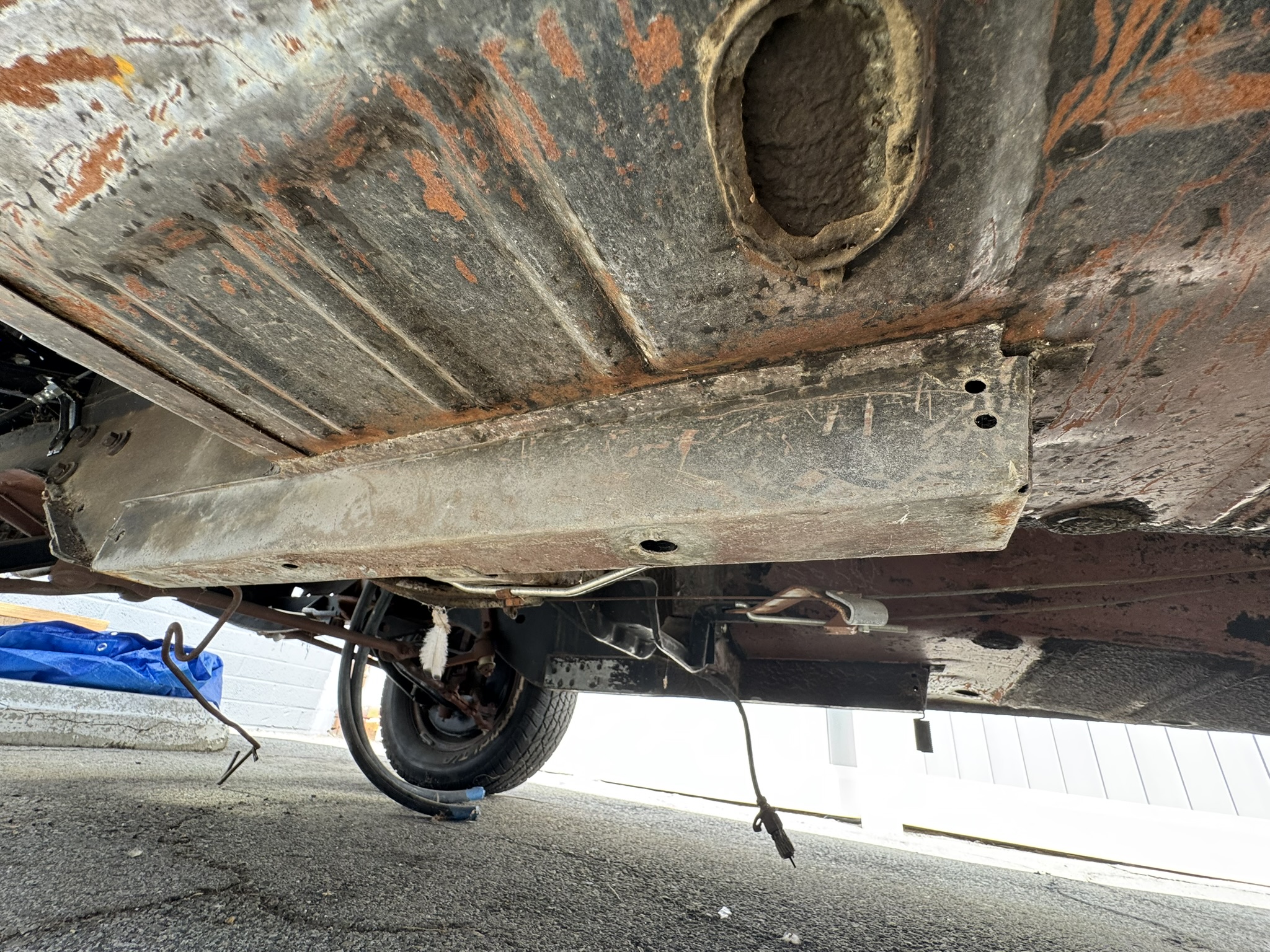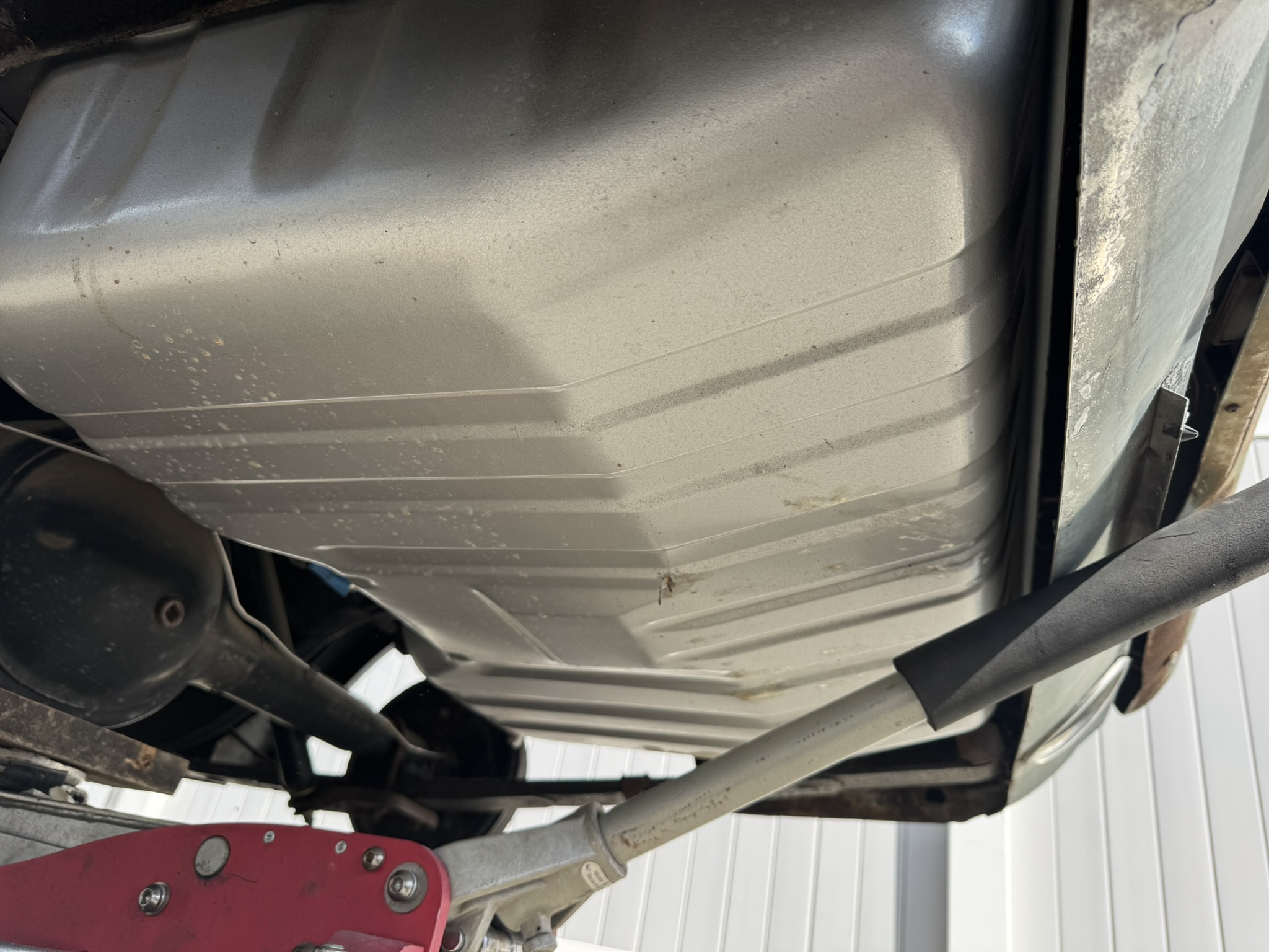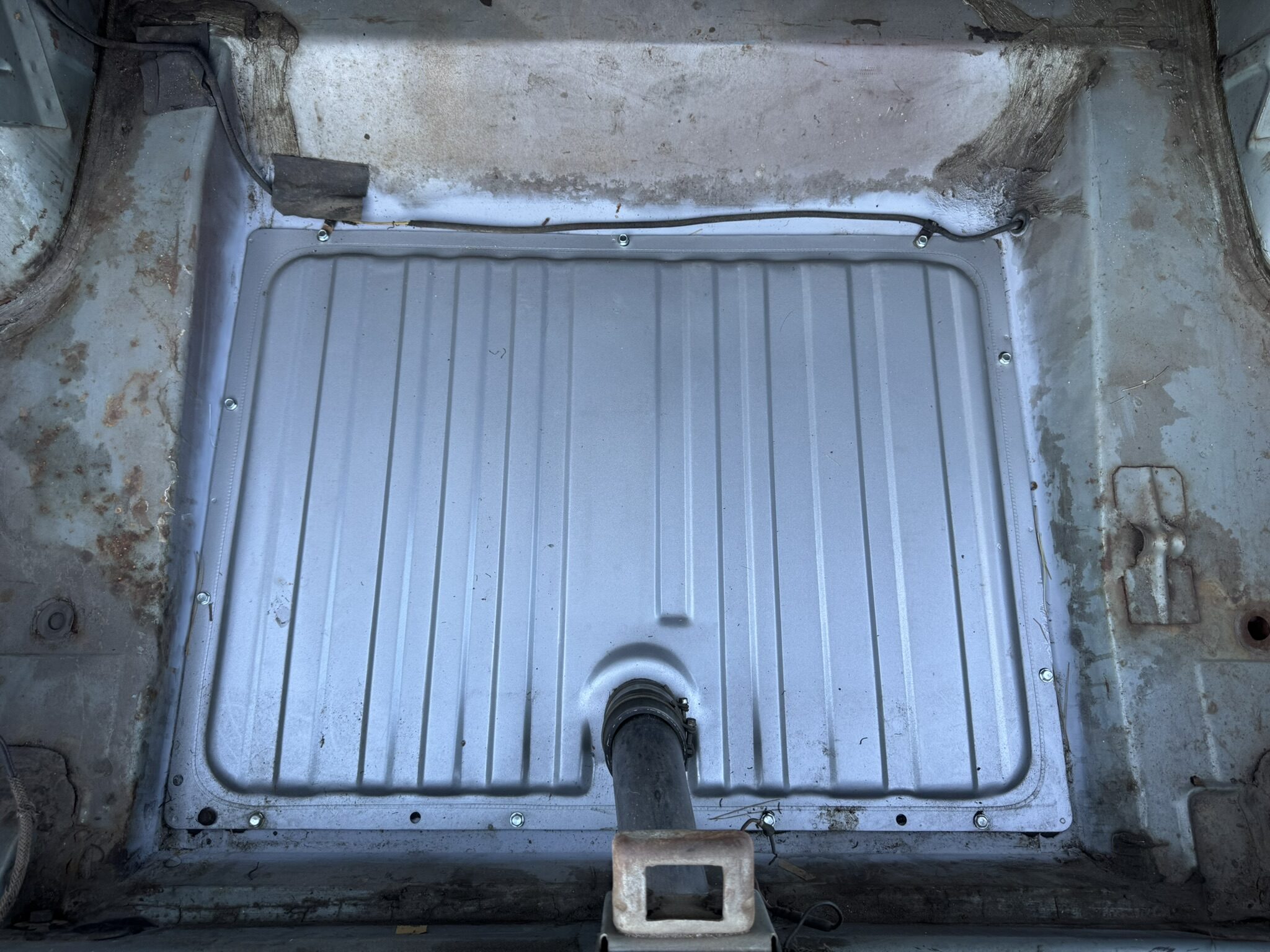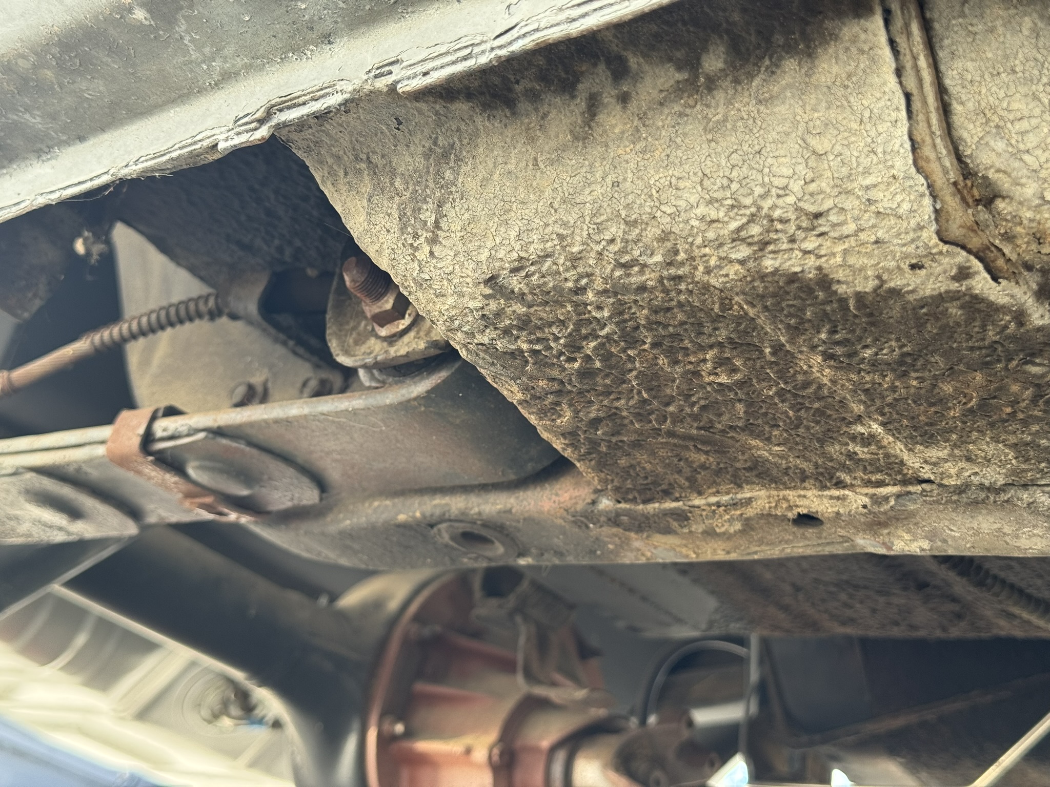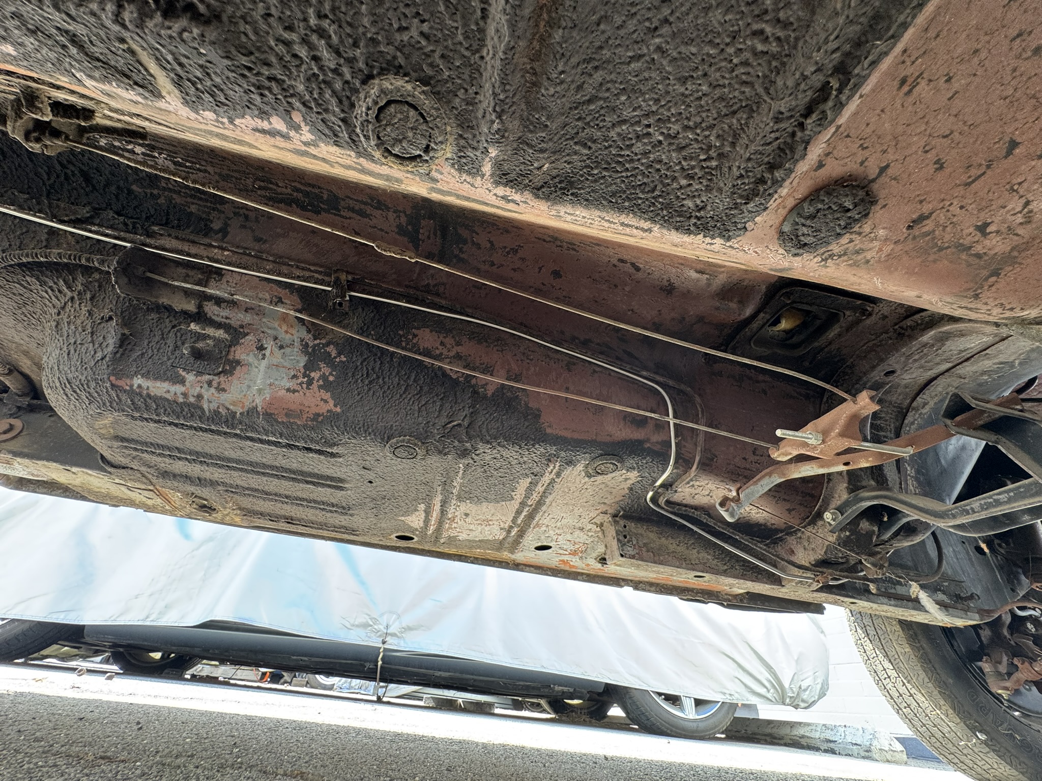 The floors are in great original condition with factory paint still visible. There is some rust underneath the heater core area in the front corner, likely from a leak. Surface rust is present on the rear floor under the seat but shows no rot. The trunk is in excellent condition with a new gas tank installed and no signs of rust.