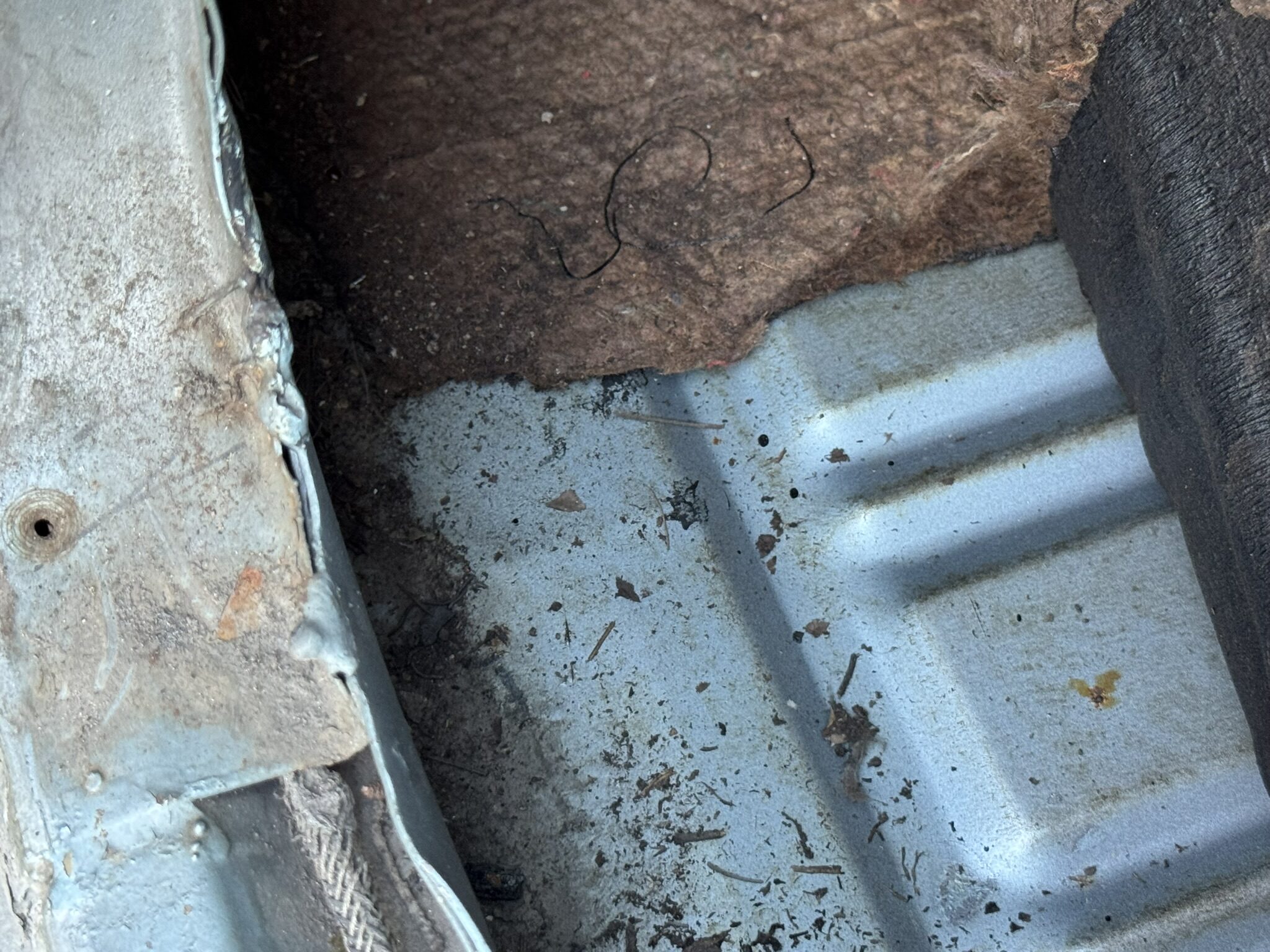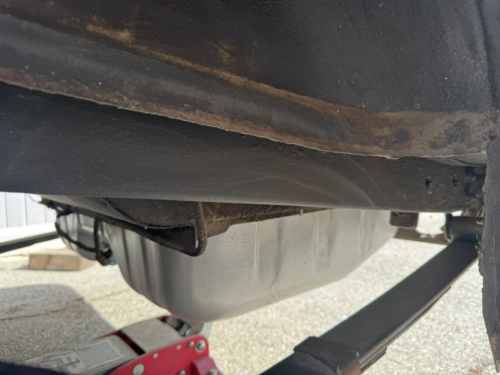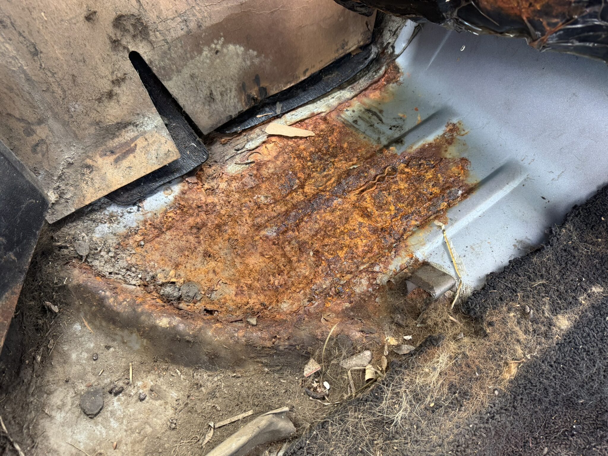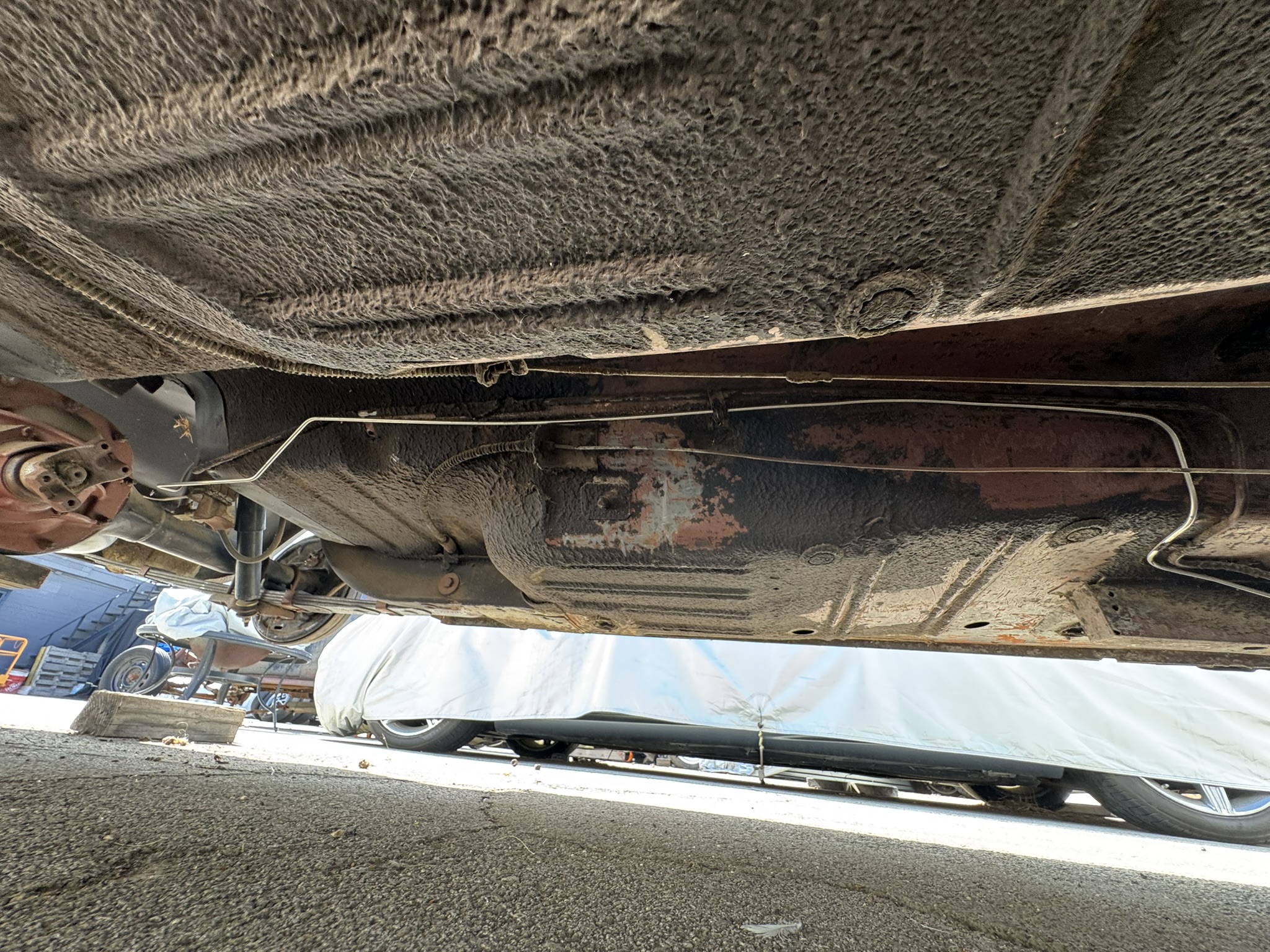 The floors are in great original condition with factory paint still visible. There is some rust underneath the heater core area in the front corner, likely from a leak. Surface rust is present on the rear floor under the seat but shows no rot. The trunk is in excellent condition with a new gas tank installed and no signs of rust.