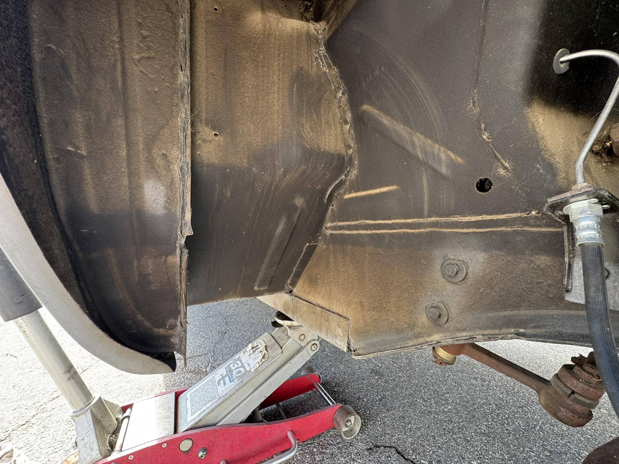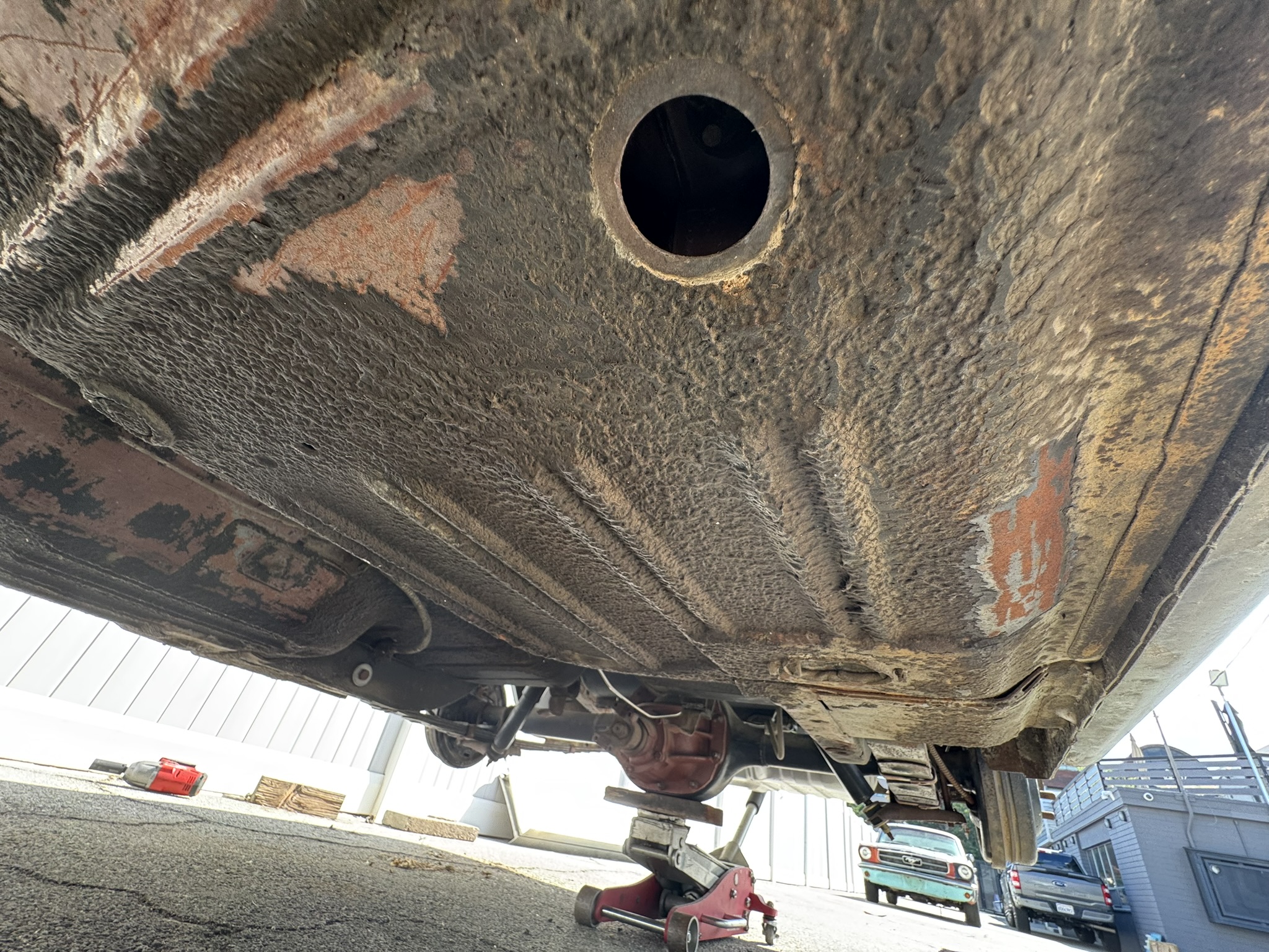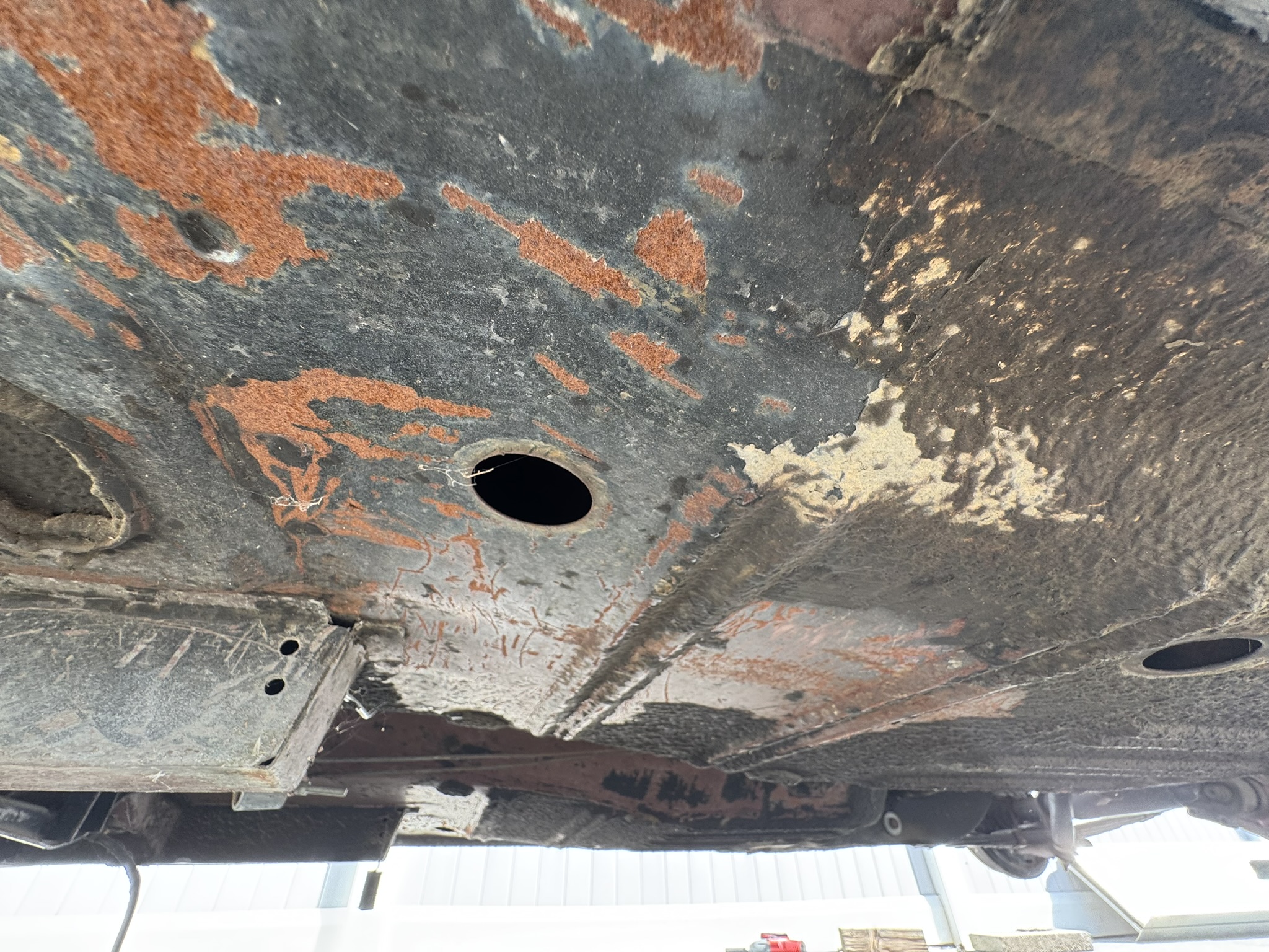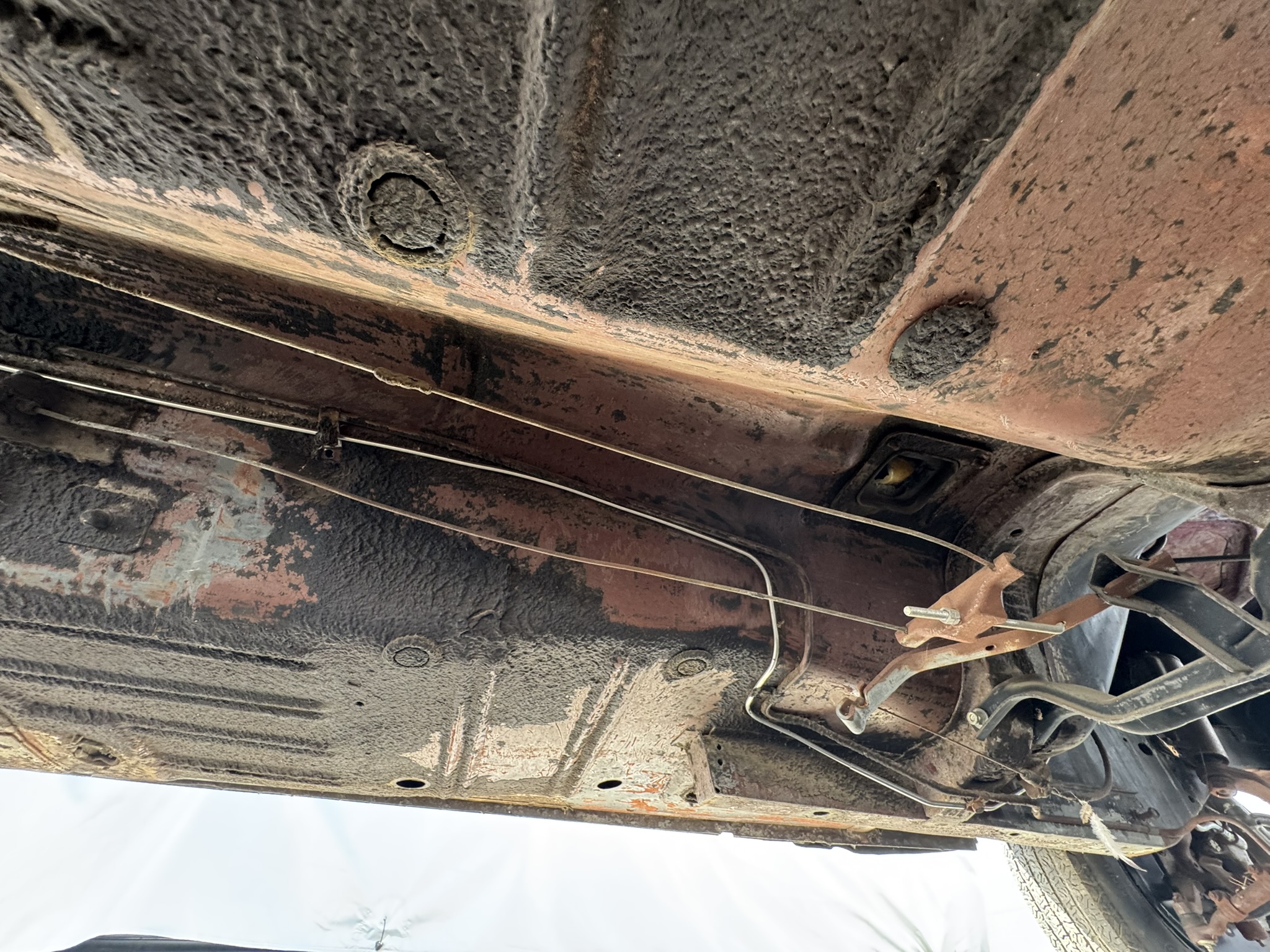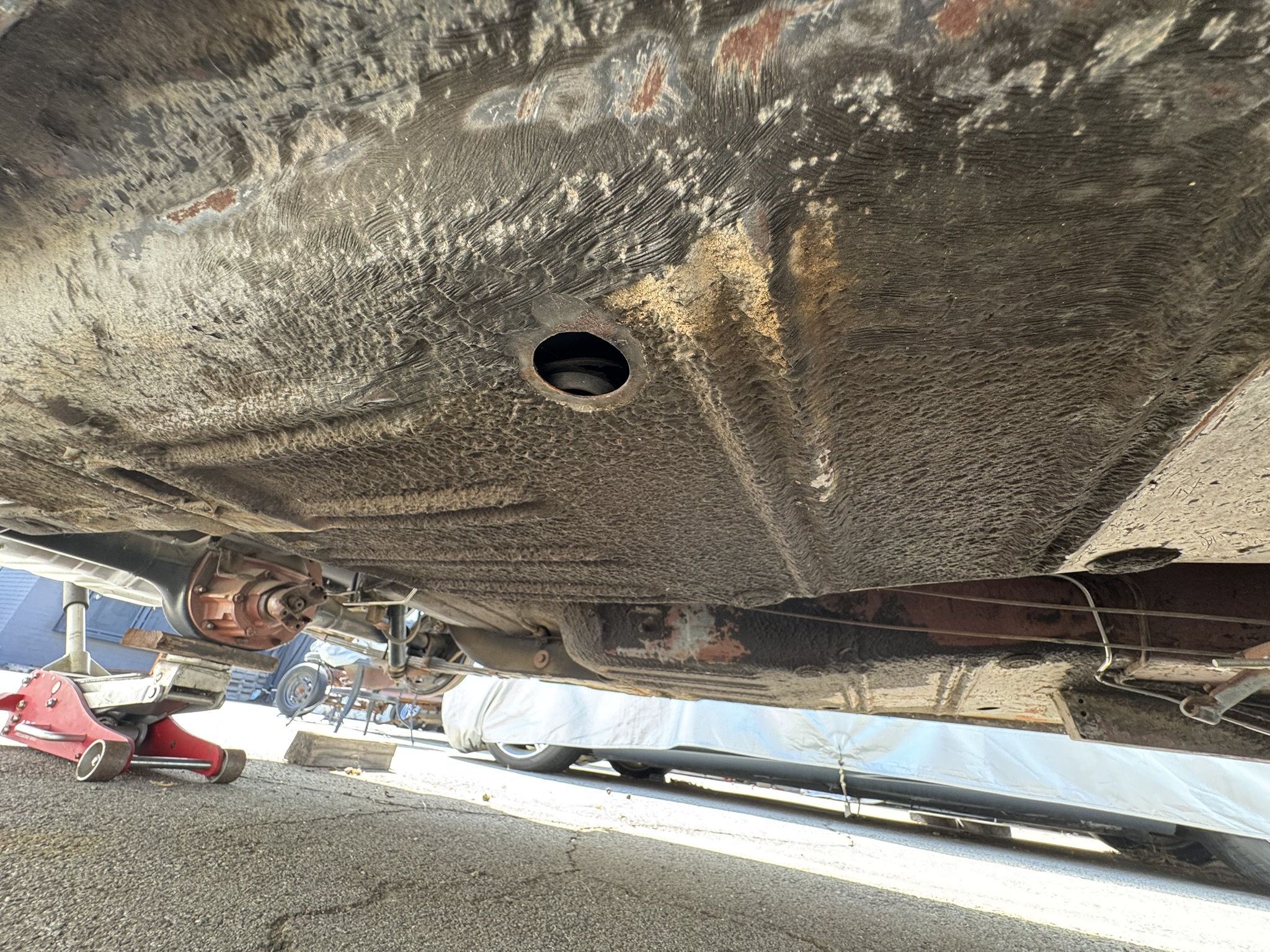 The floors are in great original condition with factory paint still visible. There is some rust underneath the heater core area in the front corner, likely from a leak. Surface rust is present on the rear floor under the seat but shows no rot. The trunk is in excellent condition with a new gas tank installed and no signs of rust.