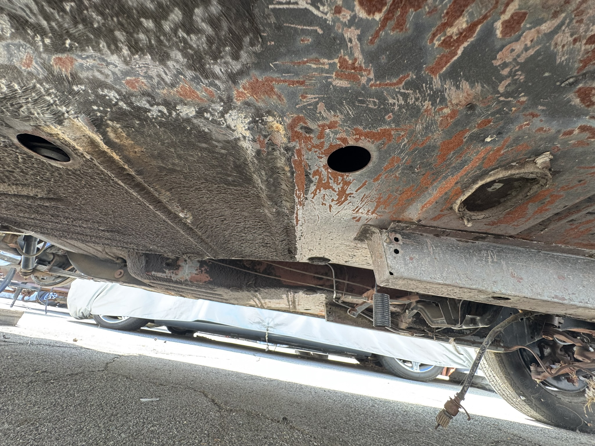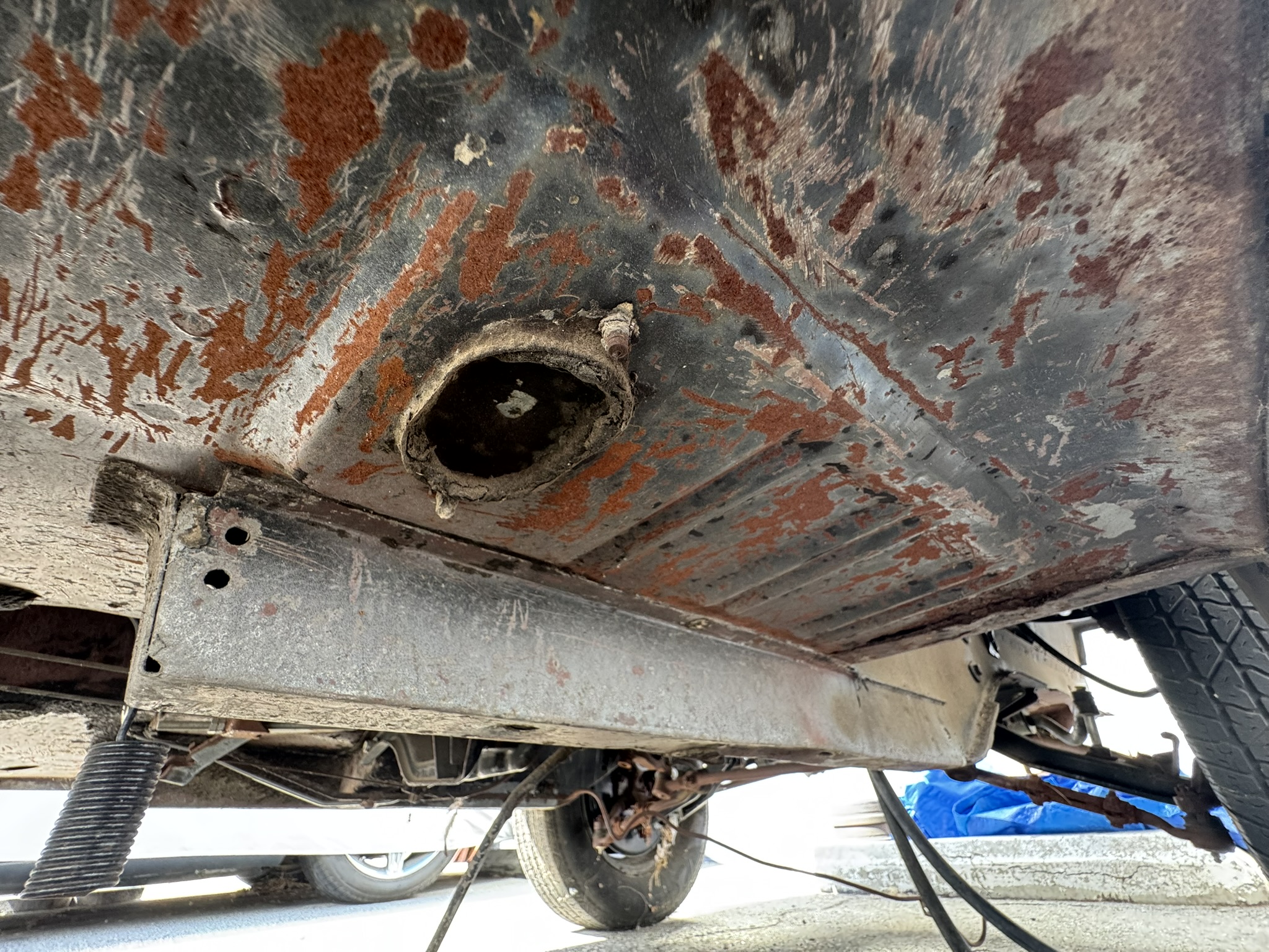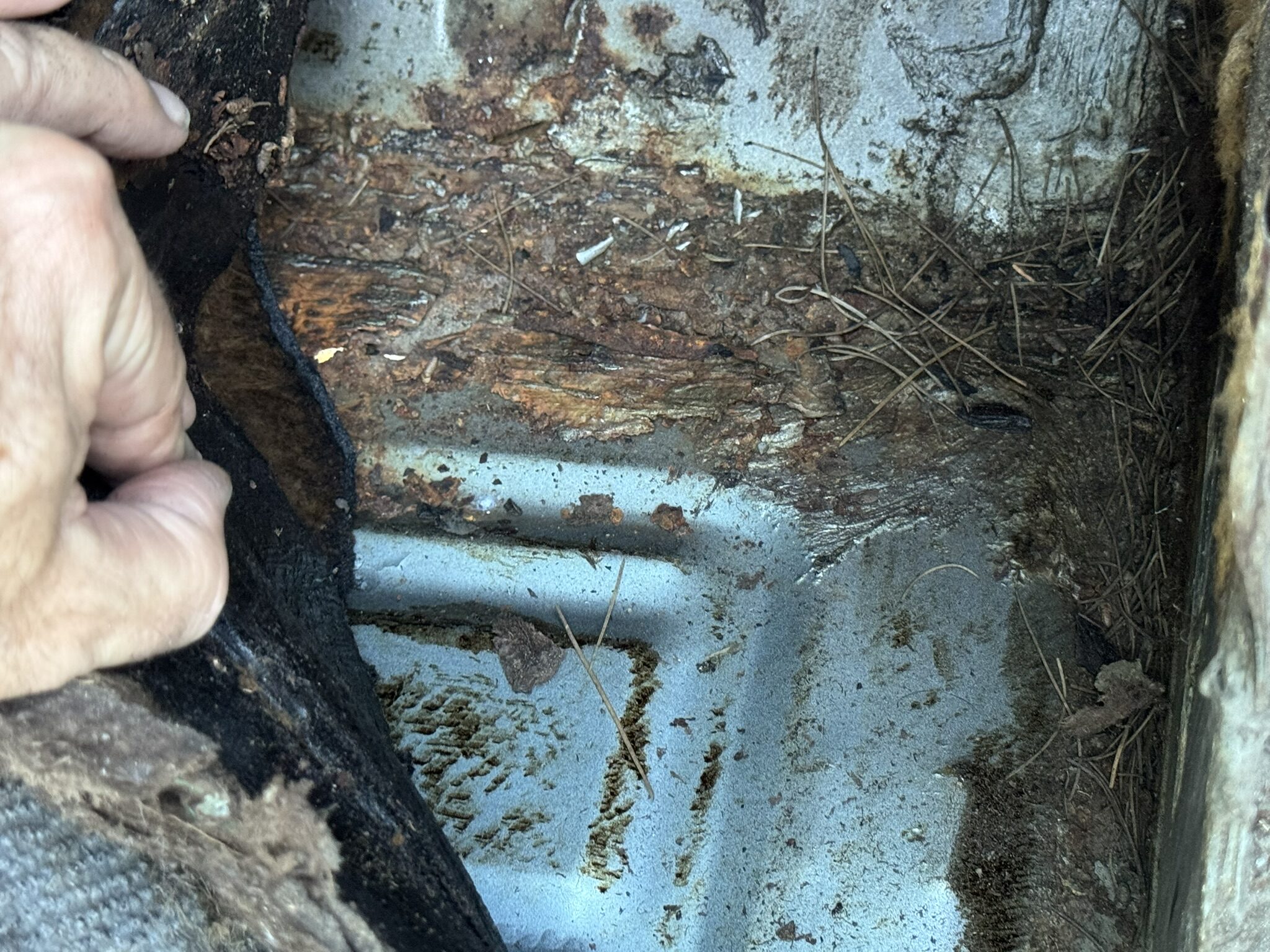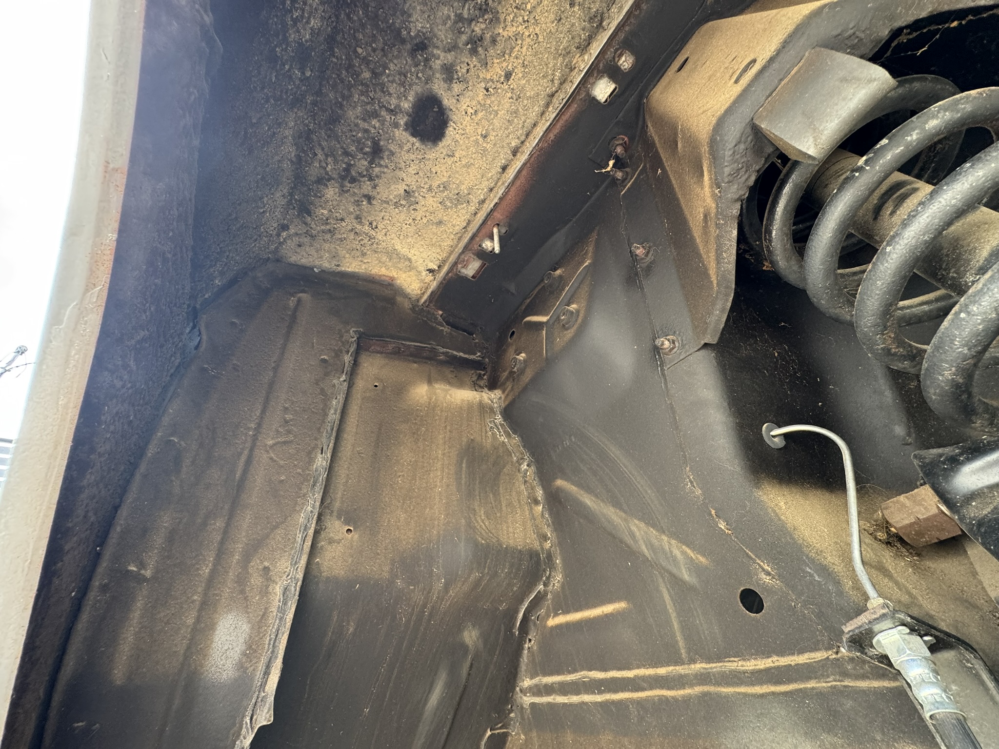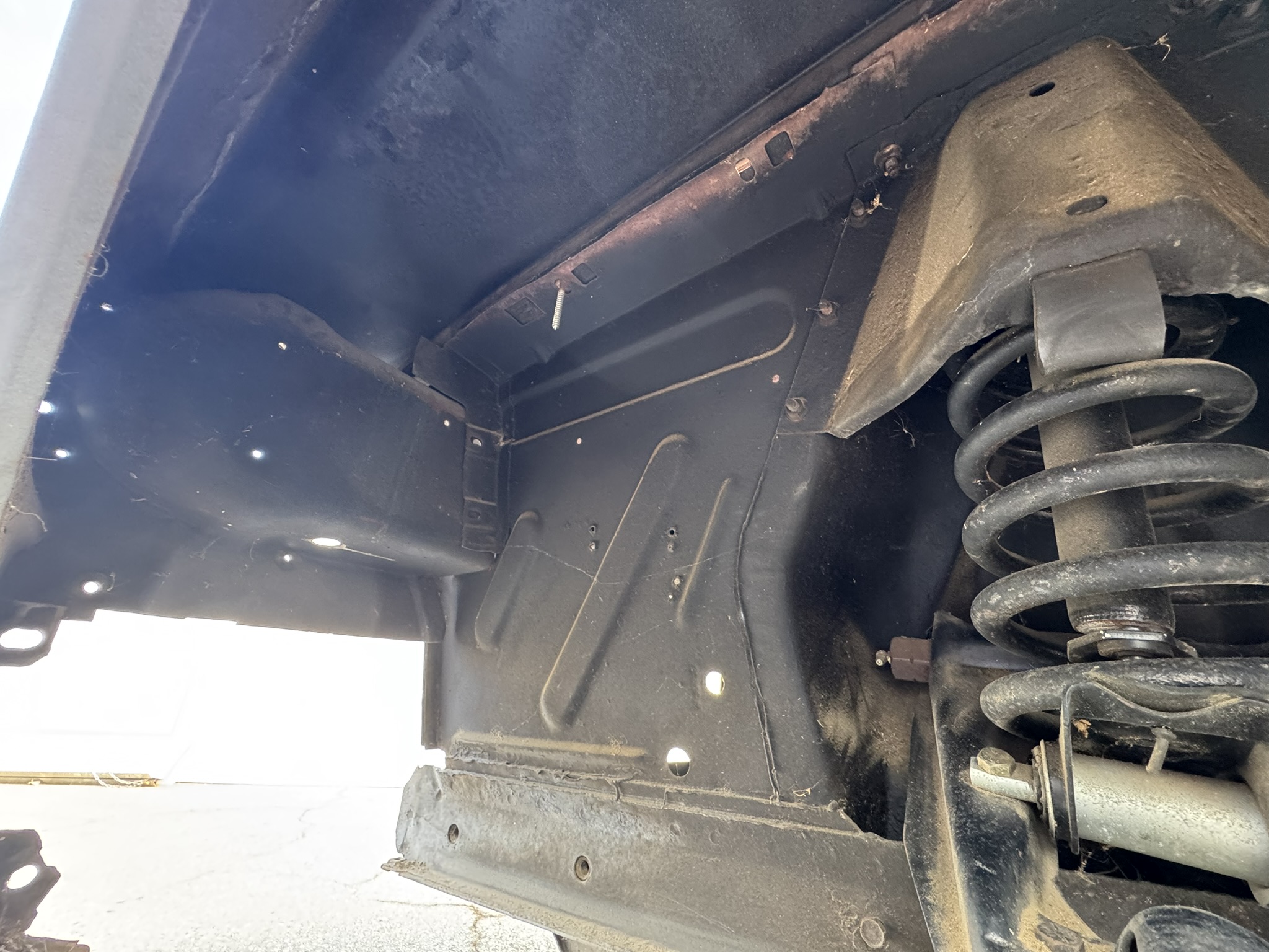 The floors are in great original condition with factory paint still visible. There is some rust underneath the heater core area in the front corner, likely from a leak. Surface rust is present on the rear floor under the seat but shows no rot. The trunk is in excellent condition with a new gas tank installed and no signs of rust.