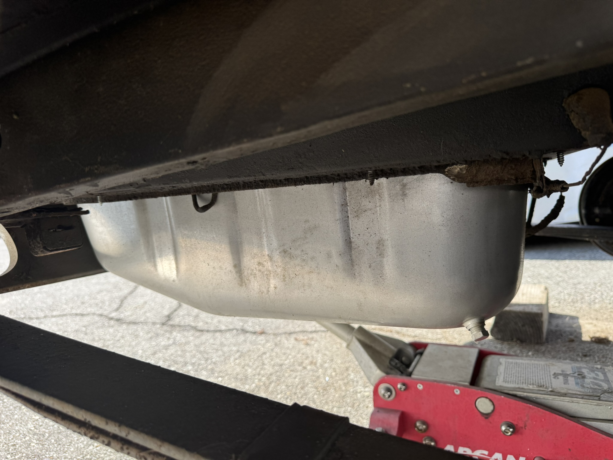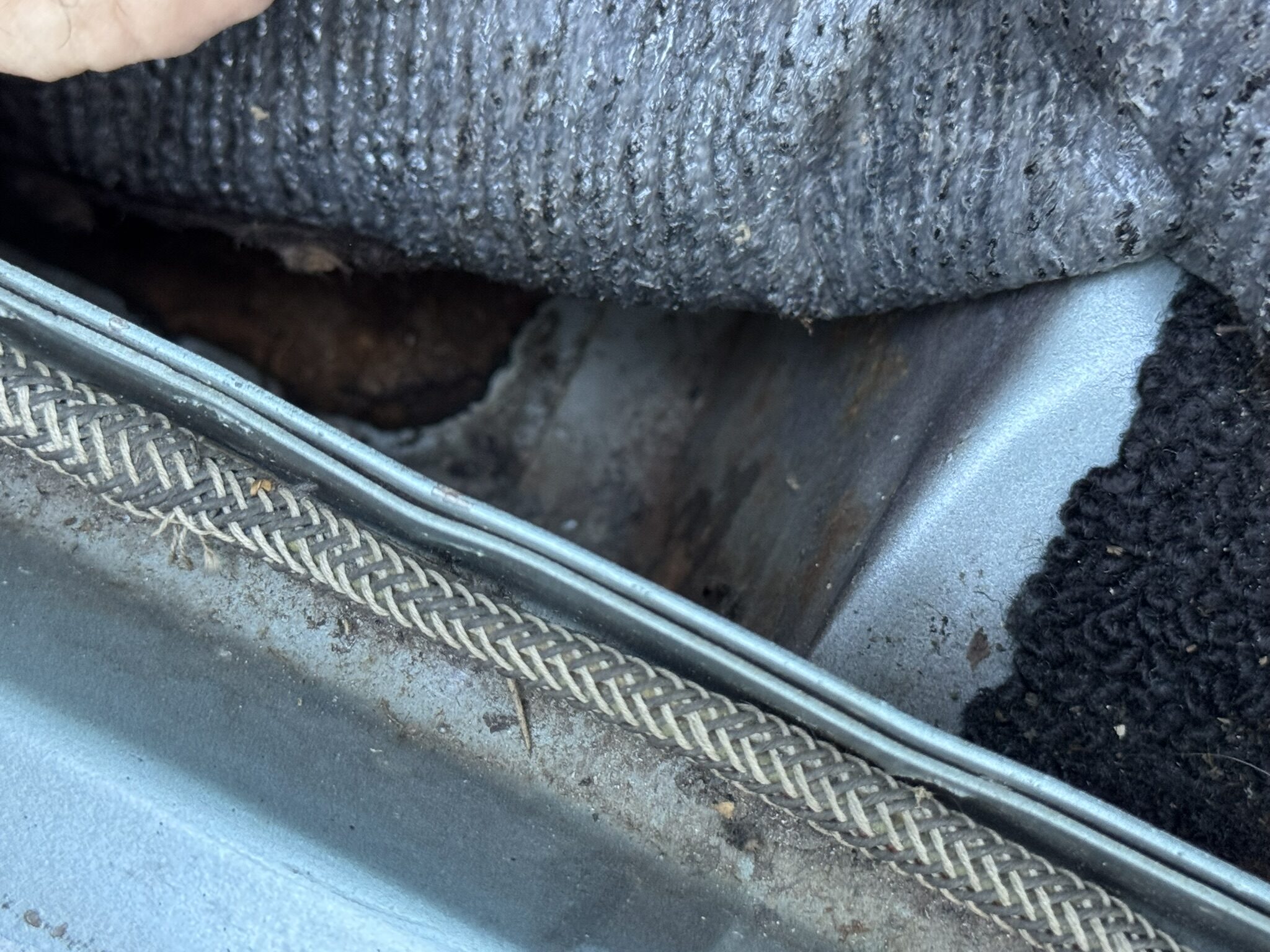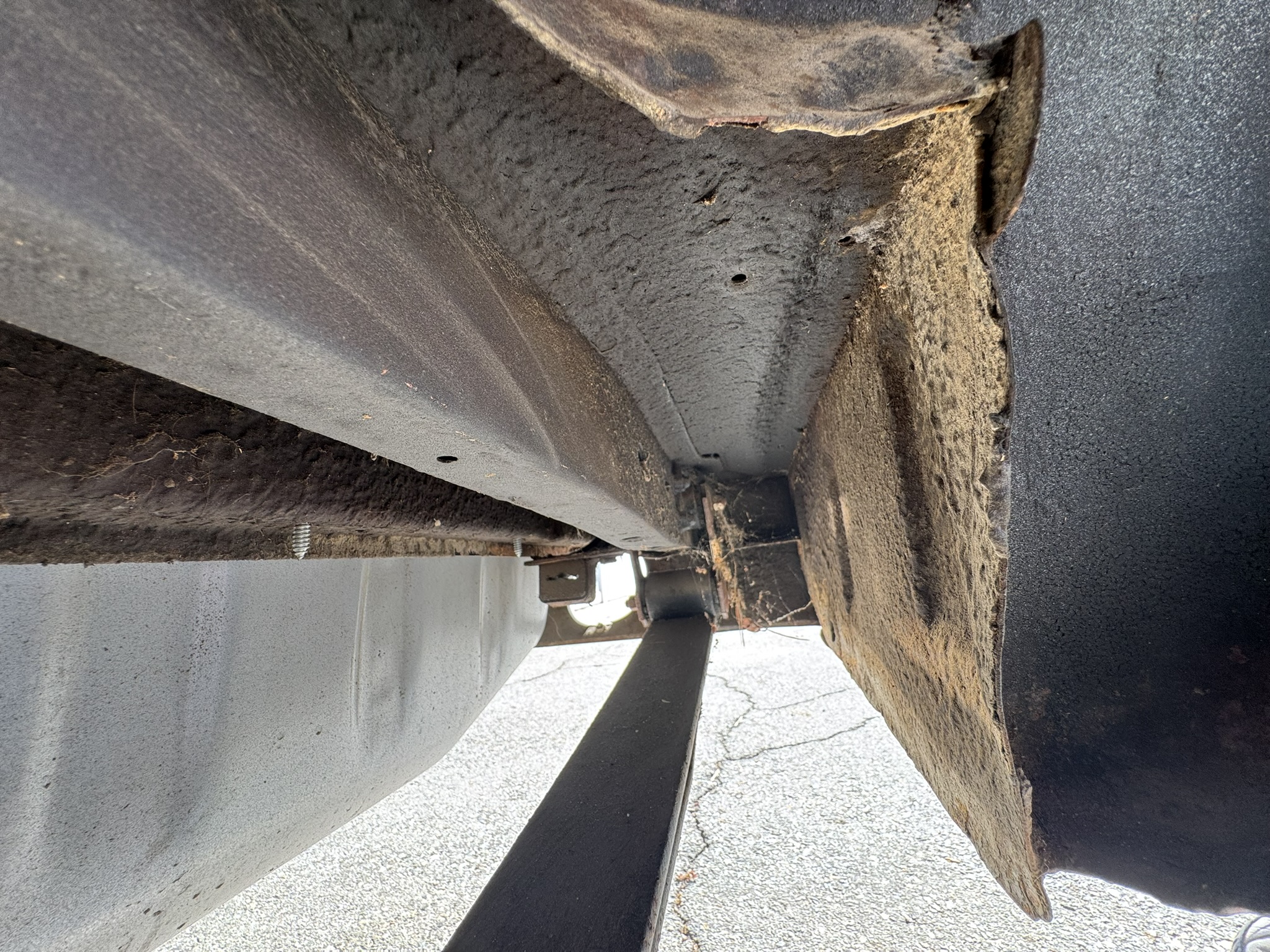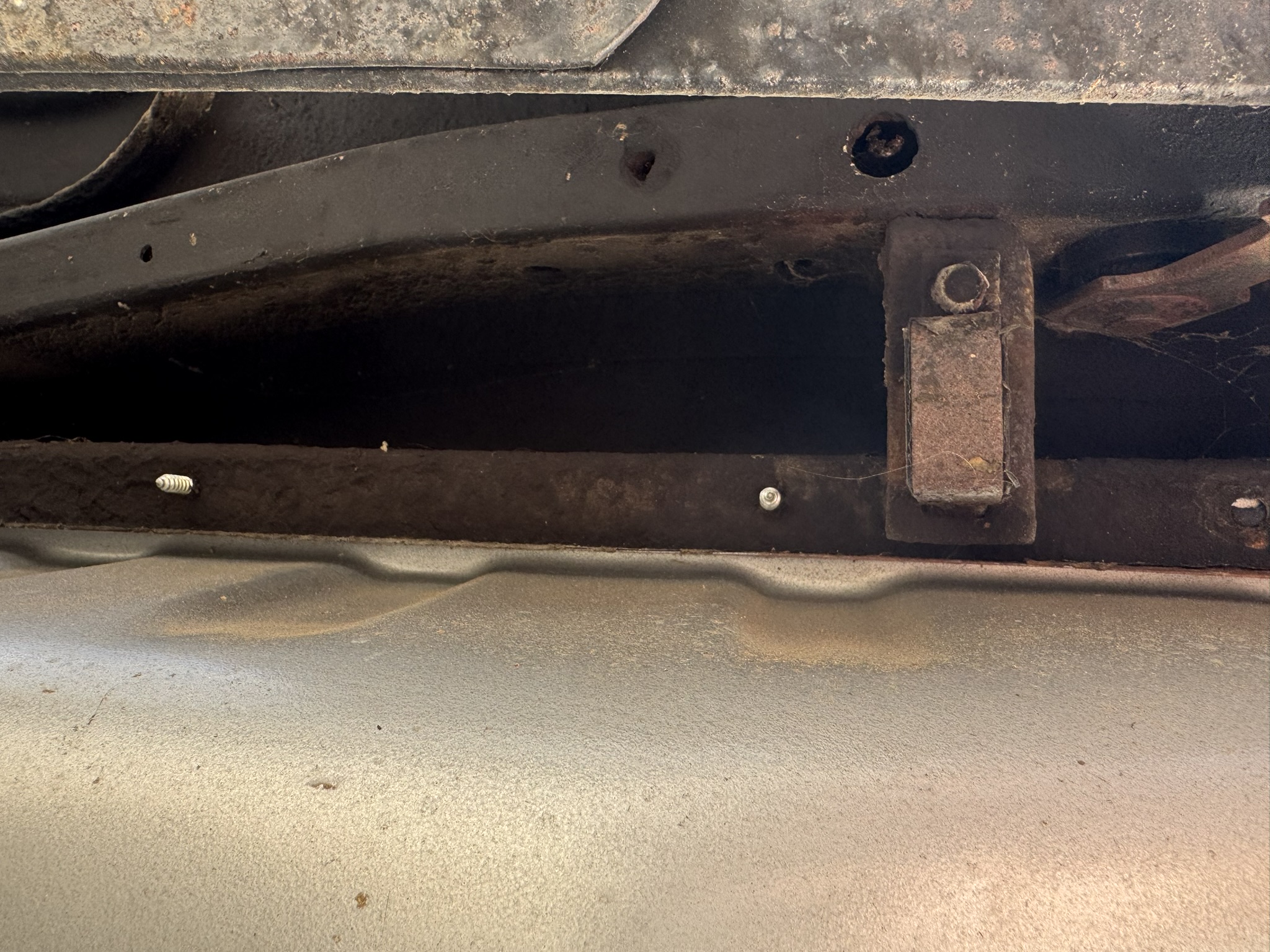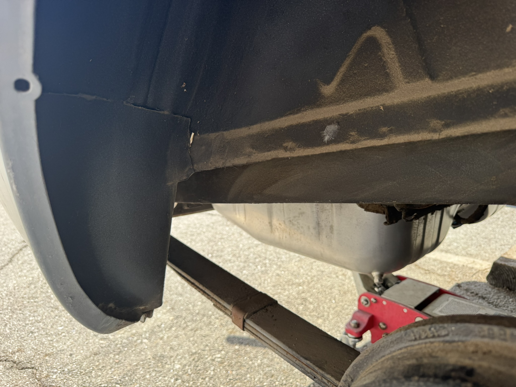 The floors are in great original condition with factory paint still visible. There is some rust underneath the heater core area in the front corner, likely from a leak. Surface rust is present on the rear floor under the seat but shows no rot. The trunk is in excellent condition with a new gas tank installed and no signs of rust.