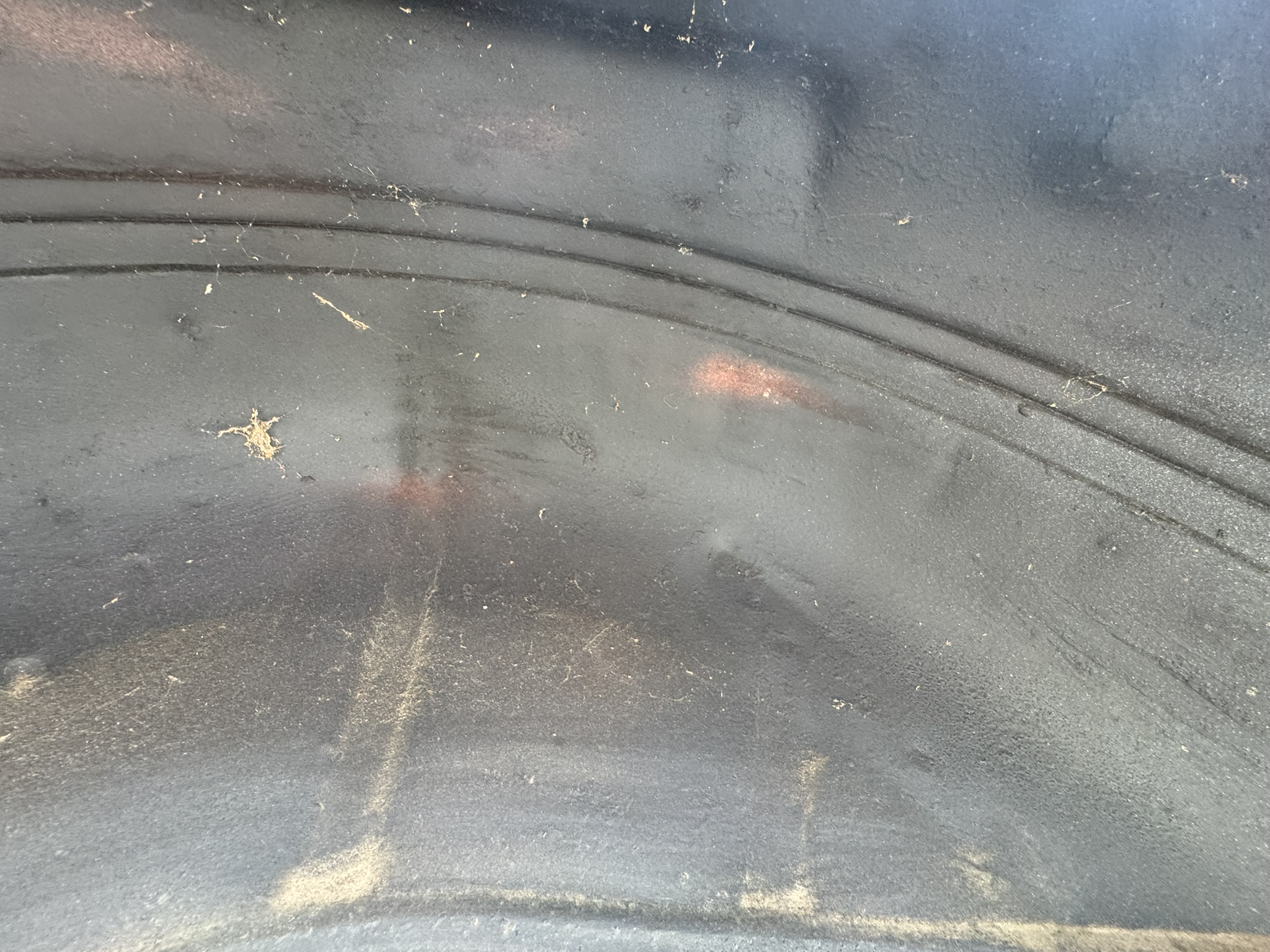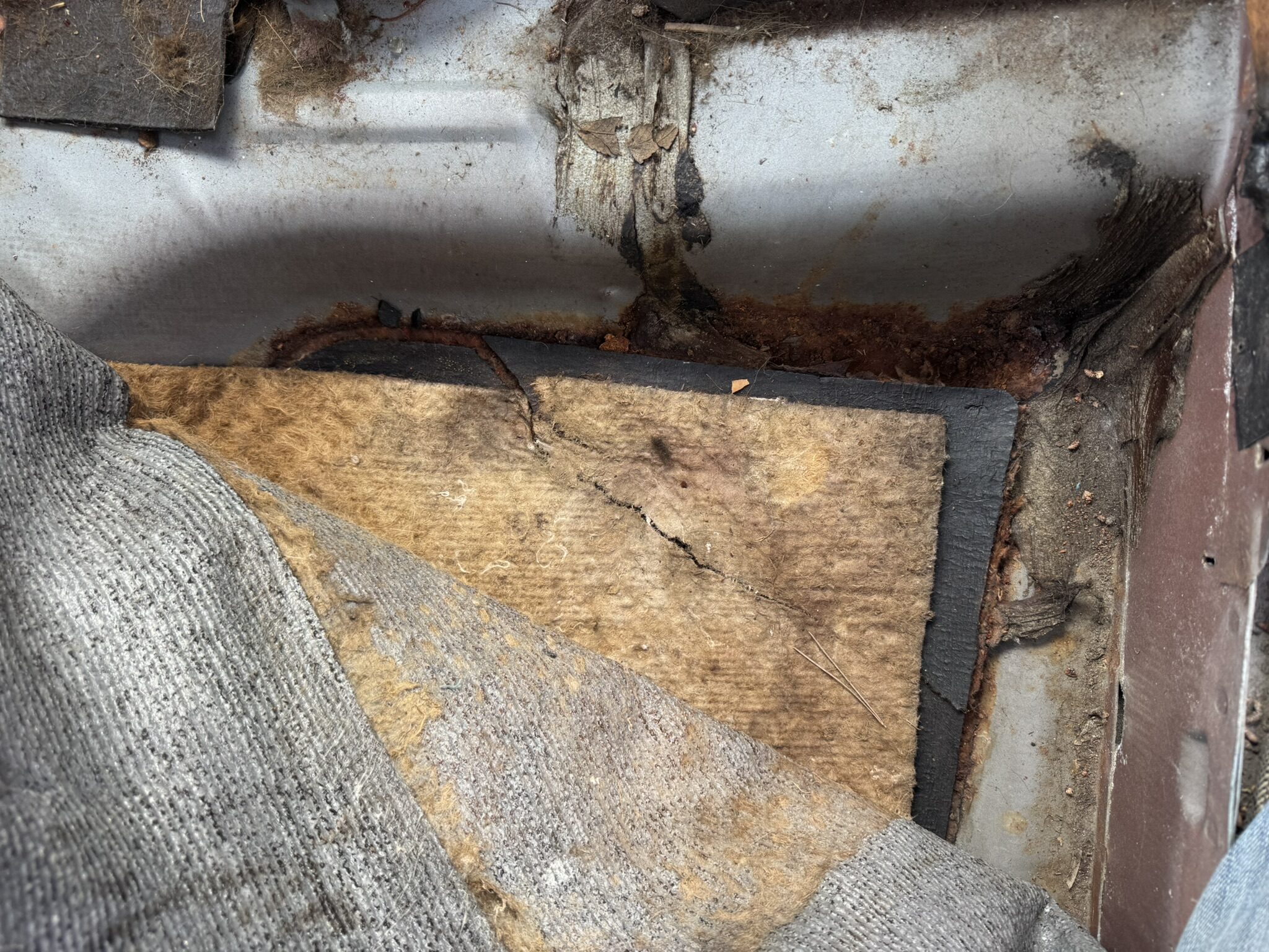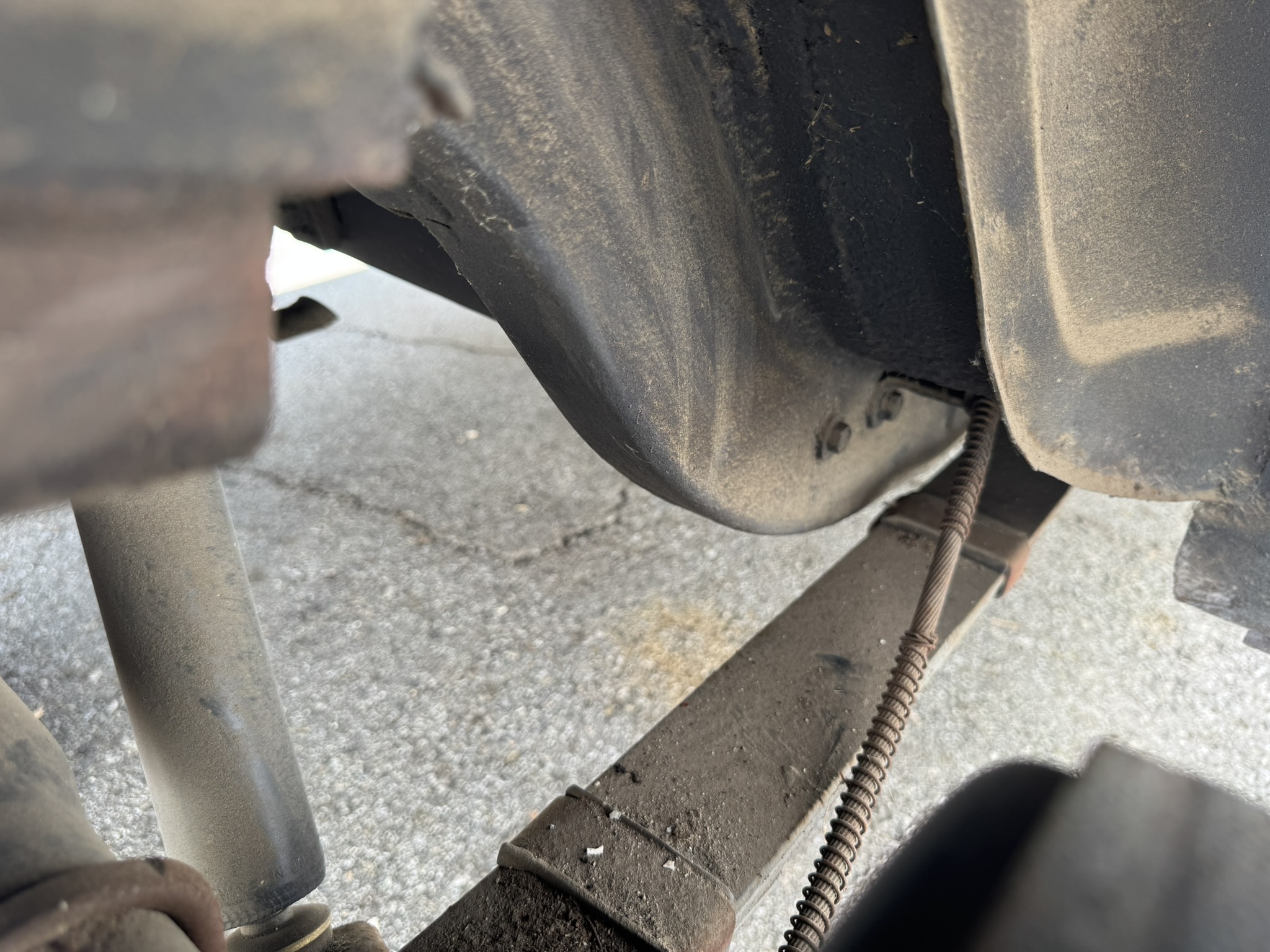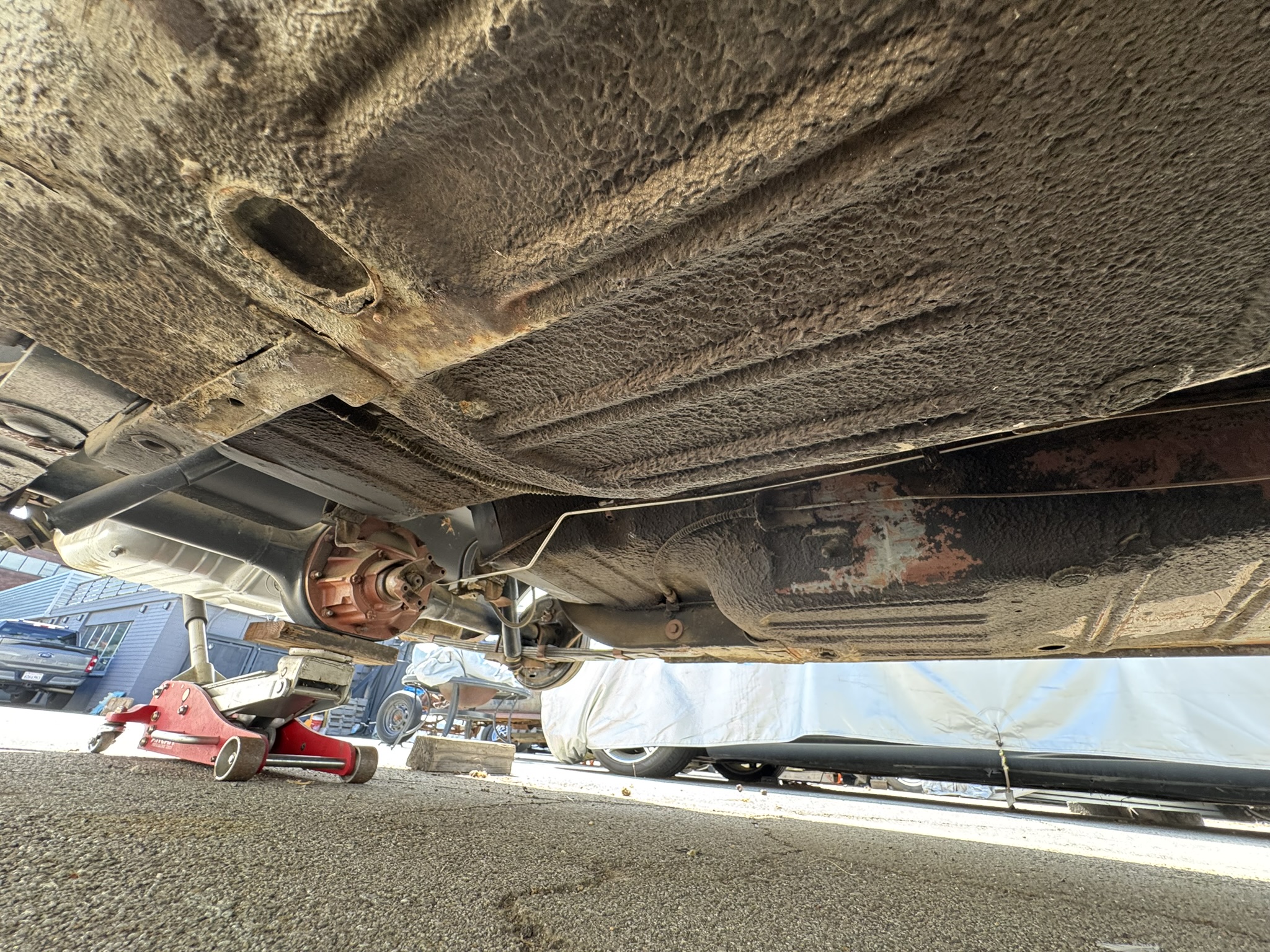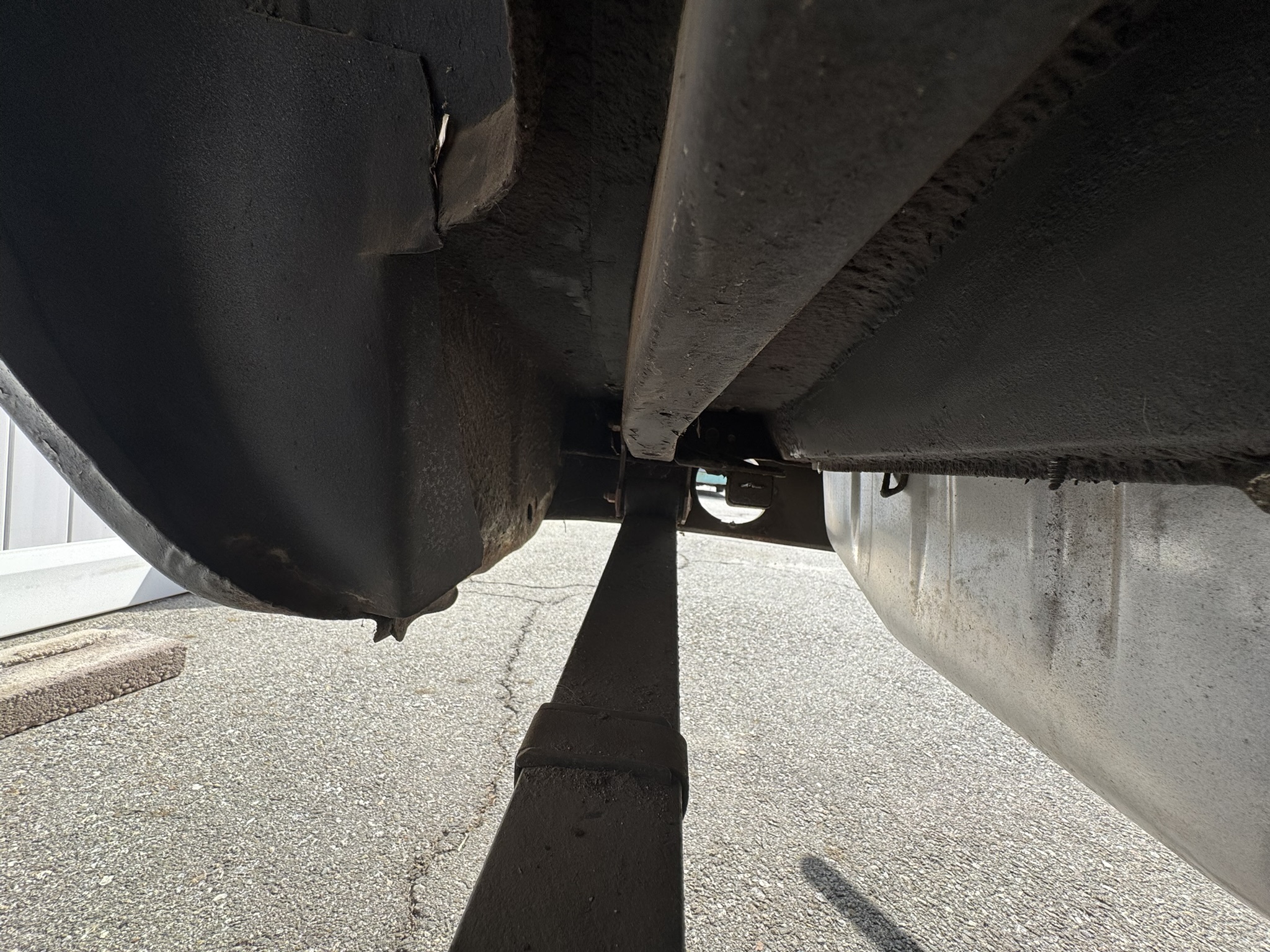 The floors are in great original condition with factory paint still visible. There is some rust underneath the heater core area in the front corner, likely from a leak. Surface rust is present on the rear floor under the seat but shows no rot. The trunk is in excellent condition with a new gas tank installed and no signs of rust.