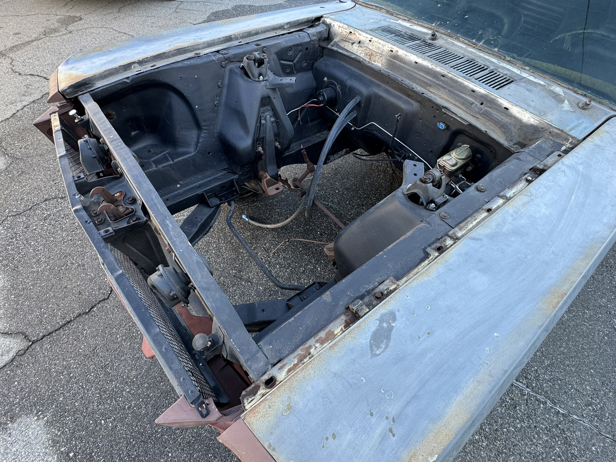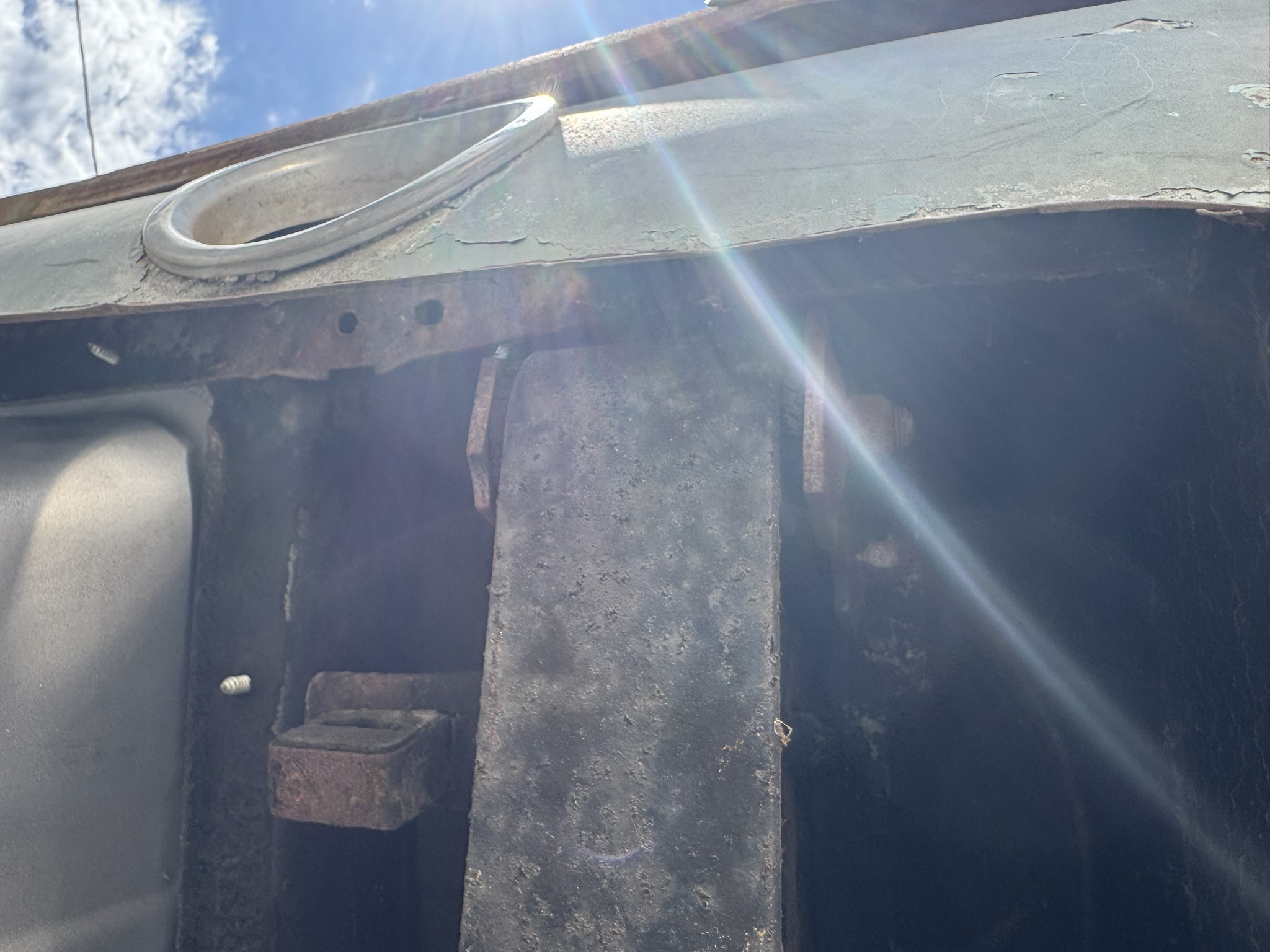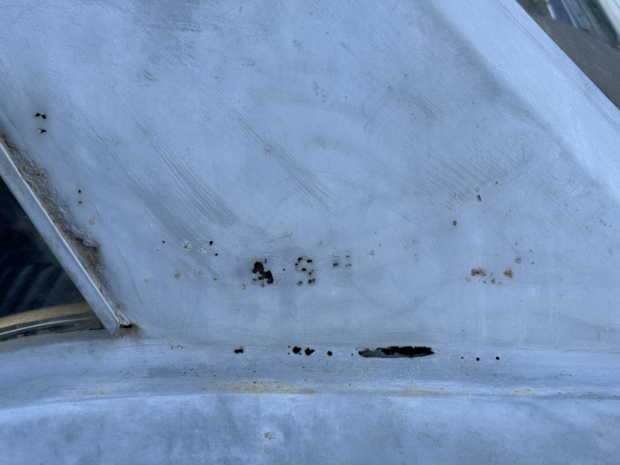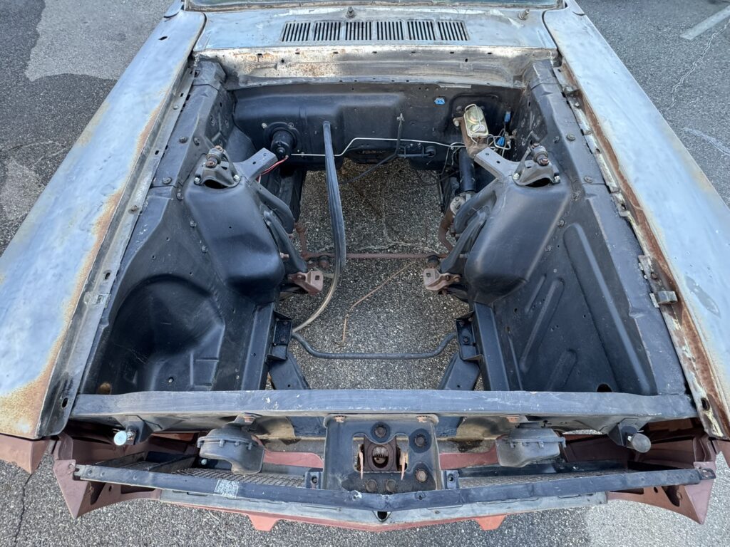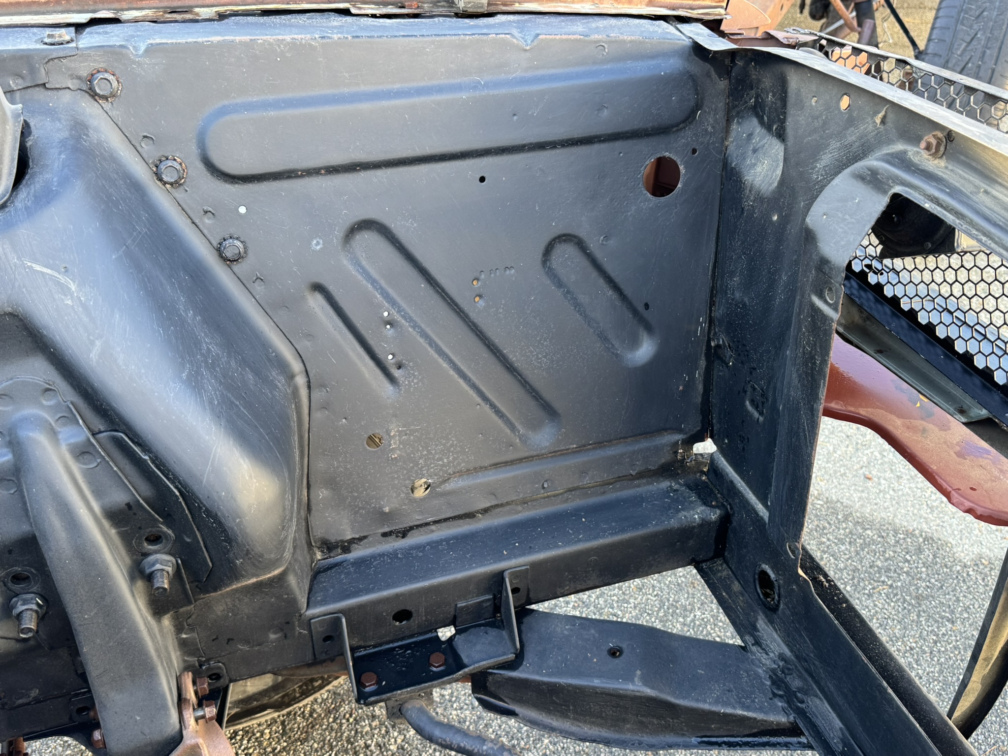 The body is in excellent condition with no hidden bondo, having been stripped to bare metal by the previous owner. The exceptions are the typical rust spot on the bottom front corner of the driver door, some rust holes on the driver side roof, and a replaced passenger quarter panel. Body components included but uninstalled are the front valance, front bumper, and grille components. The front fenders are reportedly replacements and are loosely installed. The hood is in good condition except for one small drilled hole. The front and rear frame rails are in excellent condition.