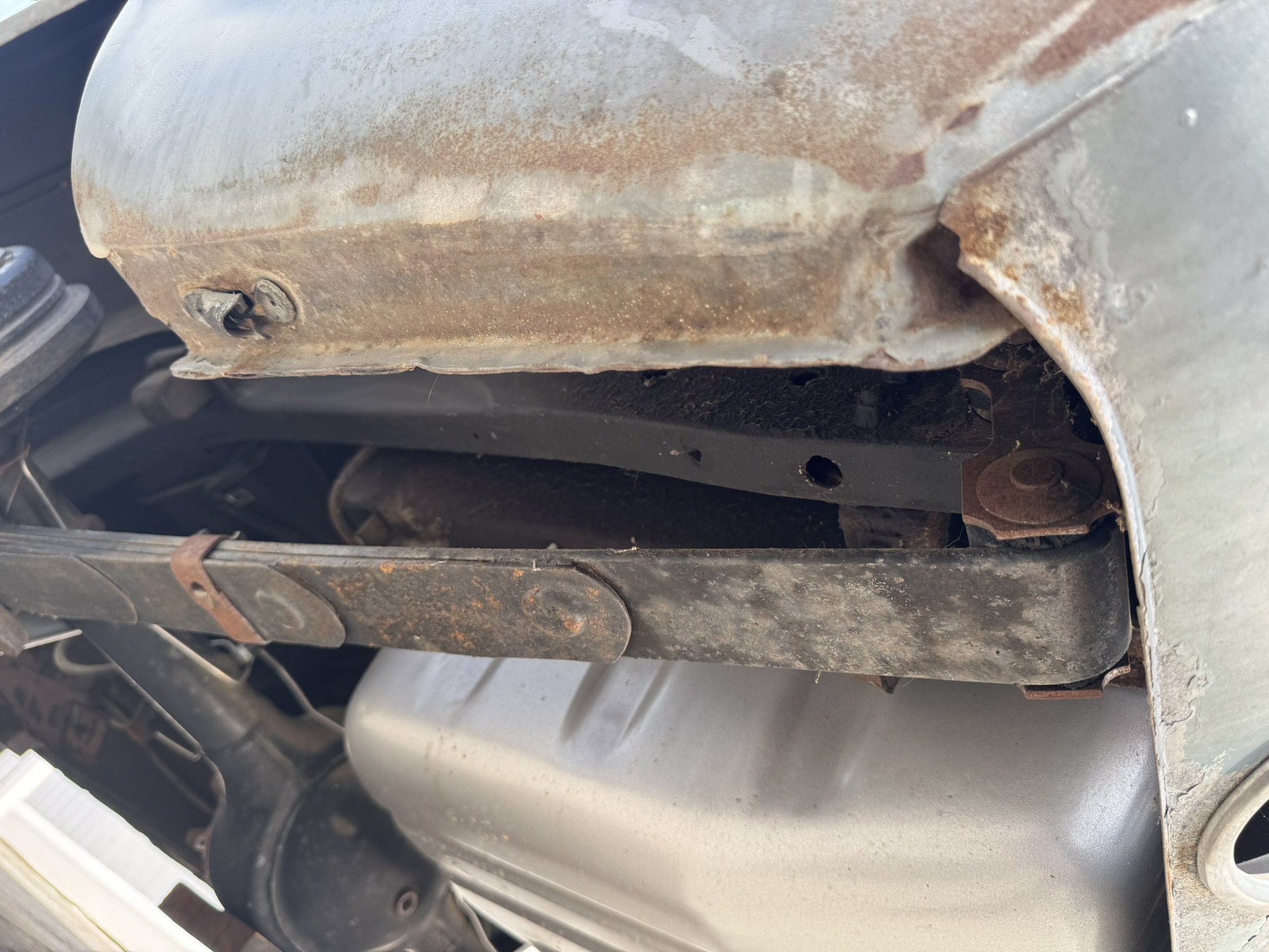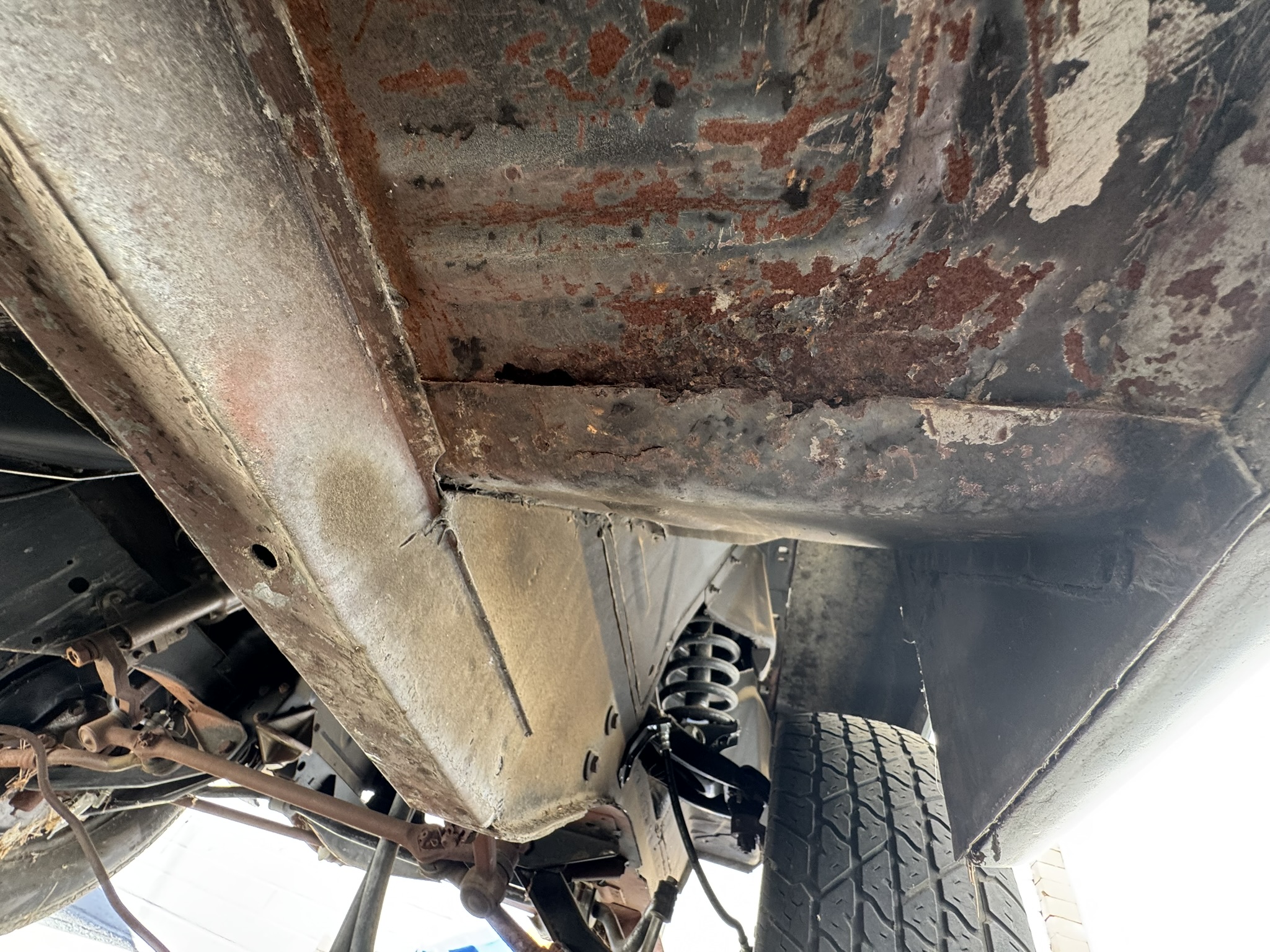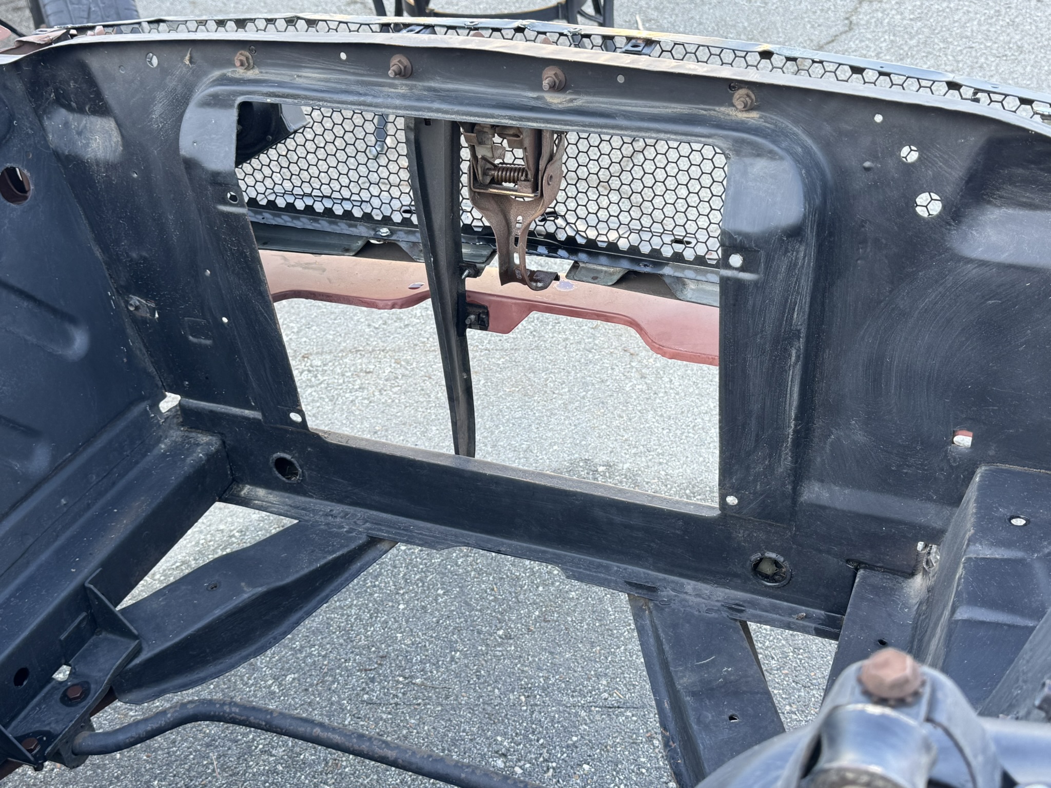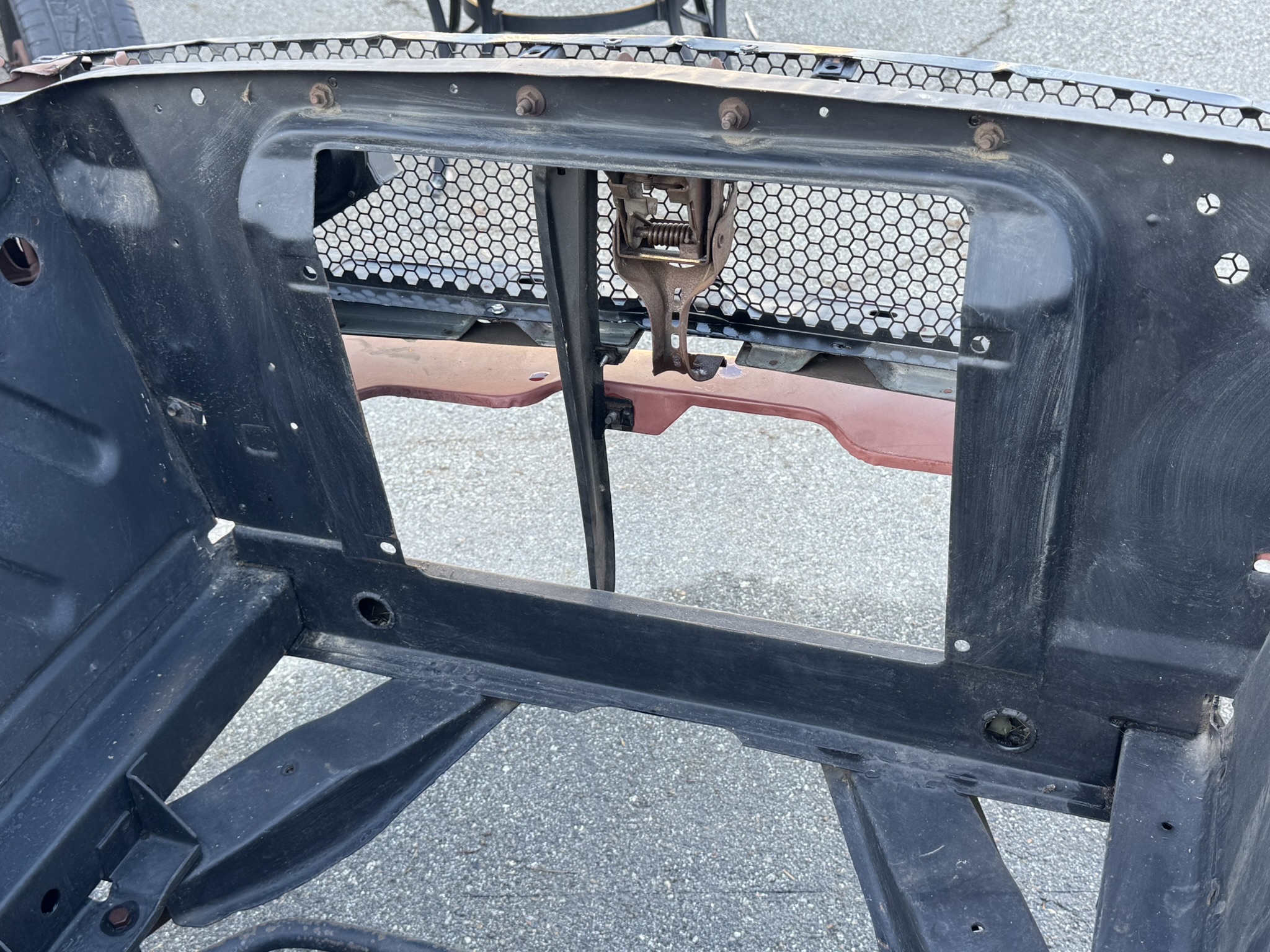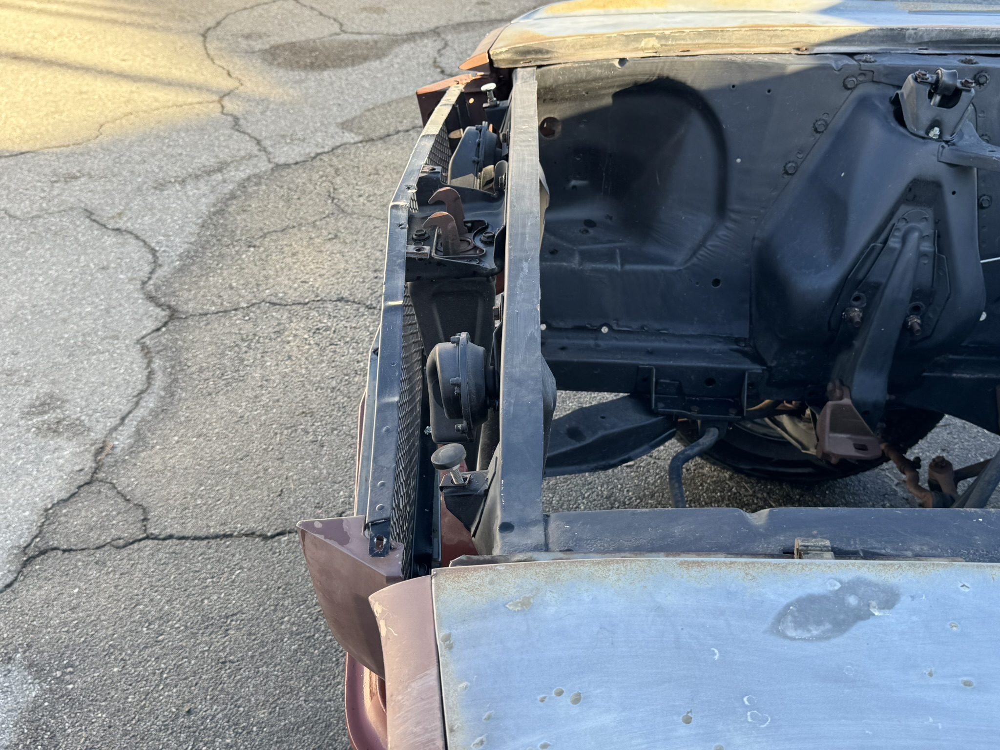 The body is in excellent condition with no hidden bondo, having been stripped to bare metal by the previous owner. The exceptions are the typical rust spot on the bottom front corner of the driver door, some rust holes on the driver side roof, and a replaced passenger quarter panel. Body components included but uninstalled are the front valance, front bumper, and grille components. The front fenders are reportedly replacements and are loosely installed. The hood is in good condition except for one small drilled hole. The front and rear frame rails are in excellent condition.