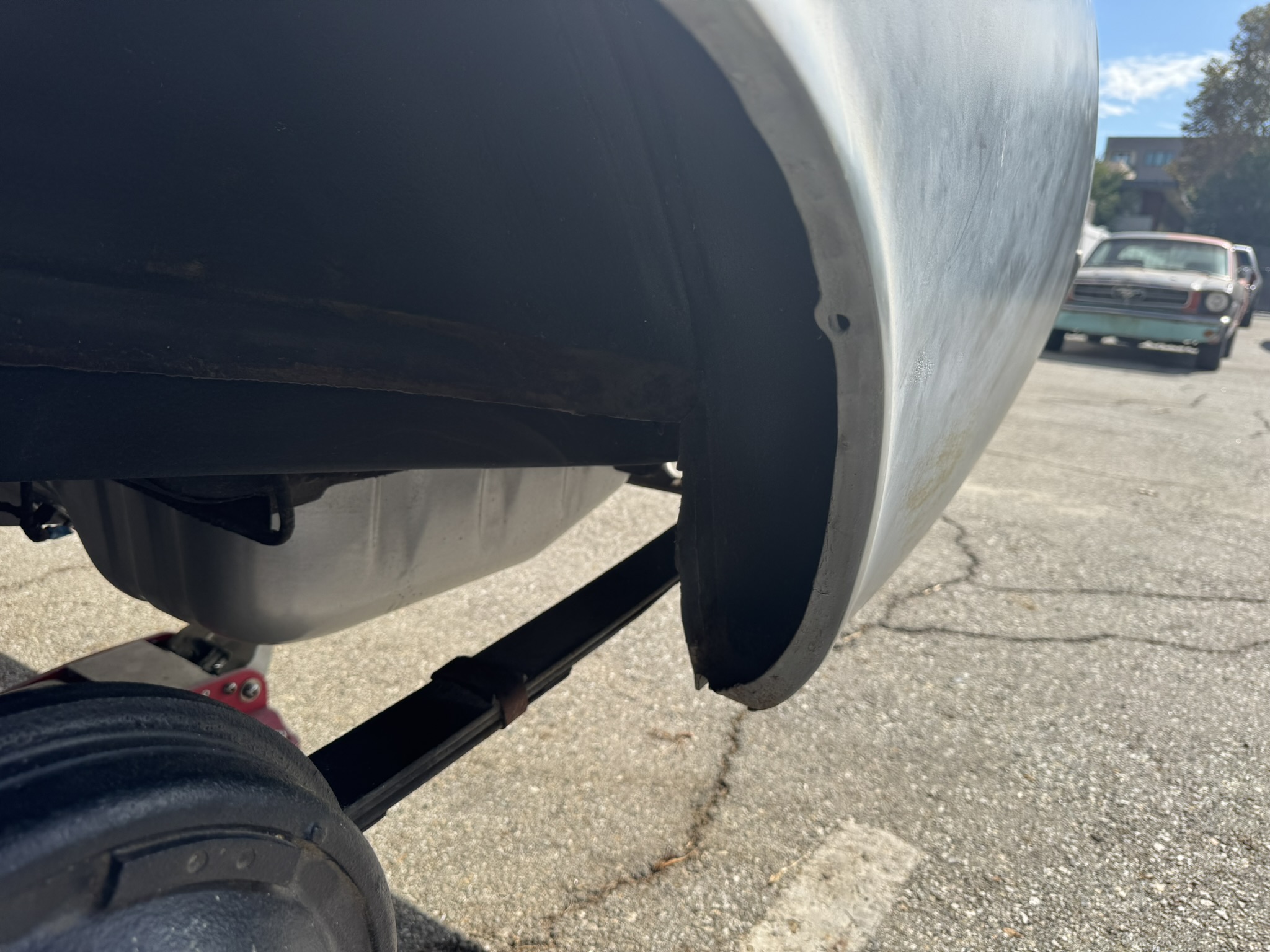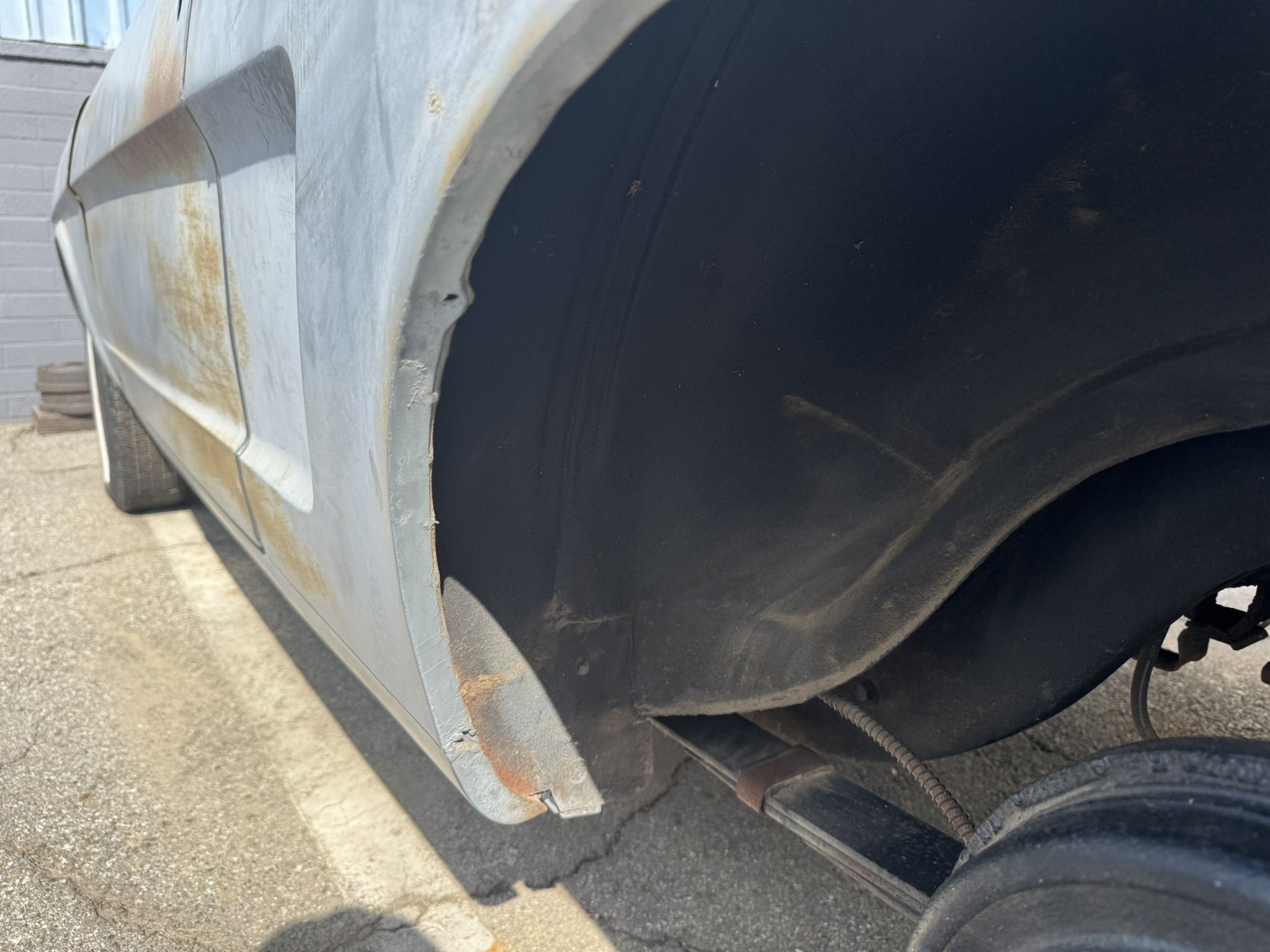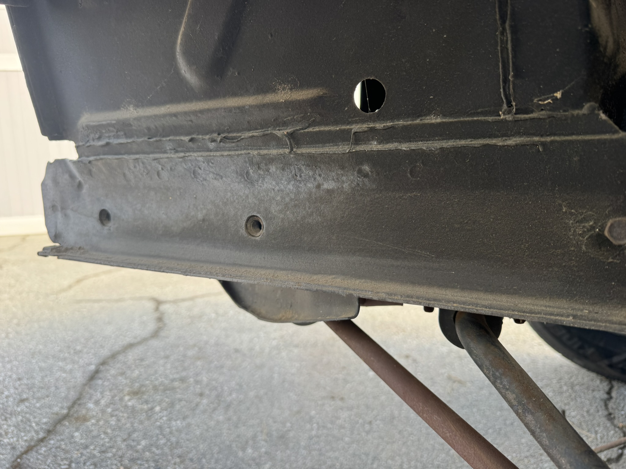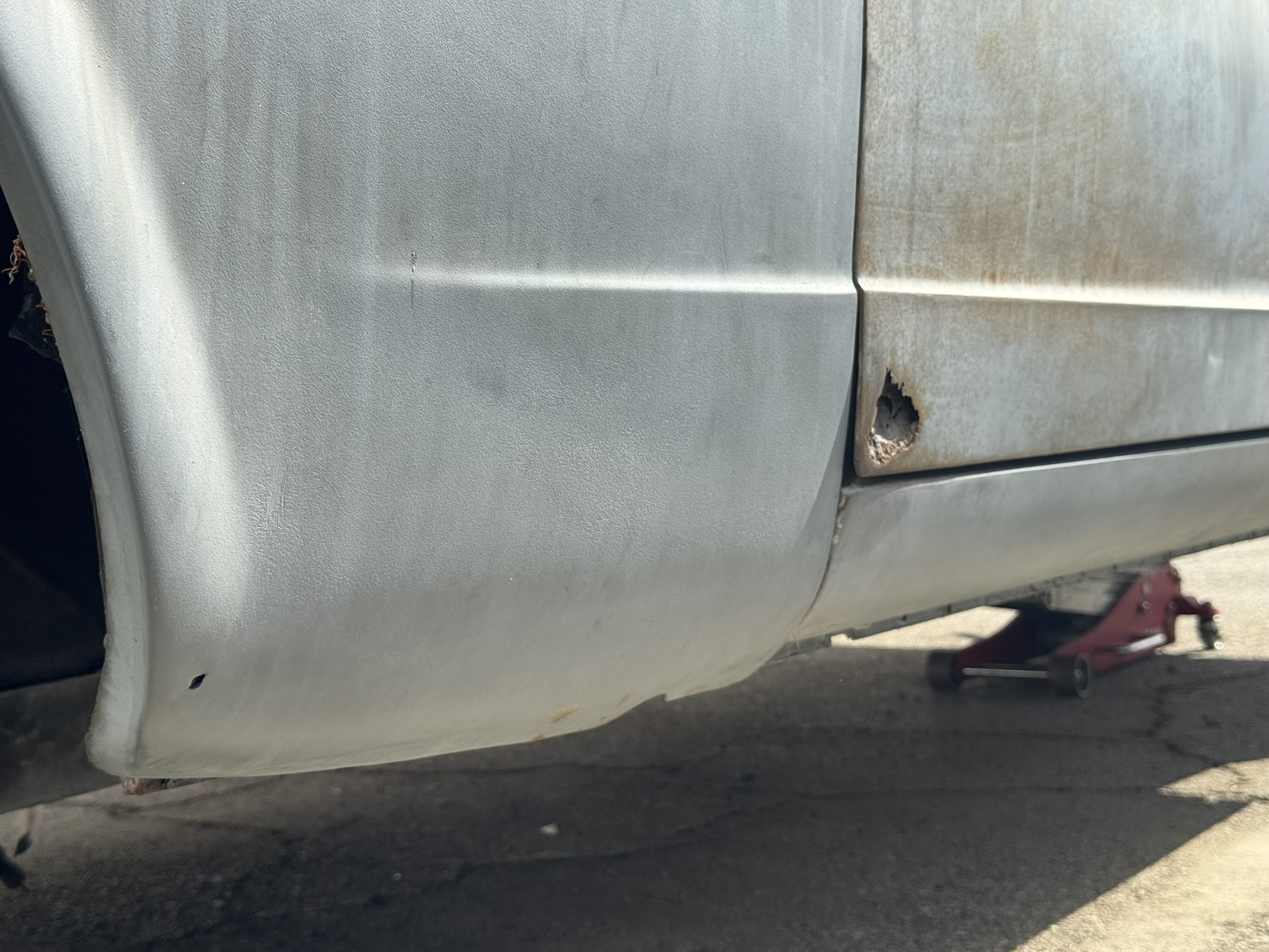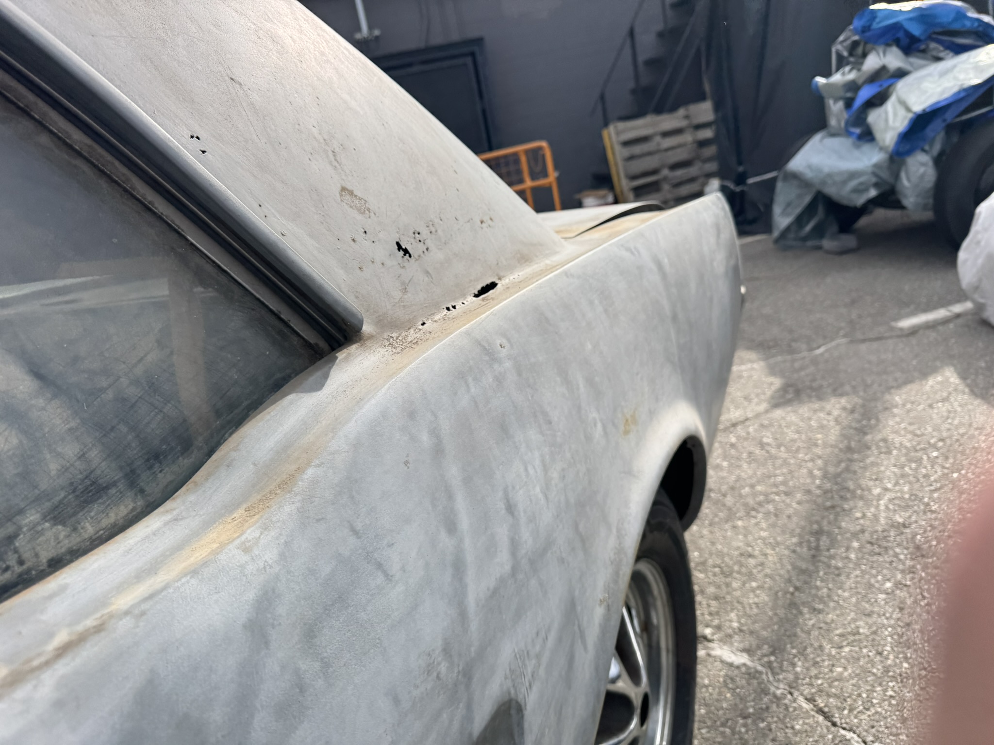 The body is in excellent condition with no hidden bondo, having been stripped to bare metal by the previous owner. The exceptions are the typical rust spot on the bottom front corner of the driver door, some rust holes on the driver side roof, and a replaced passenger quarter panel. Body components included but uninstalled are the front valance, front bumper, and grille components. The front fenders are reportedly replacements and are loosely installed. The hood is in good condition except for one small drilled hole. The front and rear frame rails are in excellent condition.