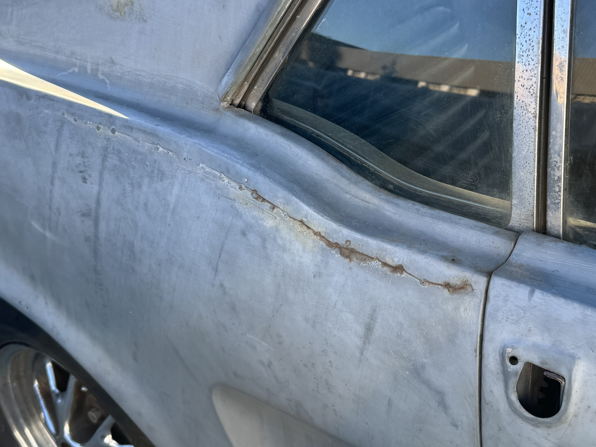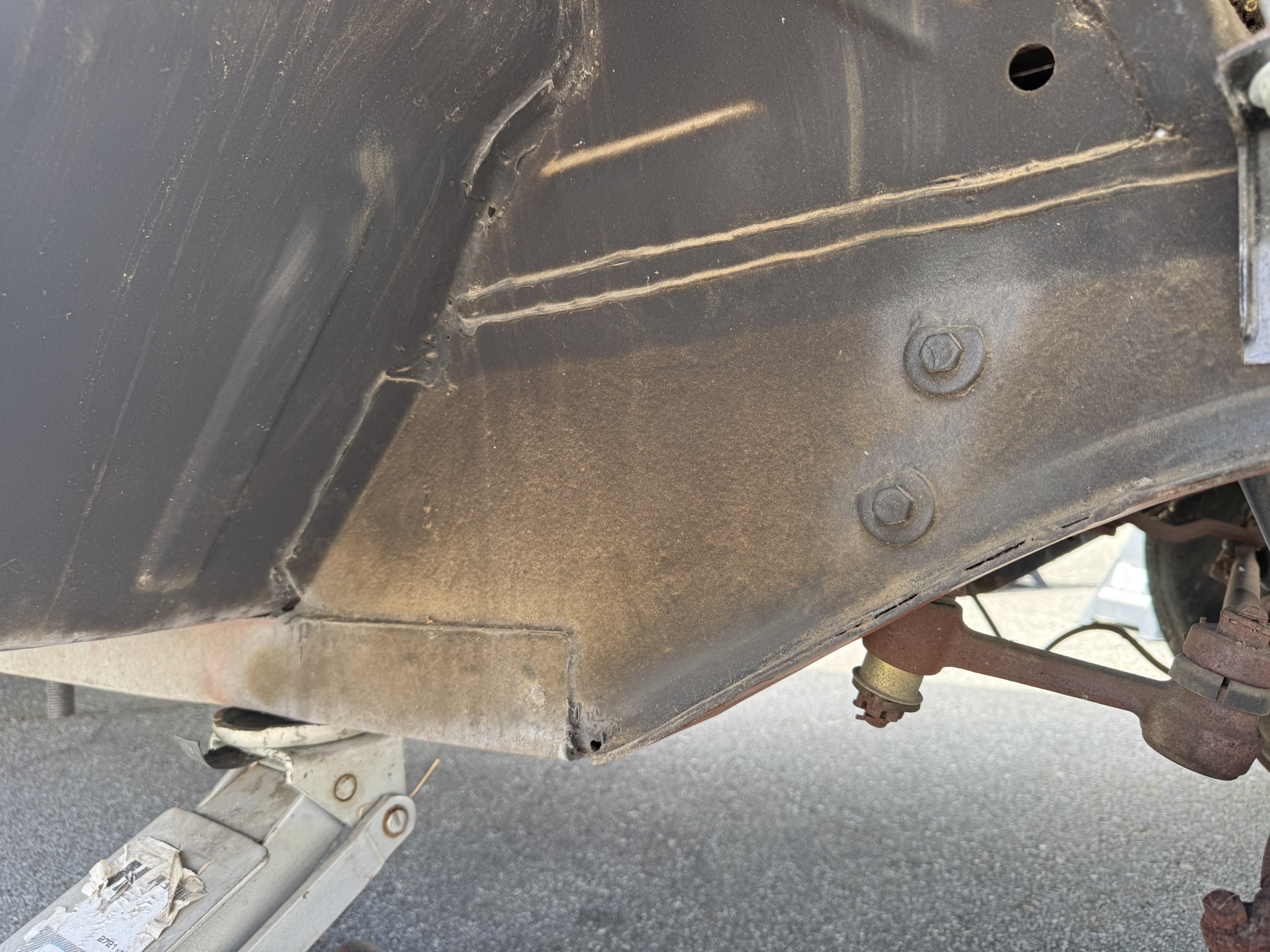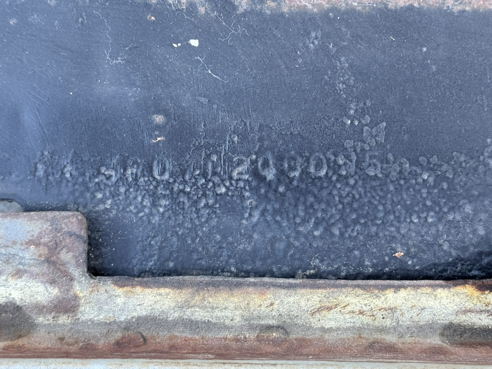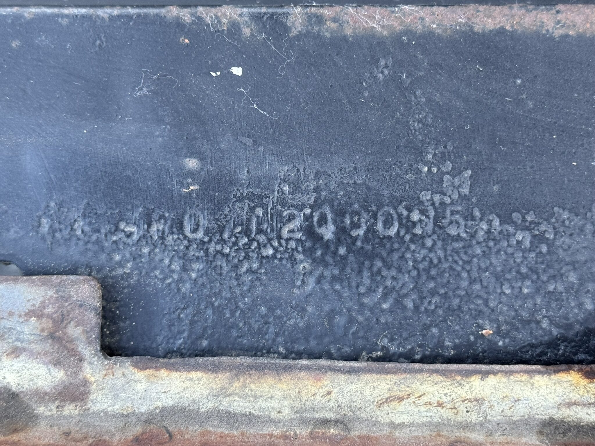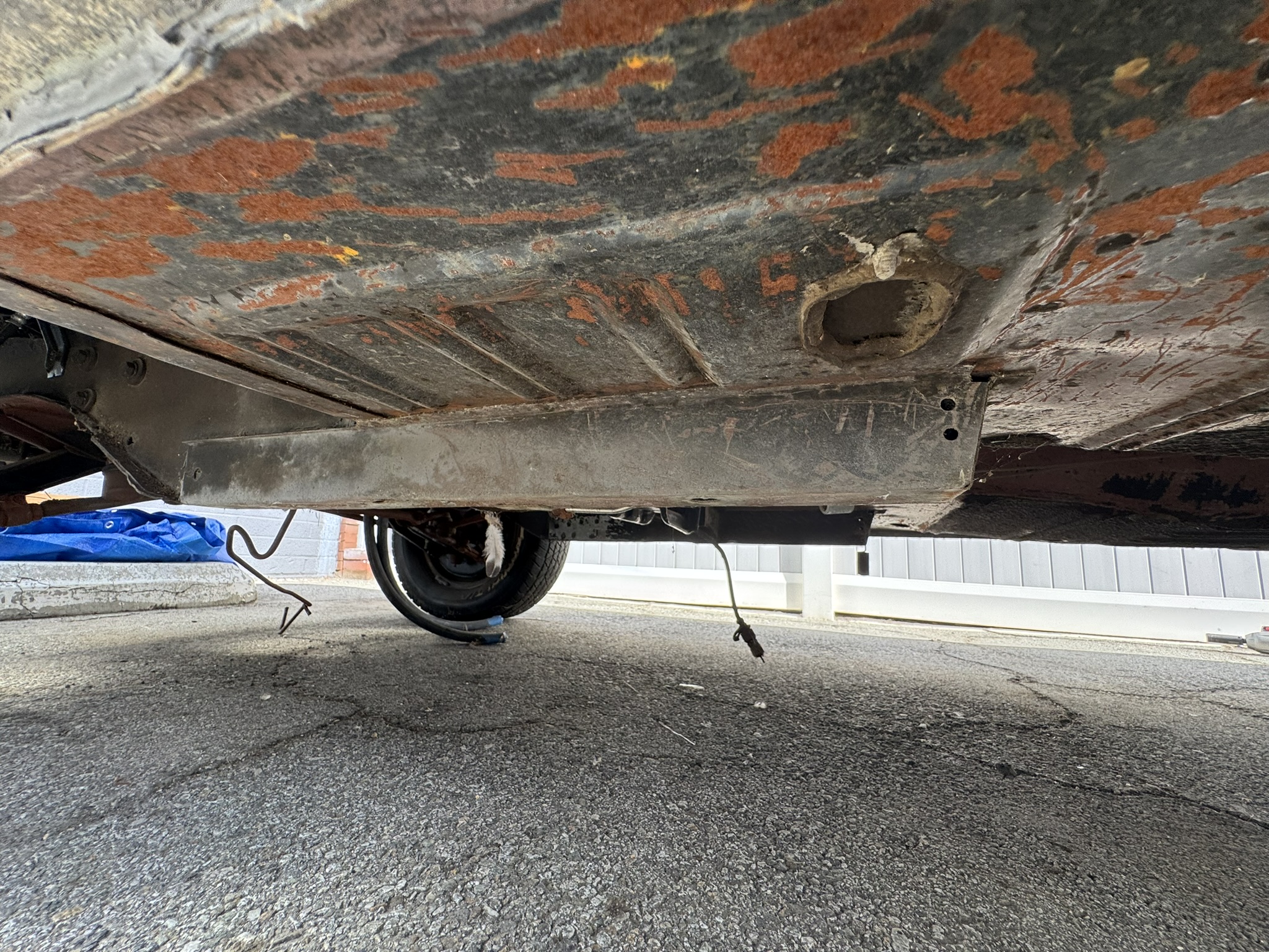 The body is in excellent condition with no hidden bondo, having been stripped to bare metal by the previous owner. The exceptions are the typical rust spot on the bottom front corner of the driver door, some rust holes on the driver side roof, and a replaced passenger quarter panel. Body components included but uninstalled are the front valance, front bumper, and grille components. The front fenders are reportedly replacements and are loosely installed. The hood is in good condition except for one small drilled hole. The front and rear frame rails are in excellent condition.