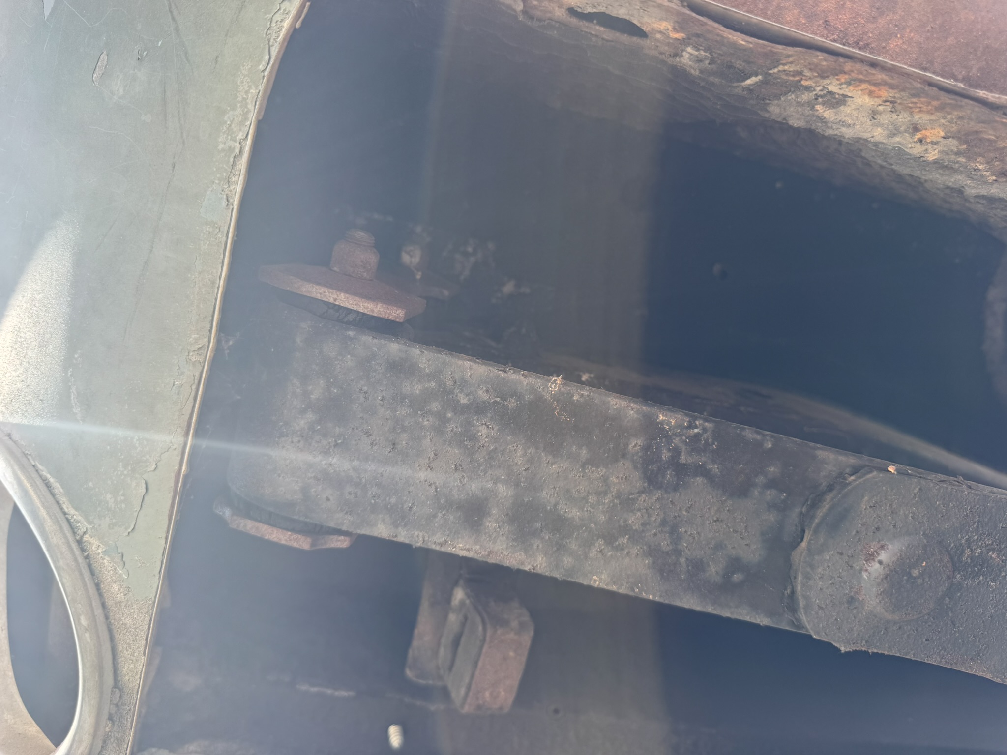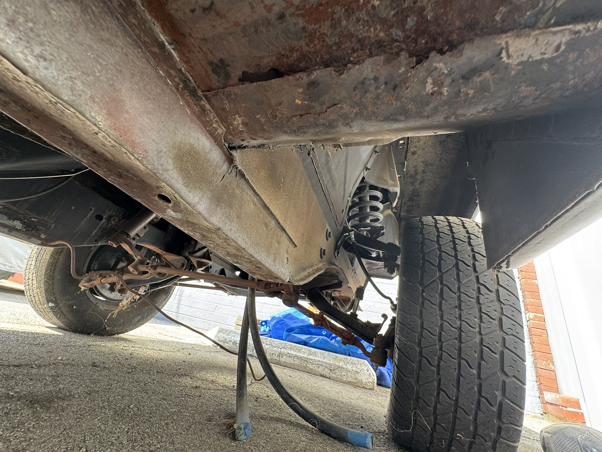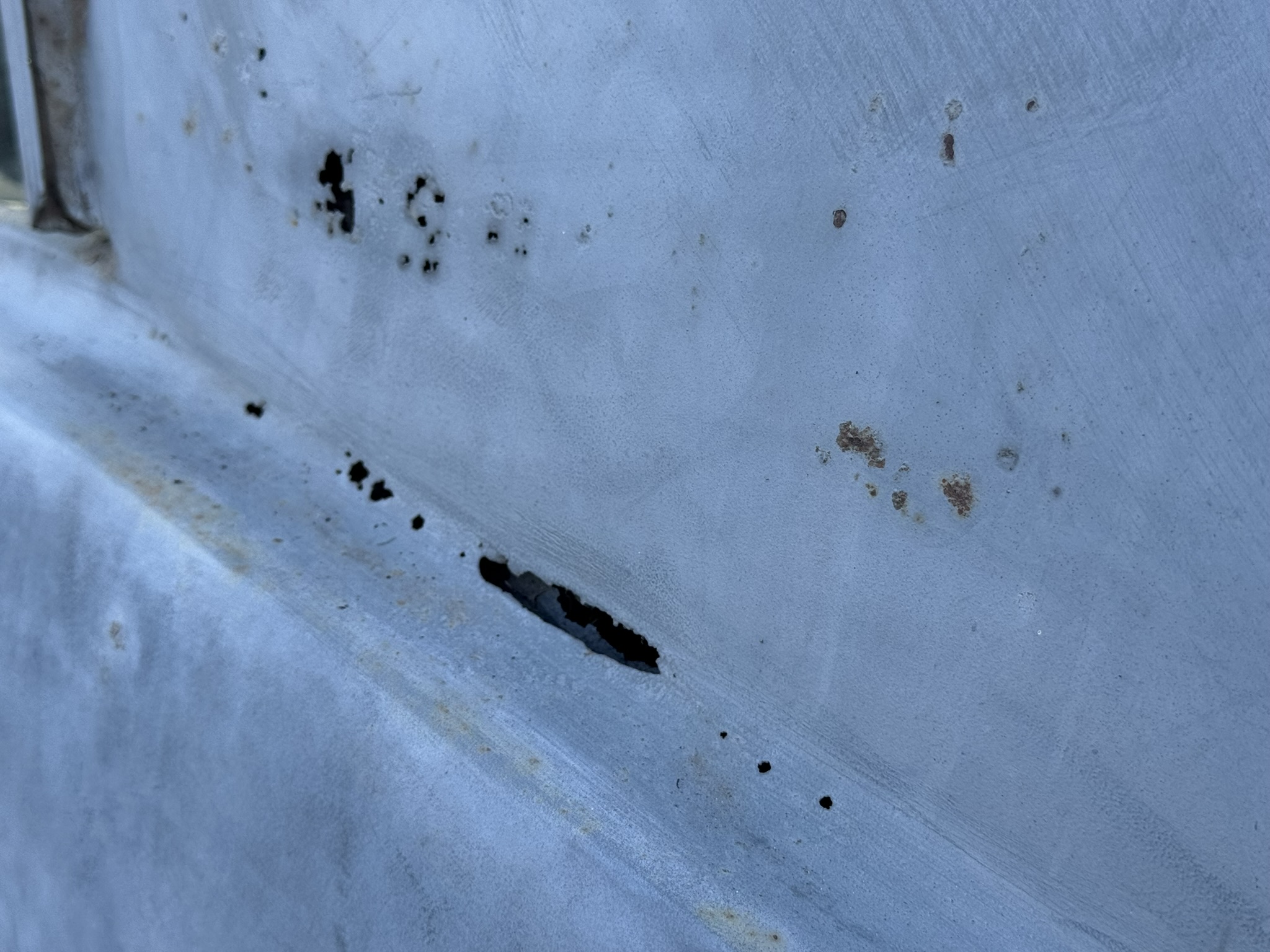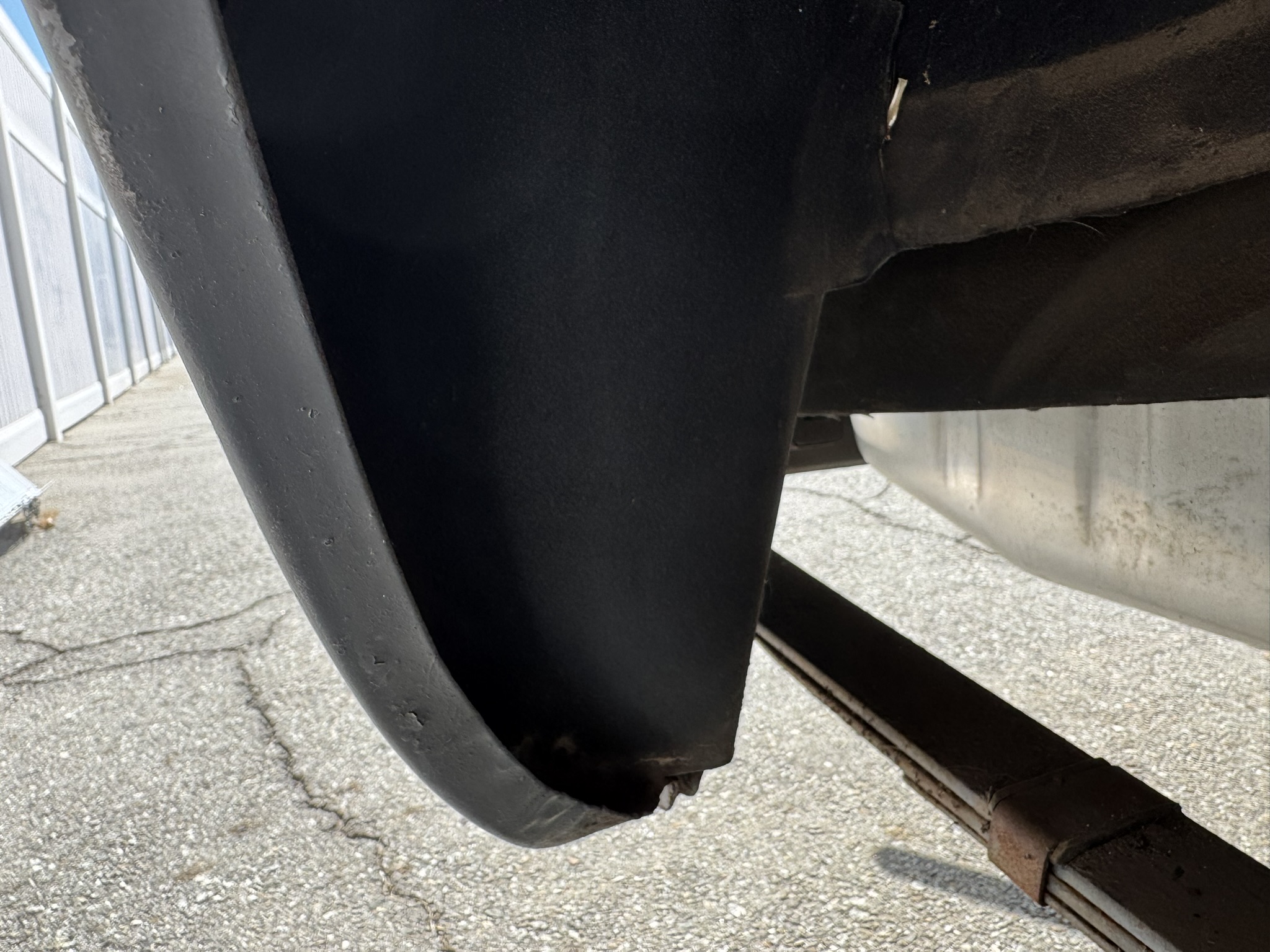 The body is in excellent condition with no hidden bondo, having been stripped to bare metal by the previous owner. The exceptions are the typical rust spot on the bottom front corner of the driver door, some rust holes on the driver side roof, and a replaced passenger quarter panel. Body components included but uninstalled are the front valance, front bumper, and grille components. The front fenders are reportedly replacements and are loosely installed. The hood is in good condition except for one small drilled hole. The front and rear frame rails are in excellent condition.