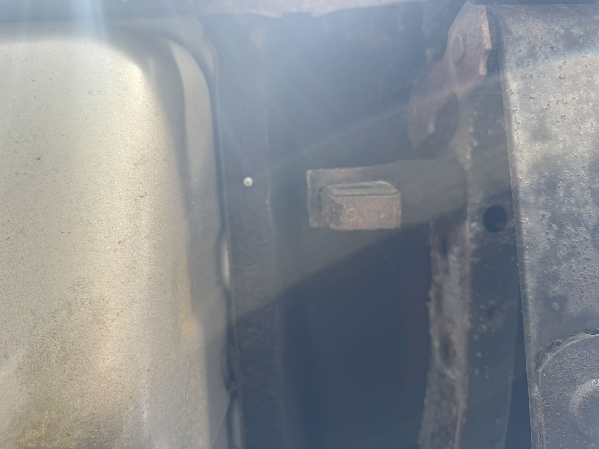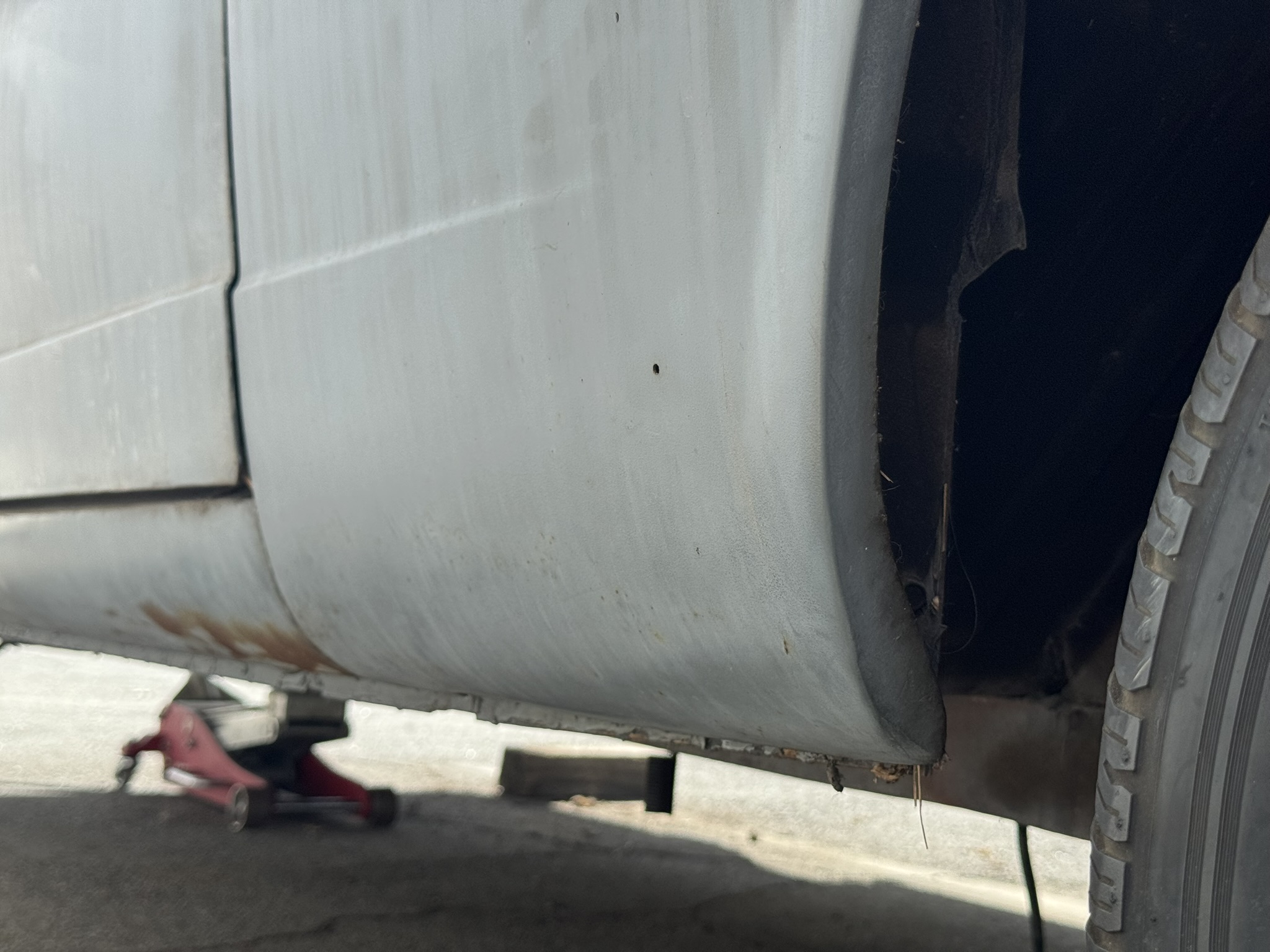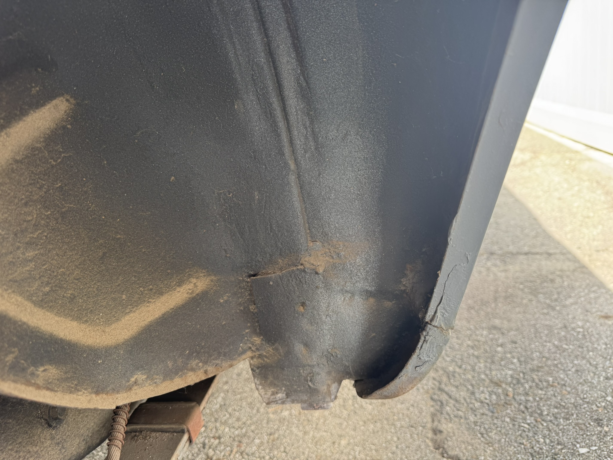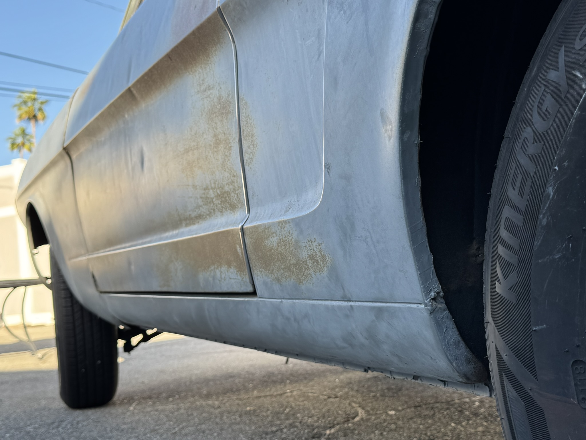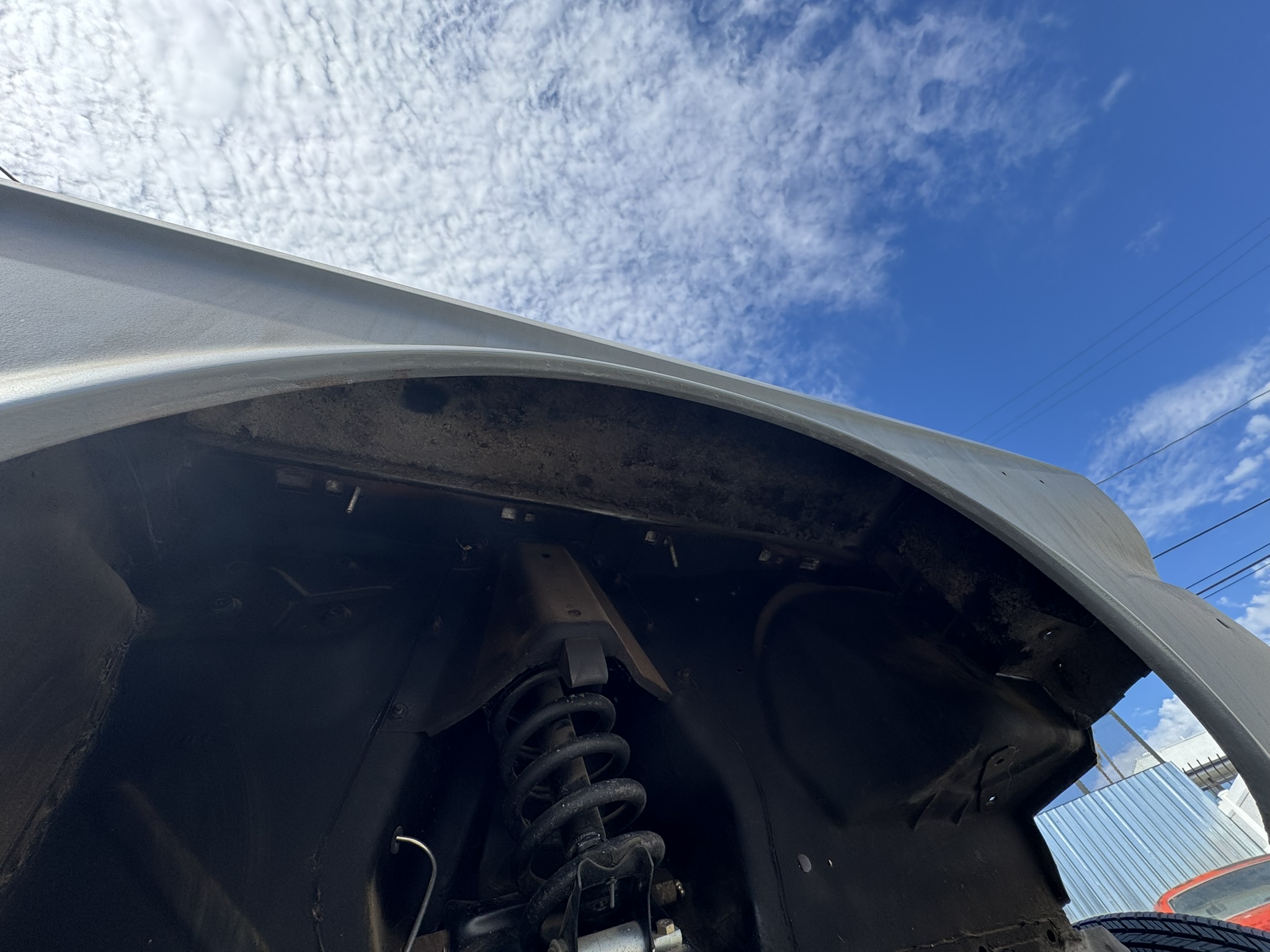 The body is in excellent condition with no hidden bondo, having been stripped to bare metal by the previous owner. The exceptions are the typical rust spot on the bottom front corner of the driver door, some rust holes on the driver side roof, and a replaced passenger quarter panel. Body components included but uninstalled are the front valance, front bumper, and grille components. The front fenders are reportedly replacements and are loosely installed. The hood is in good condition except for one small drilled hole. The front and rear frame rails are in excellent condition.