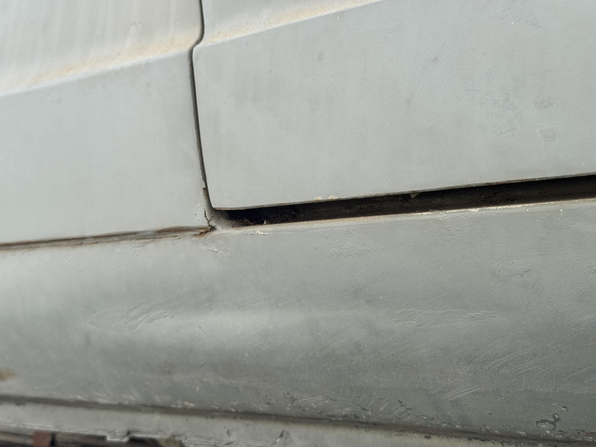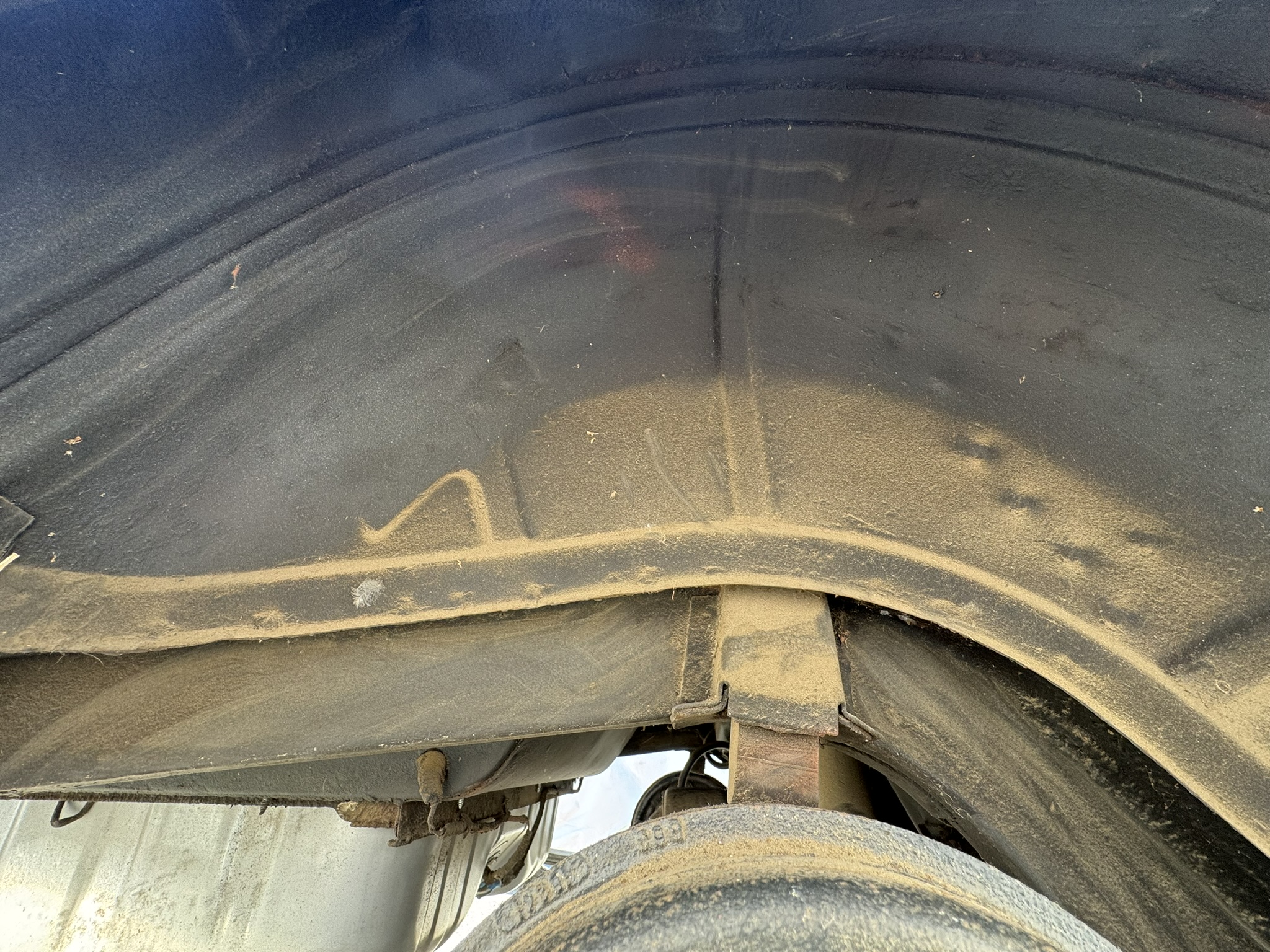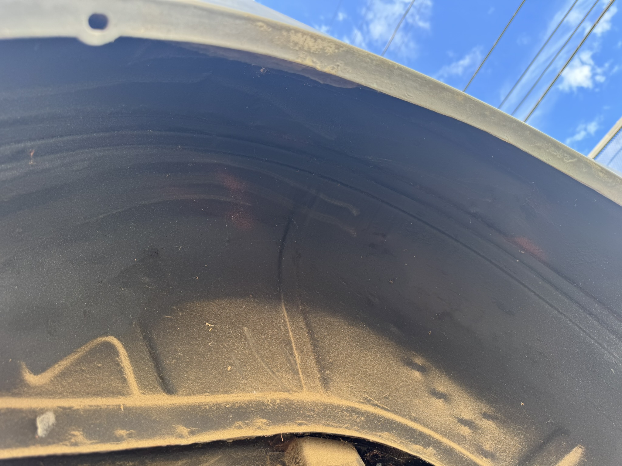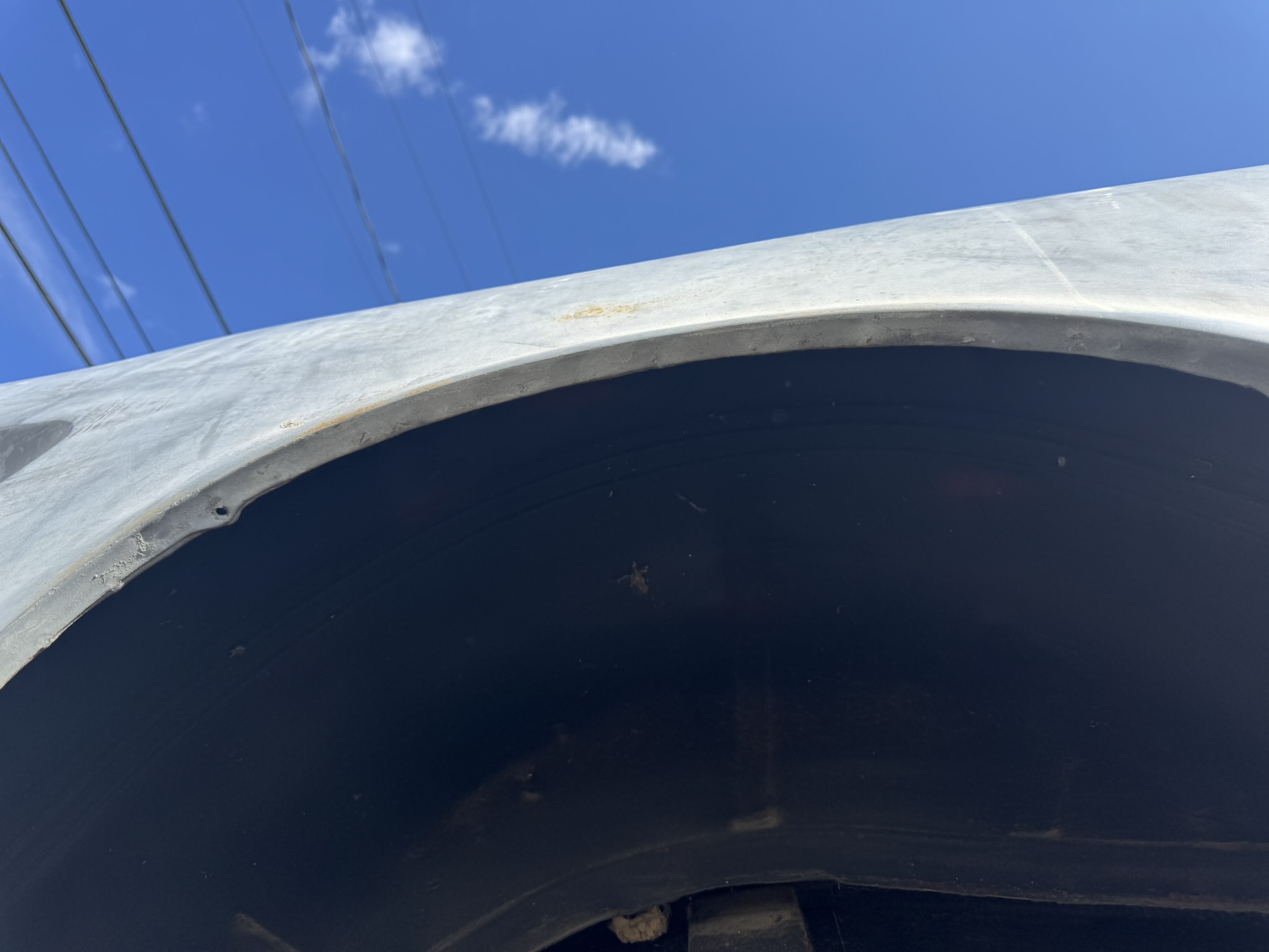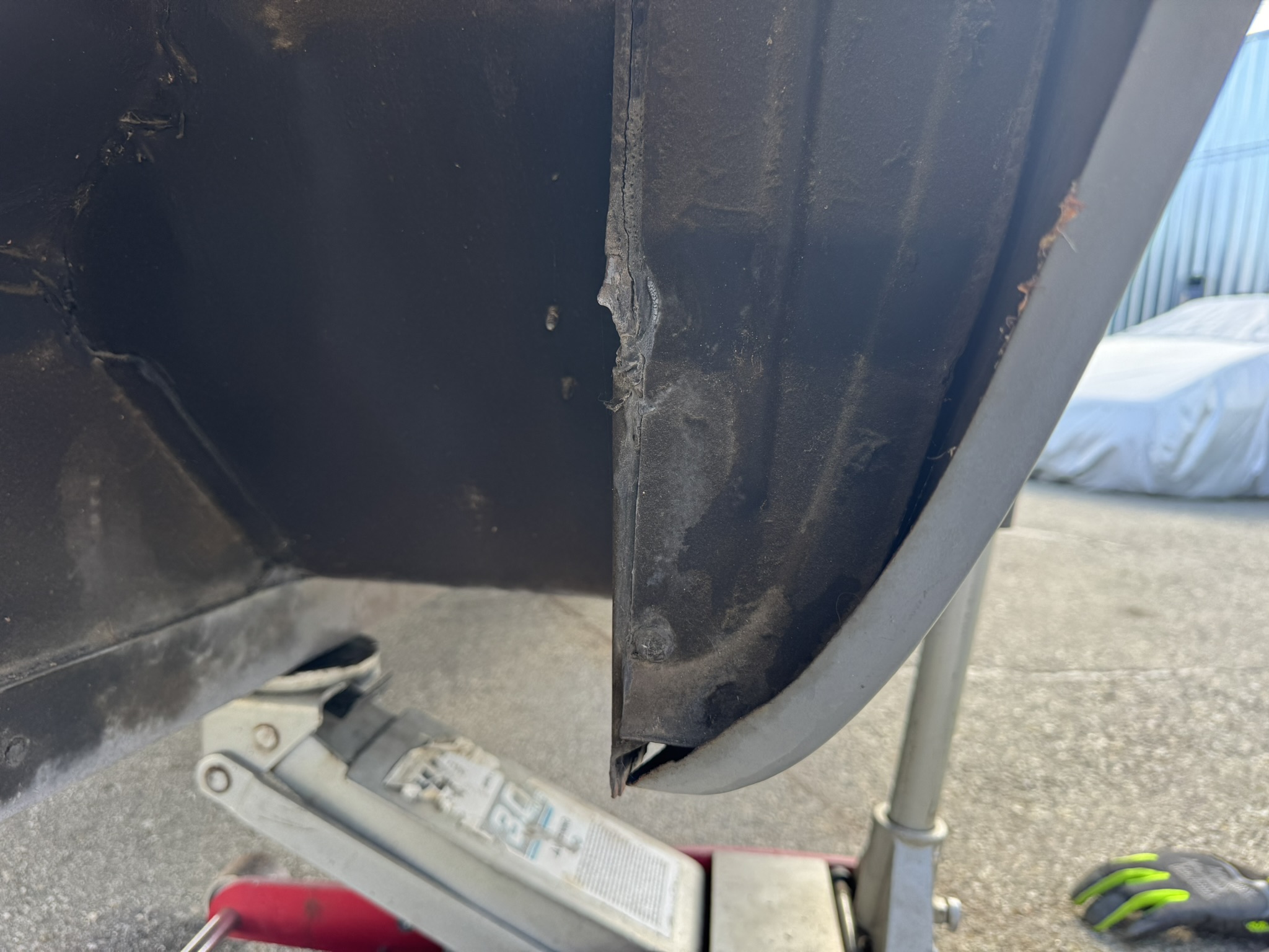 The body is in excellent condition with no hidden bondo, having been stripped to bare metal by the previous owner. The exceptions are the typical rust spot on the bottom front corner of the driver door, some rust holes on the driver side roof, and a replaced passenger quarter panel. Body components included but uninstalled are the front valance, front bumper, and grille components. The front fenders are reportedly replacements and are loosely installed. The hood is in good condition except for one small drilled hole. The front and rear frame rails are in excellent condition.