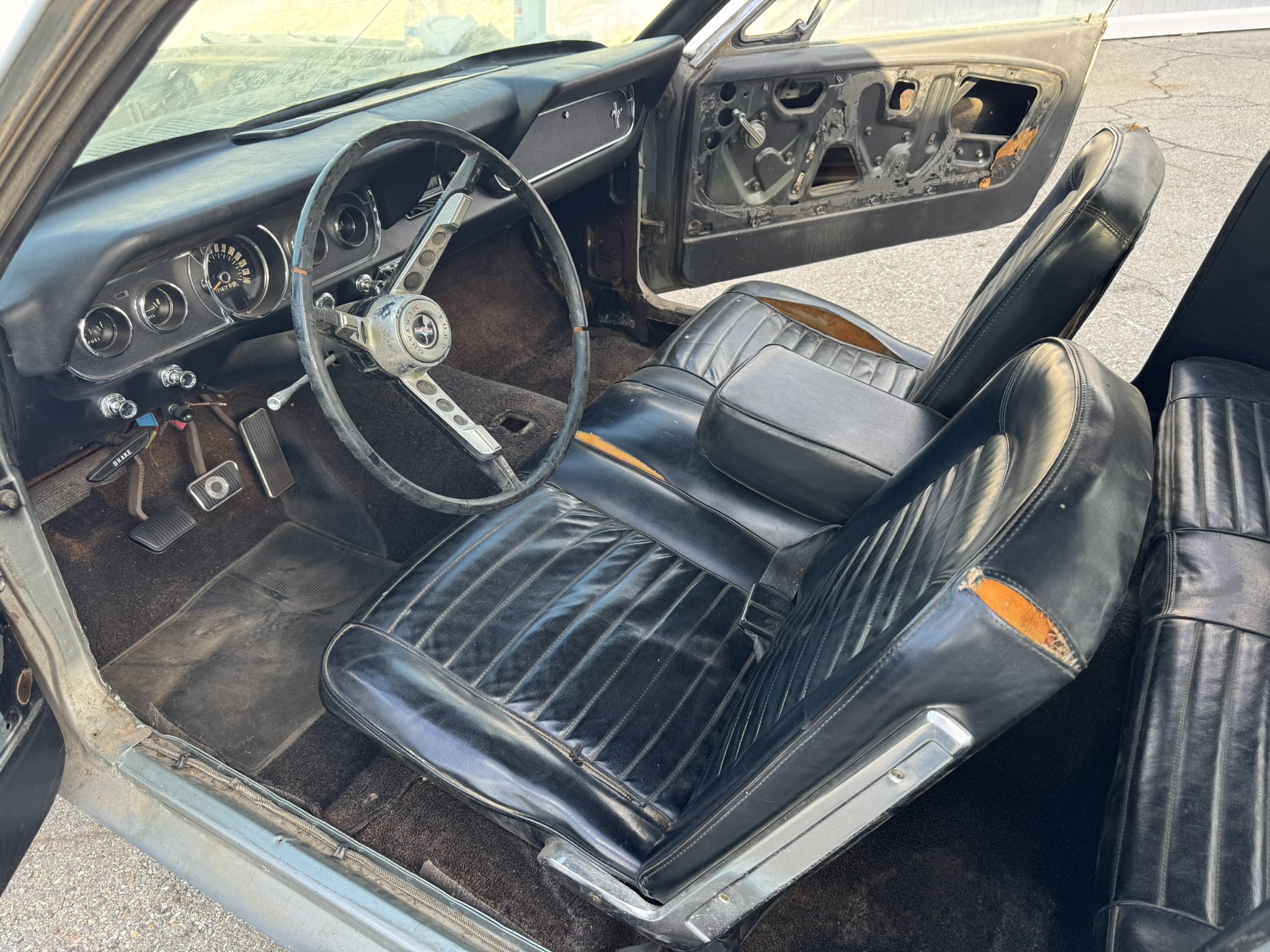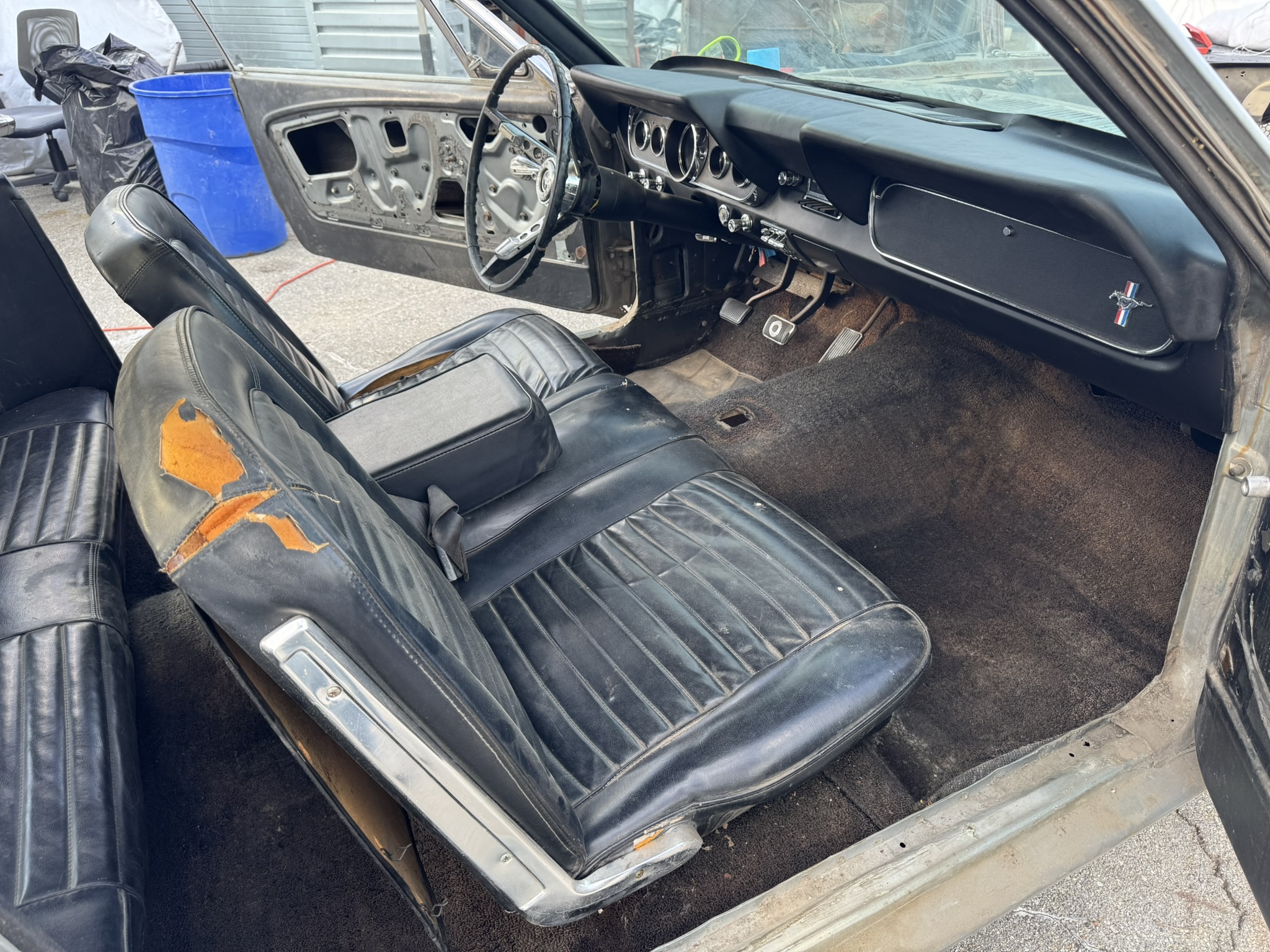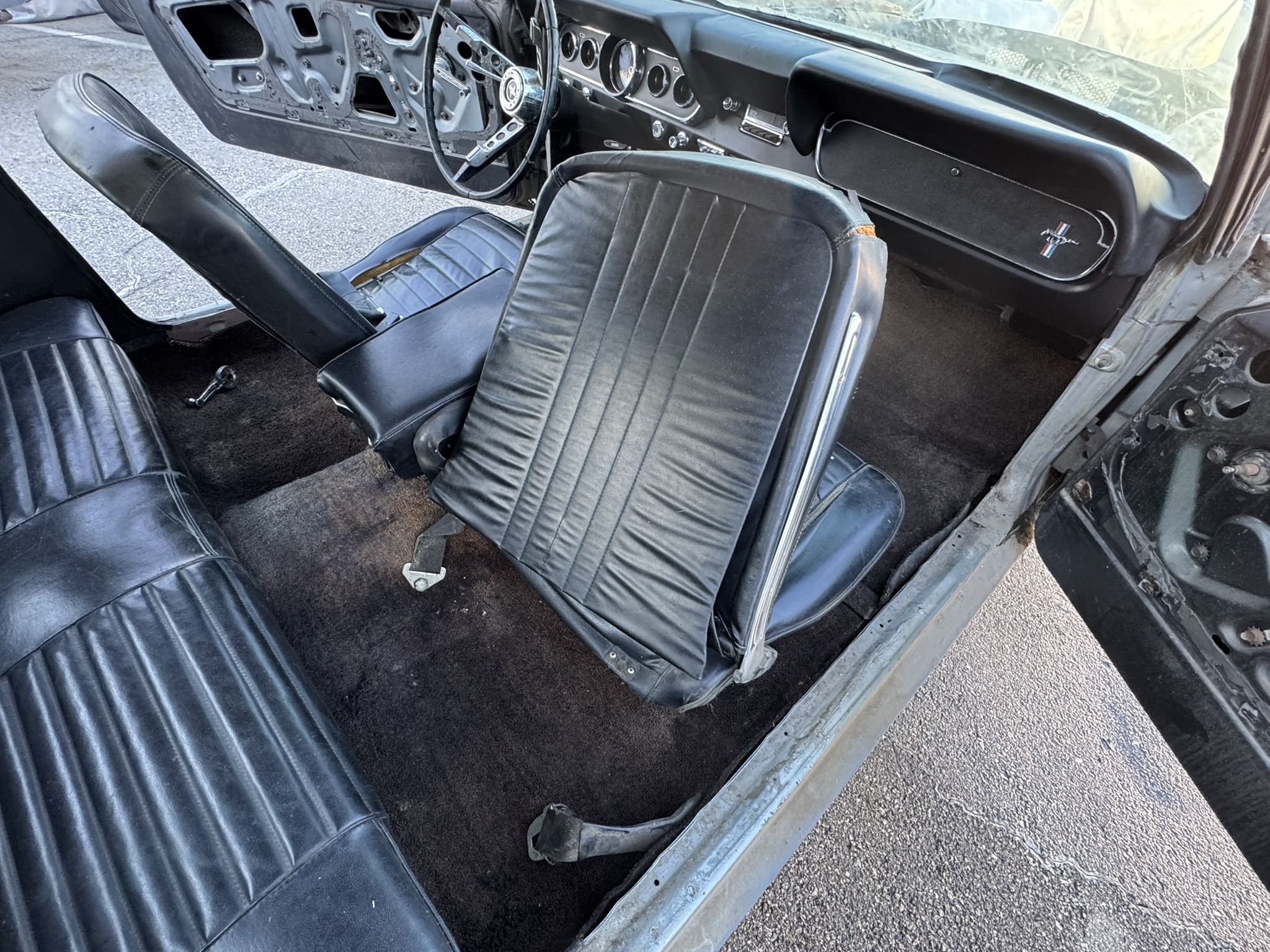 It's uncommon to see a bench seat in a Mustang, but this one has Trim Code 36: Black Vinyl Bench Seat. The matching rear seat is installed along with interior rear side panels. The dash has been updated with a new GT-style gauge bezel and replacement dash pad, which has a couple of flaws. The remaining dash knobs and glove box door are in good condition. The factory wiring harness appears complete and in good condition.