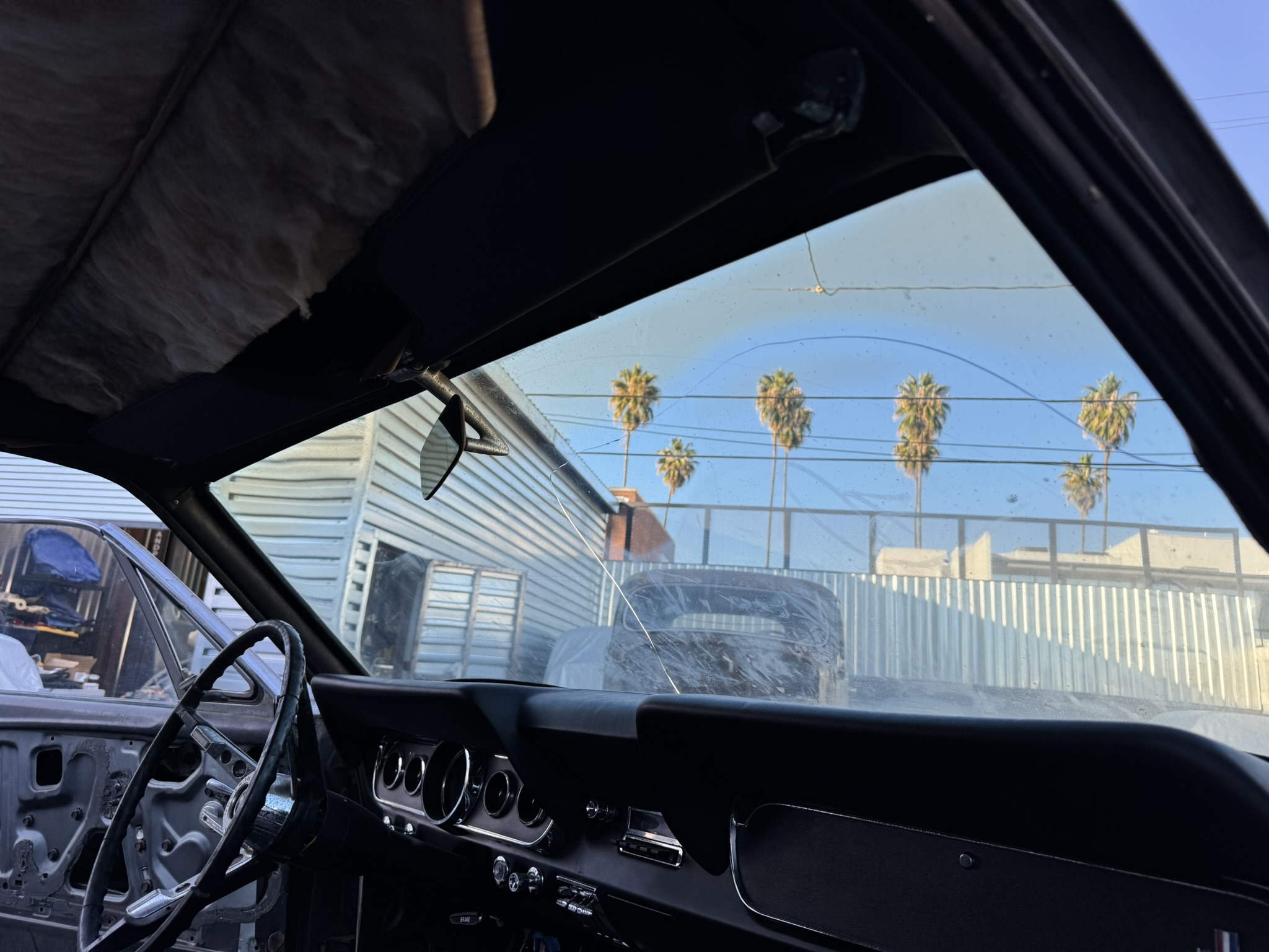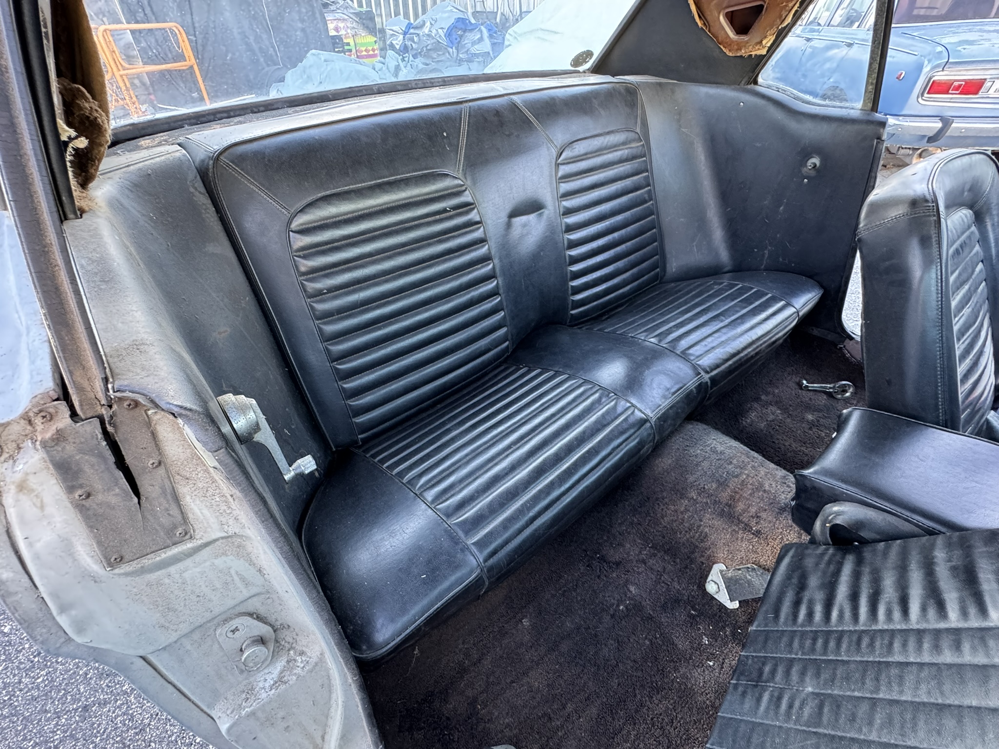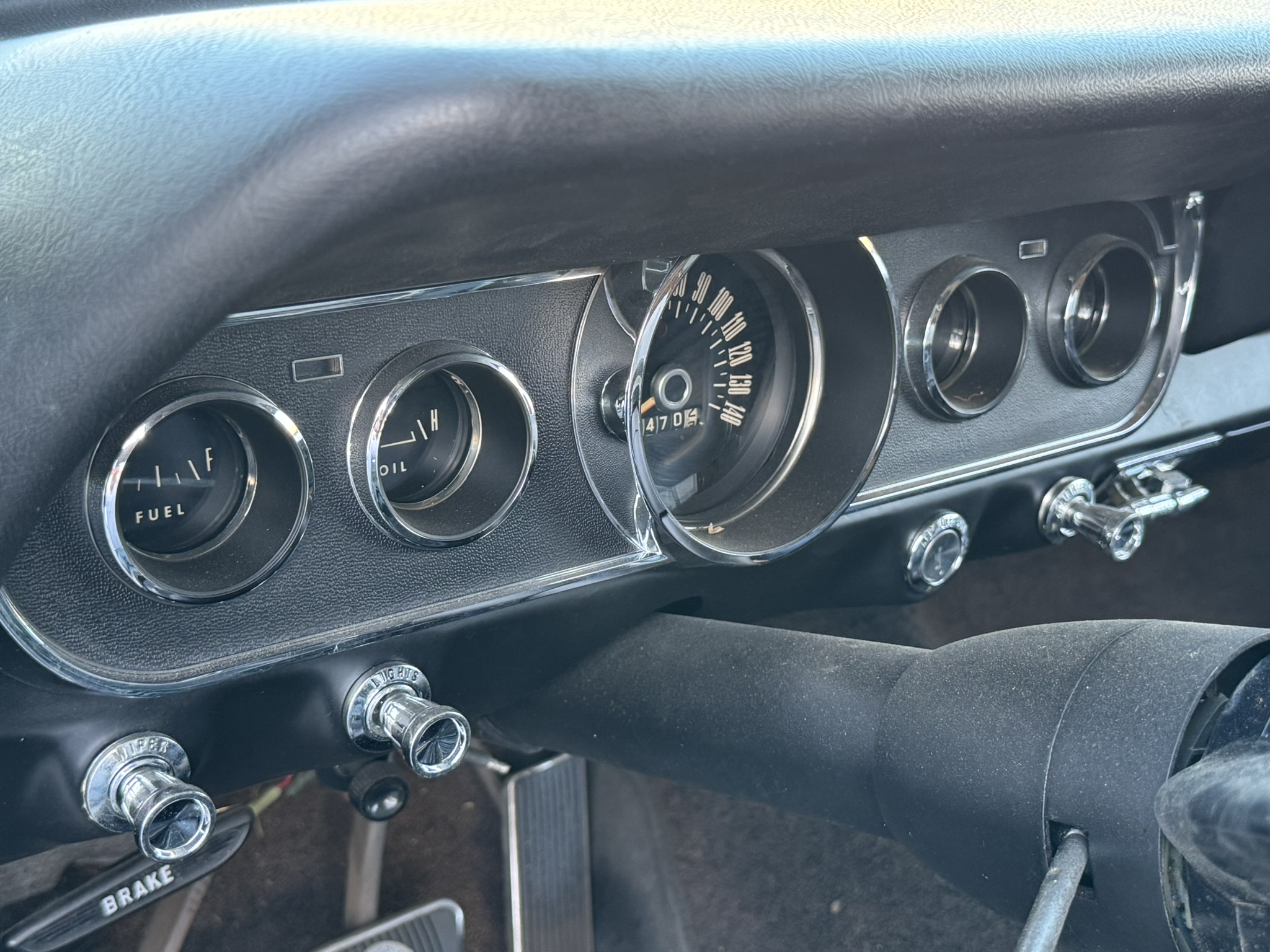 It's uncommon to see a bench seat in a Mustang, but this one has Trim Code 36: Black Vinyl Bench Seat. The matching rear seat is installed along with interior rear side panels. The dash has been updated with a new GT-style gauge bezel and replacement dash pad, which has a couple of flaws. The remaining dash knobs and glove box door are in good condition. The factory wiring harness appears complete and in good condition.