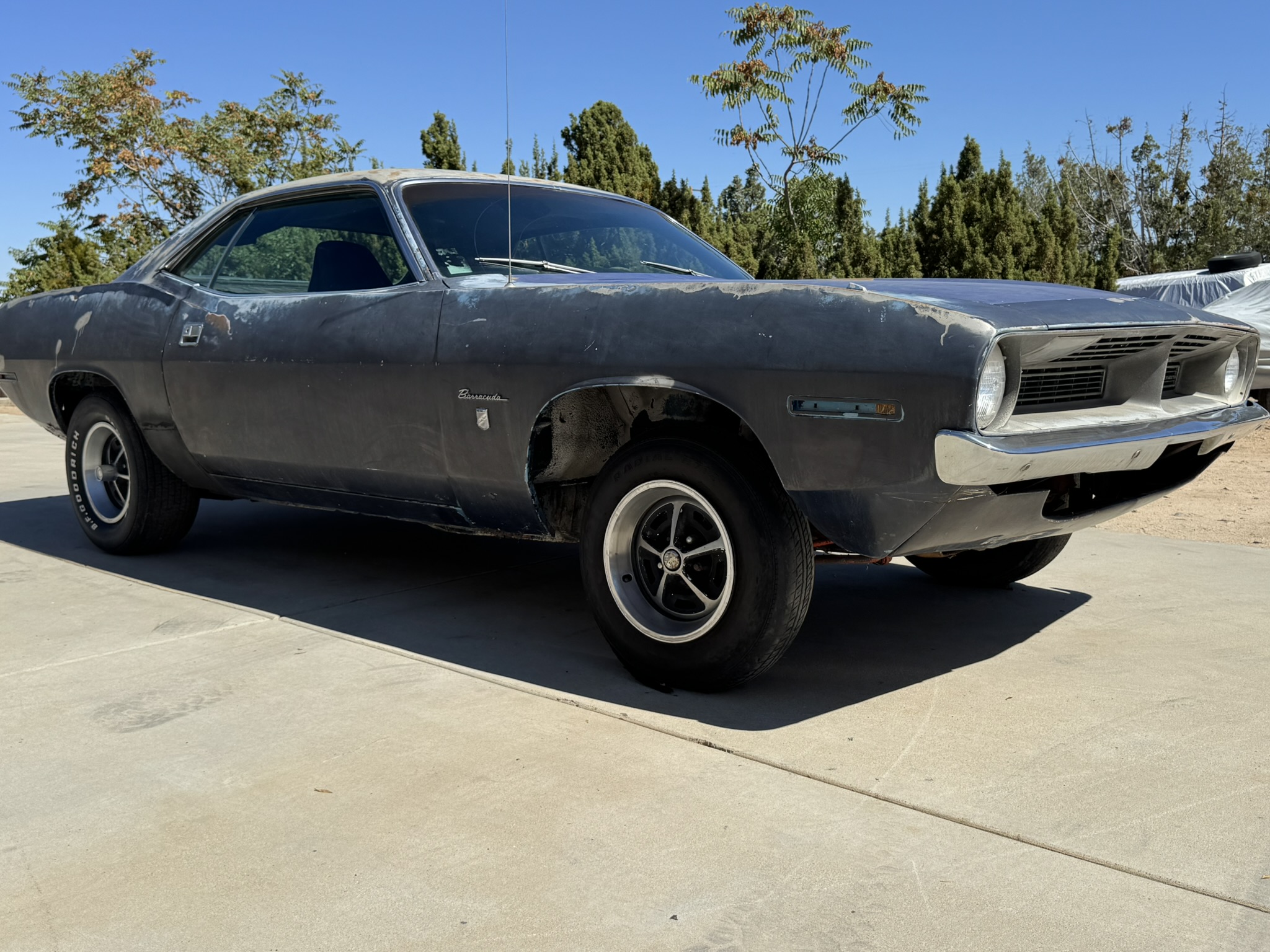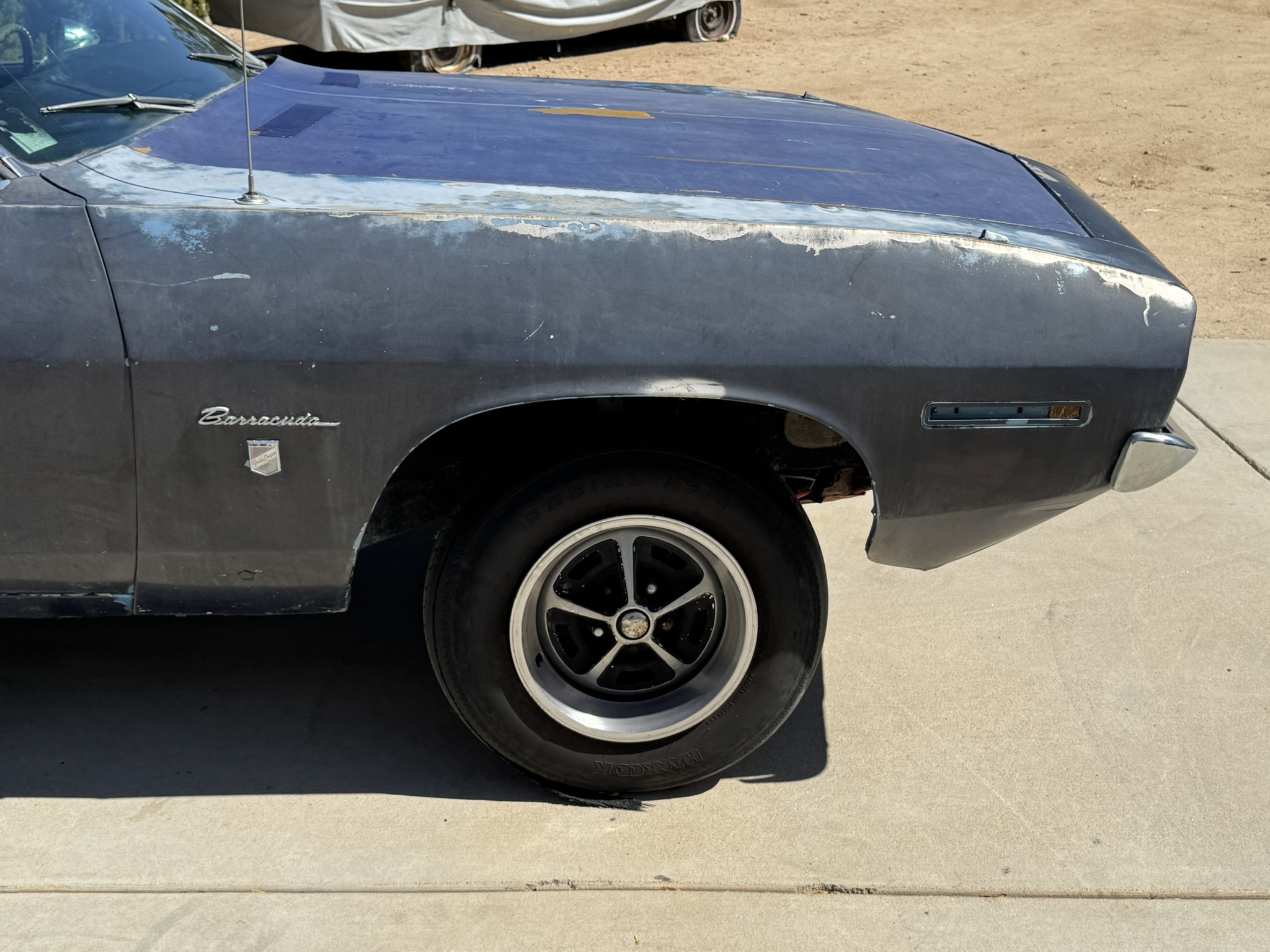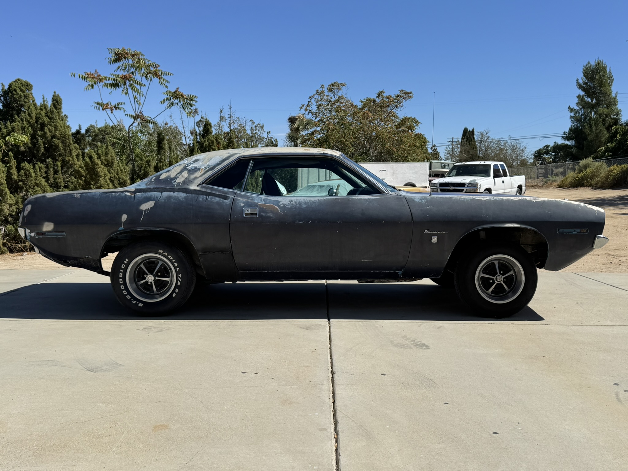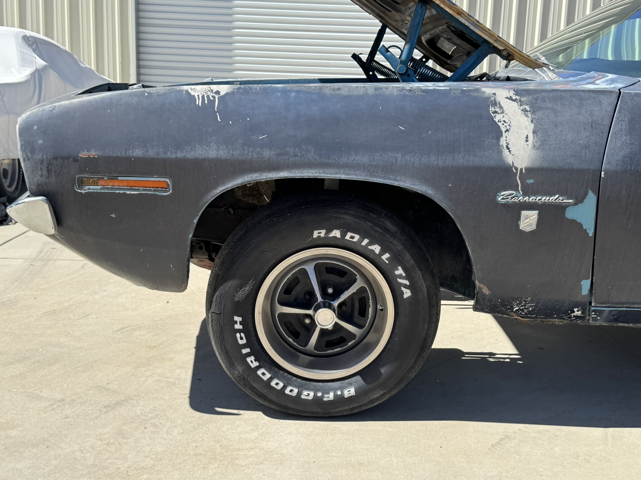 This 1970 Barracuda, VIN BP23C0E131521, came from the factory with a 225ci Slant 6, delivering 145 horsepower, paired with an automatic transmission and an 8 3/4 inch rear axle. The original engine and transmission are missing, making it a rolling chassis ready for your powertrain choice. A V8 K-member with sway bar has been swapped for installation of the supplied 383 or your engine of choice. The 383 4BBL is dated 12/16/1966 and is believed to be the 330 horsepower version. The factory rear suspension is unaltered, while the front suspension was updated from a V8 car. The power steering and Bendix power 11" drum brakes are all in place. The rear axle spins freely, and all chassis components appear unmolested. The factory 14' Styled Road Wheels are in great condition with brushed trim rings in place.