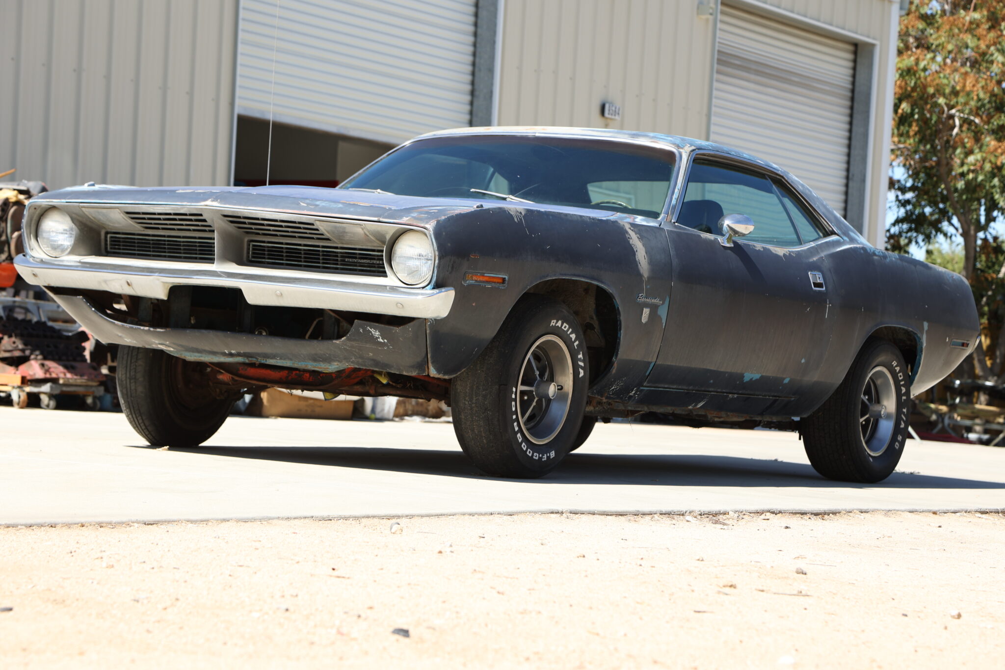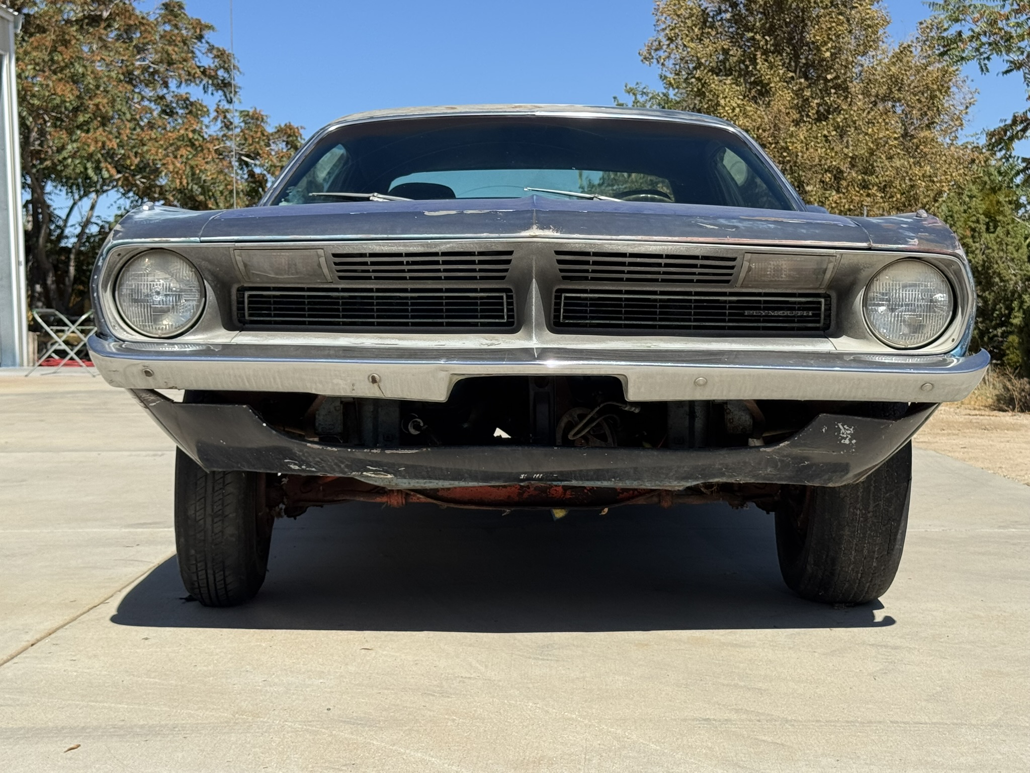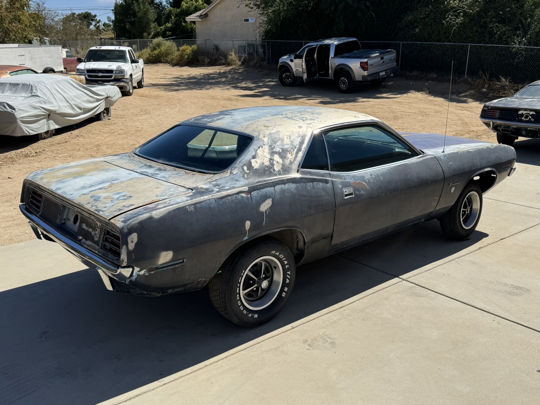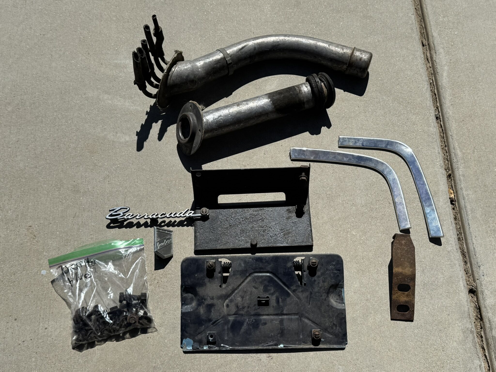 This 1970 Barracuda, VIN BP23C0E131521, came from the factory with a 225ci Slant 6, delivering 145 horsepower, paired with an automatic transmission and an 8 3/4 inch rear axle. The original engine and transmission are missing, making it a rolling chassis ready for your powertrain choice. A V8 K-member with sway bar has been swapped for installation of the supplied 383 or your engine of choice. The 383 4BBL is dated 12/16/1966 and is believed to be the 330 horsepower version. The factory rear suspension is unaltered, while the front suspension was updated from a V8 car. The power steering and Bendix power 11" drum brakes are all in place. The rear axle spins freely, and all chassis components appear unmolested. The factory 14' Styled Road Wheels are in great condition with brushed trim rings in place.