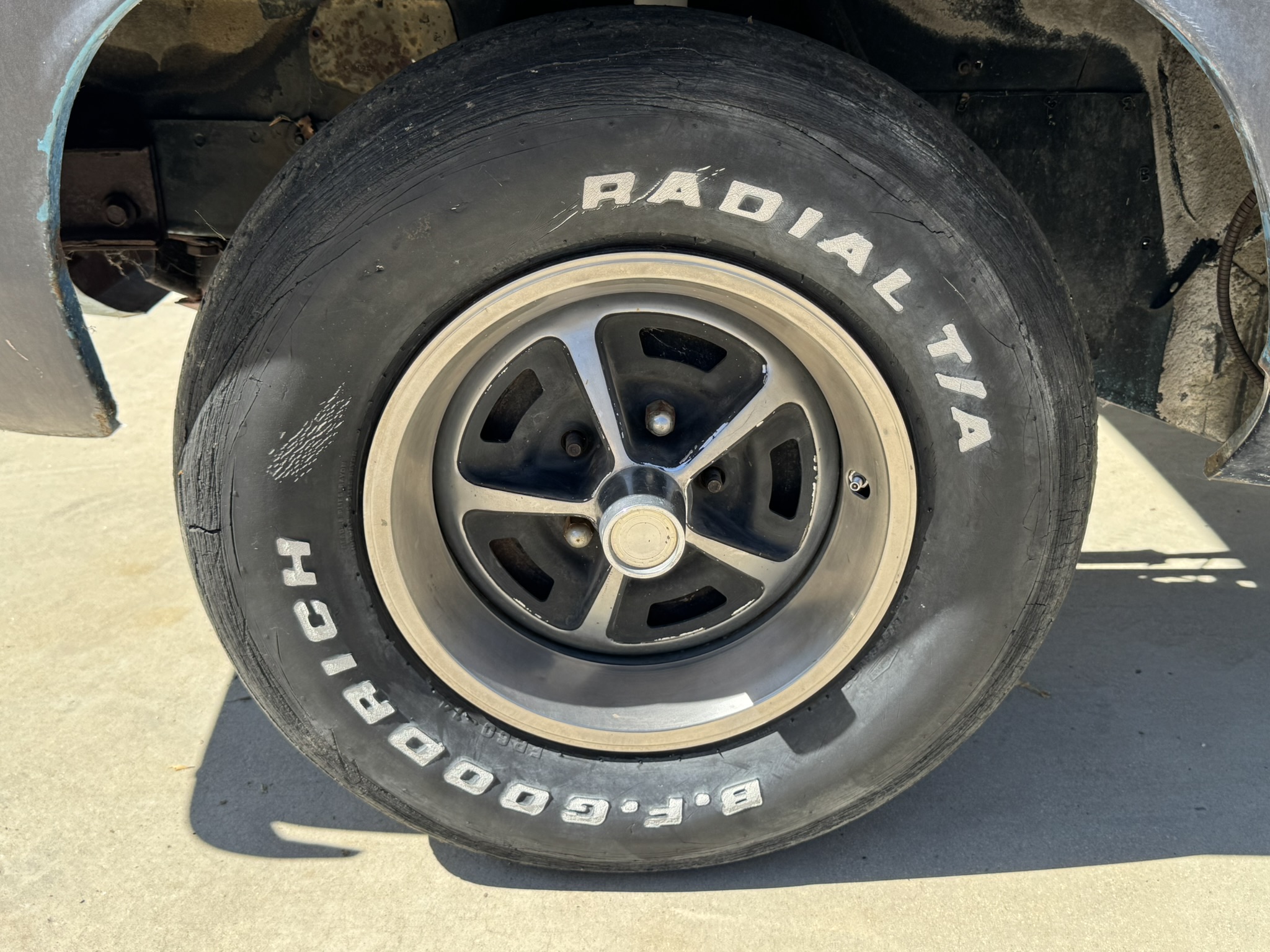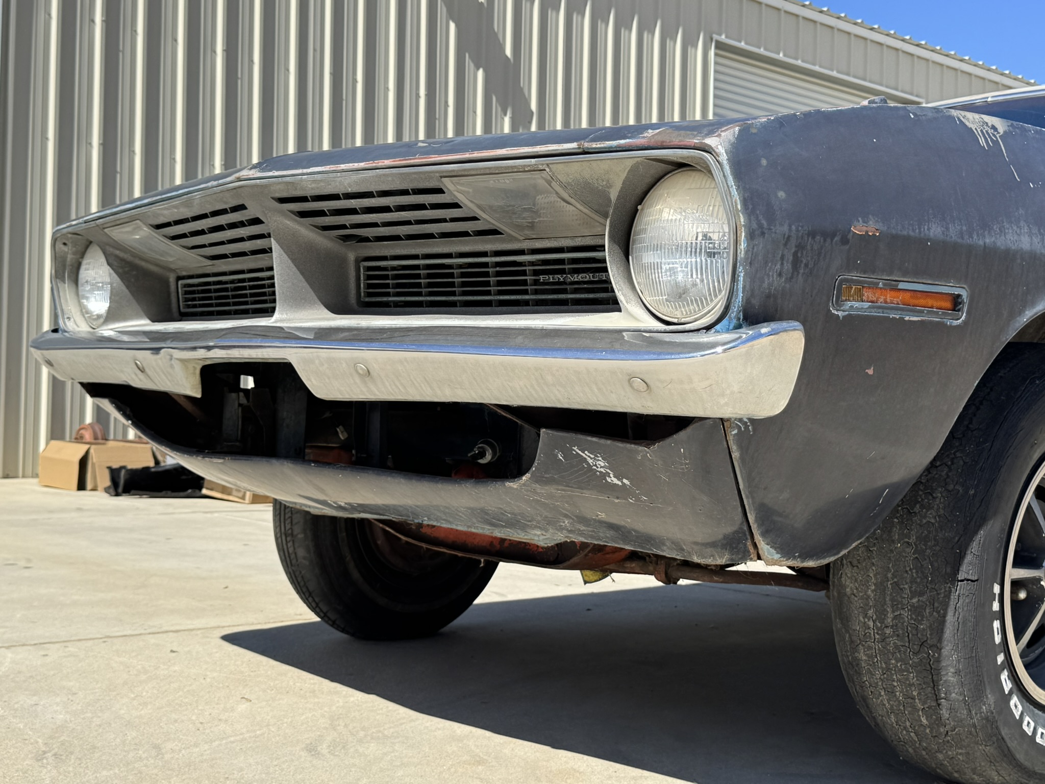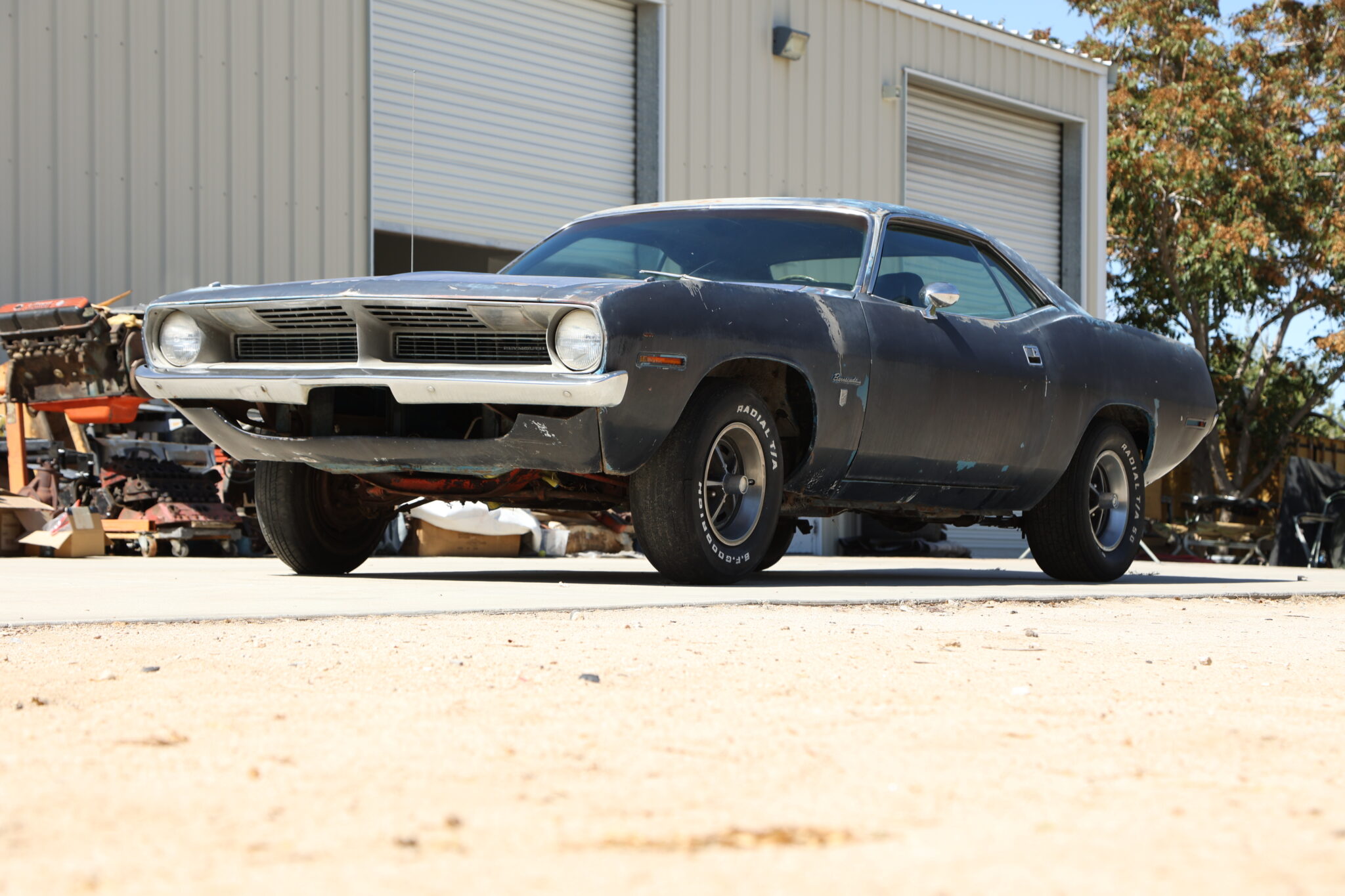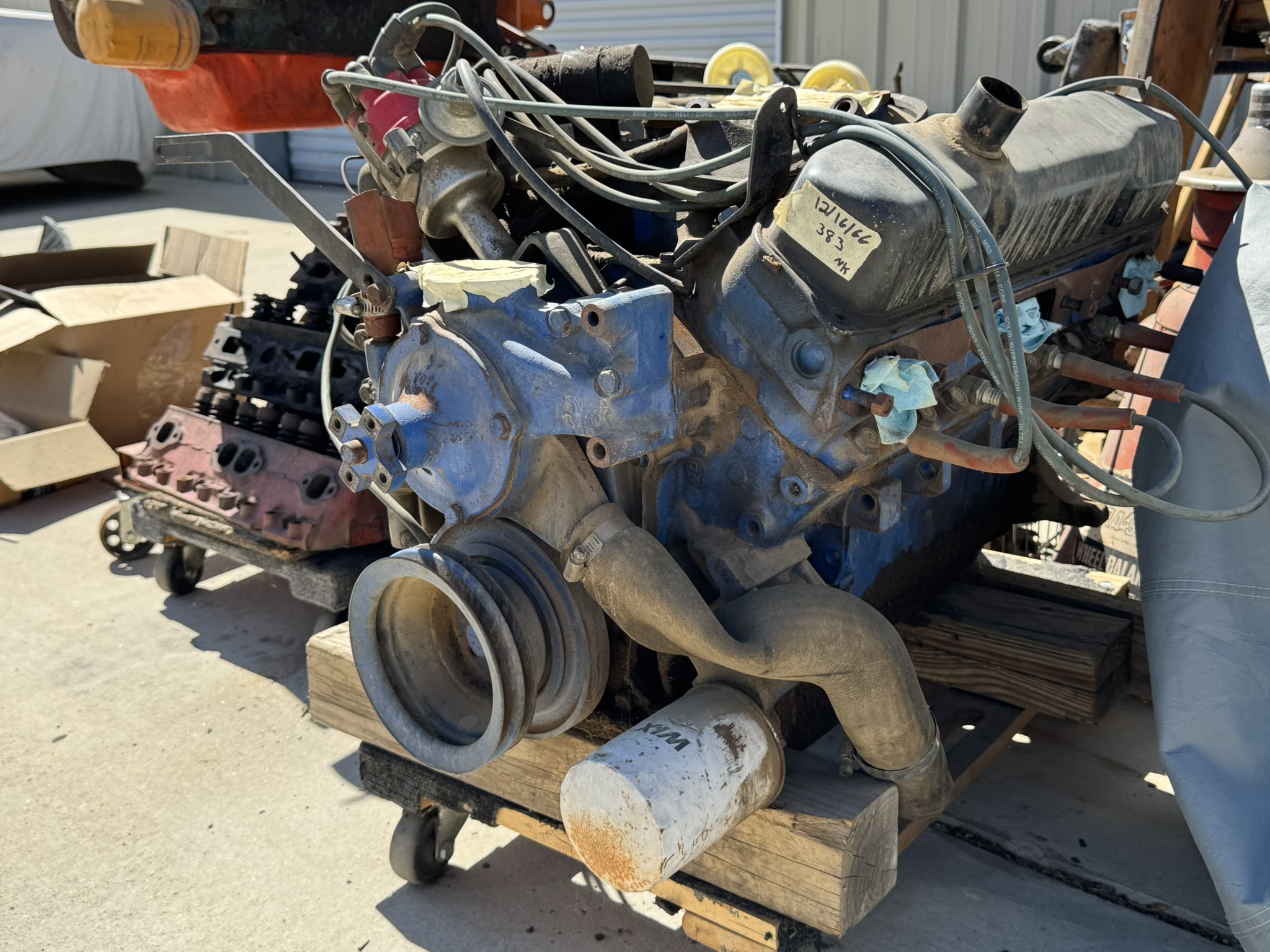 This 1970 Barracuda, VIN BP23C0E131521, came from the factory with a 225ci Slant 6, delivering 145 horsepower, paired with an automatic transmission and an 8 3/4 inch rear axle. The original engine and transmission are missing, making it a rolling chassis ready for your powertrain choice. A V8 K-member with sway bar has been swapped for installation of the supplied 383 or your engine of choice. The 383 4BBL is dated 12/16/1966 and is believed to be the 330 horsepower version. The factory rear suspension is unaltered, while the front suspension was updated from a V8 car. The power steering and Bendix power 11" drum brakes are all in place. The rear axle spins freely, and all chassis components appear unmolested. The factory 14' Styled Road Wheels are in great condition with brushed trim rings in place.