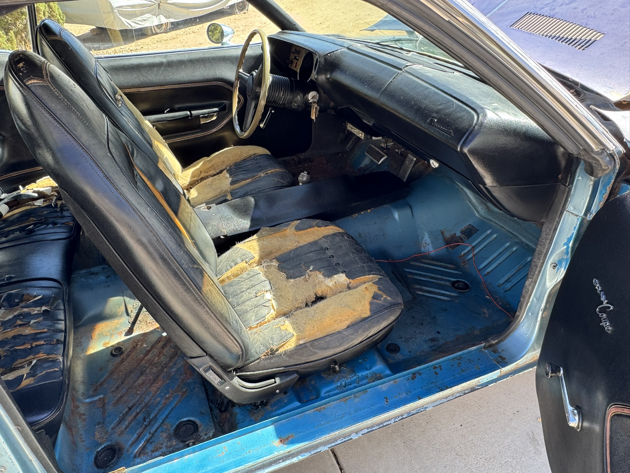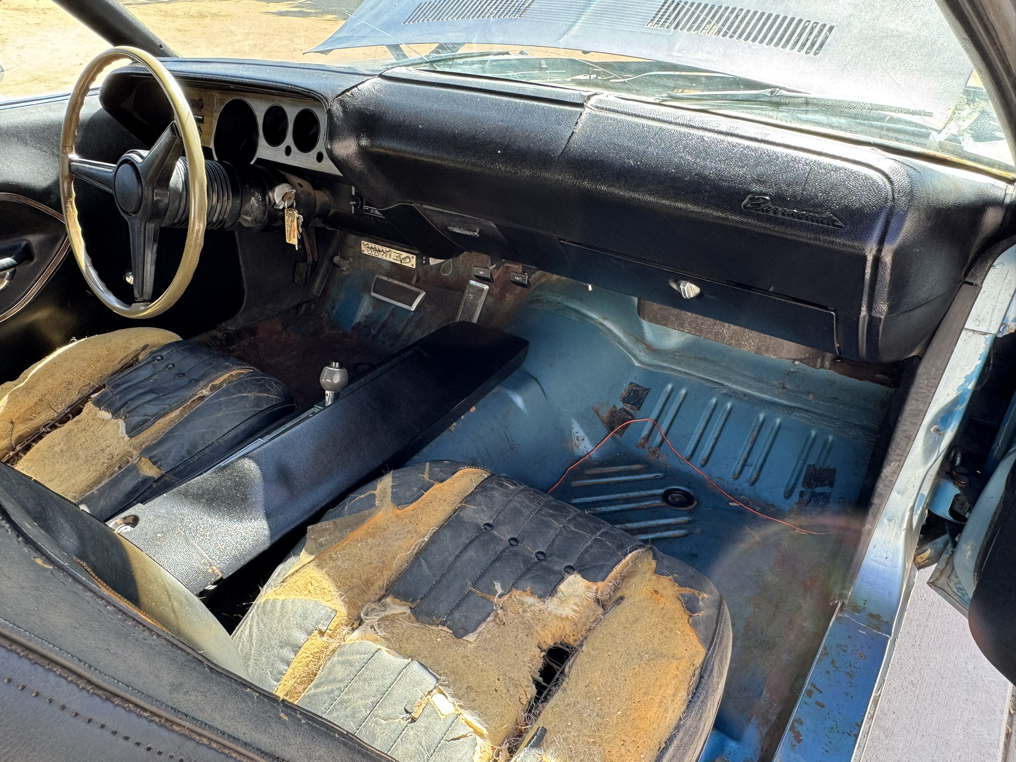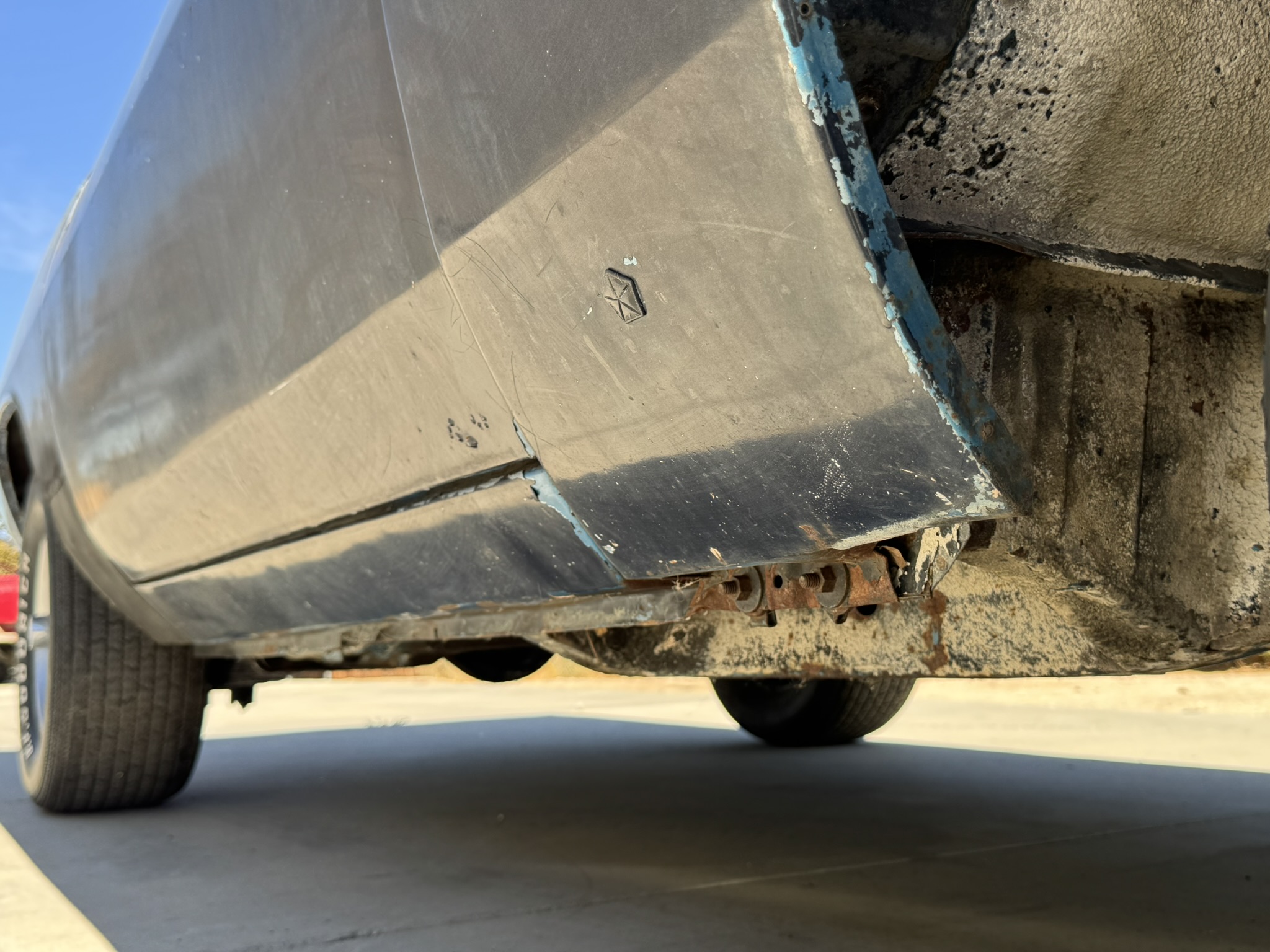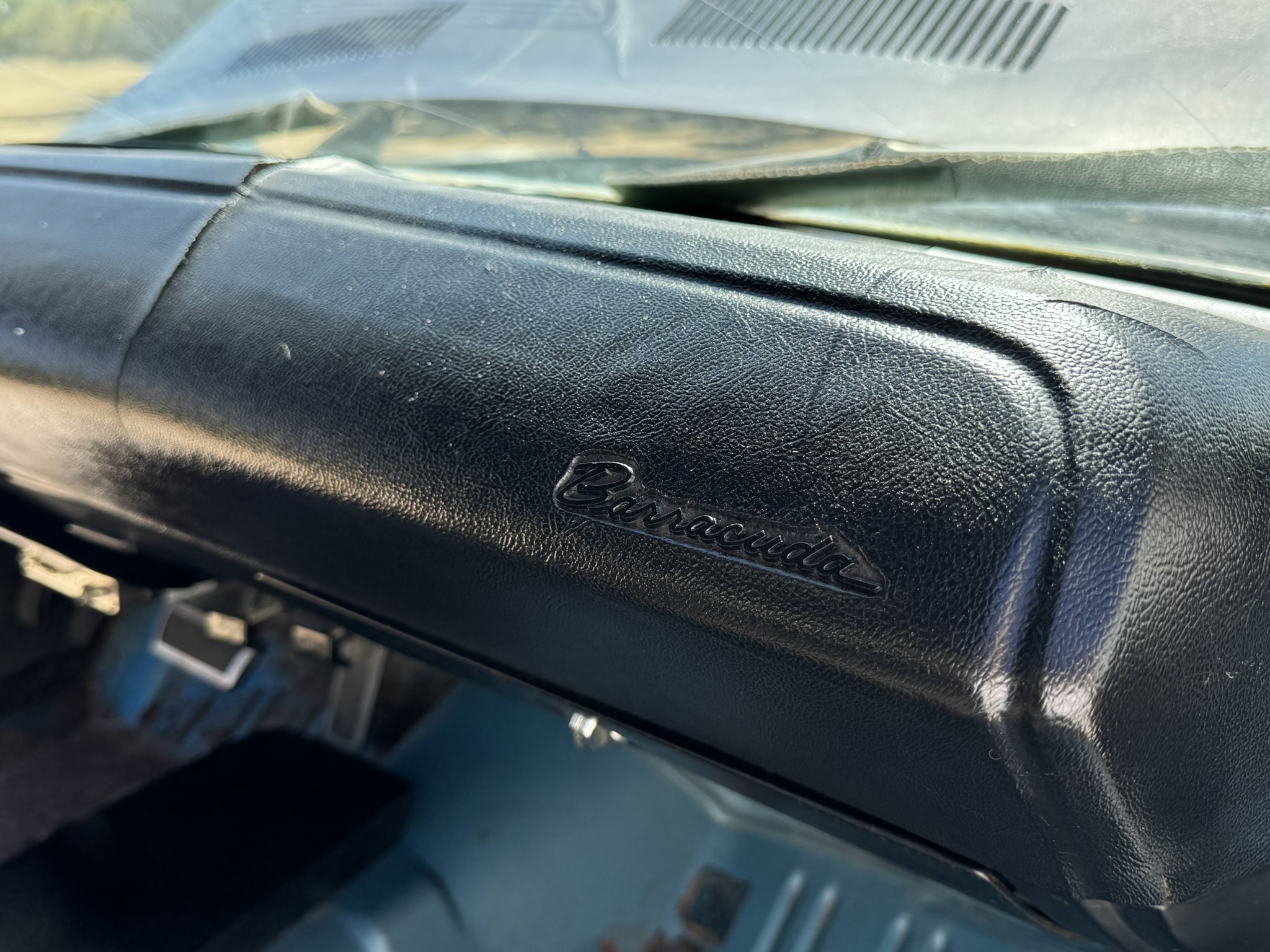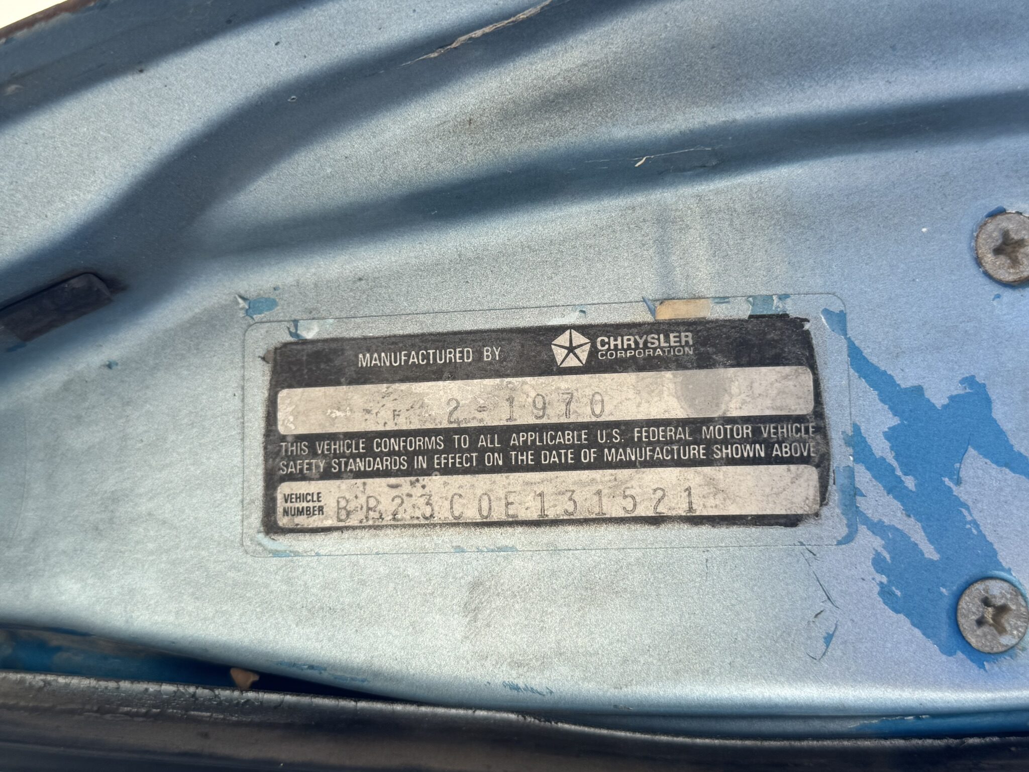 This Los Angeles built 1970 Barracuda Gran Coupe represents the upscale side of Mopar's pony car lineup. The Gran Coupe package elevated the Barracuda with luxury touches like leather seat inserts, dual consoles, woodgrain accents, and distinctive exterior badging that set it apart from standard models. This rolling chassis comes complete with a 383ci V8 that was pulled from a running car, ready to transform this six-cylinder luxury cruiser into a proper muscle machine. The original B5 Bright Blue Poly paint still shows throughout the engine bay, floors, and body panels, telling the story of its factory-correct heritage. The factory fender tag is present with the rarely seen inspection tag still underneath, appearing to have never been off the car.