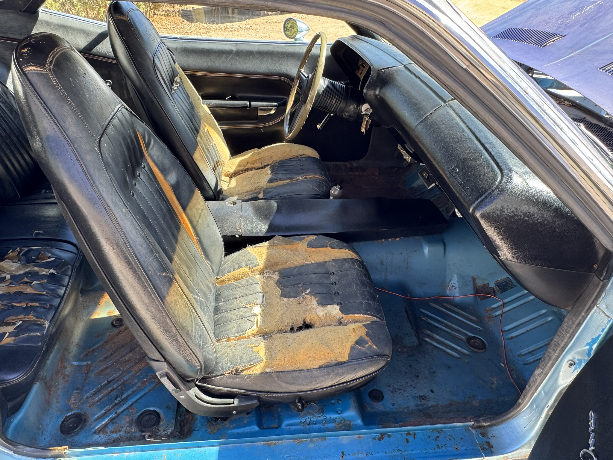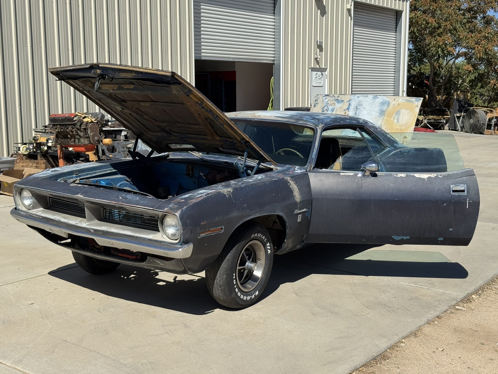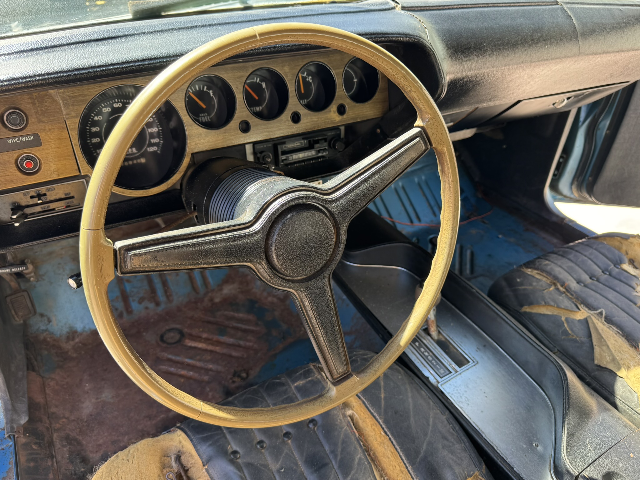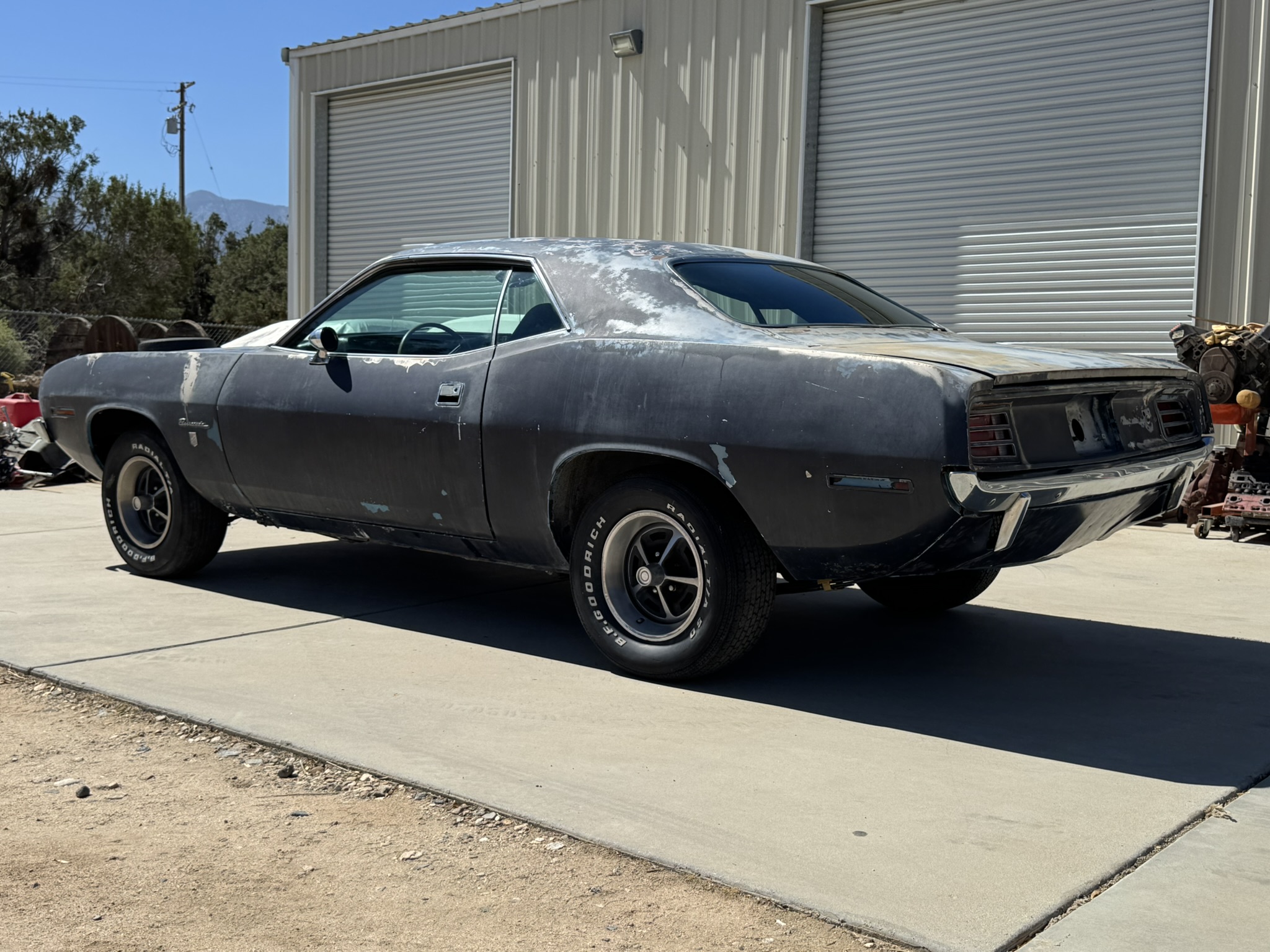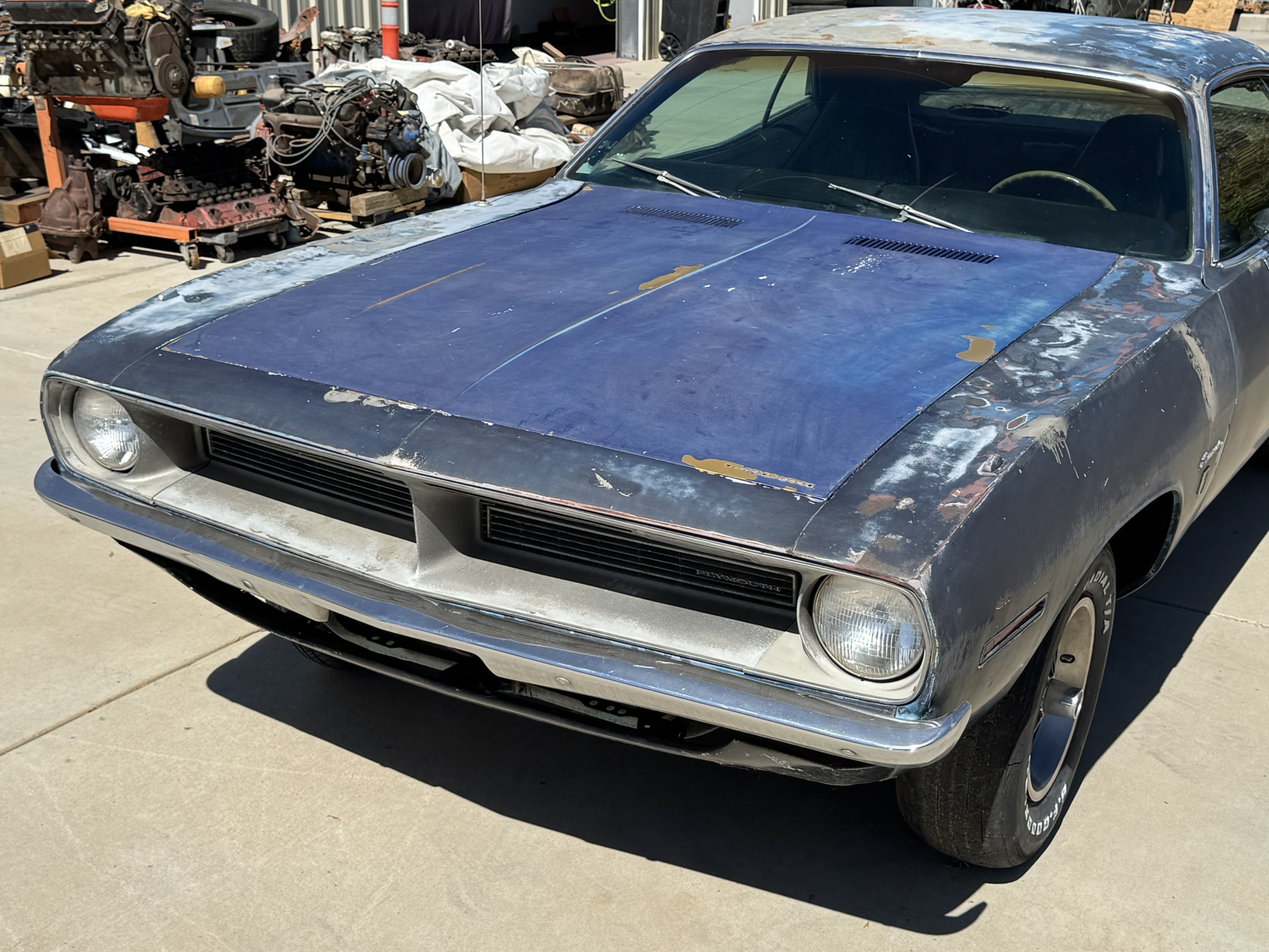 This Los Angeles built 1970 Barracuda Gran Coupe represents the upscale side of Mopar's pony car lineup. The Gran Coupe package elevated the Barracuda with luxury touches like leather seat inserts, dual consoles, woodgrain accents, and distinctive exterior badging that set it apart from standard models. This rolling chassis comes complete with a 383ci V8 that was pulled from a running car, ready to transform this six-cylinder luxury cruiser into a proper muscle machine. The original B5 Bright Blue Poly paint still shows throughout the engine bay, floors, and body panels, telling the story of its factory-correct heritage. The factory fender tag is present with the rarely seen inspection tag still underneath, appearing to have never been off the car.