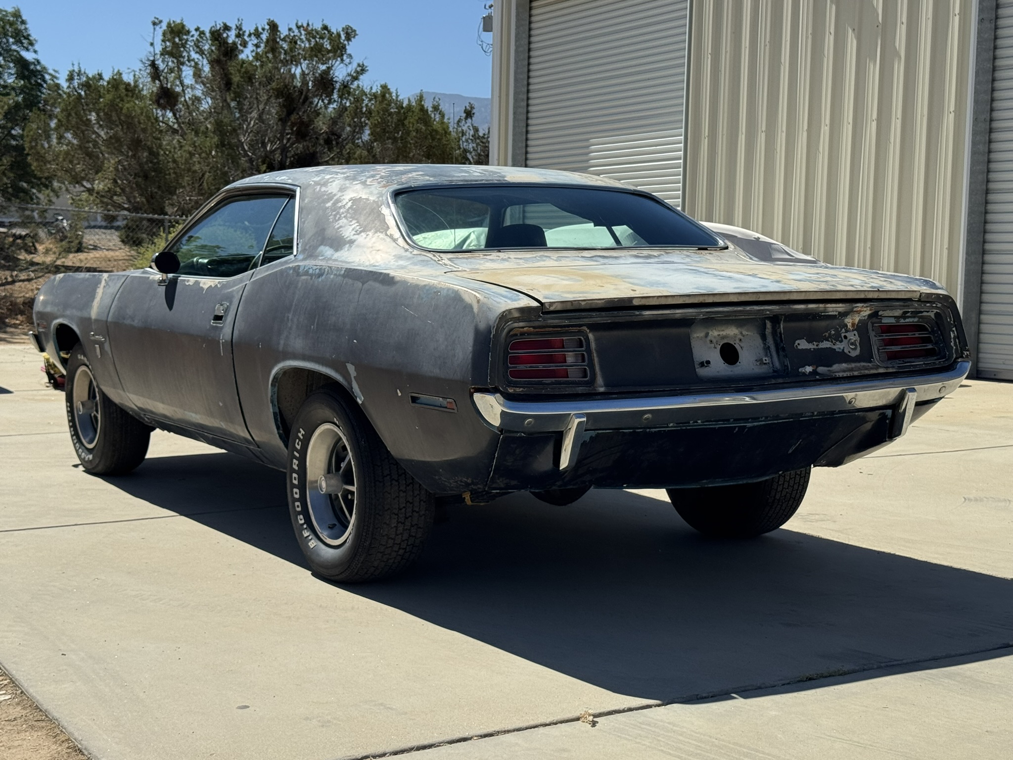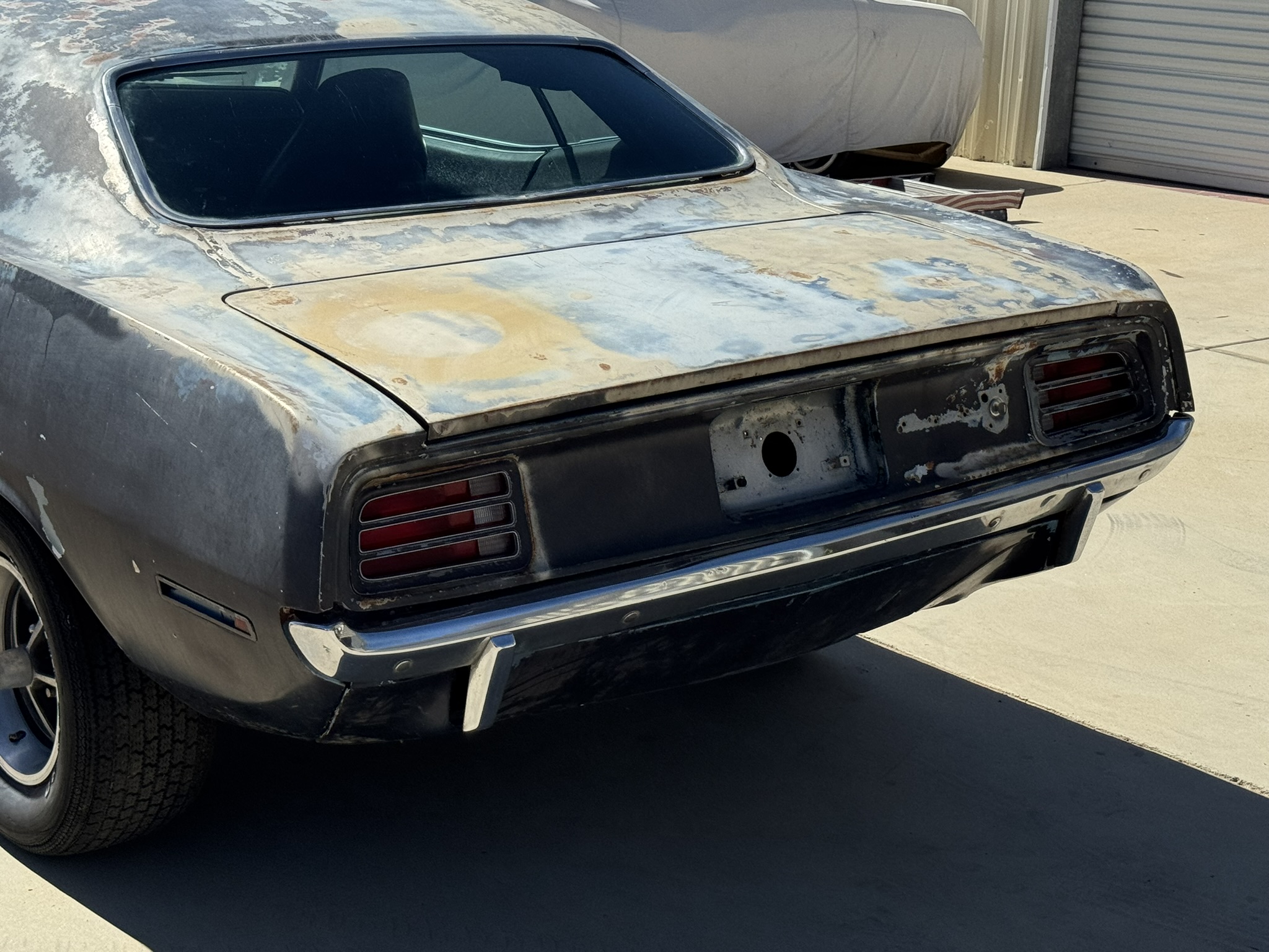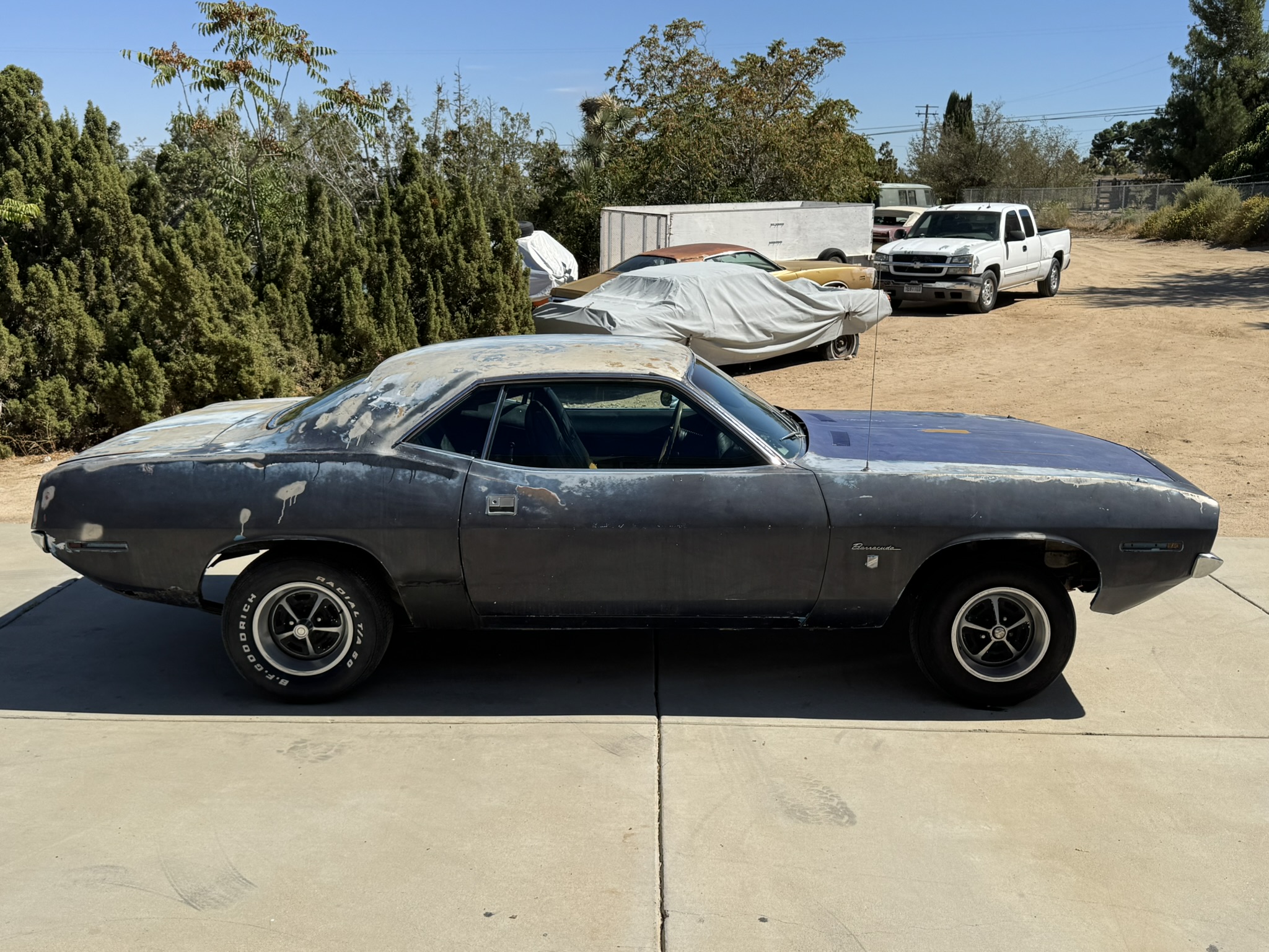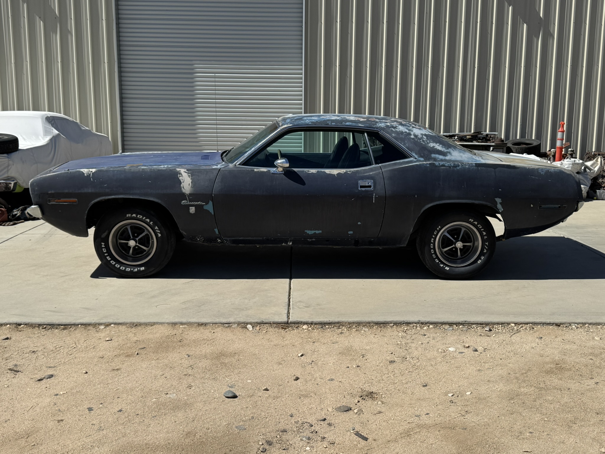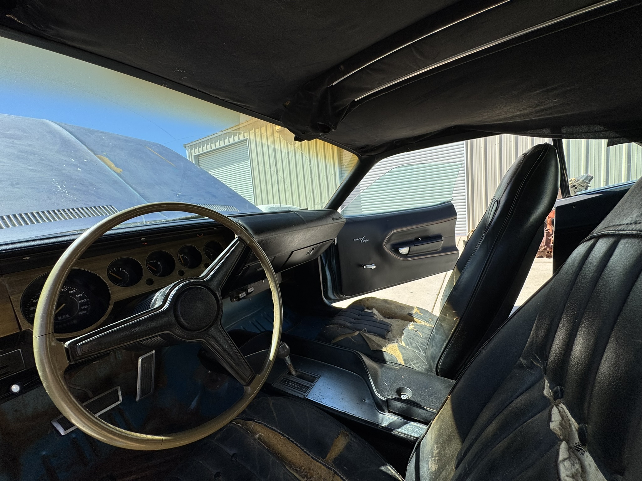 This Los Angeles built 1970 Barracuda Gran Coupe represents the upscale side of Mopar's pony car lineup. The Gran Coupe package elevated the Barracuda with luxury touches like leather seat inserts, dual consoles, woodgrain accents, and distinctive exterior badging that set it apart from standard models. This rolling chassis comes complete with a 383ci V8 that was pulled from a running car, ready to transform this six-cylinder luxury cruiser into a proper muscle machine. The original B5 Bright Blue Poly paint still shows throughout the engine bay, floors, and body panels, telling the story of its factory-correct heritage. The factory fender tag is present with the rarely seen inspection tag still underneath, appearing to have never been off the car.
