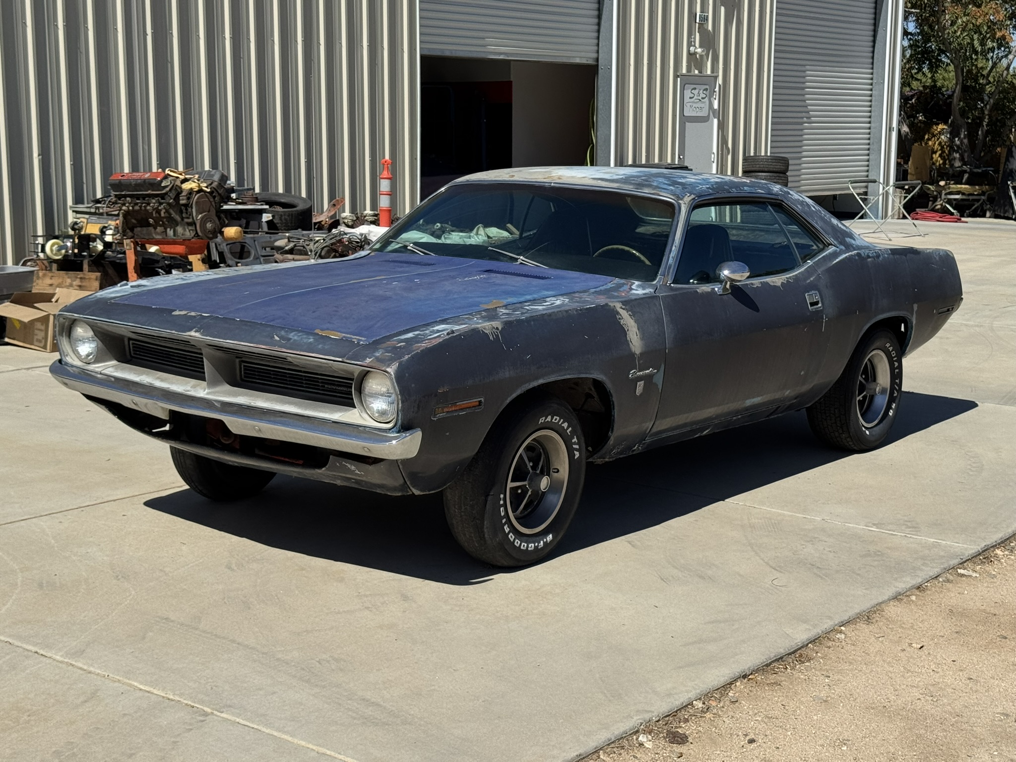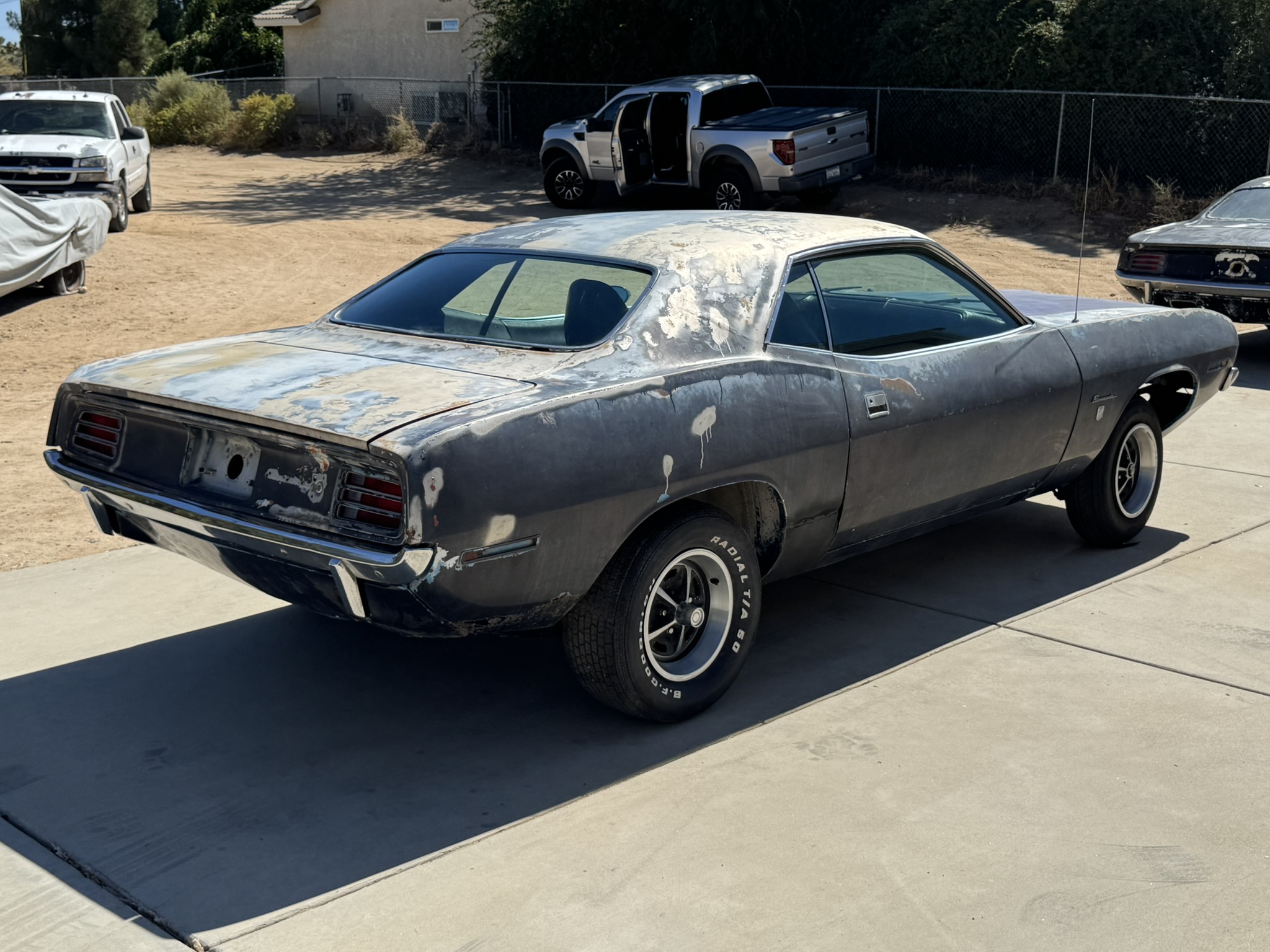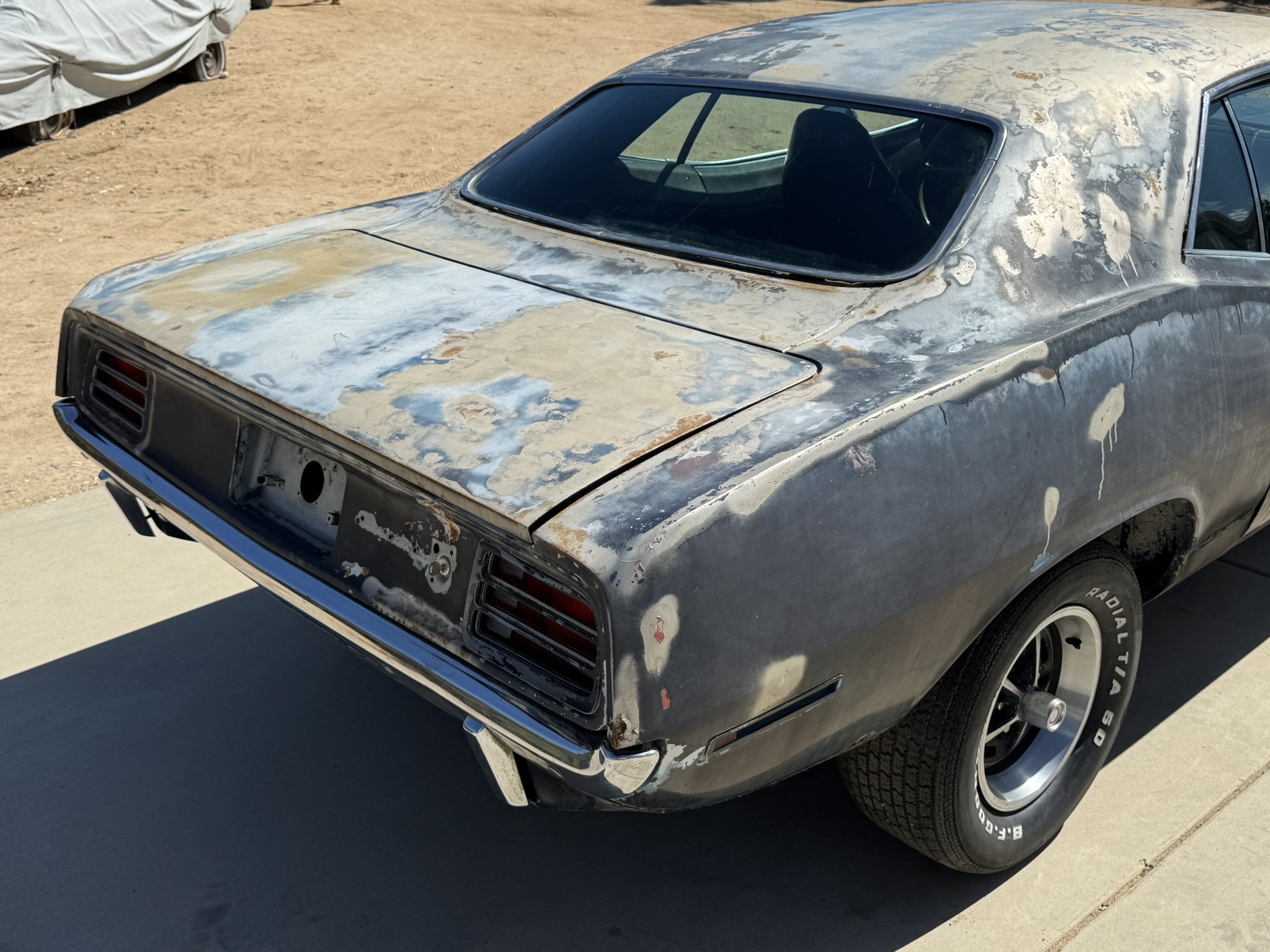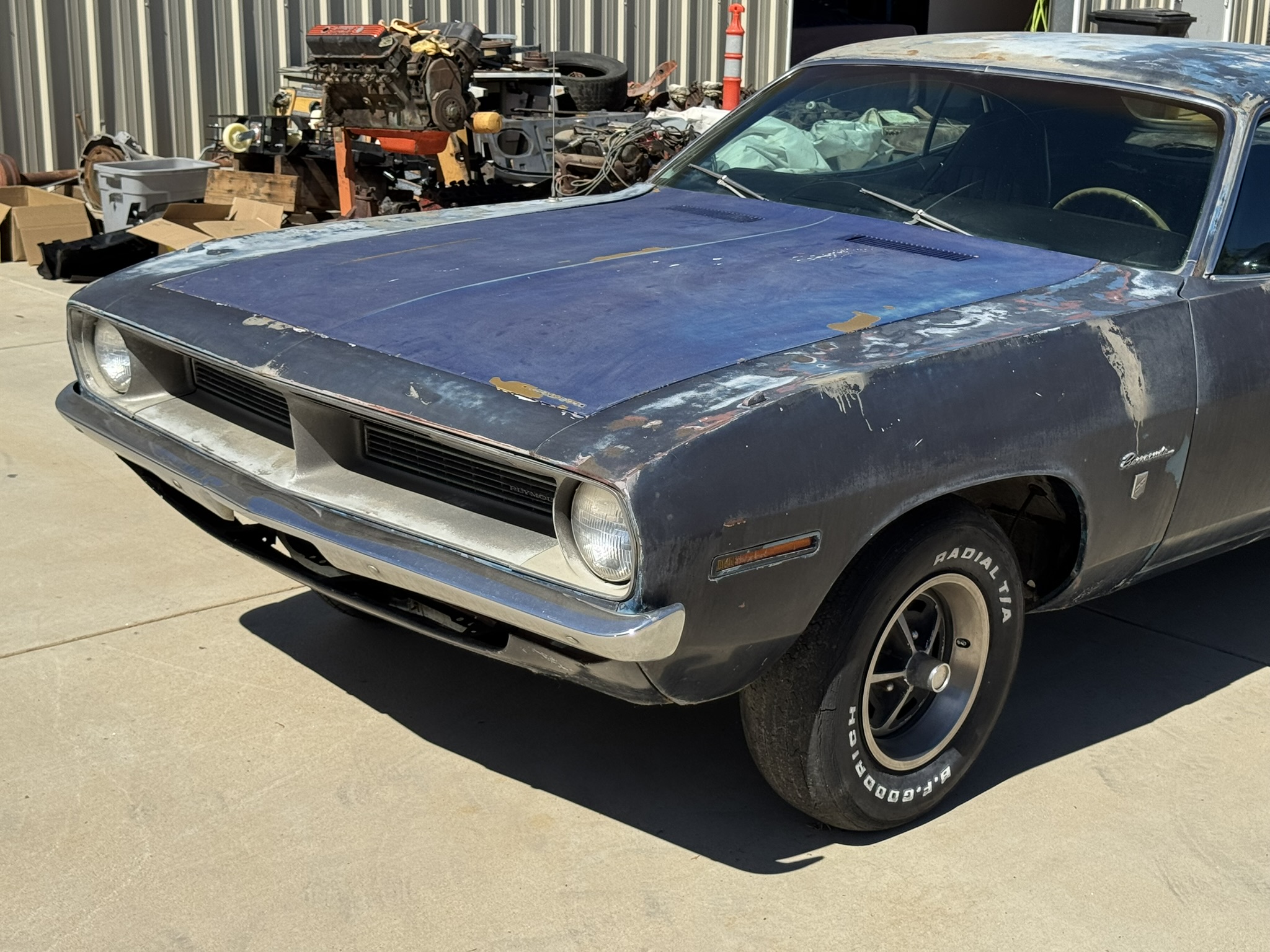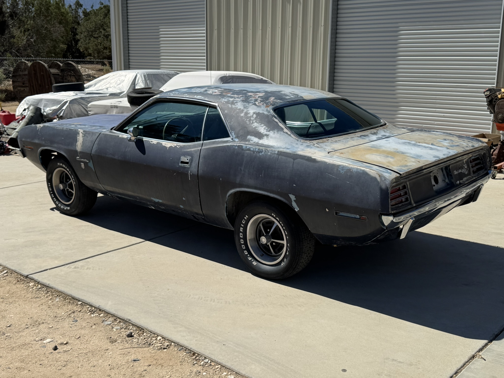 This Los Angeles built 1970 Barracuda Gran Coupe represents the upscale side of Mopar's pony car lineup. The Gran Coupe package elevated the Barracuda with luxury touches like leather seat inserts, dual consoles, woodgrain accents, and distinctive exterior badging that set it apart from standard models. This rolling chassis comes complete with a 383ci V8 that was pulled from a running car, ready to transform this six-cylinder luxury cruiser into a proper muscle machine. The original B5 Bright Blue Poly paint still shows throughout the engine bay, floors, and body panels, telling the story of its factory-correct heritage. The factory fender tag is present with the rarely seen inspection tag still underneath, appearing to have never been off the car.