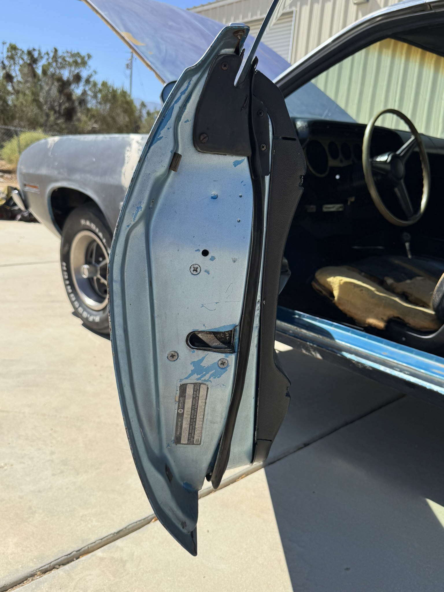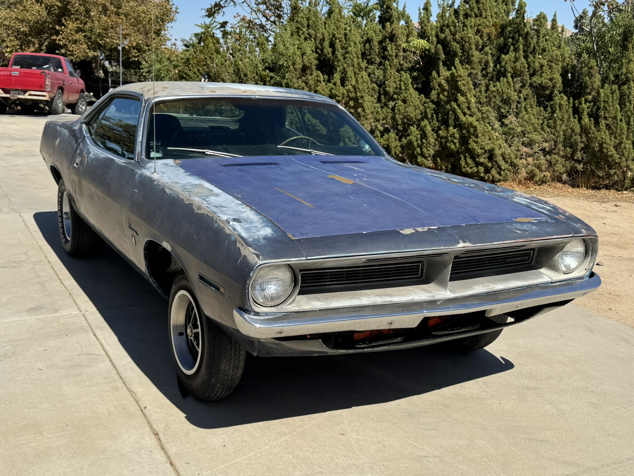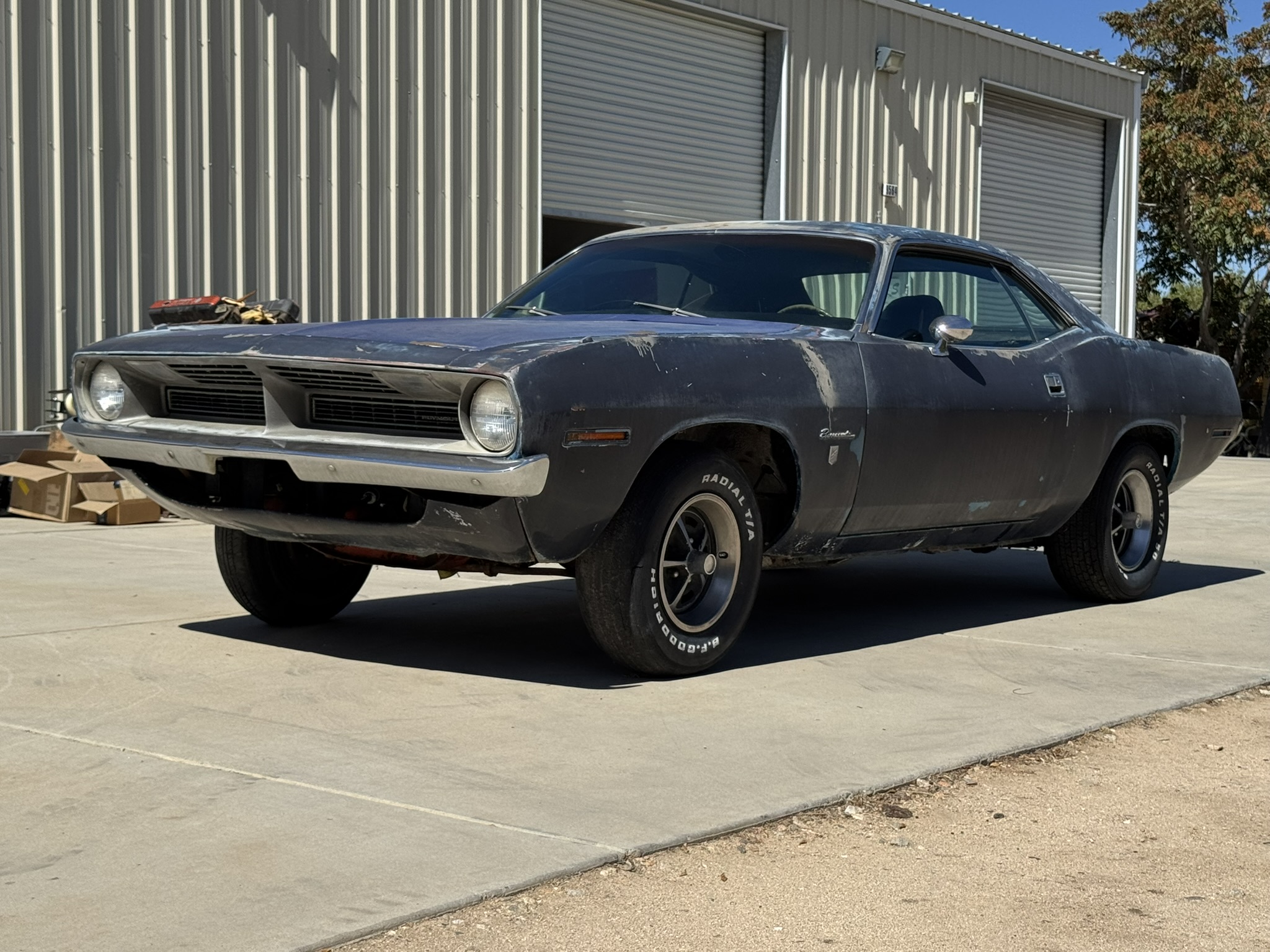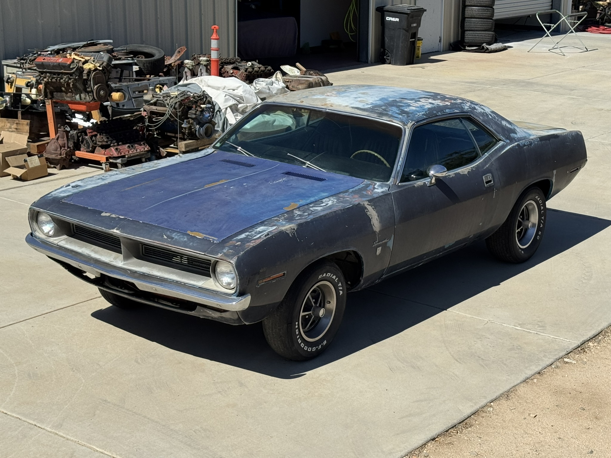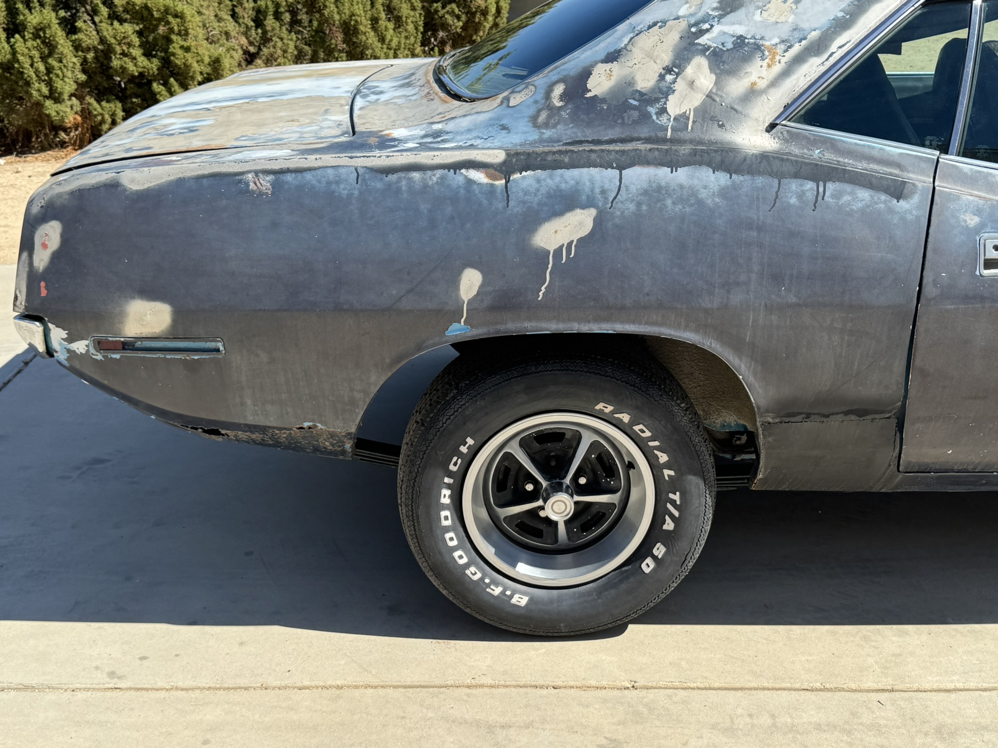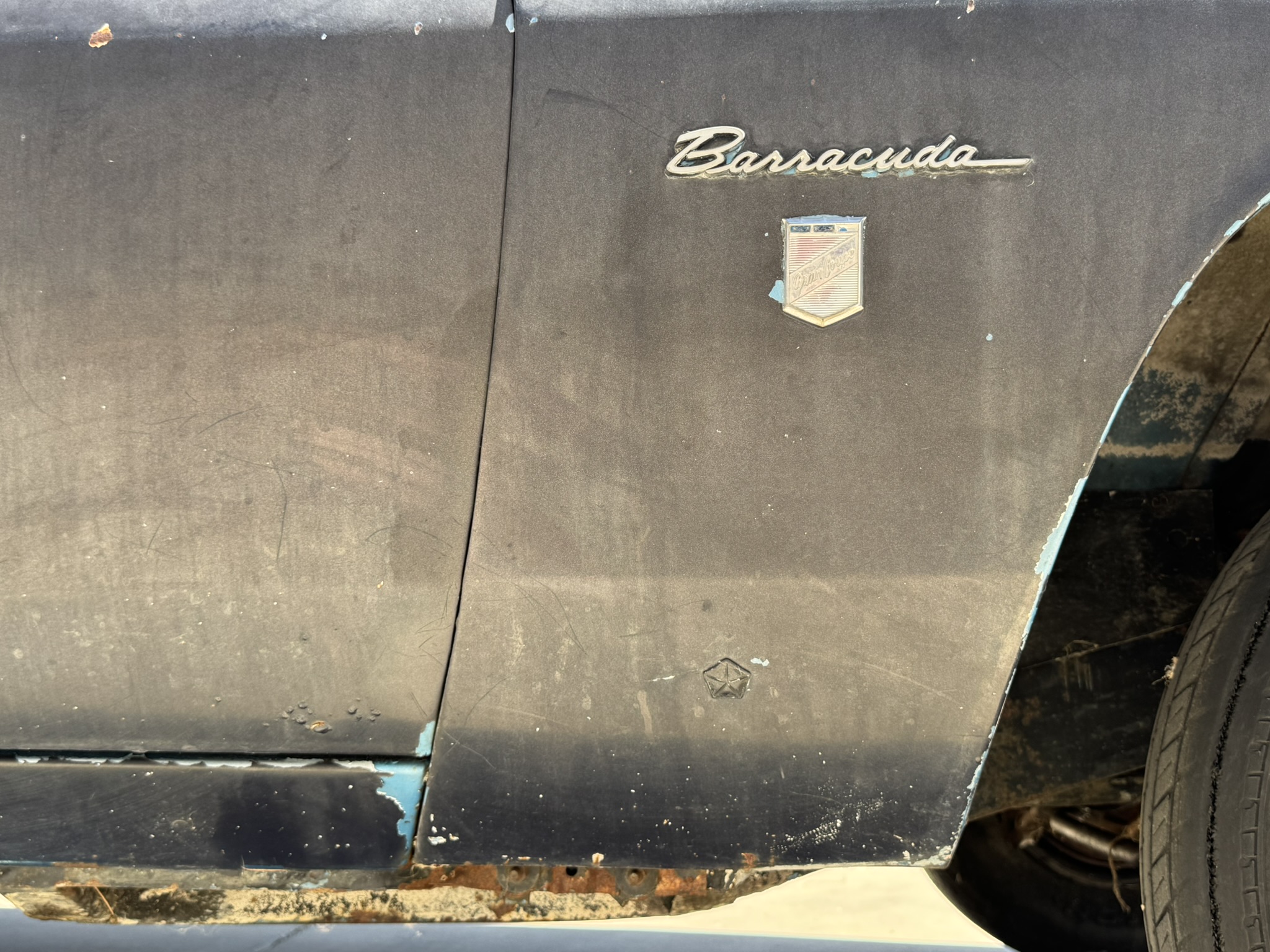 This Los Angeles built 1970 Barracuda Gran Coupe represents the upscale side of Mopar's pony car lineup. The Gran Coupe package elevated the Barracuda with luxury touches like leather seat inserts, dual consoles, woodgrain accents, and distinctive exterior badging that set it apart from standard models. This rolling chassis comes complete with a 383ci V8 that was pulled from a running car, ready to transform this six-cylinder luxury cruiser into a proper muscle machine. The original B5 Bright Blue Poly paint still shows throughout the engine bay, floors, and body panels, telling the story of its factory-correct heritage. The factory fender tag is present with the rarely seen inspection tag still underneath, appearing to have never been off the car.