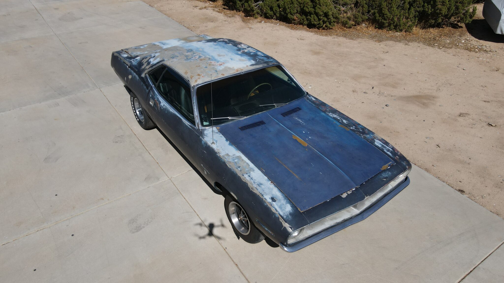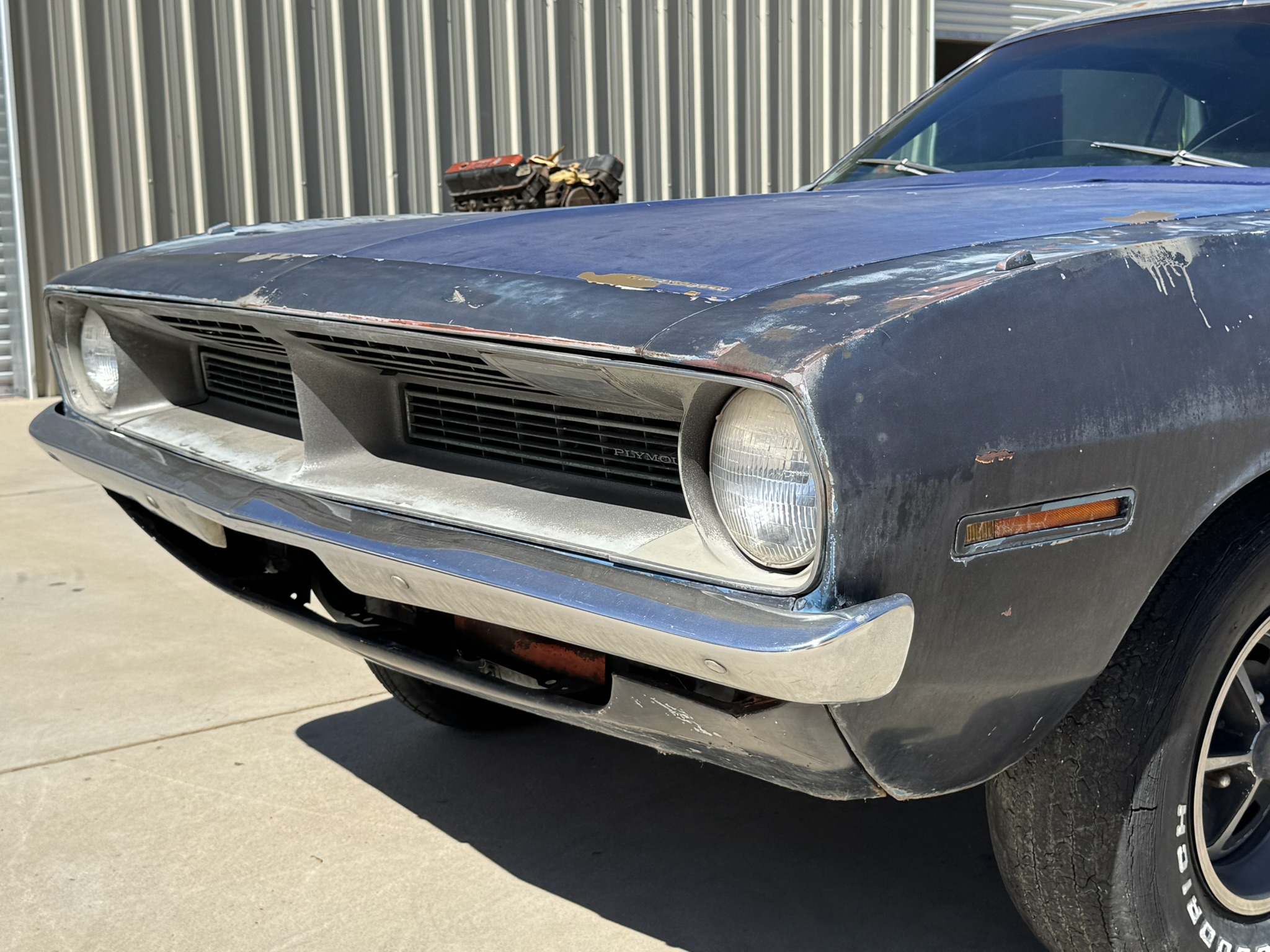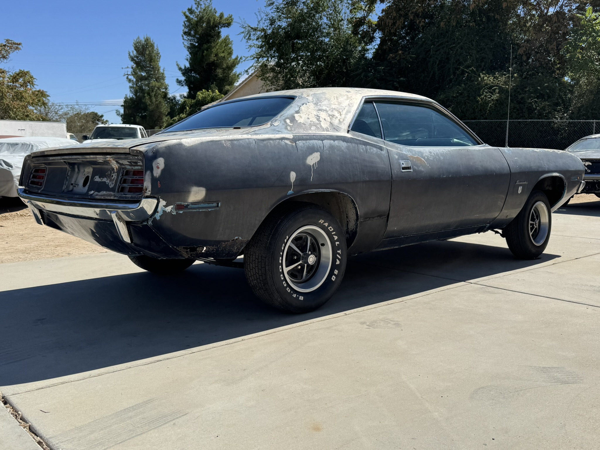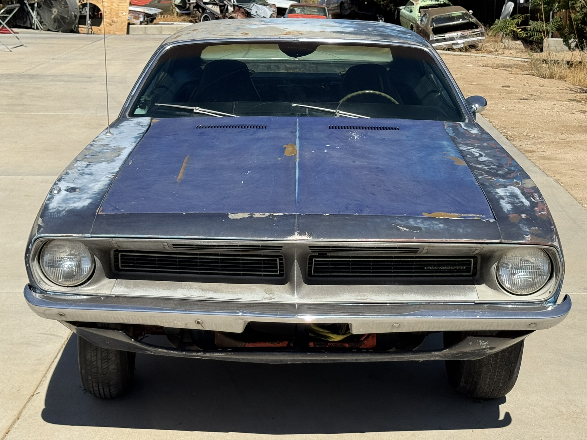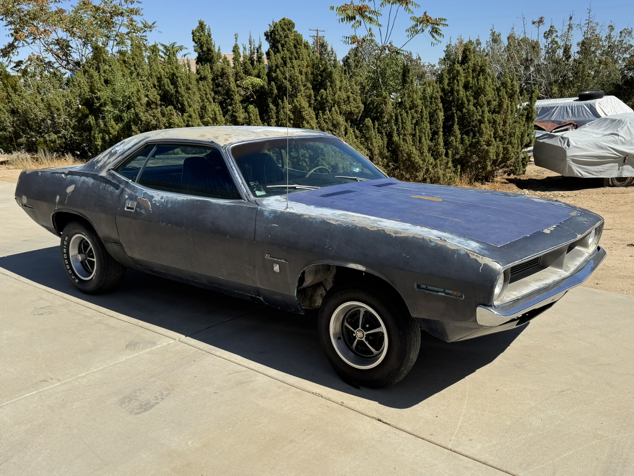 This Los Angeles built 1970 Barracuda Gran Coupe represents the upscale side of Mopar's pony car lineup. The Gran Coupe package elevated the Barracuda with luxury touches like leather seat inserts, dual consoles, woodgrain accents, and distinctive exterior badging that set it apart from standard models. This rolling chassis comes complete with a 383ci V8 that was pulled from a running car, ready to transform this six-cylinder luxury cruiser into a proper muscle machine. The original B5 Bright Blue Poly paint still shows throughout the engine bay, floors, and body panels, telling the story of its factory-correct heritage. The factory fender tag is present with the rarely seen inspection tag still underneath, appearing to have never been off the car.