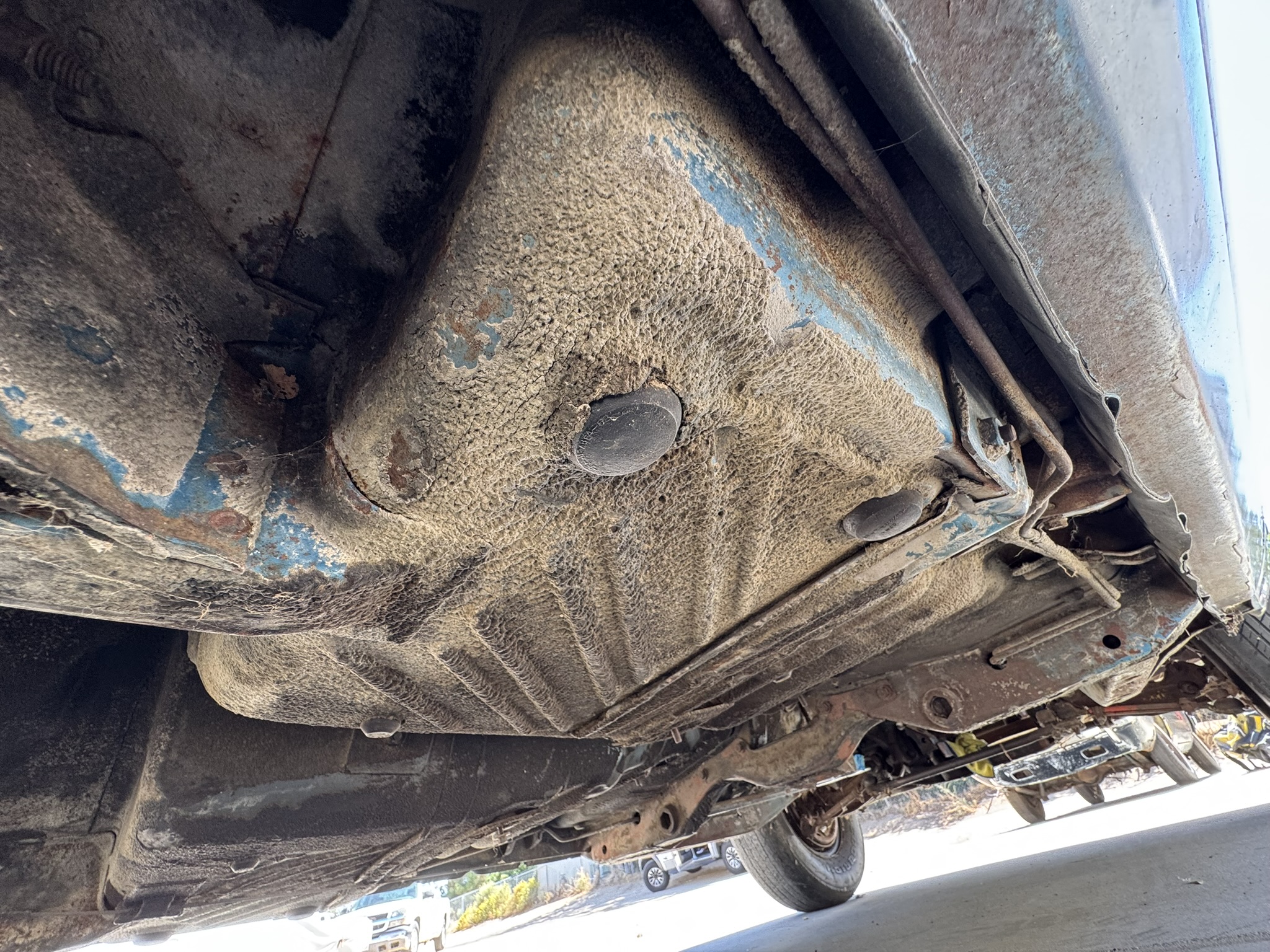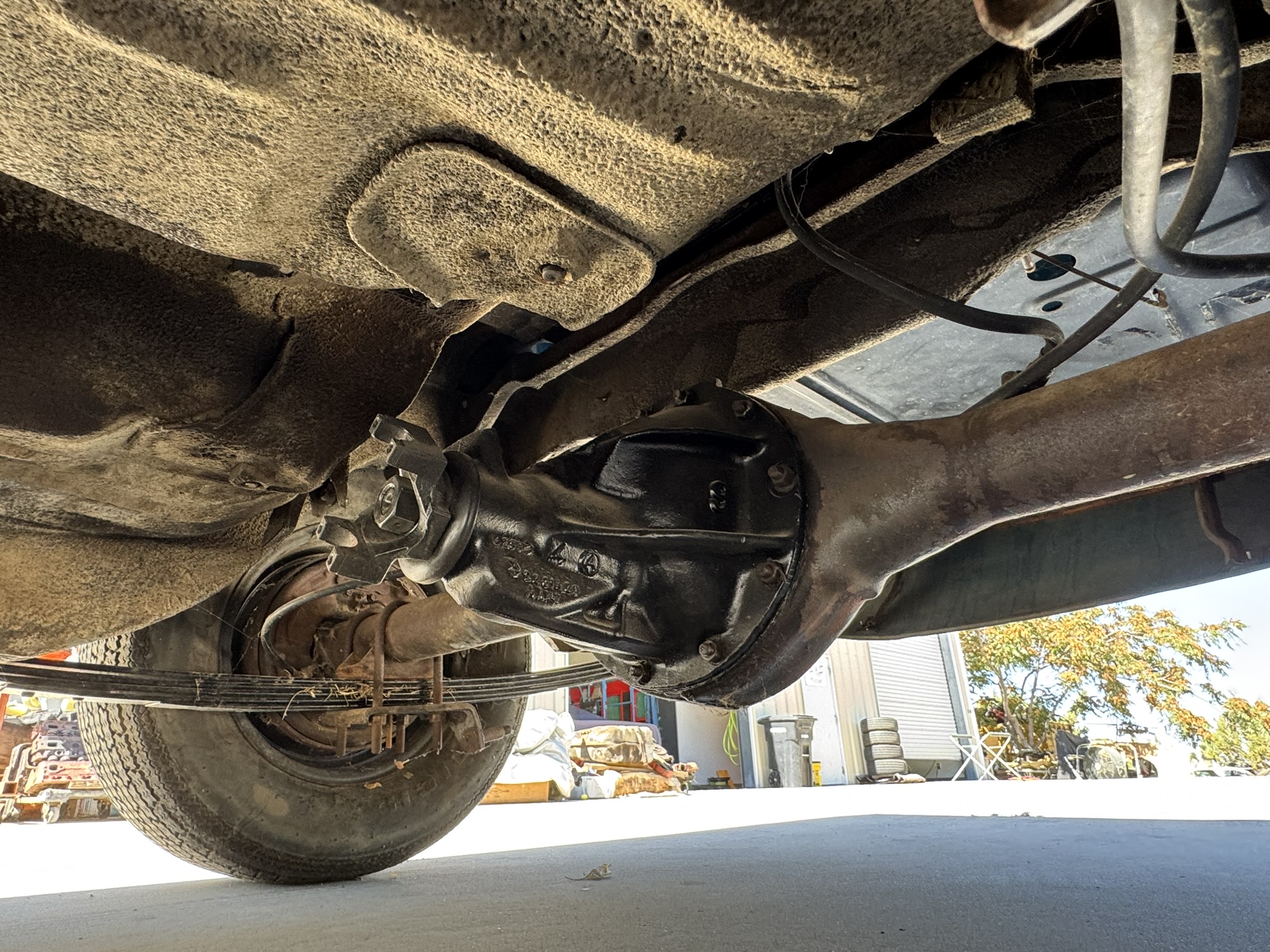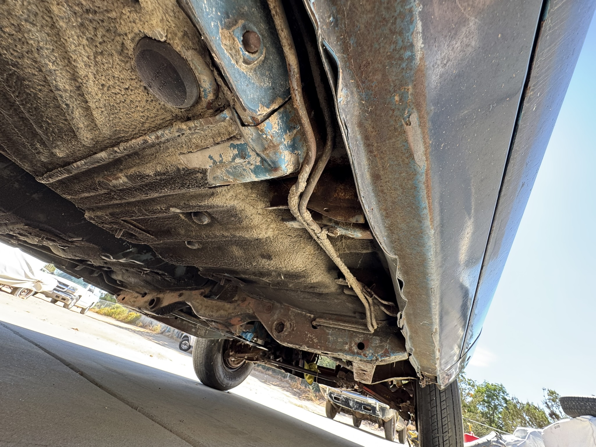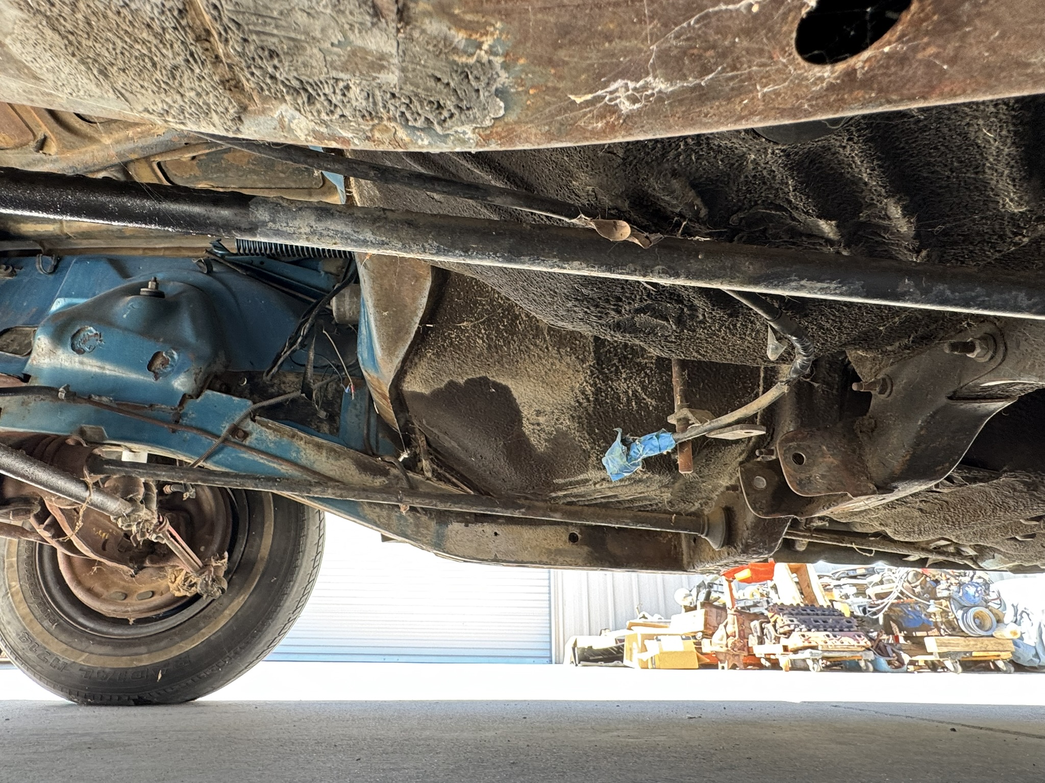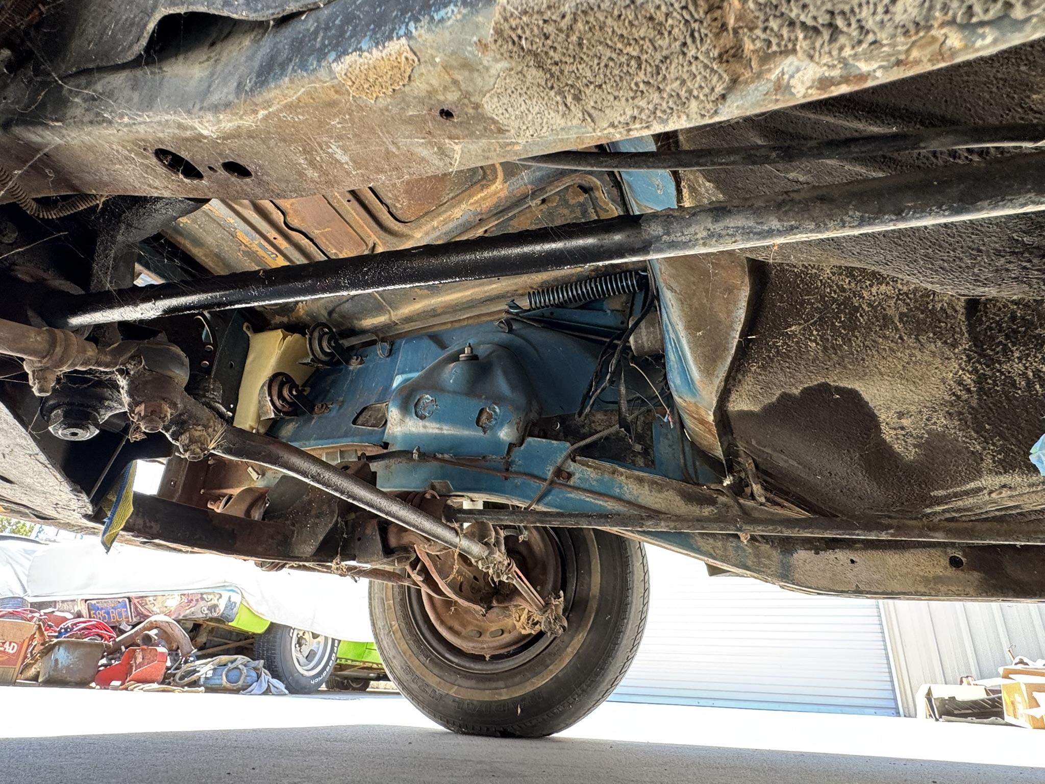 The missing Slant 6 and automatic transmission leave the drivetrain a blank slate. The 8 3/4 inch rear axle is ready for a performance makeover if desired. The drum brakes require a full inspection including shoes, lines, and hardware, or upgrade to disc brakes. Suspension bushings and shocks should be checked and replaced as necessary. The factory fuel tank and filler neck will need to be installed along with new rubber lines. A driveshaft and battery are needed. The tires are rollers enough for transport and storage, but need to be replaced.