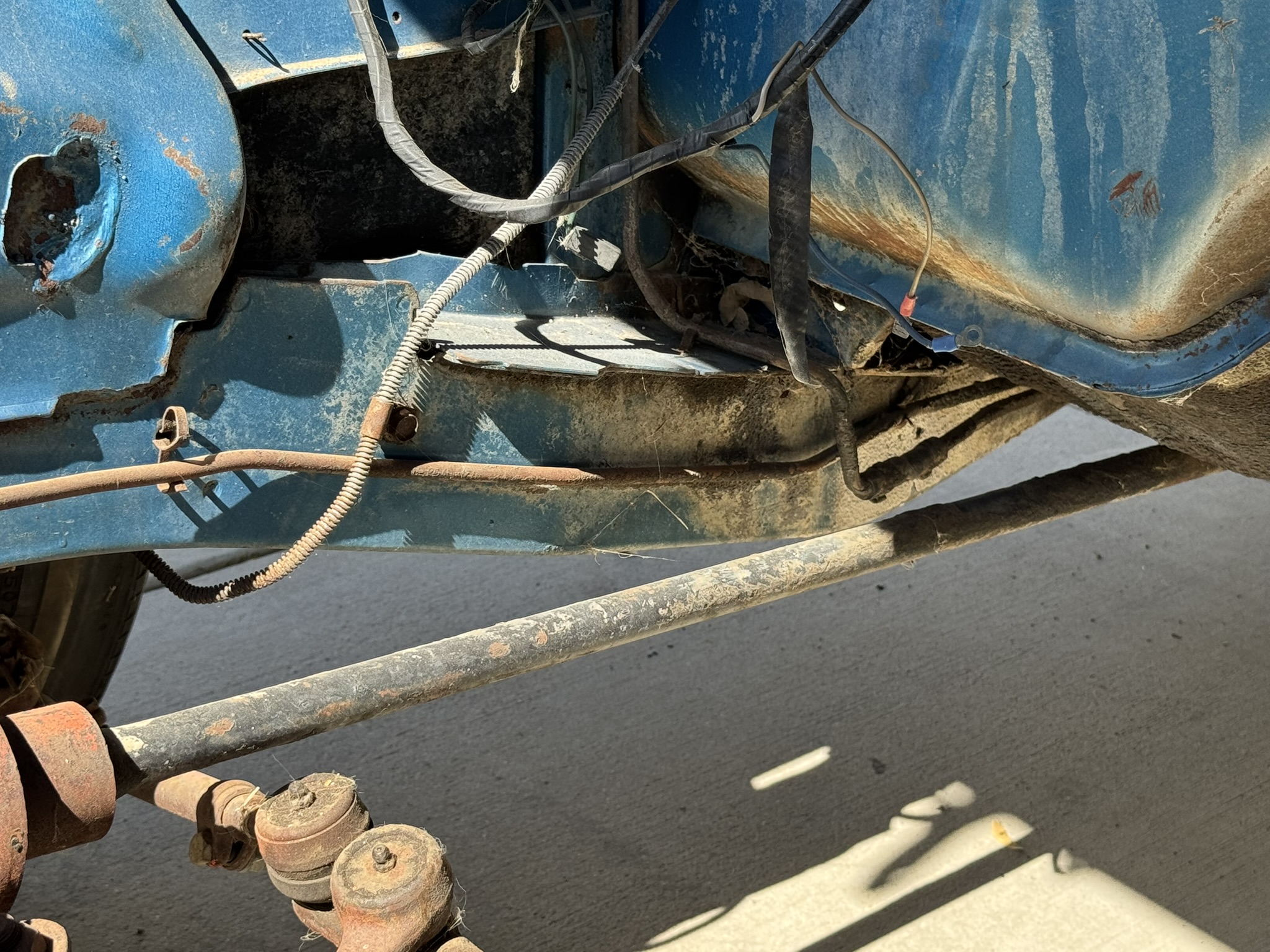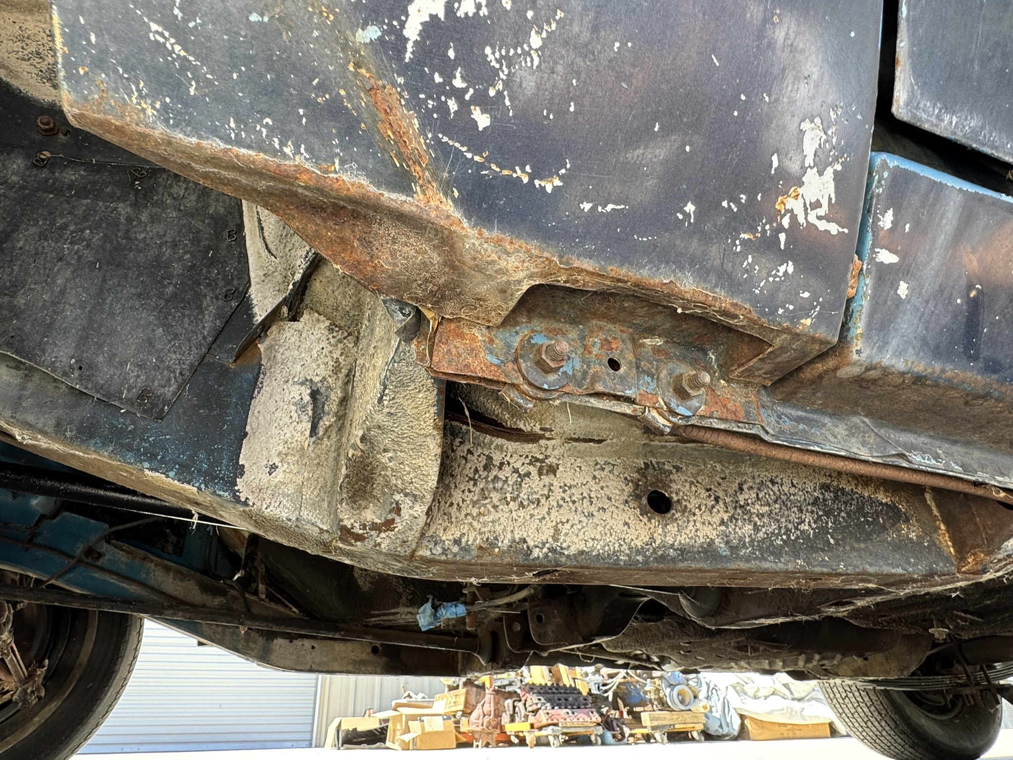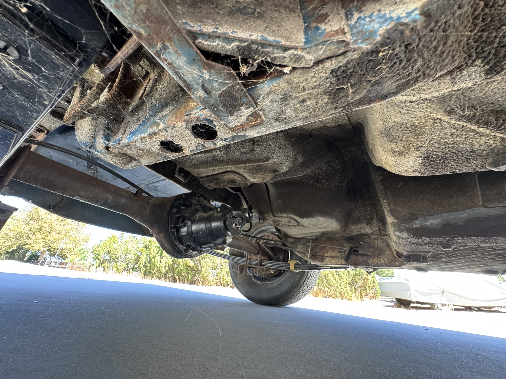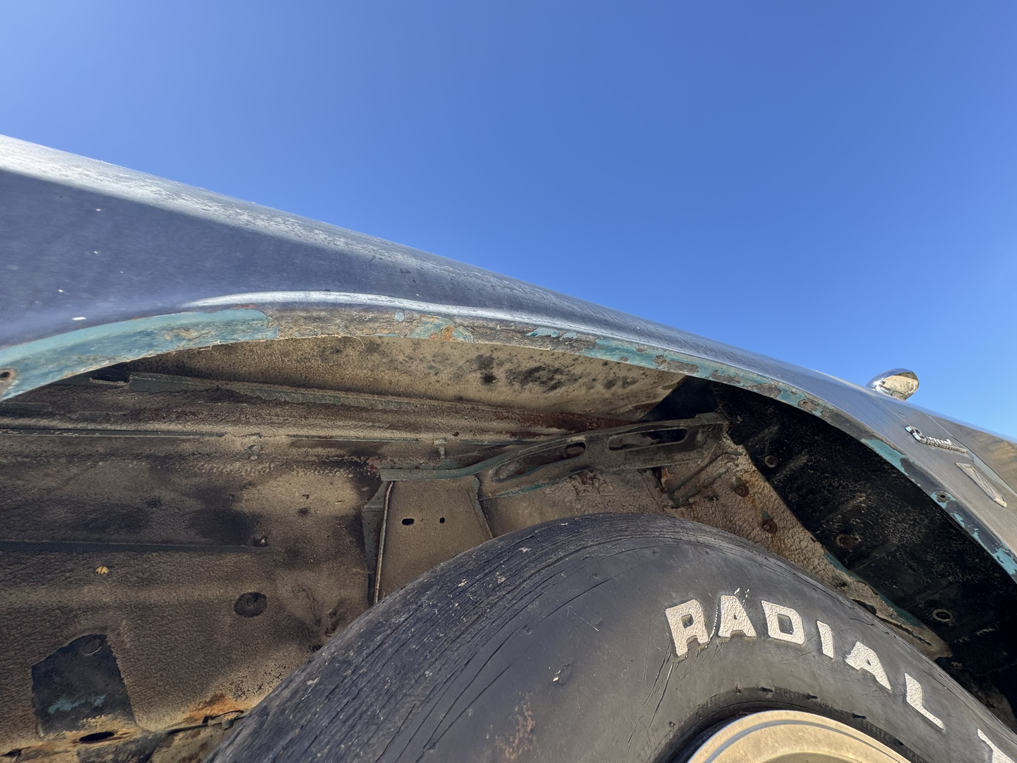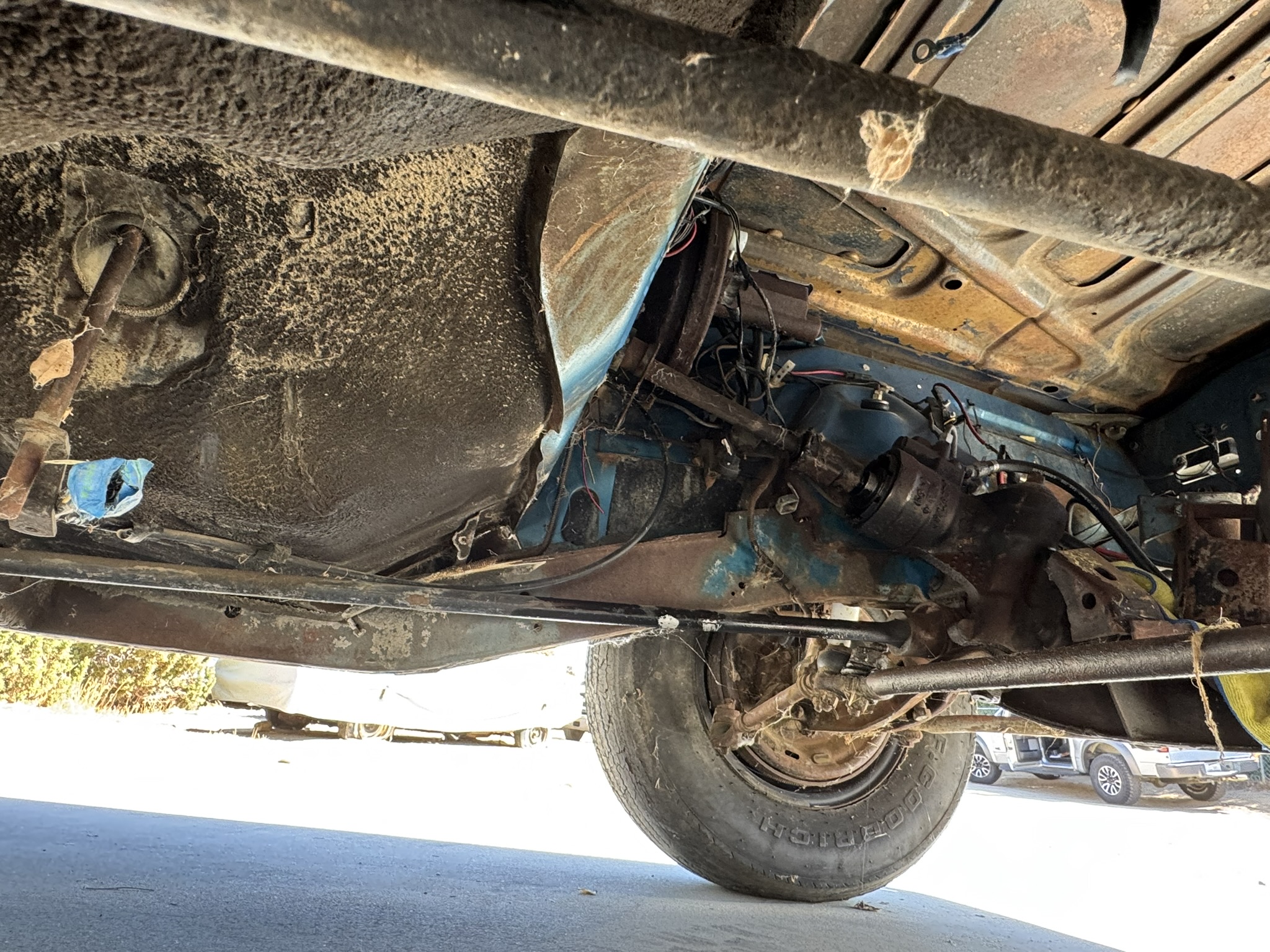 The missing Slant 6 and automatic transmission leave the drivetrain a blank slate. The 8 3/4 inch rear axle is ready for a performance makeover if desired. The drum brakes require a full inspection including shoes, lines, and hardware, or upgrade to disc brakes. Suspension bushings and shocks should be checked and replaced as necessary. The factory fuel tank and filler neck will need to be installed along with new rubber lines. A driveshaft and battery are needed. The tires are rollers enough for transport and storage, but need to be replaced.