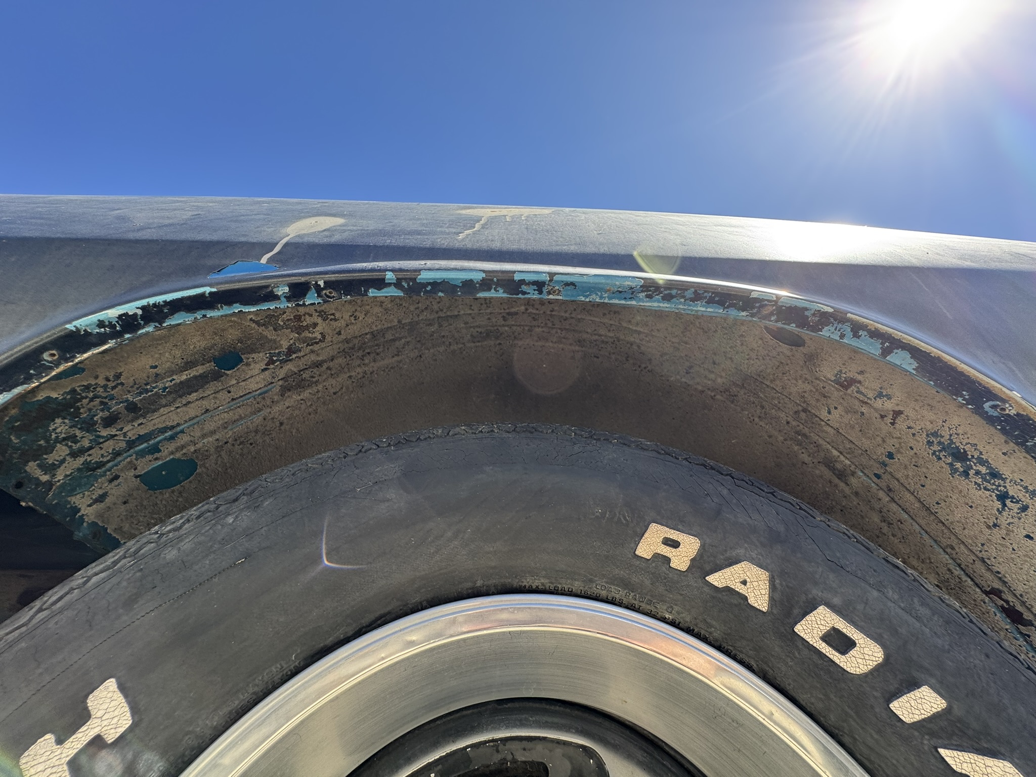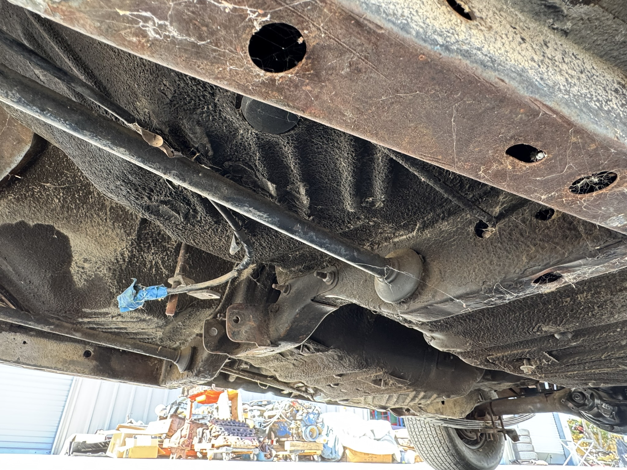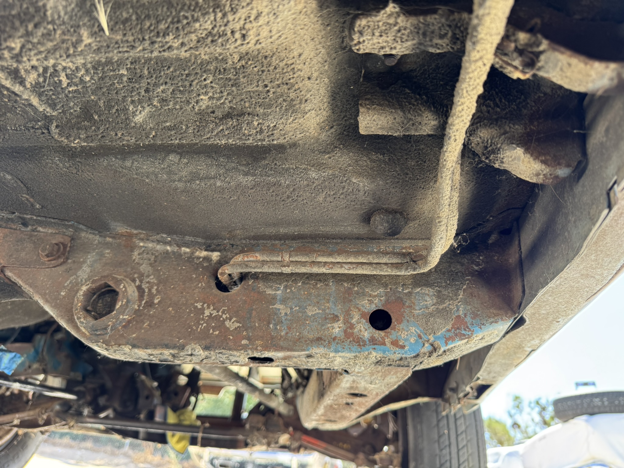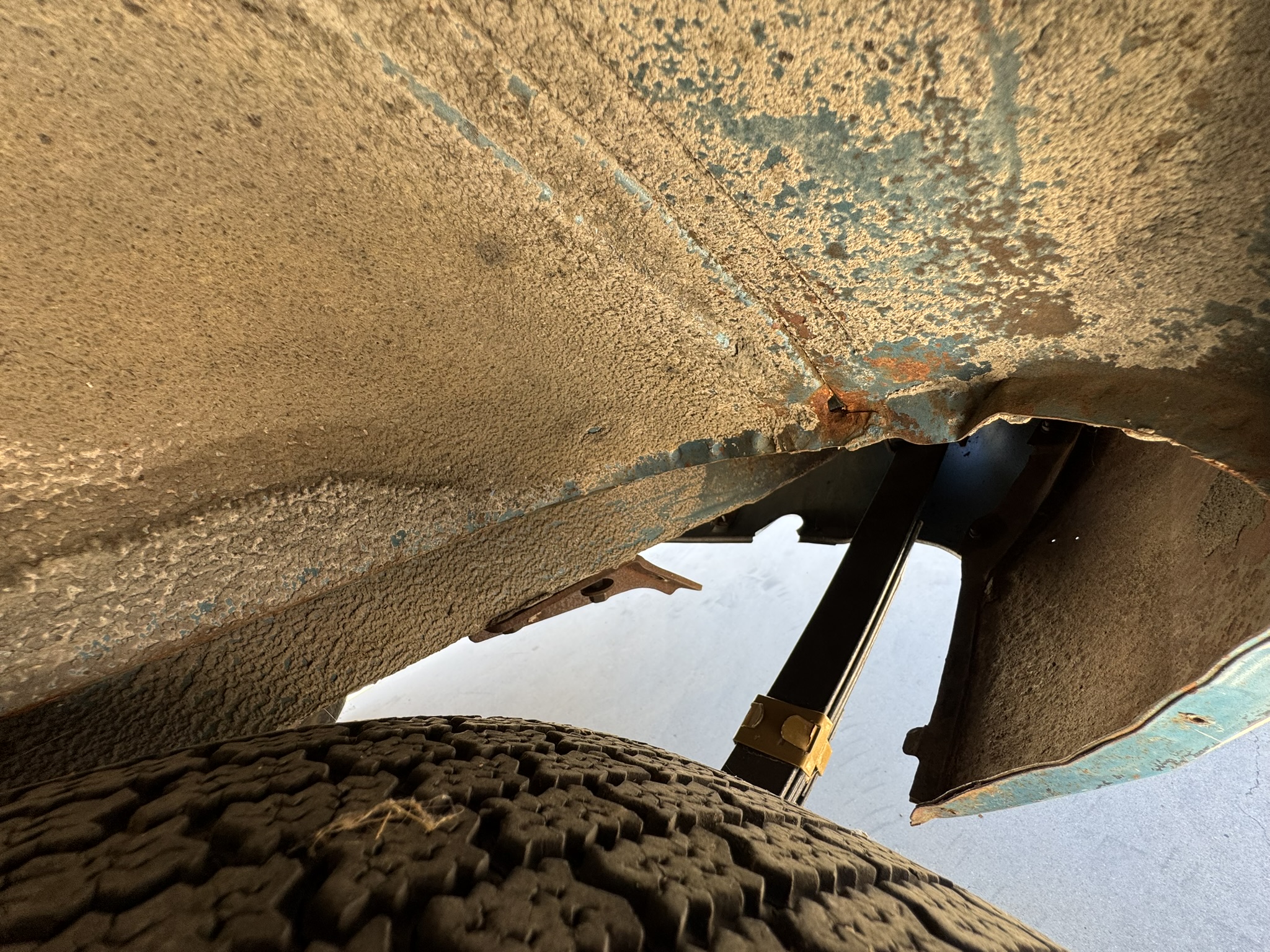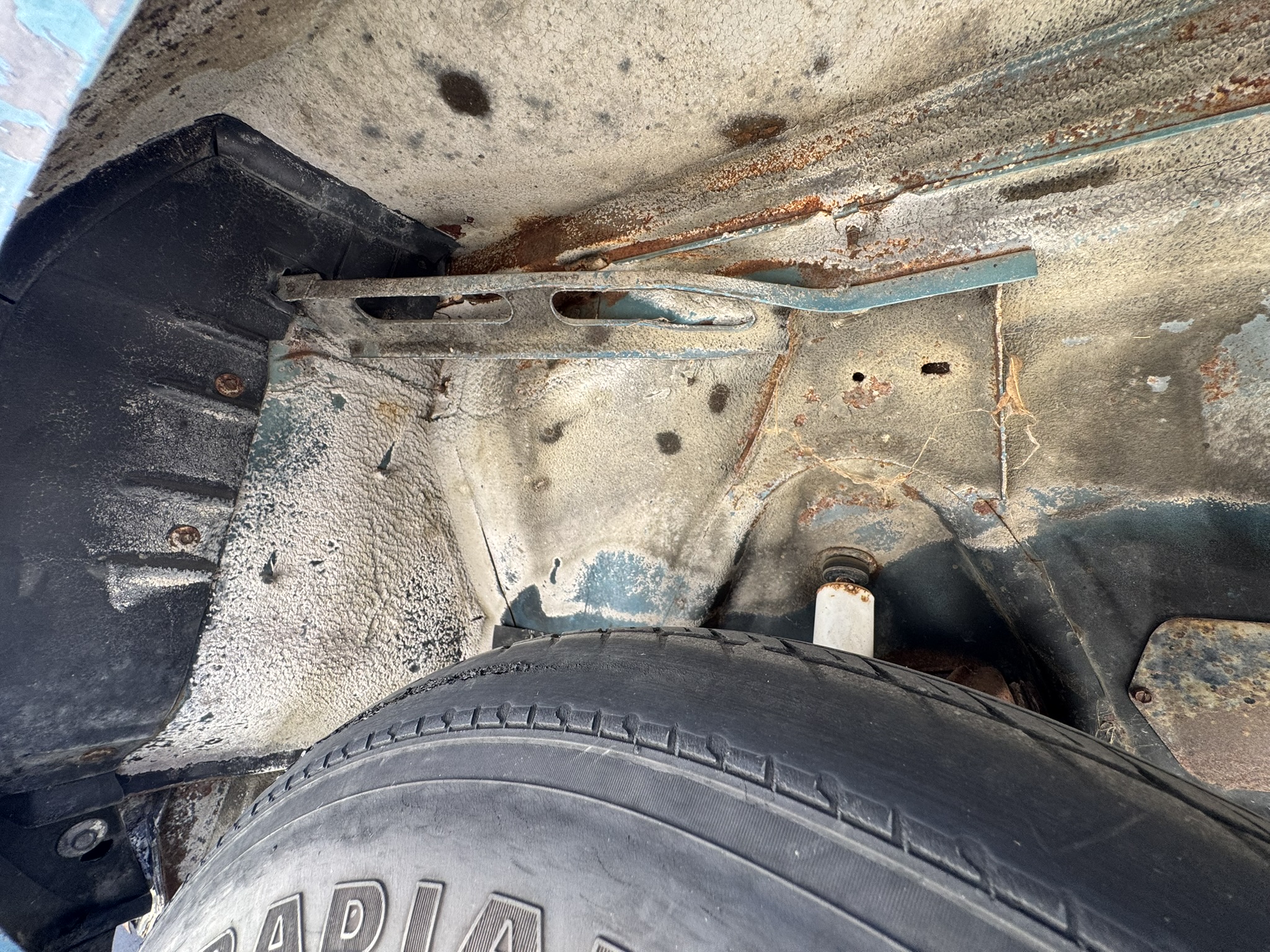 The missing Slant 6 and automatic transmission leave the drivetrain a blank slate. The 8 3/4 inch rear axle is ready for a performance makeover if desired. The drum brakes require a full inspection including shoes, lines, and hardware, or upgrade to disc brakes. Suspension bushings and shocks should be checked and replaced as necessary. The factory fuel tank and filler neck will need to be installed along with new rubber lines. A driveshaft and battery are needed. The tires are rollers enough for transport and storage, but need to be replaced.