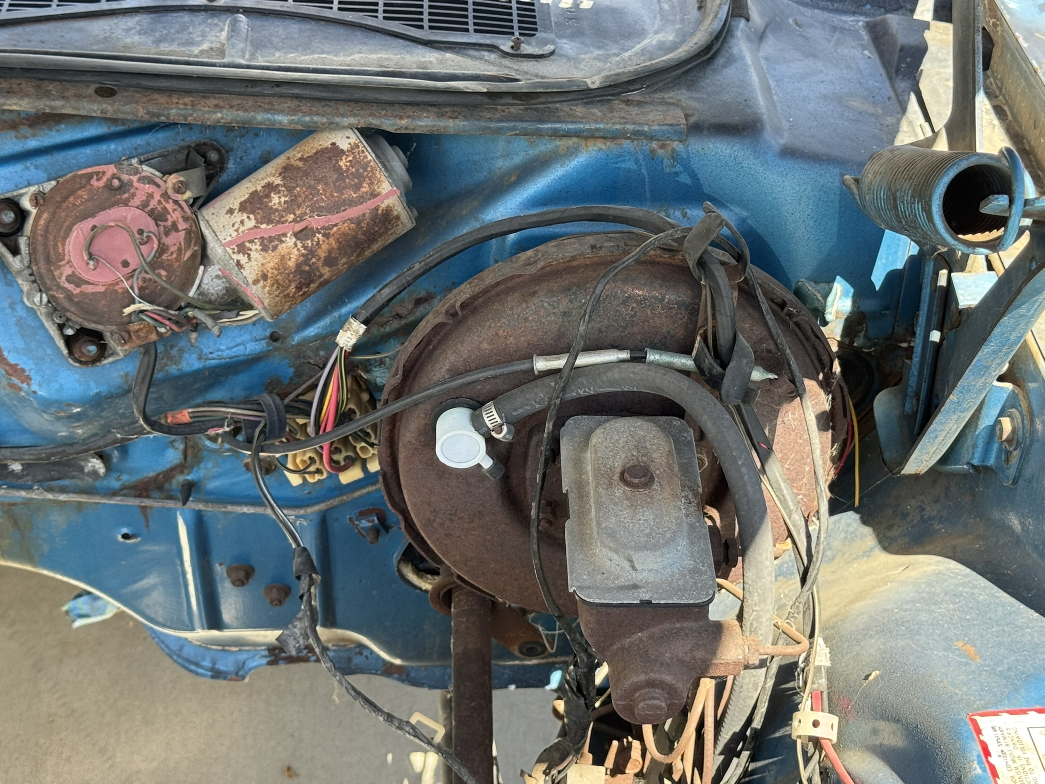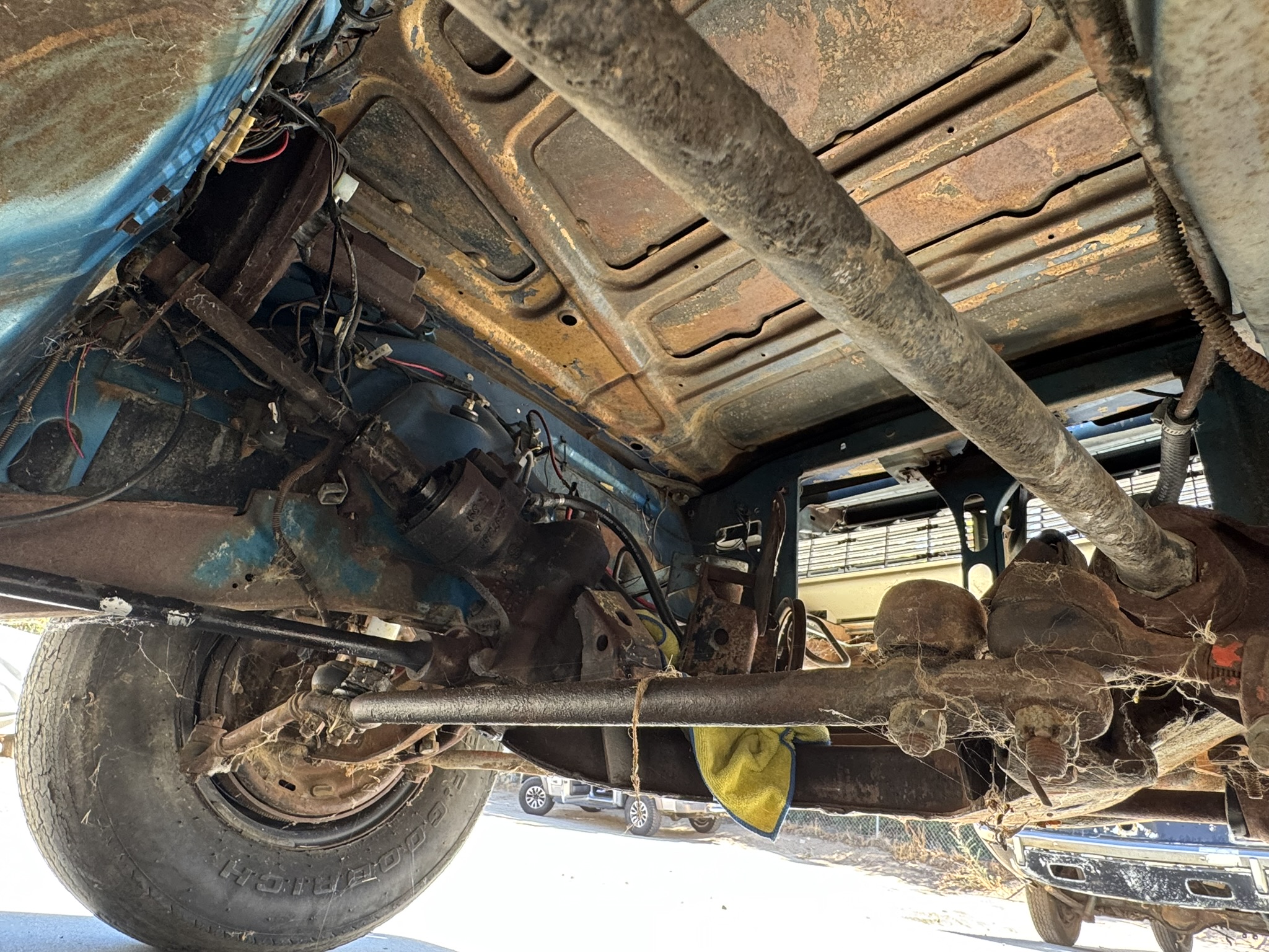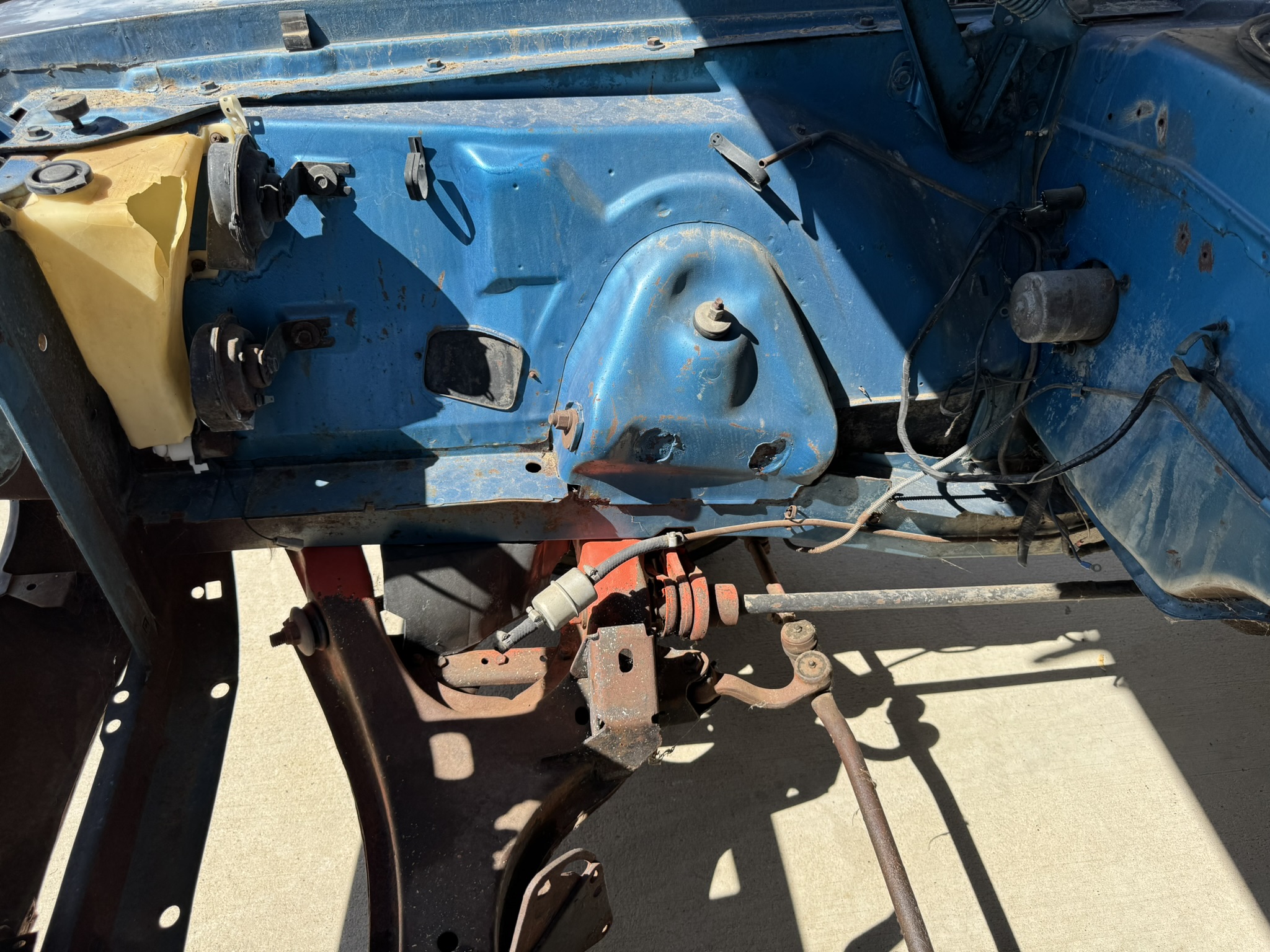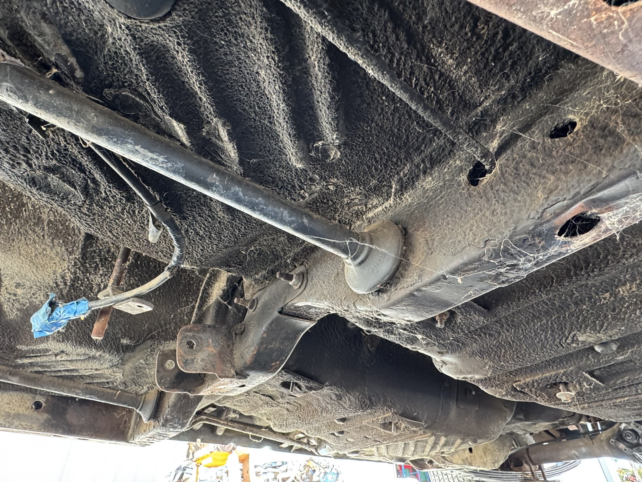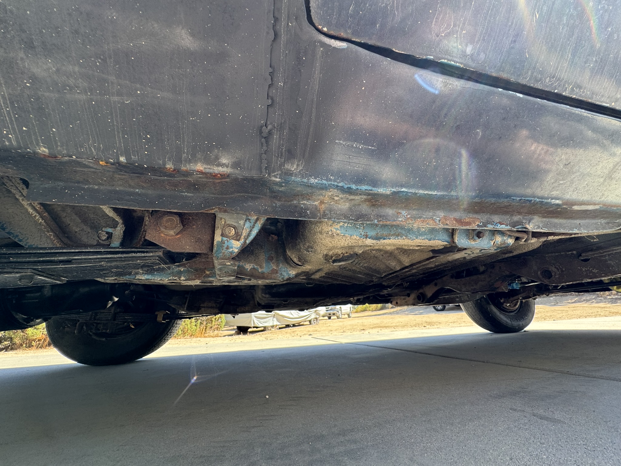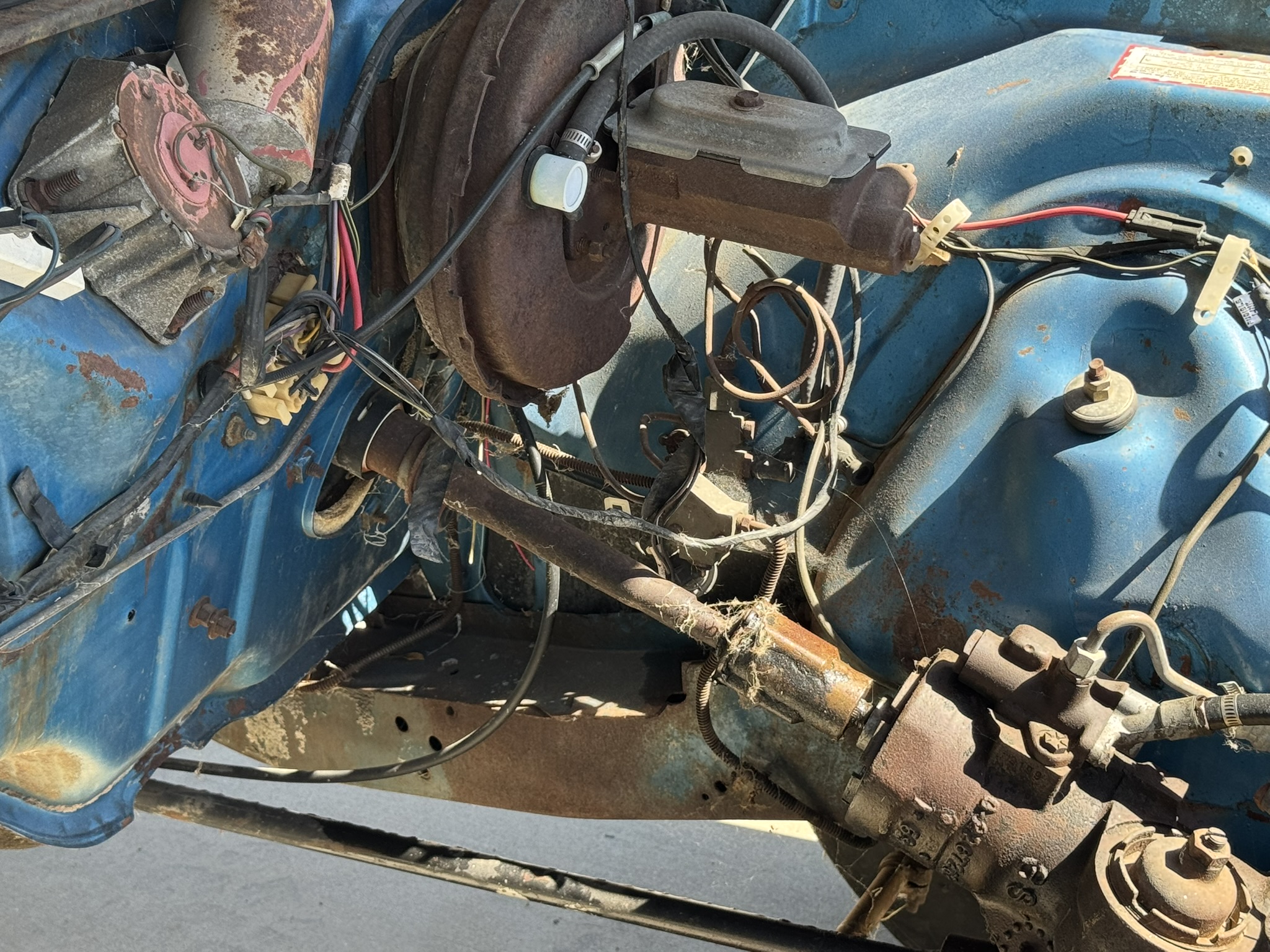 The missing Slant 6 and automatic transmission leave the drivetrain a blank slate. The 8 3/4 inch rear axle is ready for a performance makeover if desired. The drum brakes require a full inspection including shoes, lines, and hardware, or upgrade to disc brakes. Suspension bushings and shocks should be checked and replaced as necessary. The factory fuel tank and filler neck will need to be installed along with new rubber lines. A driveshaft and battery are needed. The tires are rollers enough for transport and storage, but need to be replaced.