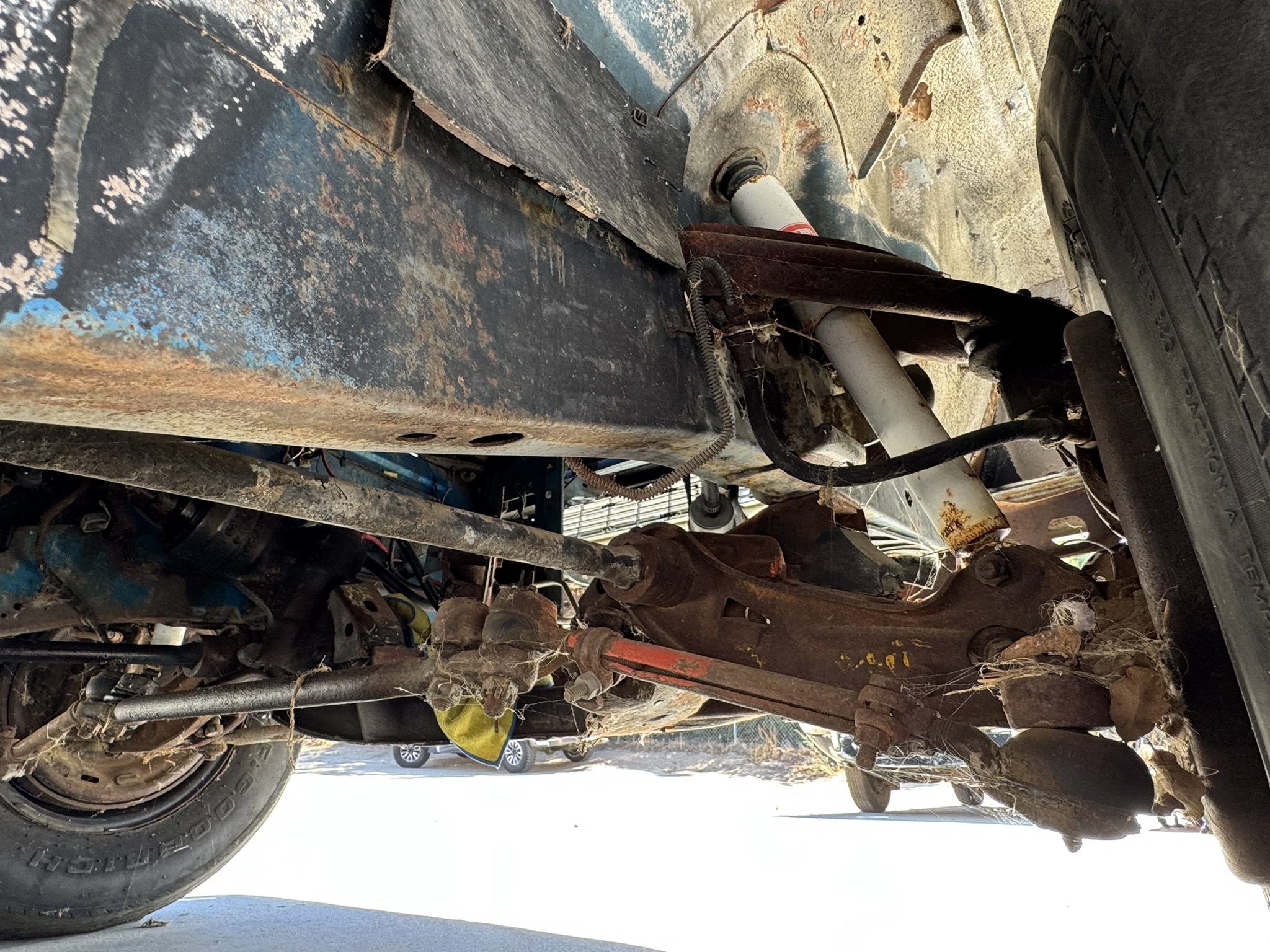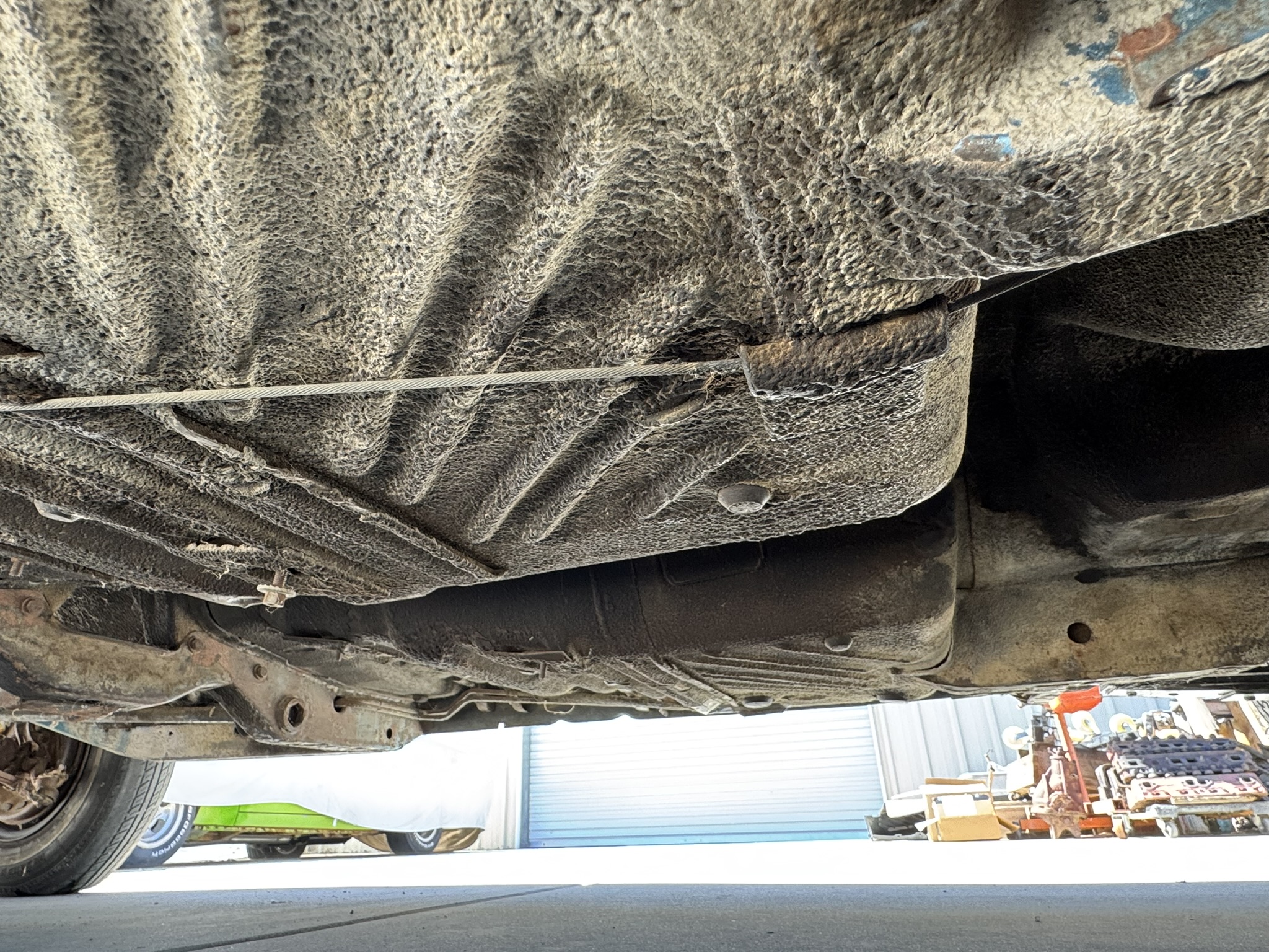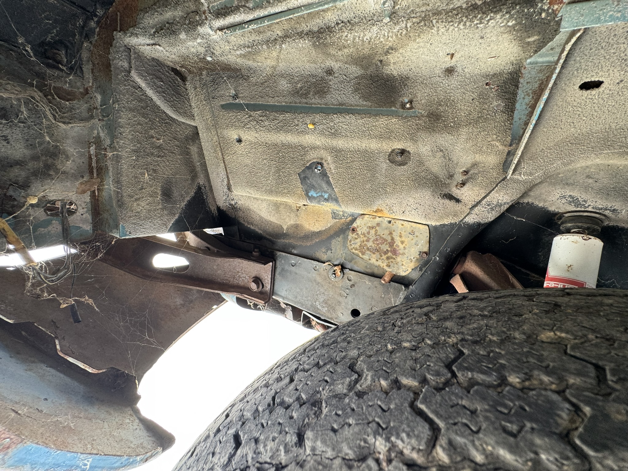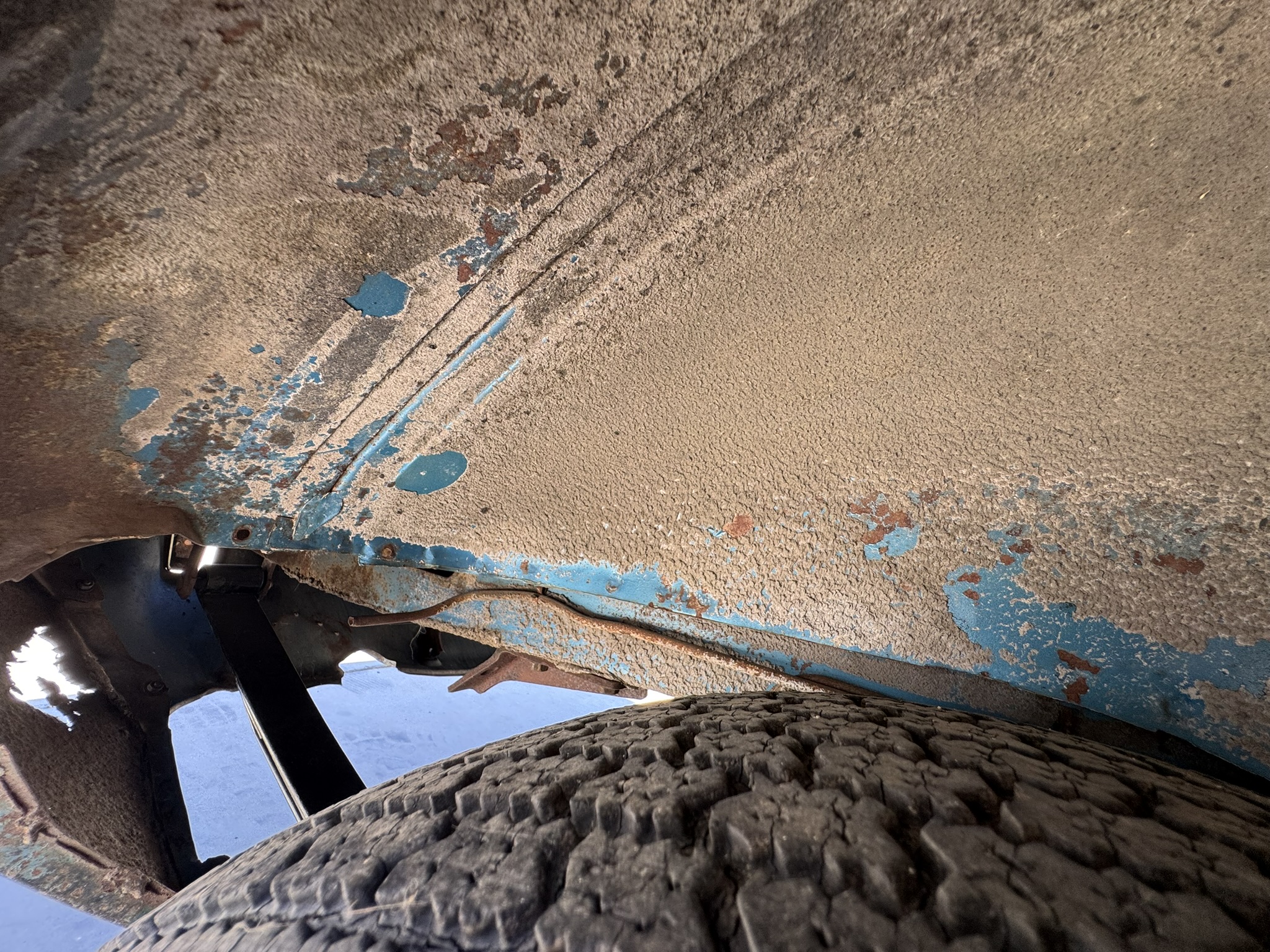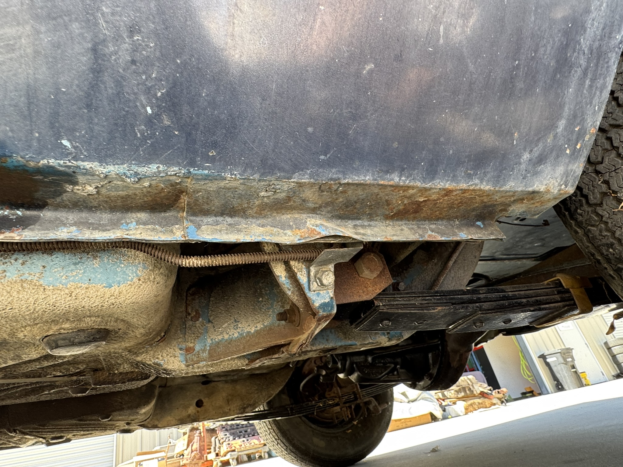 The missing Slant 6 and automatic transmission leave the drivetrain a blank slate. The 8 3/4 inch rear axle is ready for a performance makeover if desired. The drum brakes require a full inspection including shoes, lines, and hardware, or upgrade to disc brakes. Suspension bushings and shocks should be checked and replaced as necessary. The factory fuel tank and filler neck will need to be installed along with new rubber lines. A driveshaft and battery are needed. The tires are rollers enough for transport and storage, but need to be replaced.