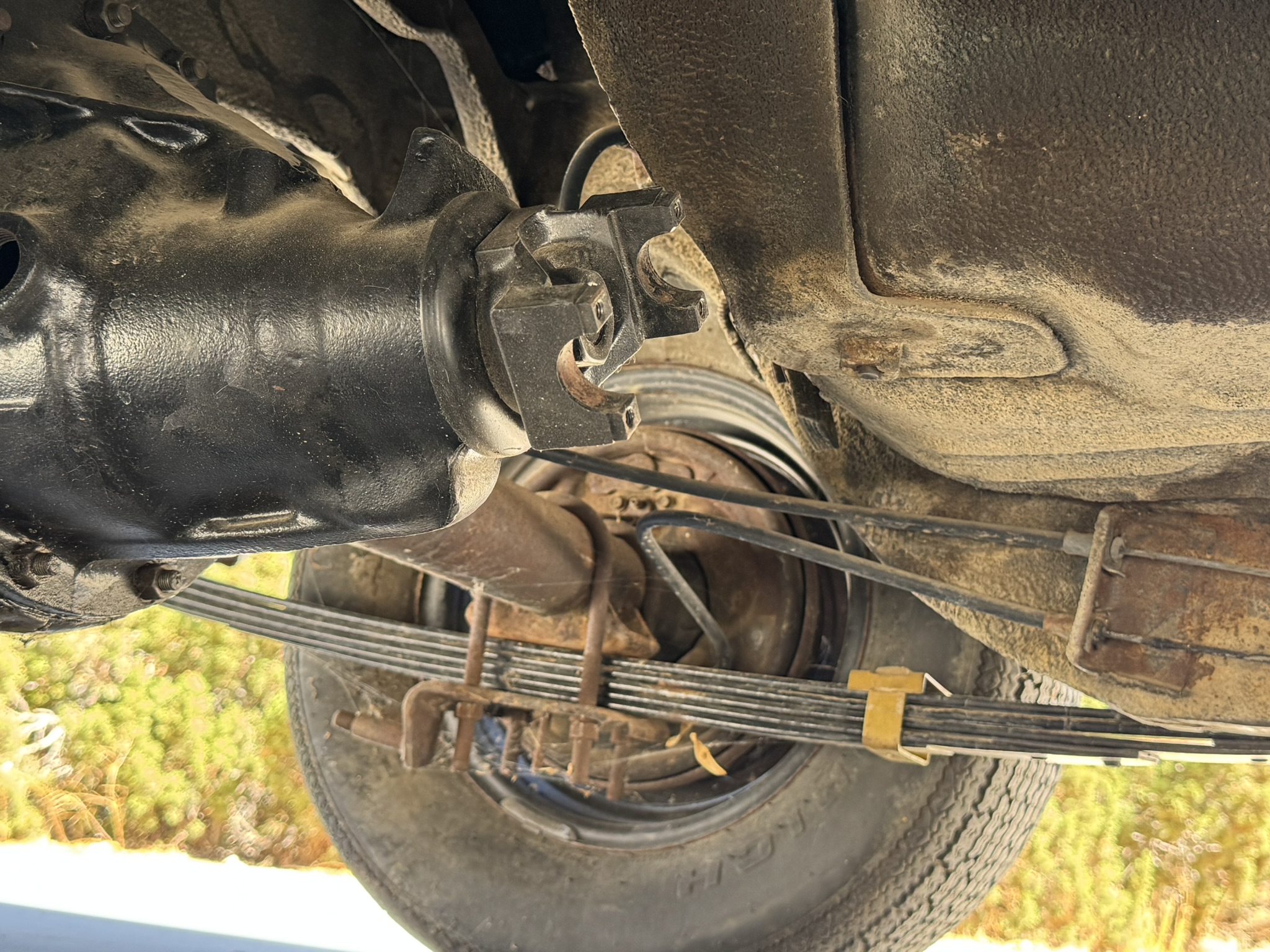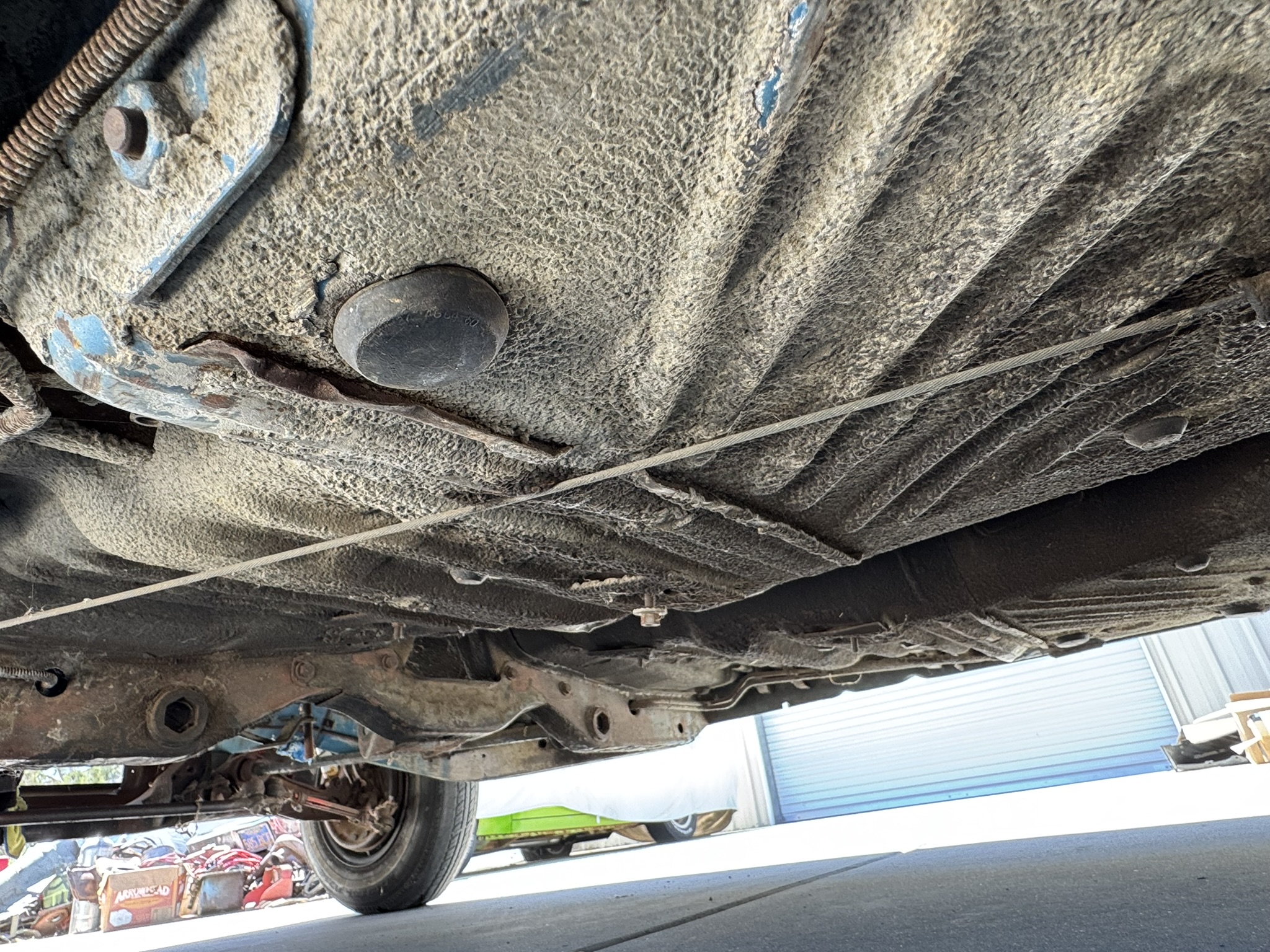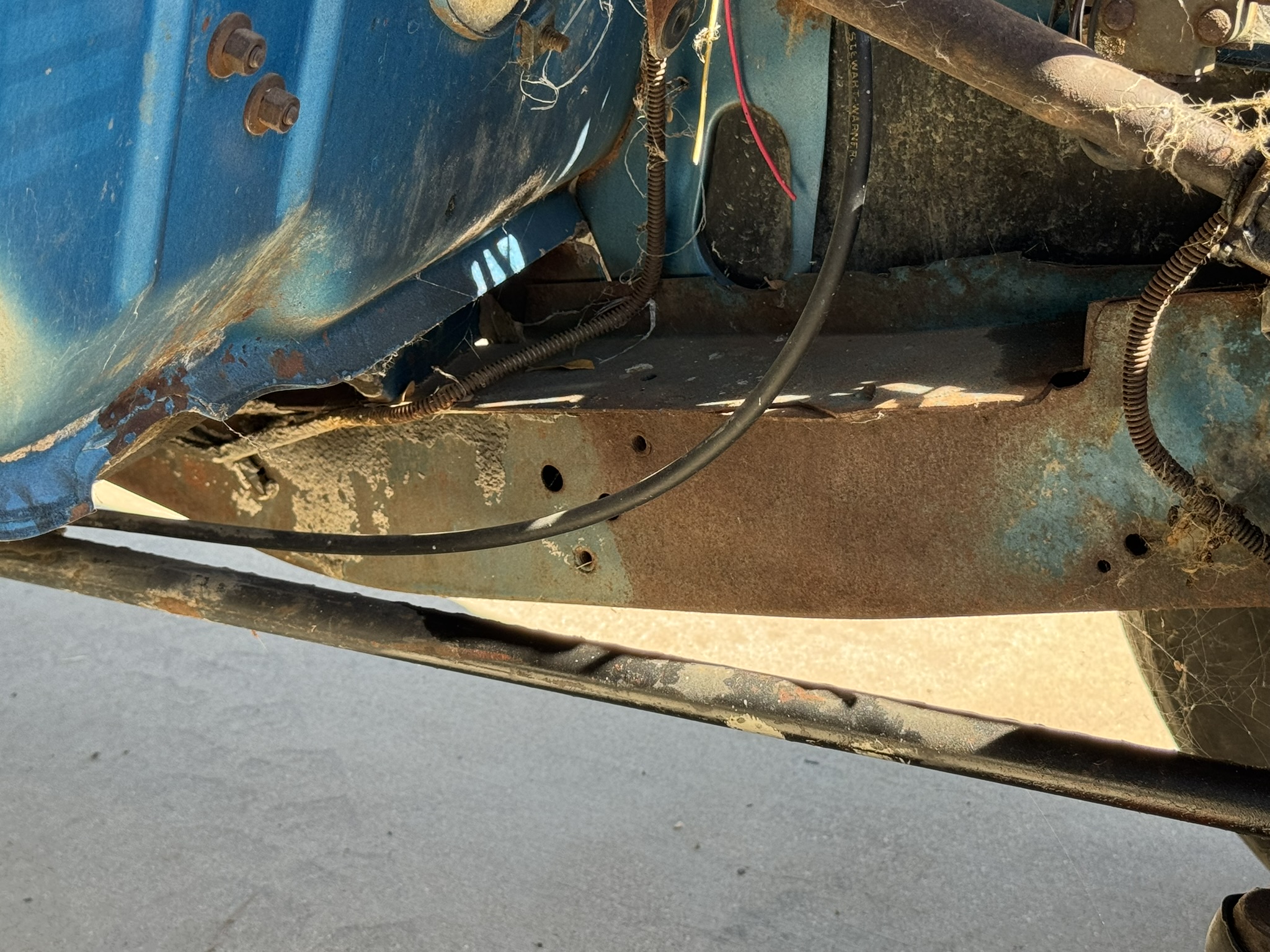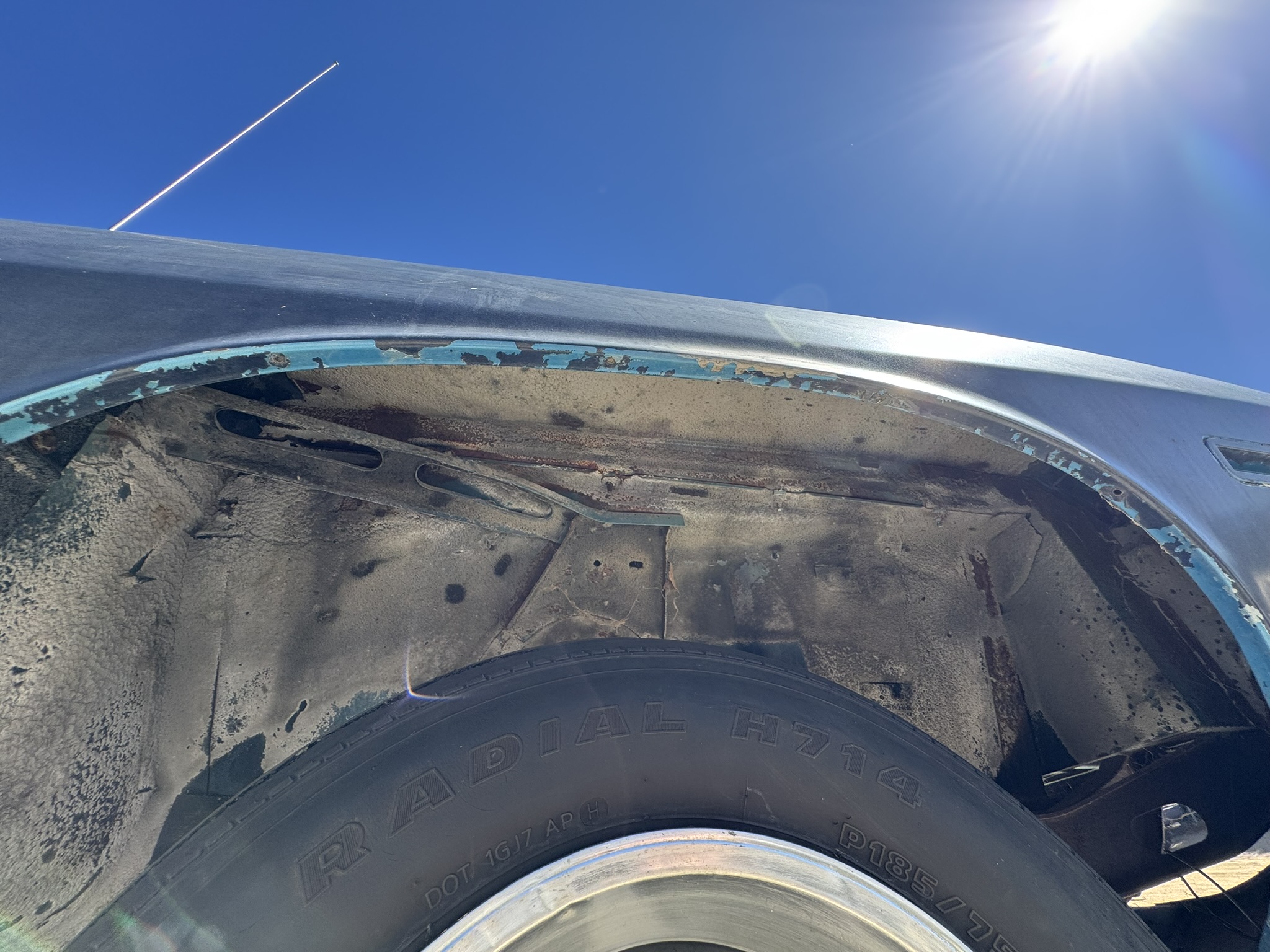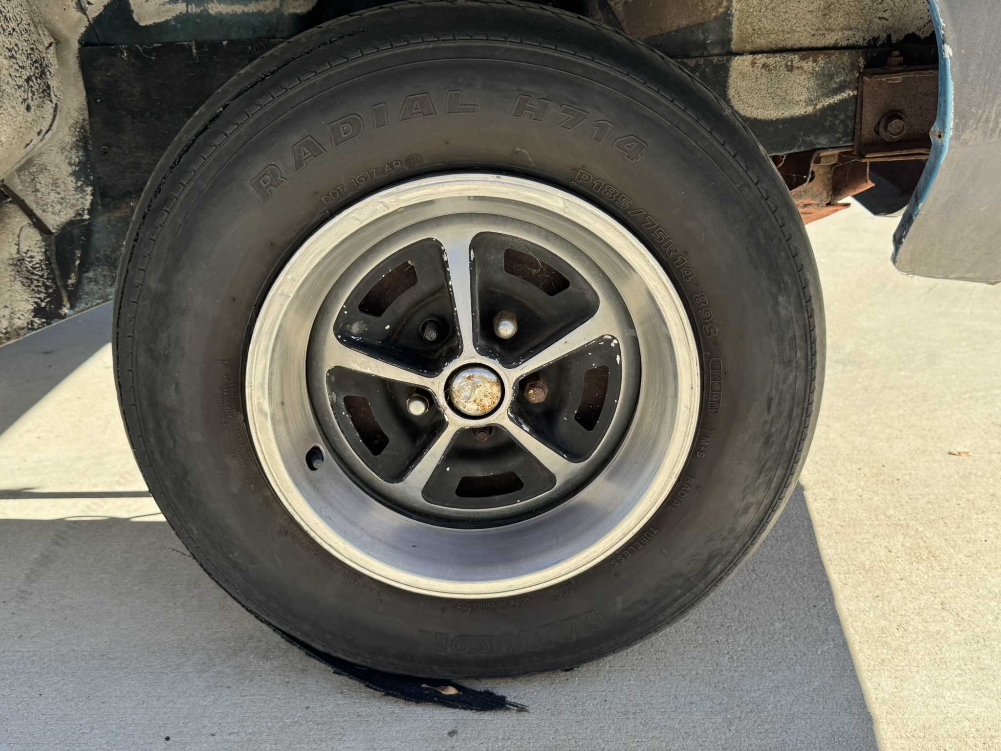The missing Slant 6 and automatic transmission leave the drivetrain a blank slate. The 8 3/4 inch rear axle is ready for a performance makeover if desired. The drum brakes require a full inspection including shoes, lines, and hardware, or upgrade to disc brakes. Suspension bushings and shocks should be checked and replaced as necessary. The factory fuel tank and filler neck will need to be installed along with new rubber lines. A driveshaft and battery are needed. The tires are rollers enough for transport and storage, but need to be replaced.